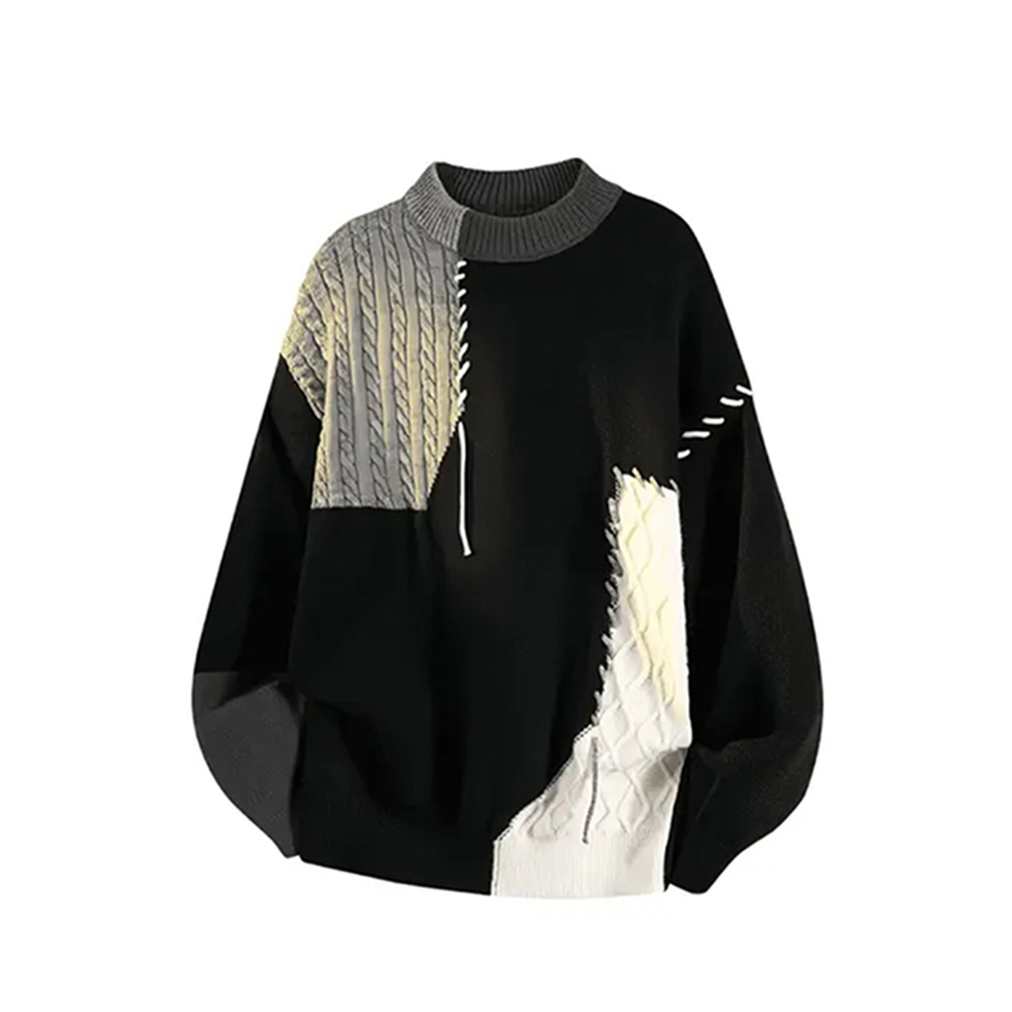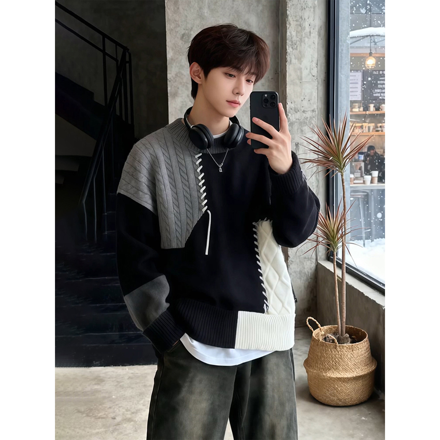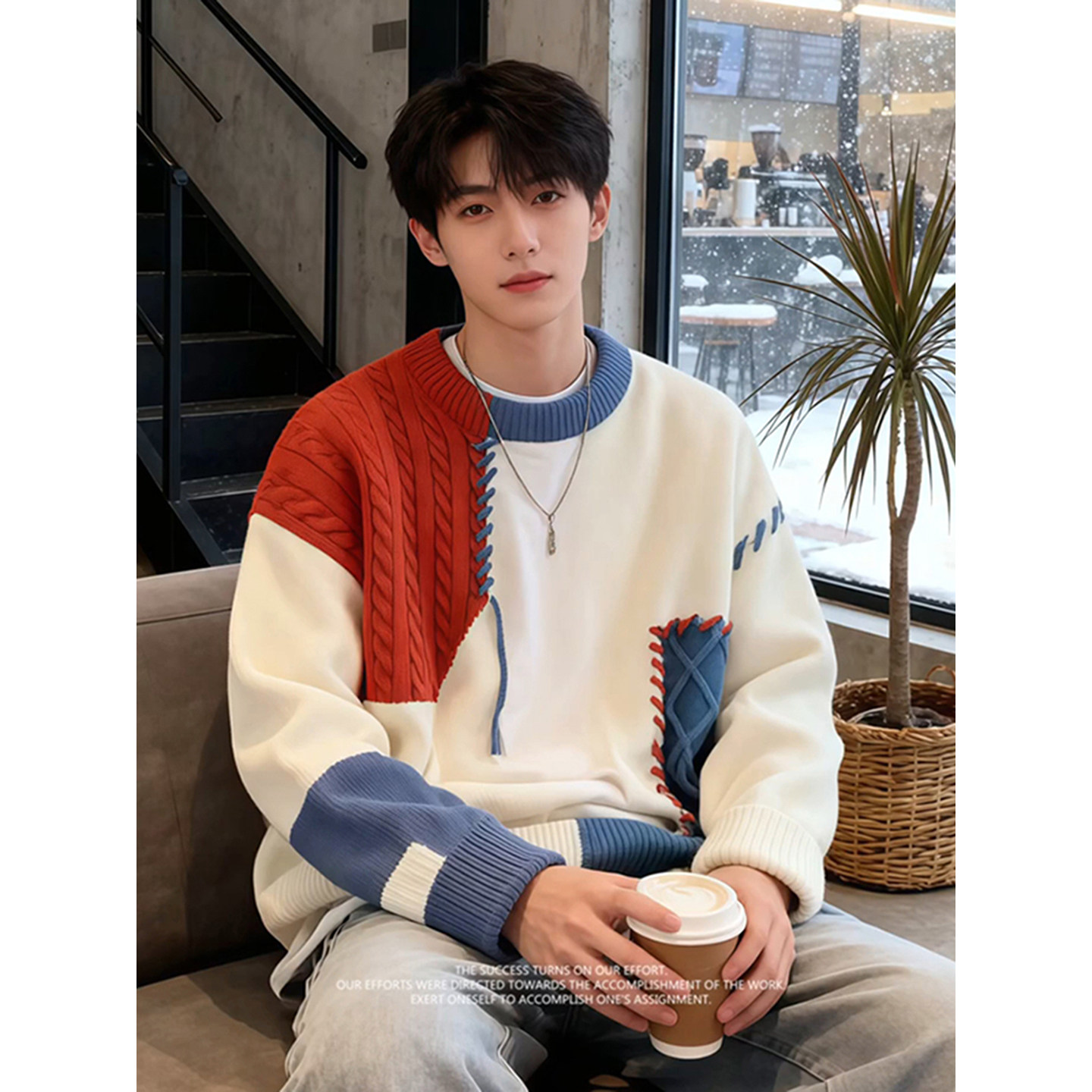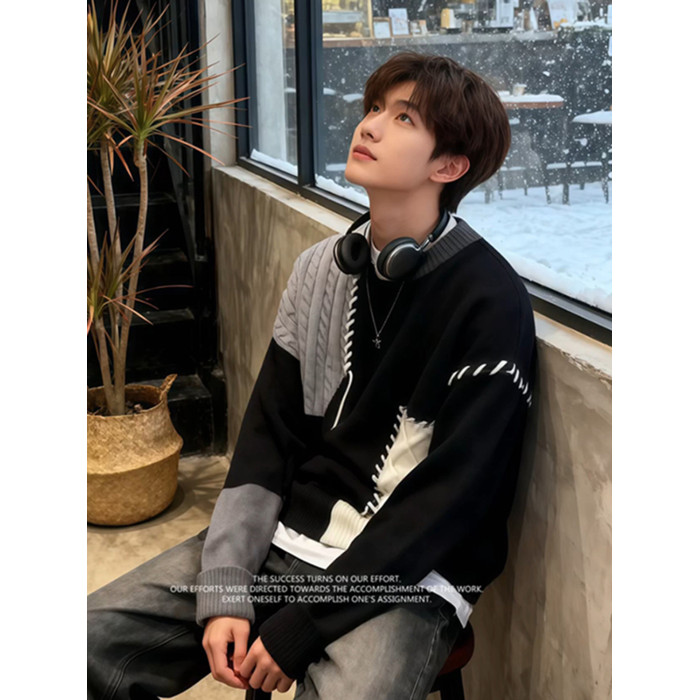 美式慵嬾高級感毛衣男秋冬加厚內搭可外穿撞色拼接圓領針織打底衫