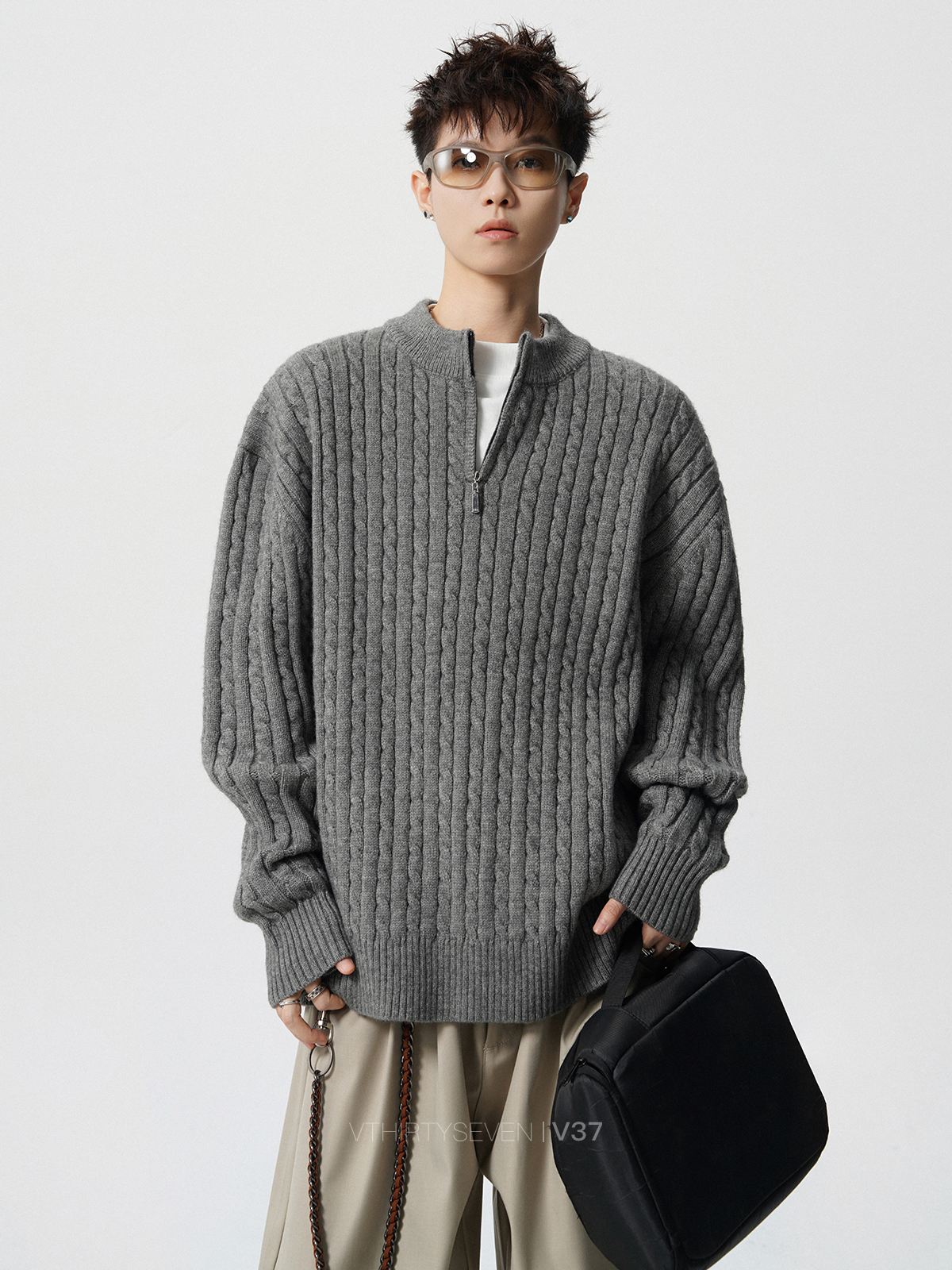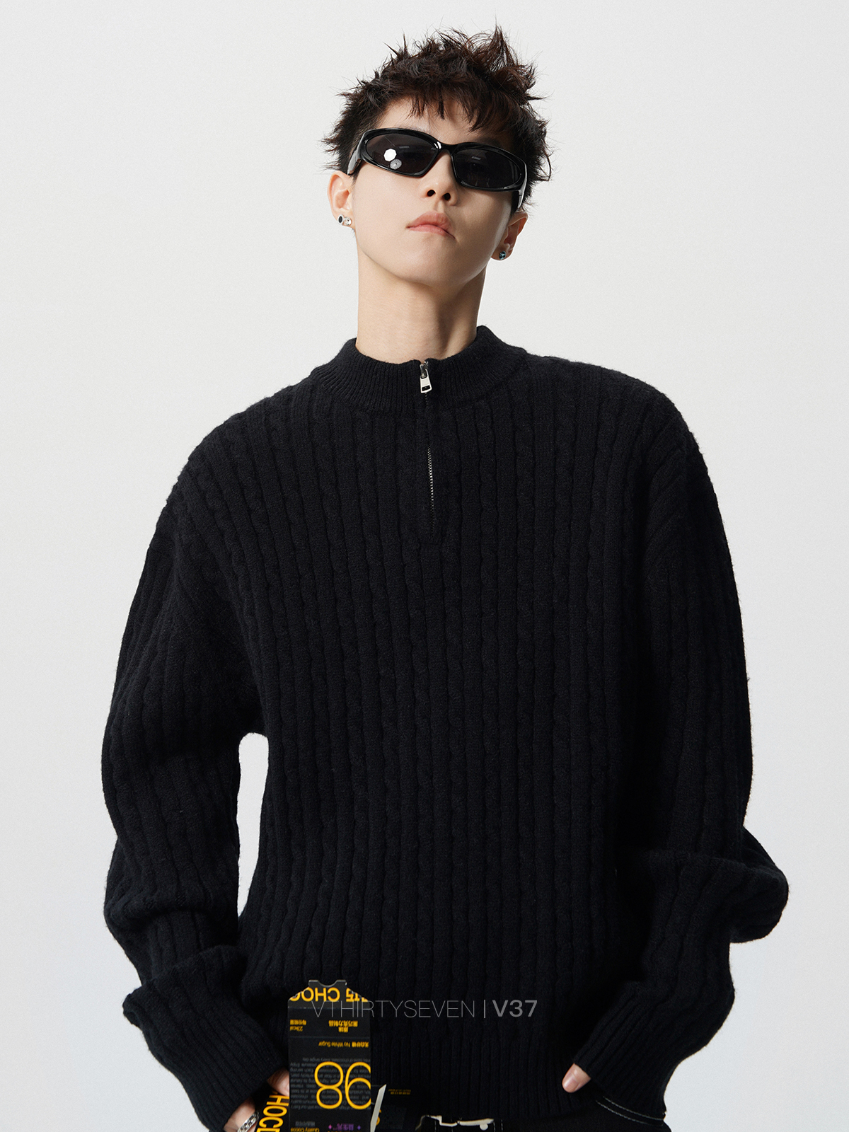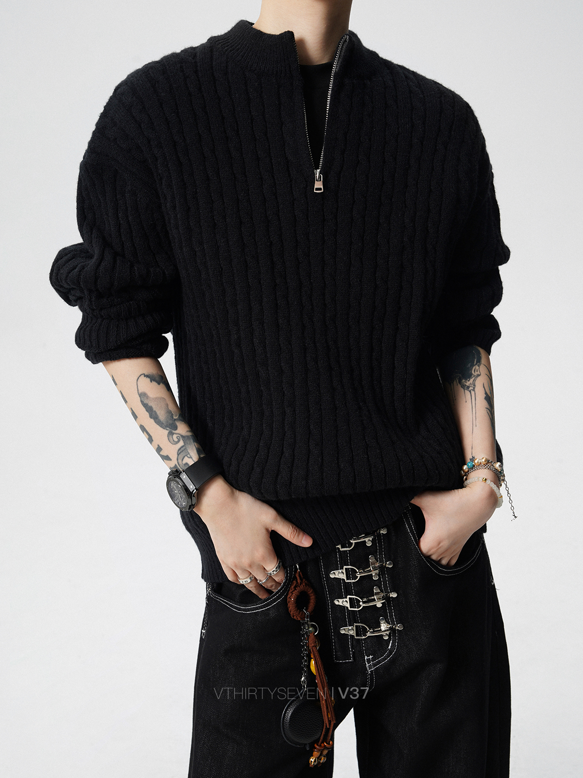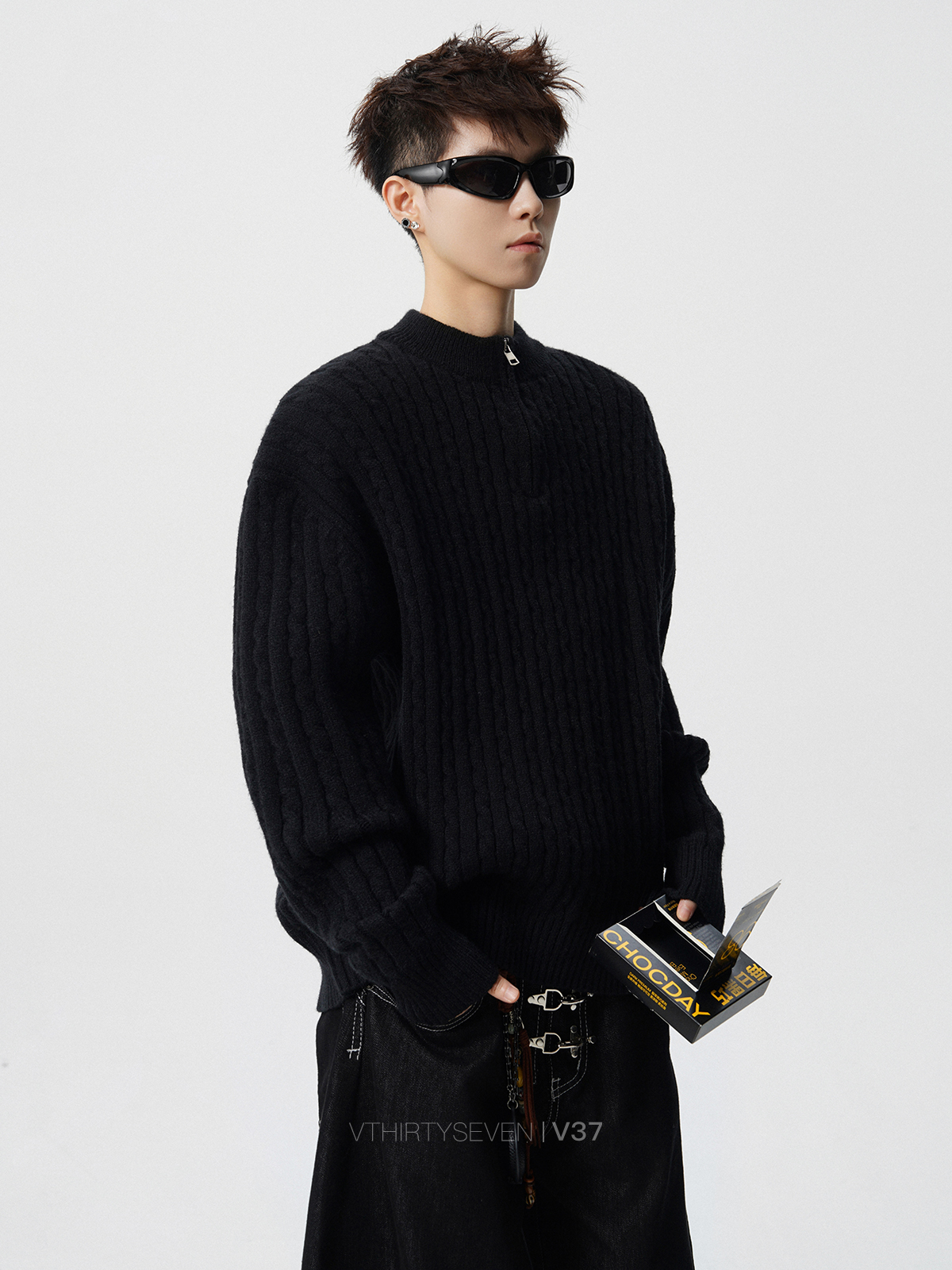 V37重磅肌理感半拉鍊麻花針織衫男冬季美式復古純色休閒套頭毛衣