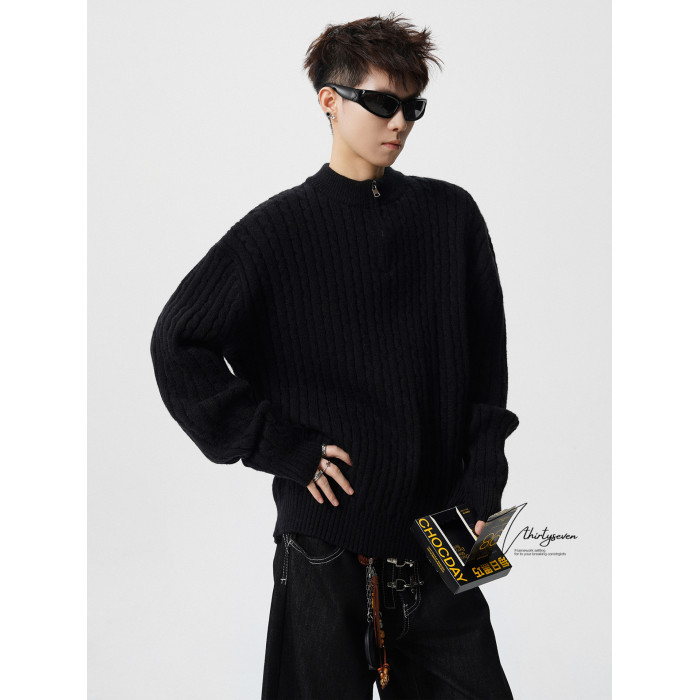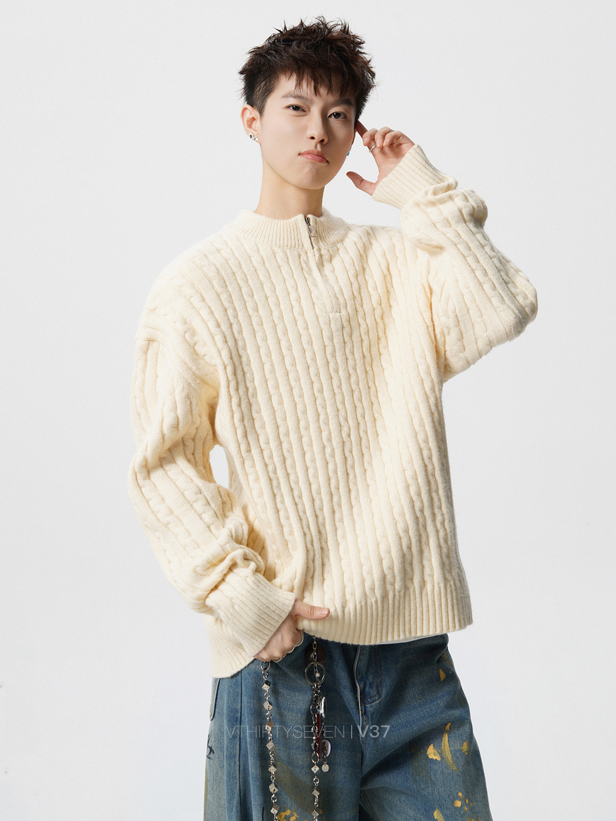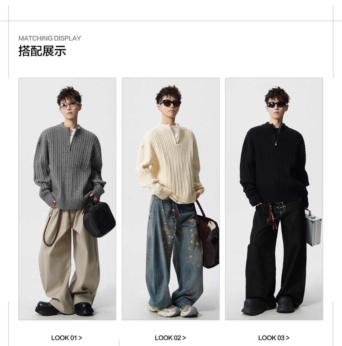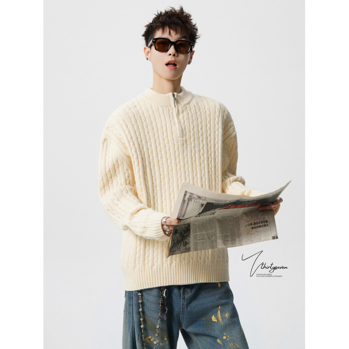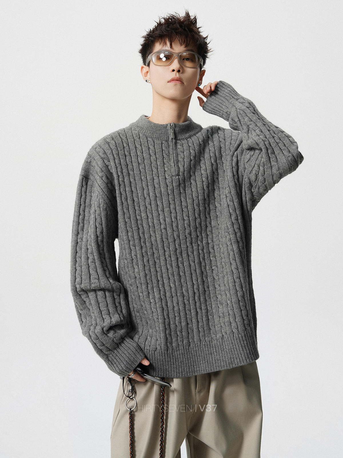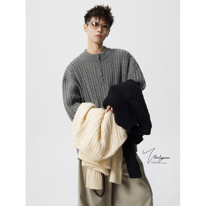V37重磅肌理感半拉鍊麻花針織衫男冬季美式復古純色休閒套頭毛衣