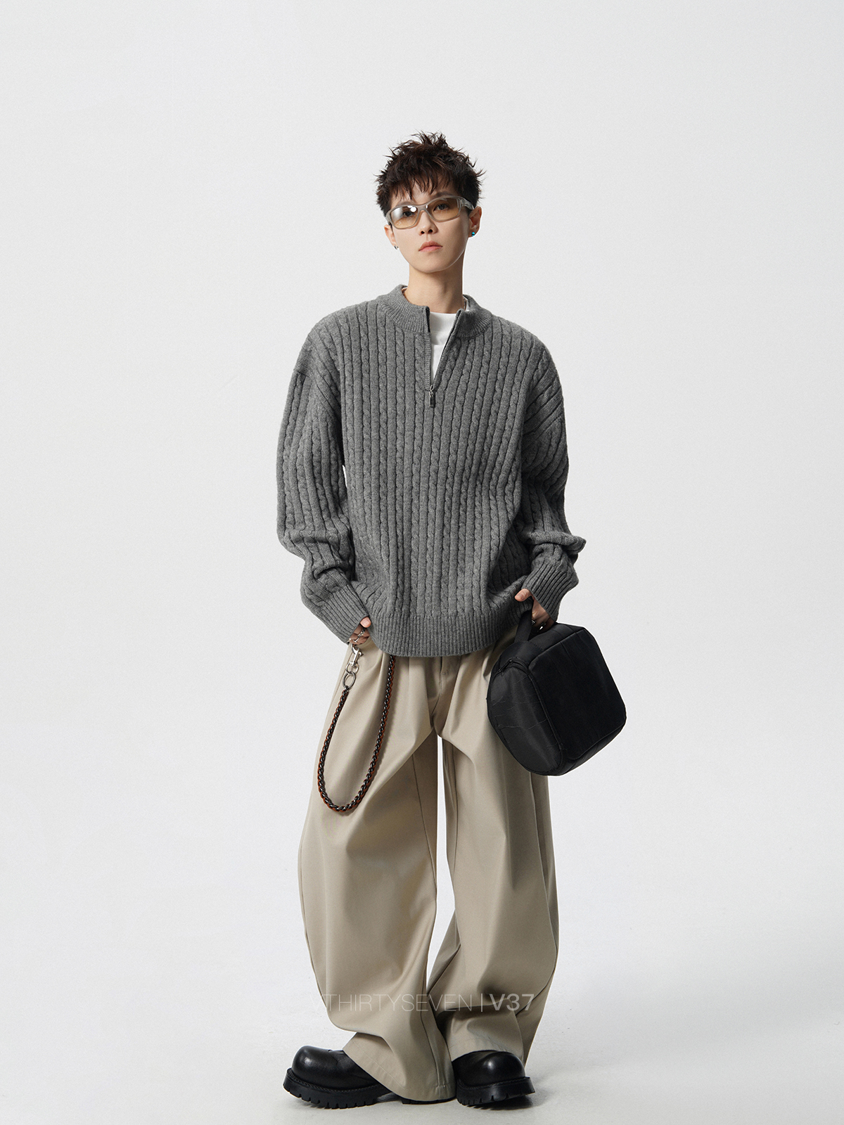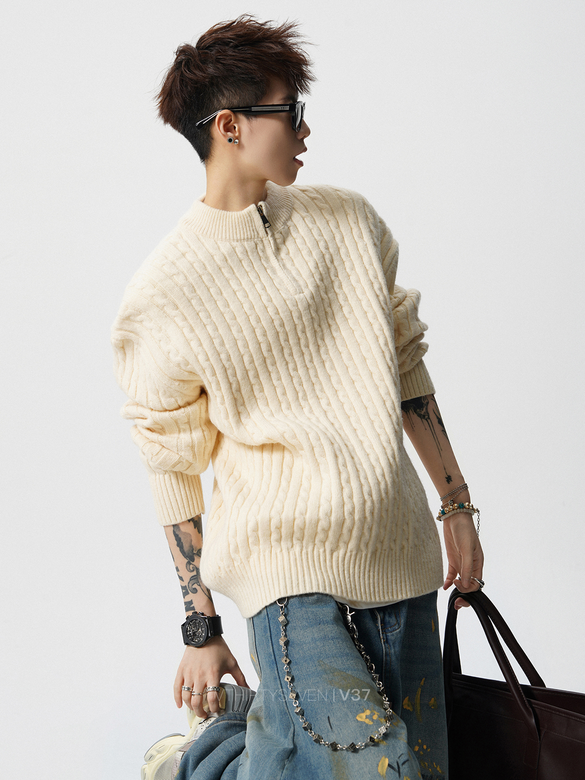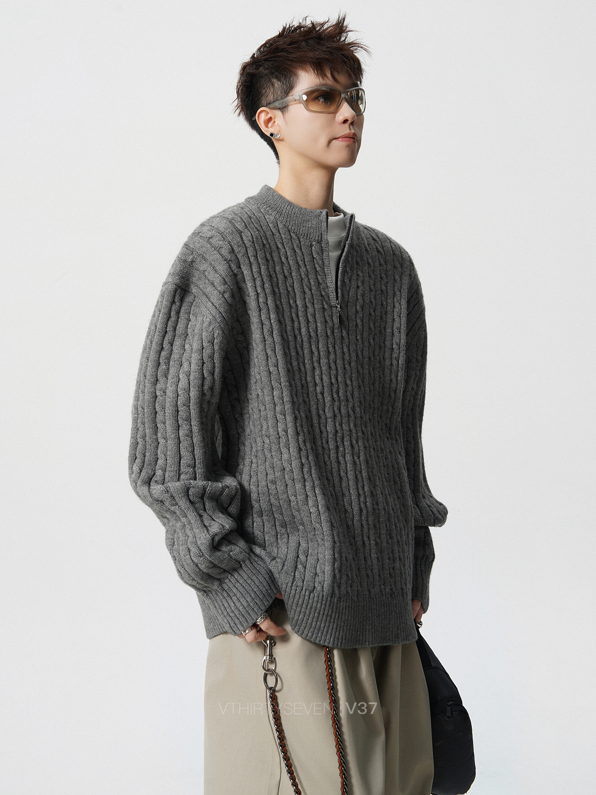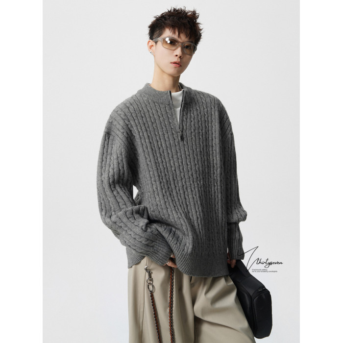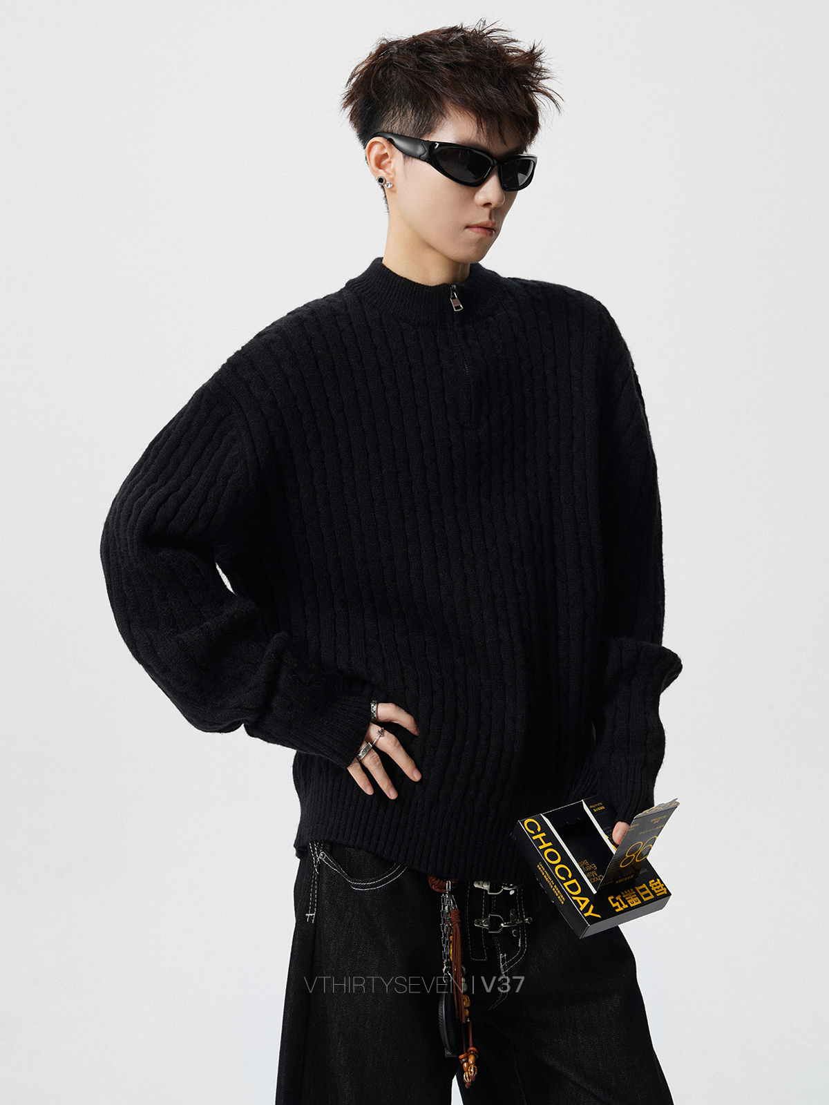 V37重磅肌理感半拉鍊麻花針織衫男冬季美式復古純色休閒套頭毛衣