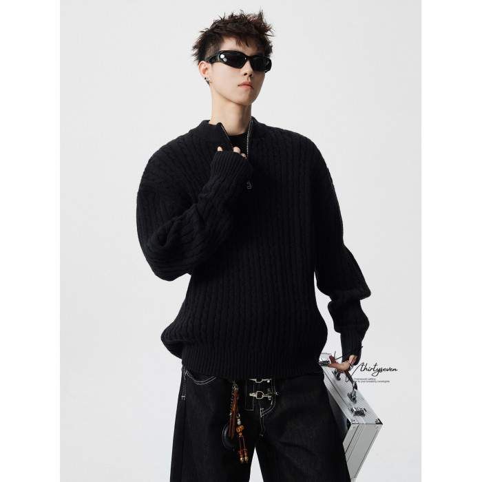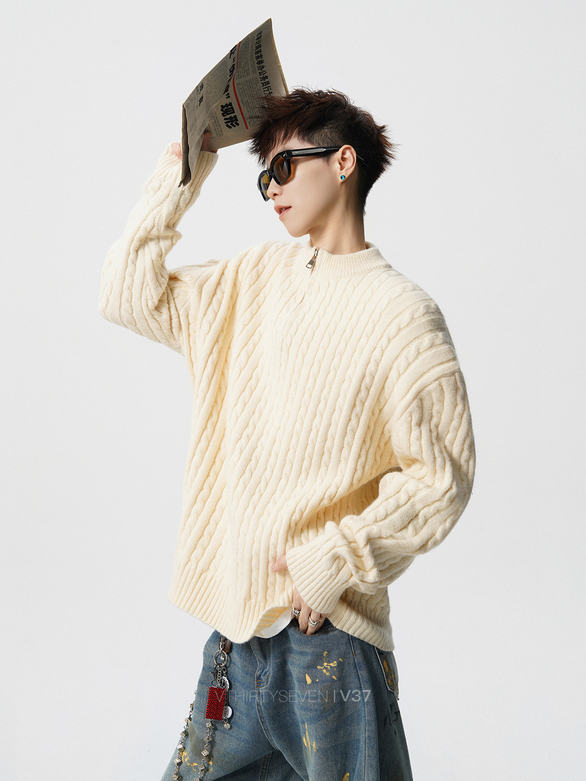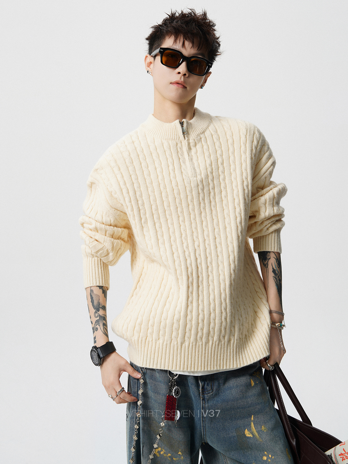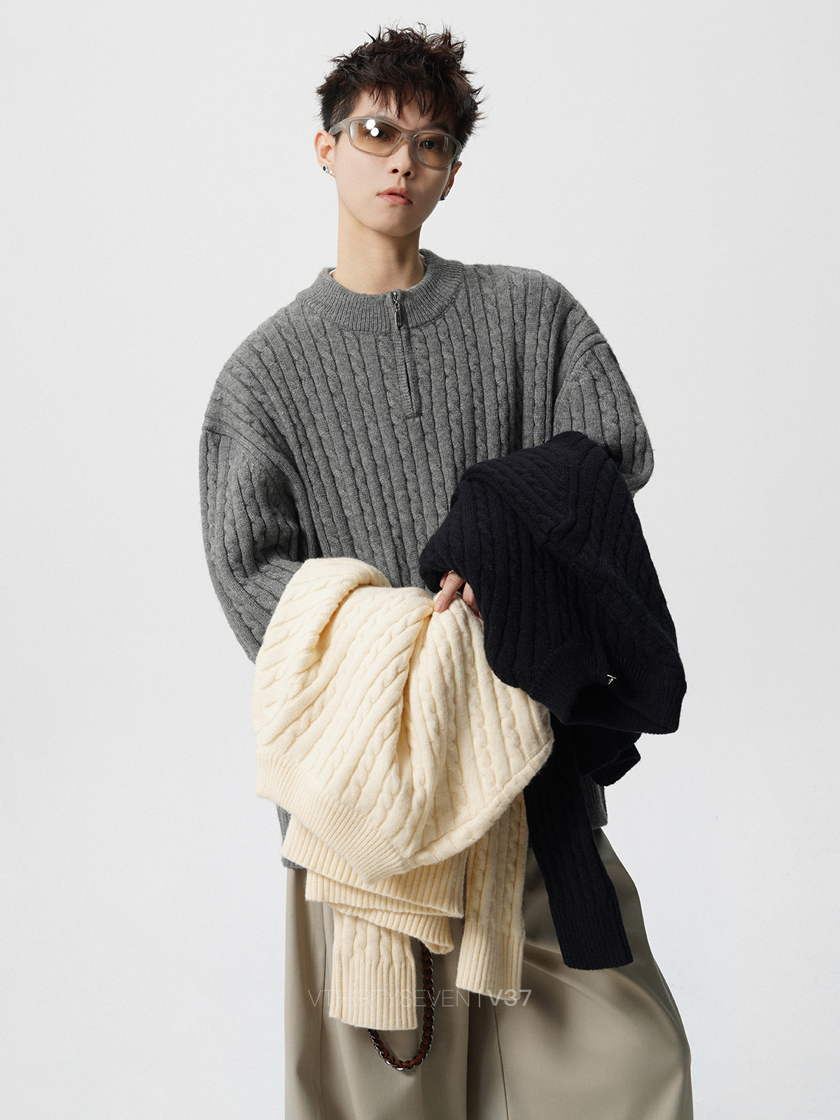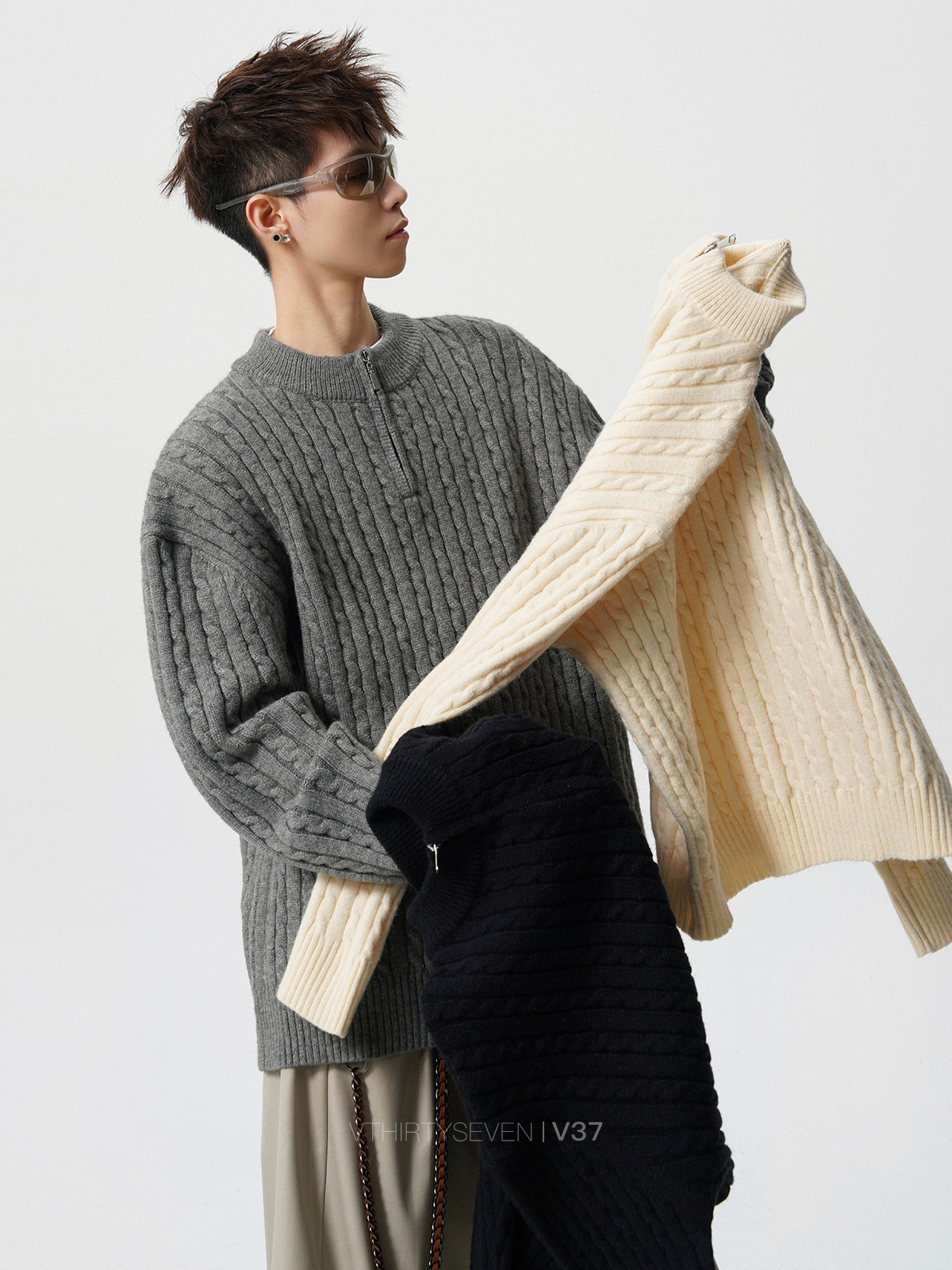V37重磅肌理感半拉鍊麻花針織衫男冬季美式復古純色休閒套頭毛衣