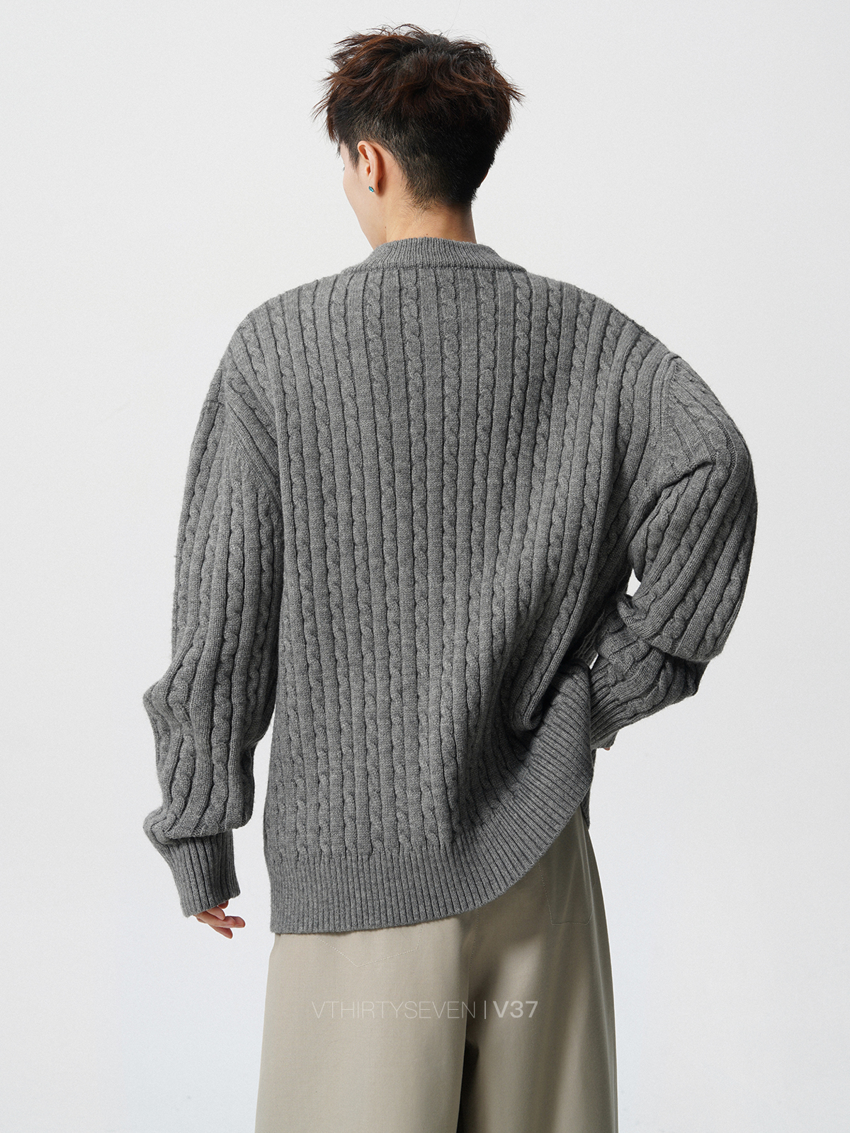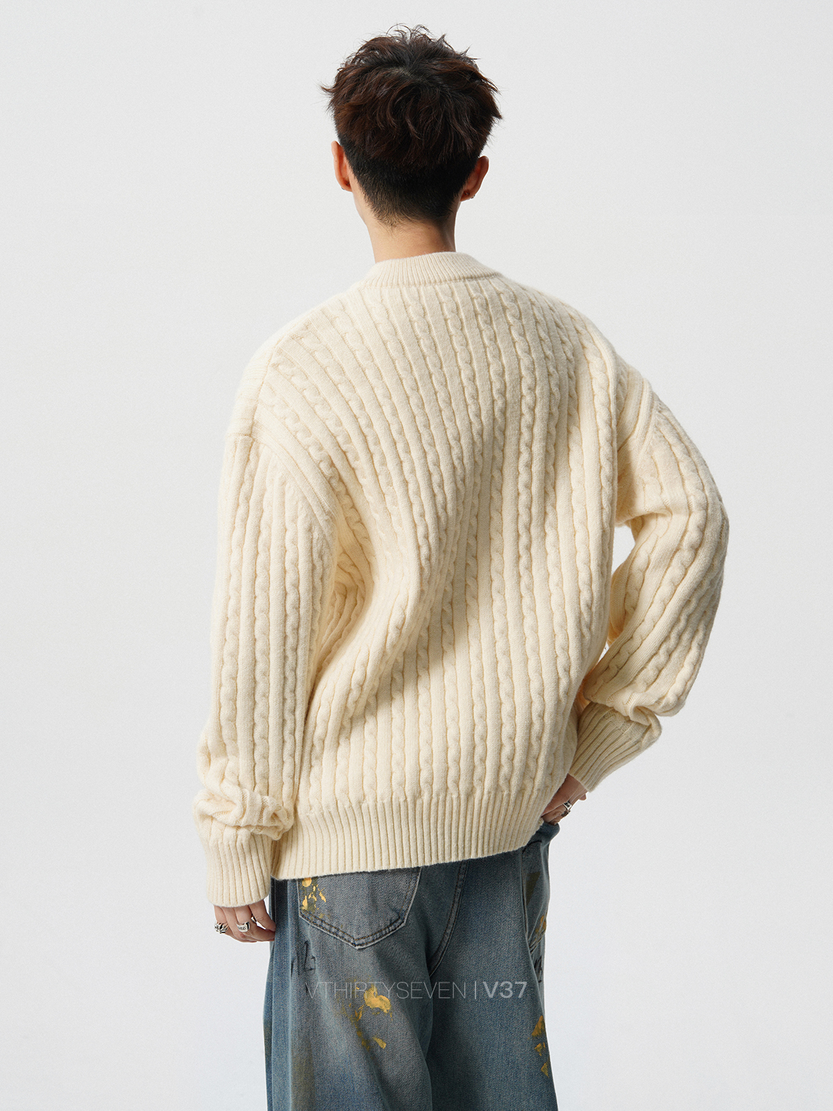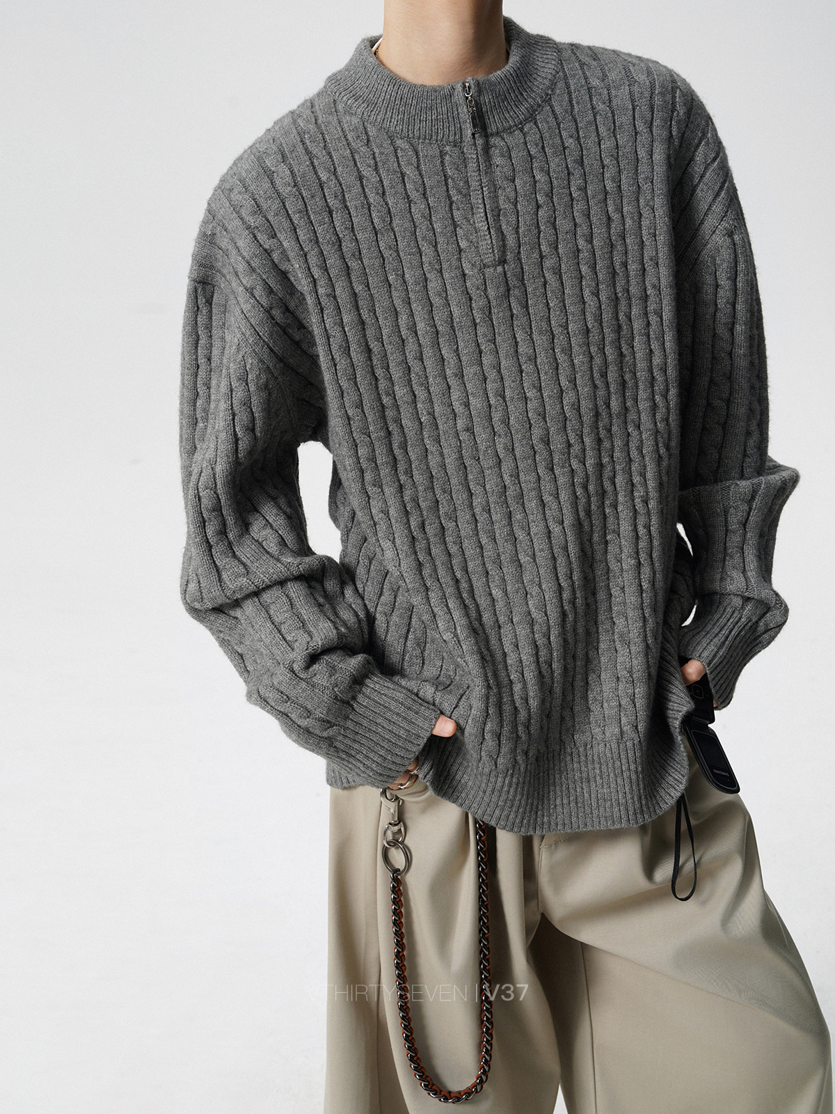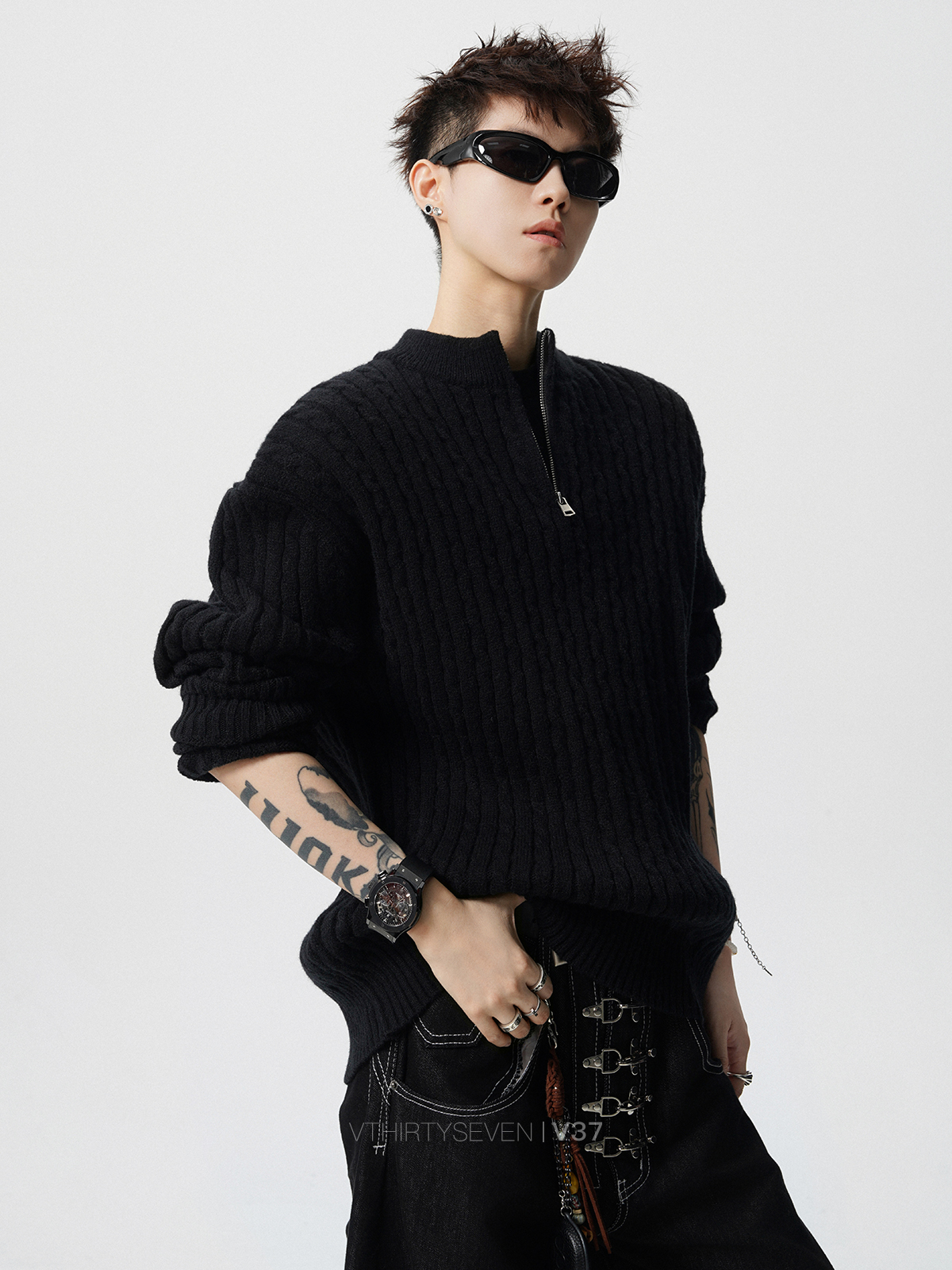 V37重磅肌理感半拉鍊麻花針織衫男冬季美式復古純色休閒套頭毛衣