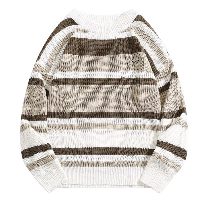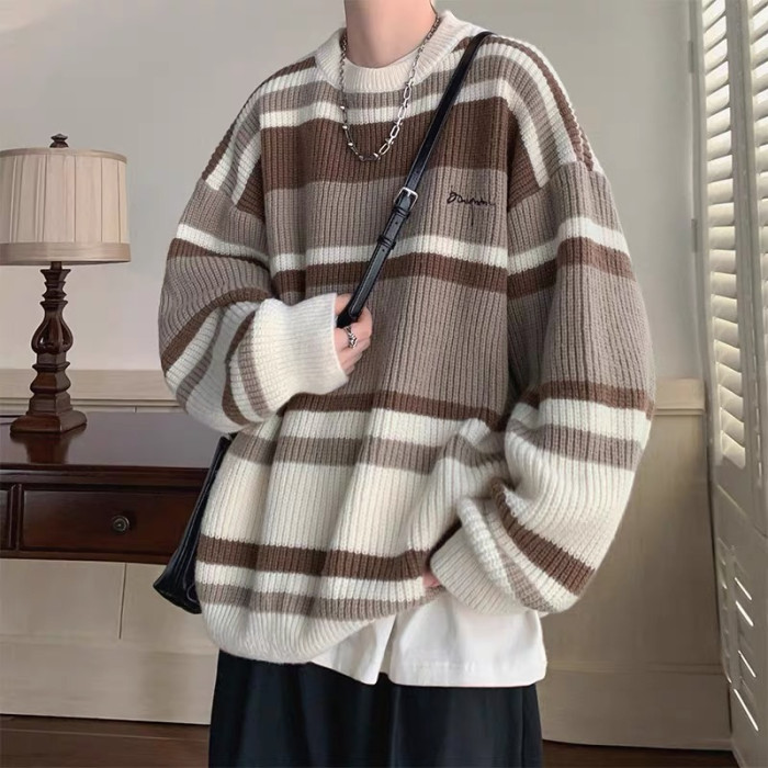 毛衣男士日系復古條紋撞色打底衫線衣秋冬加厚潮牌寬松針織衫外套
