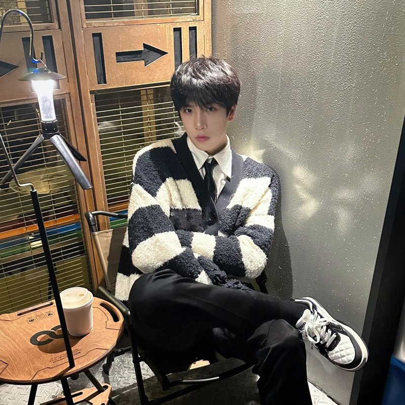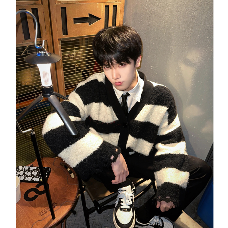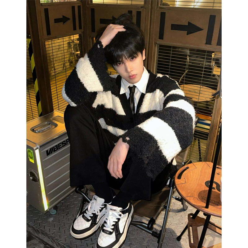 撞色條紋毛衣男冬季日系復古仿貂毛慵懶針織衫高級感軟糯開衫外套