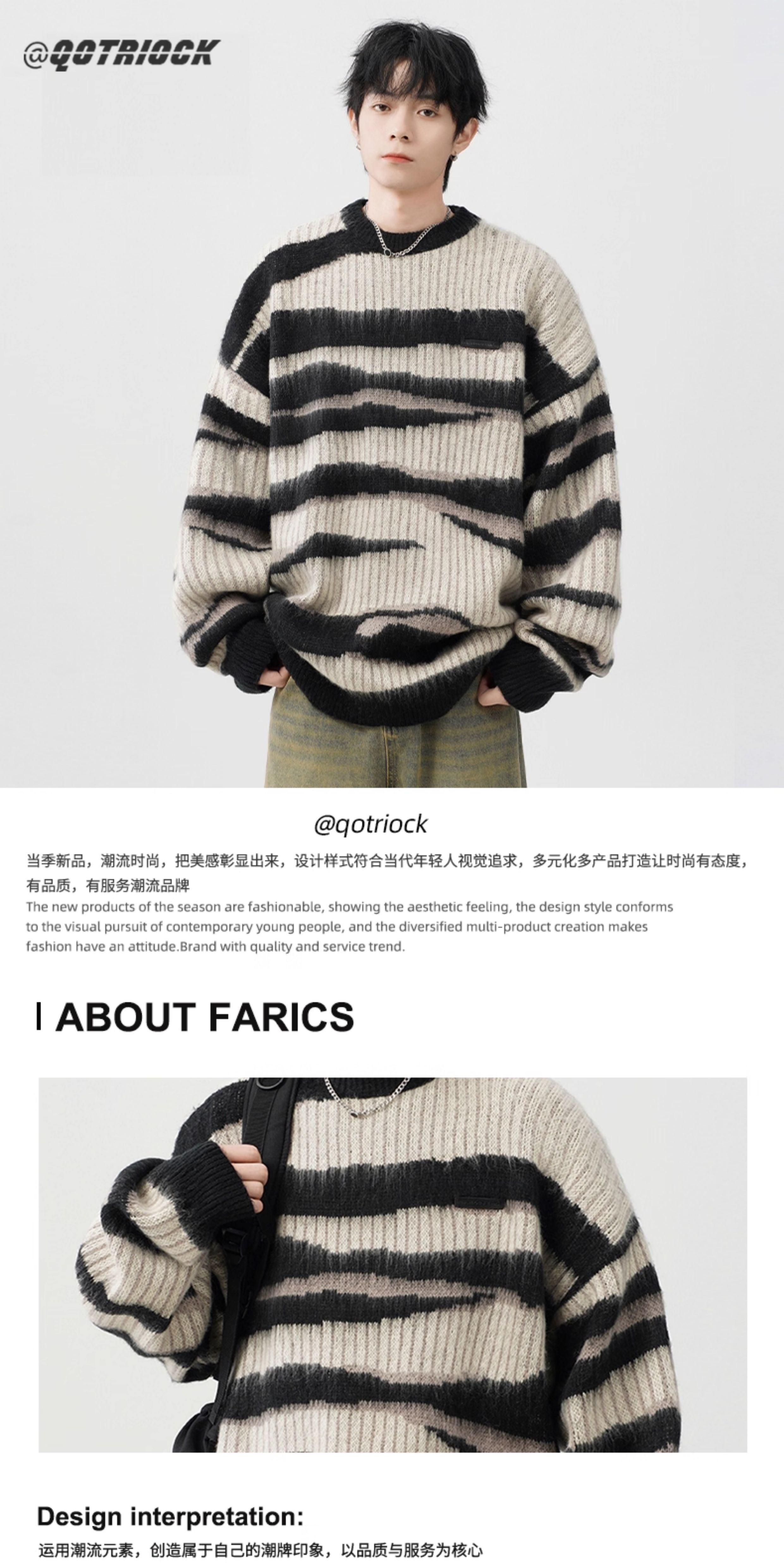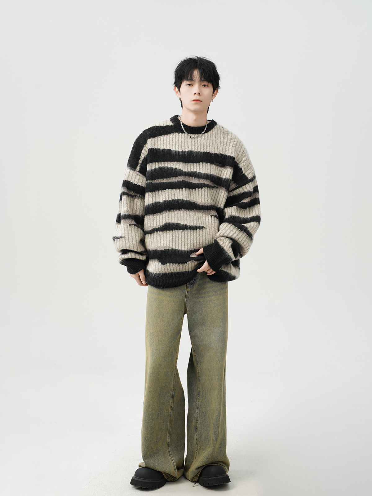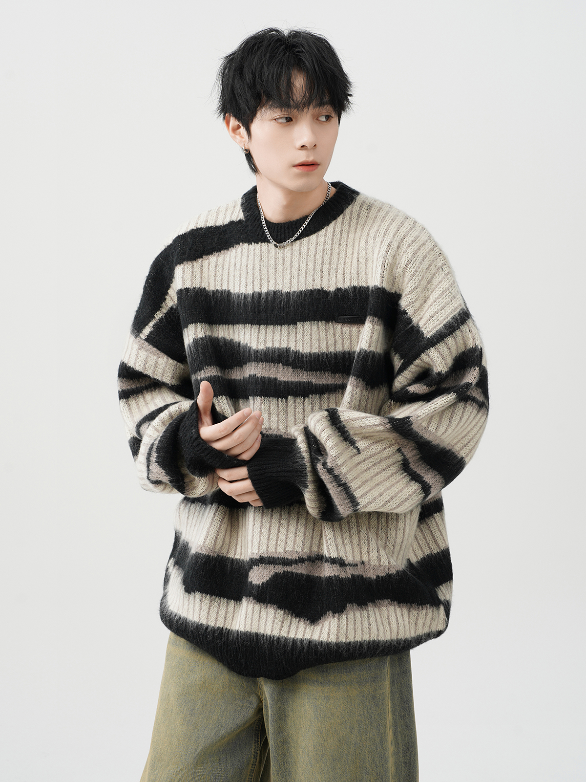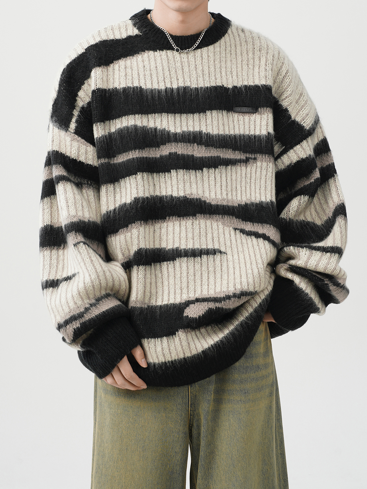美式復古海馬毛條紋圓領毛衣男女冬季潮牌oversize慵懶休閒針織衫