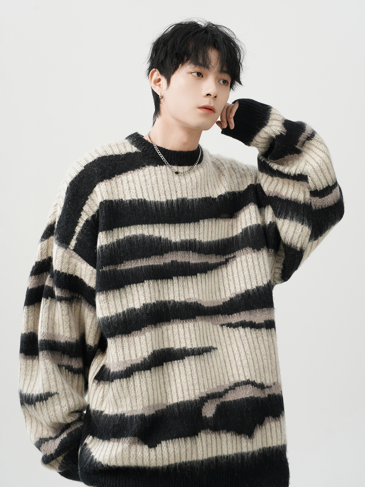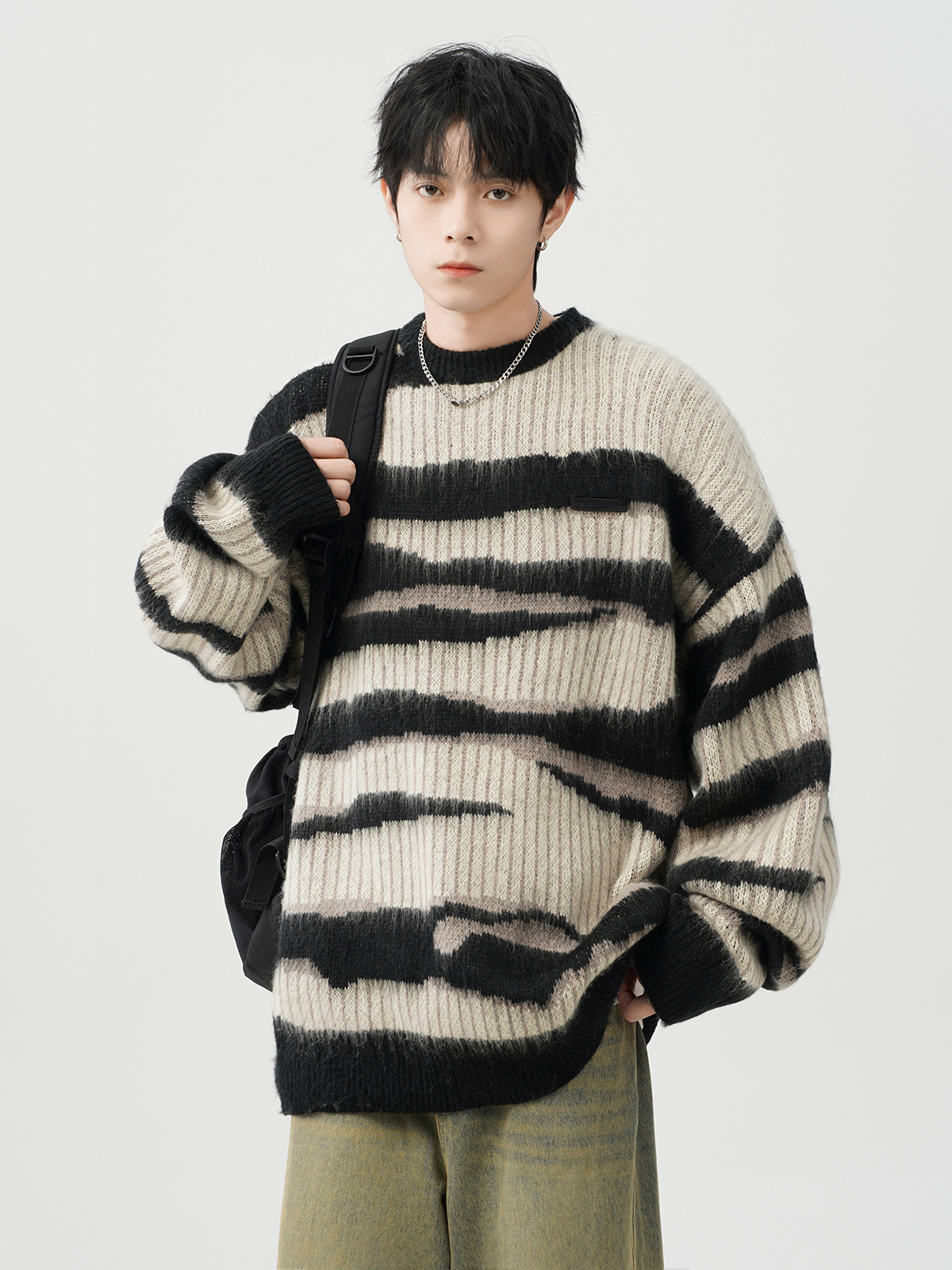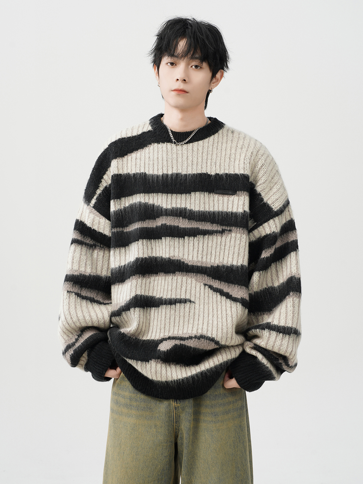 美式復古海馬毛條紋圓領毛衣男女冬季潮牌oversize慵懶休閒針織衫