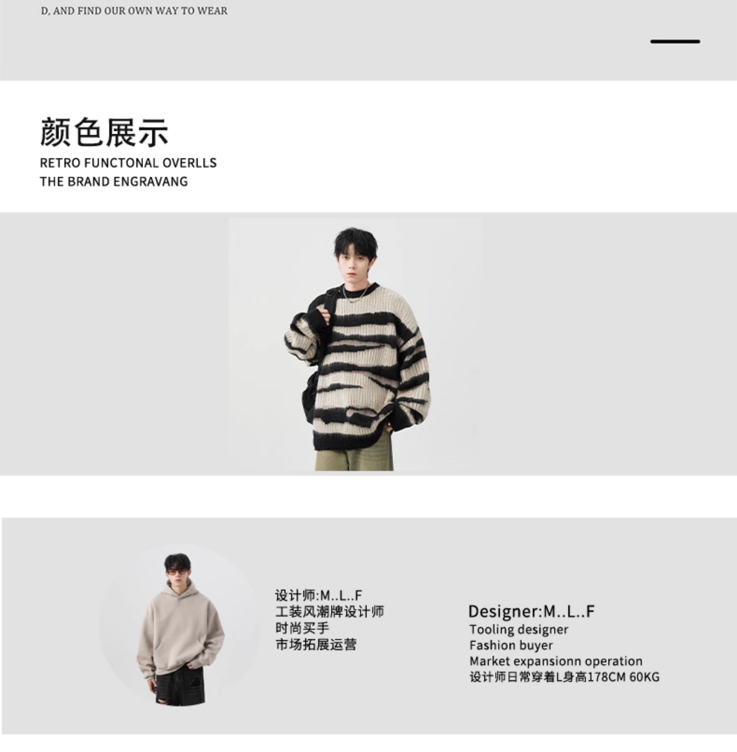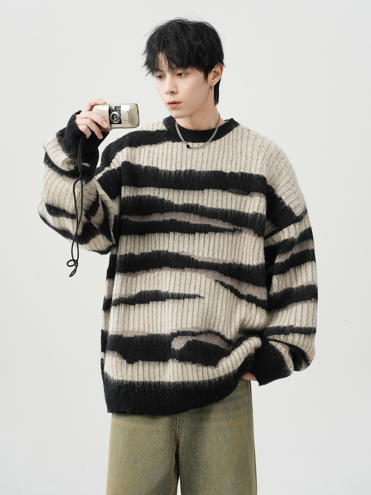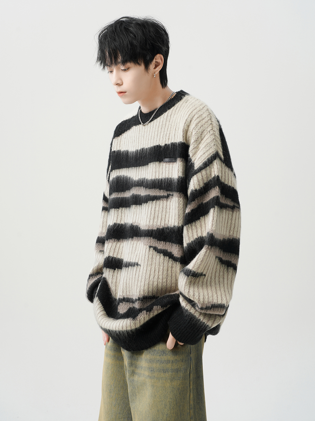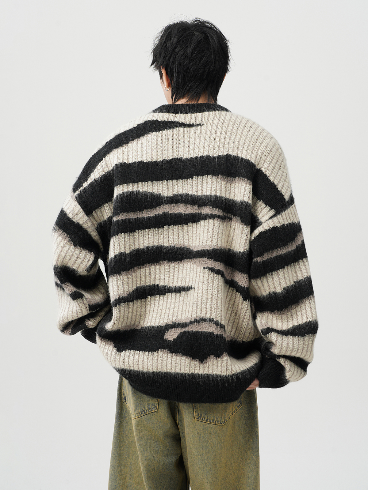 美式復古海馬毛條紋圓領毛衣男女冬季潮牌oversize慵懶休閒針織衫