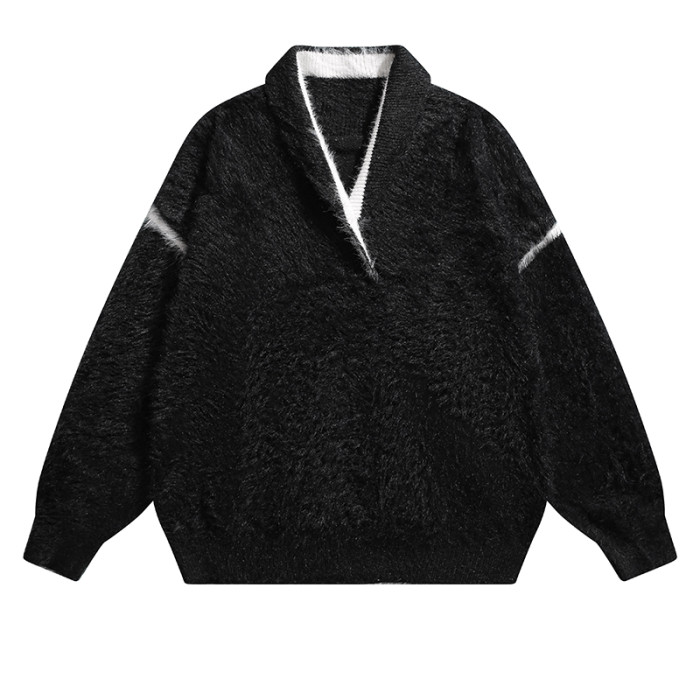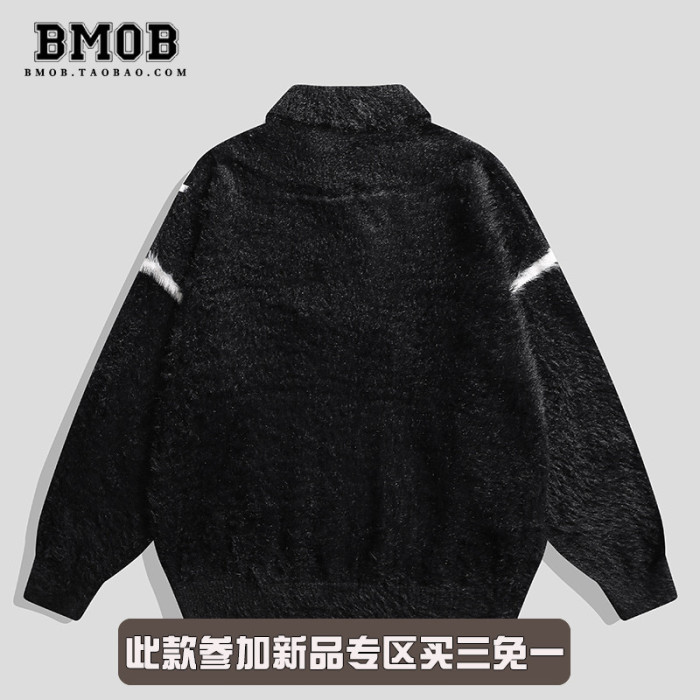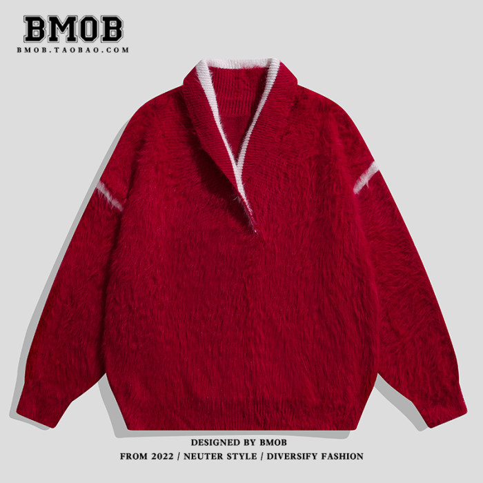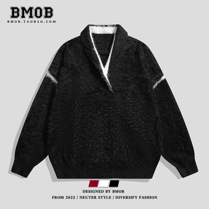 BMOB美式高級感仿貂毛毛衣重磅V領寬松潮牌設計感小衆針織衫外套