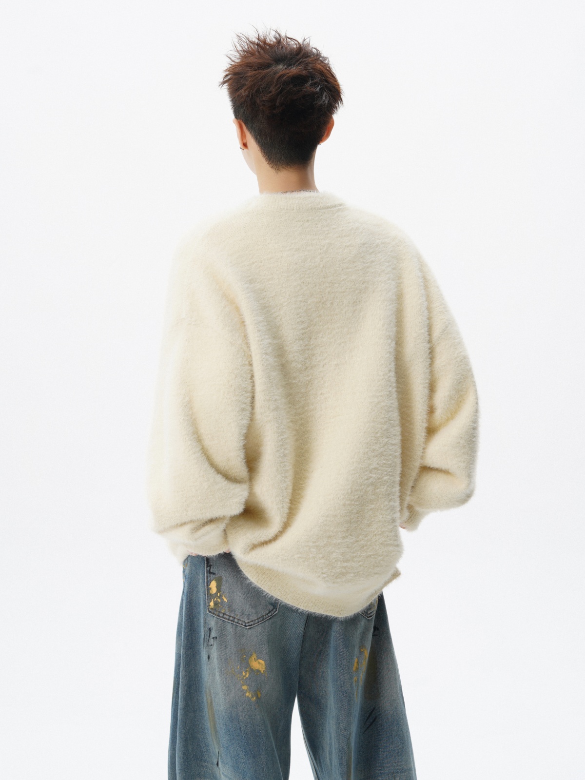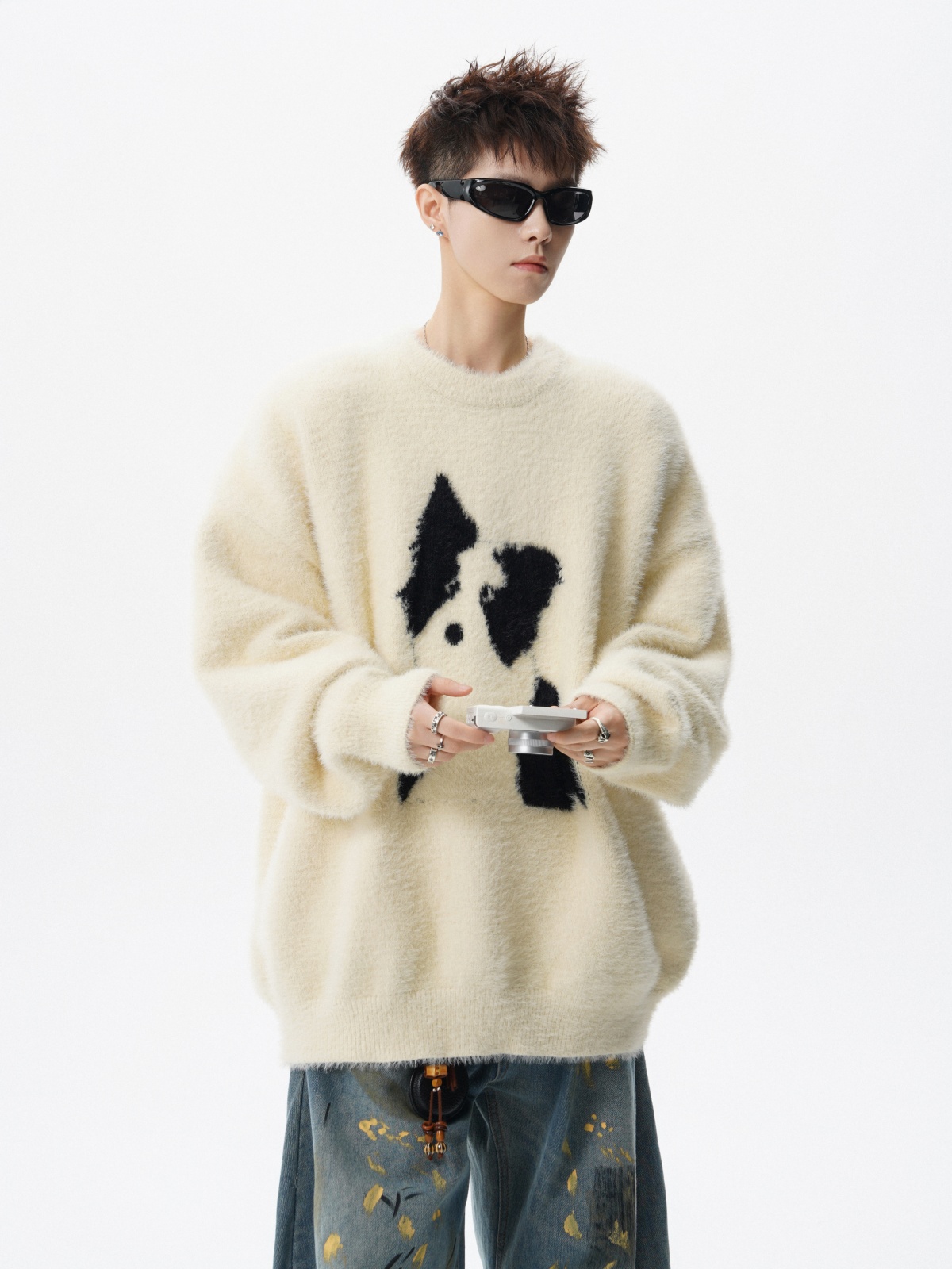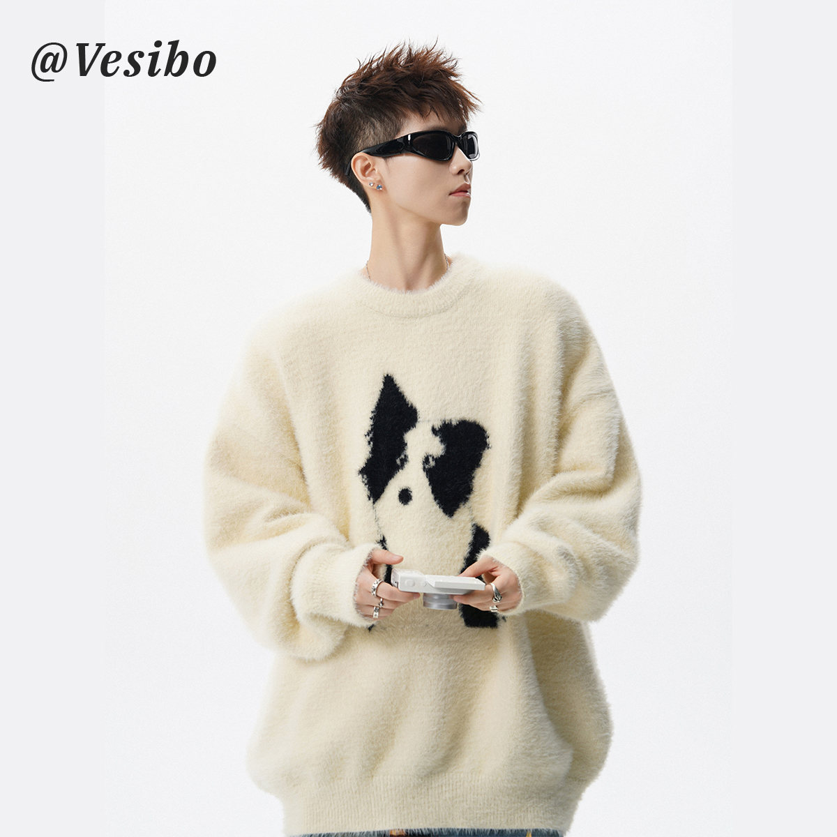 美式卡通小狗套頭毛衣男冬季馬海毛圓領針織衫慵懶感休閒情侶內搭