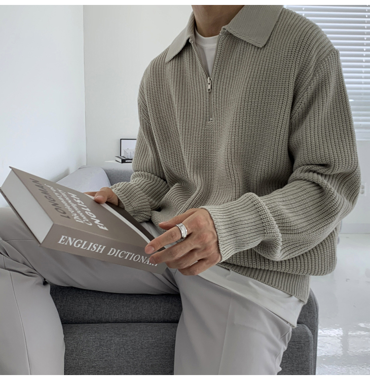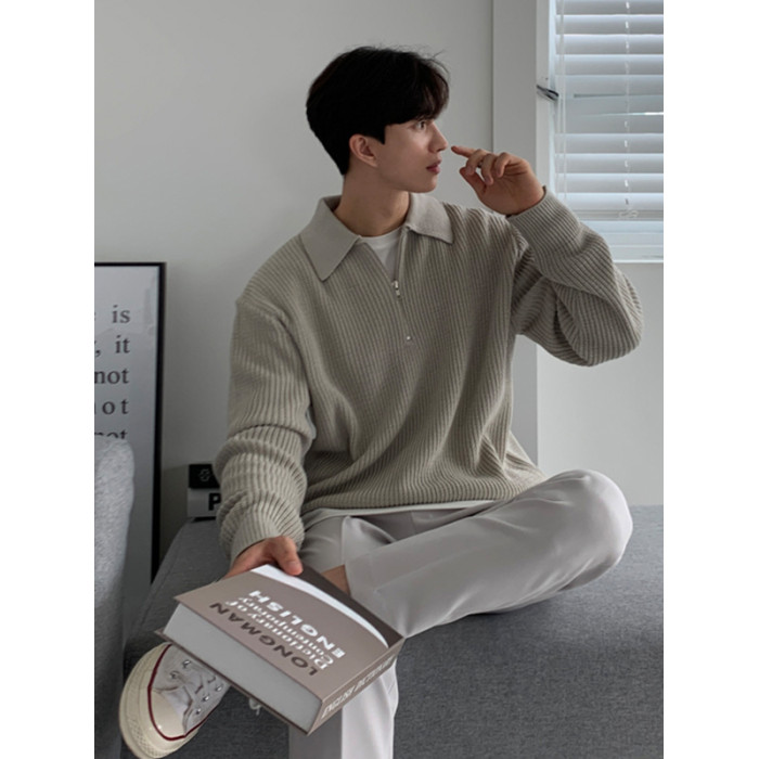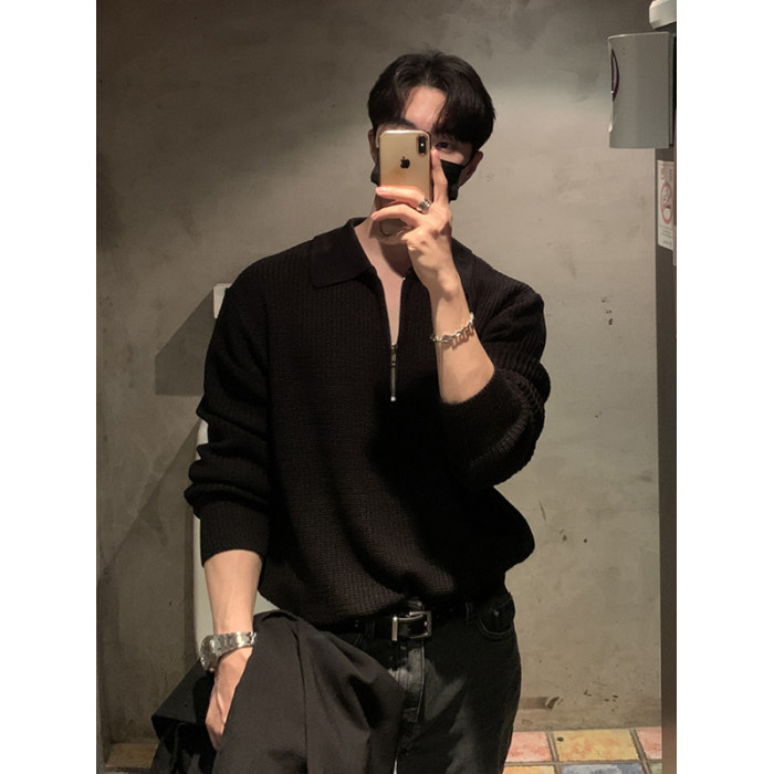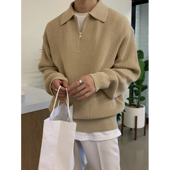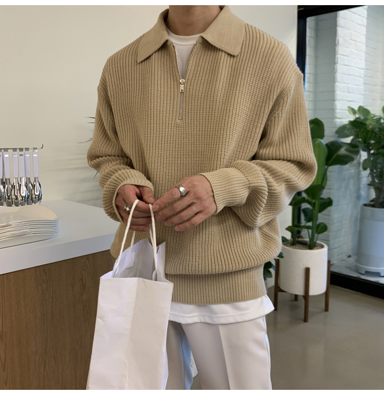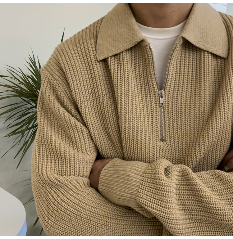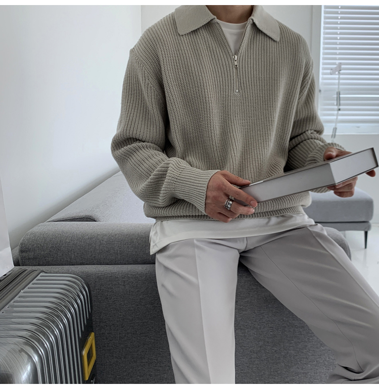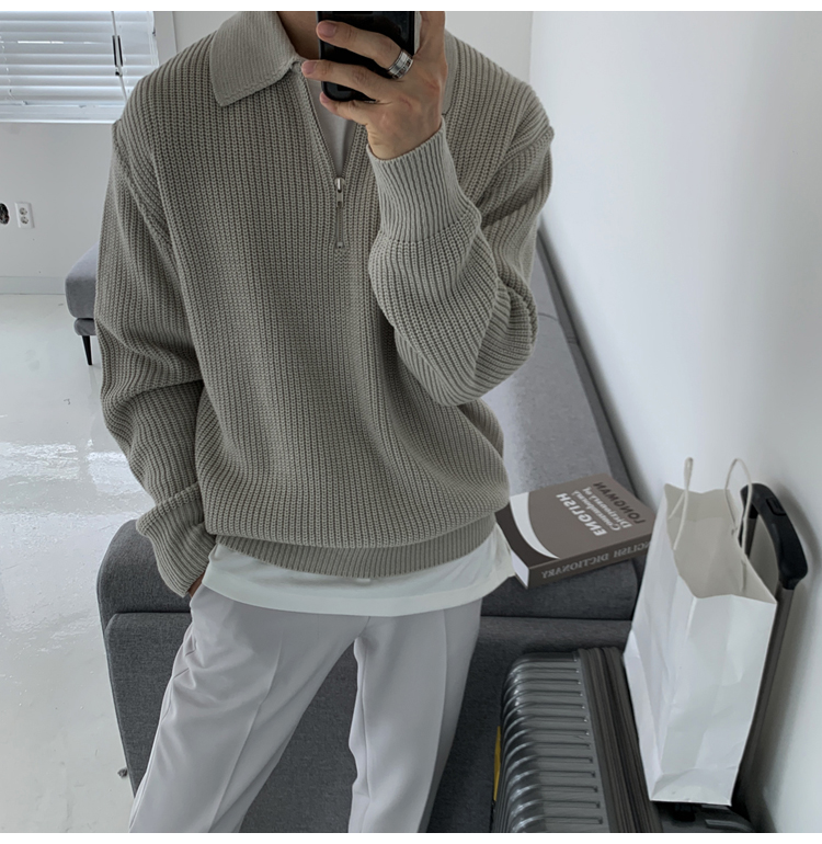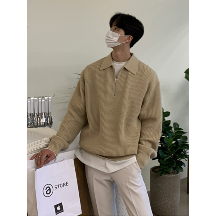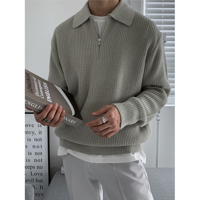 韓版高級感慵懶拉鍊毛衣男休閒潮流寬松翻領針織衫秋冬季長袖上衣