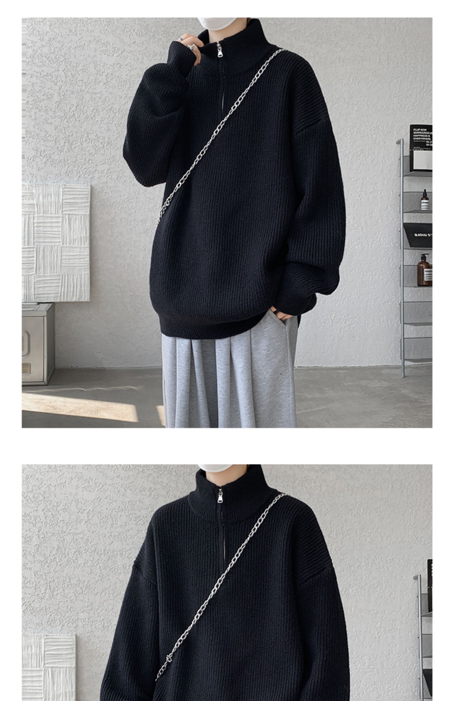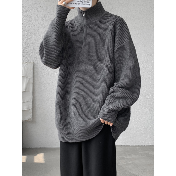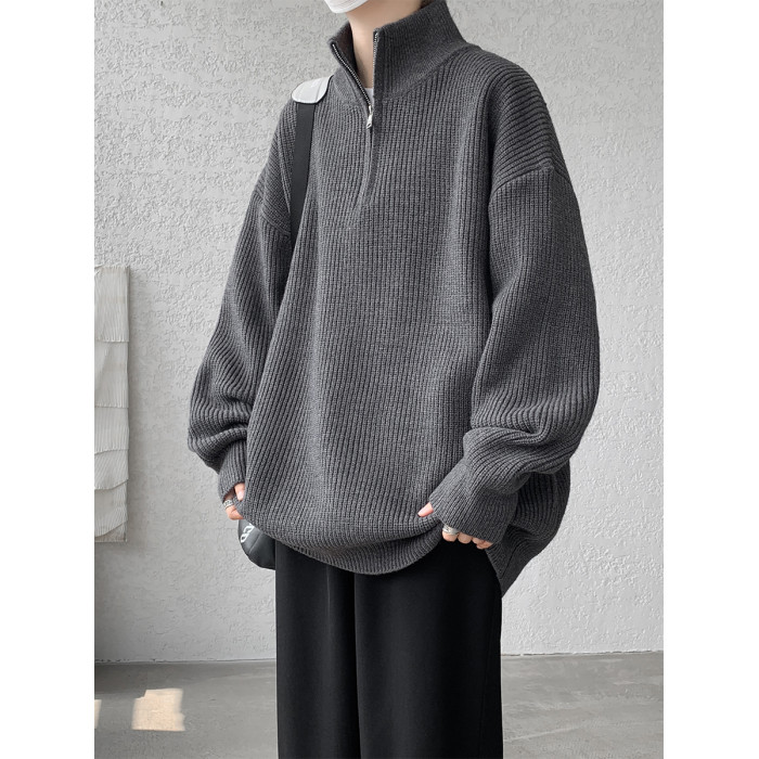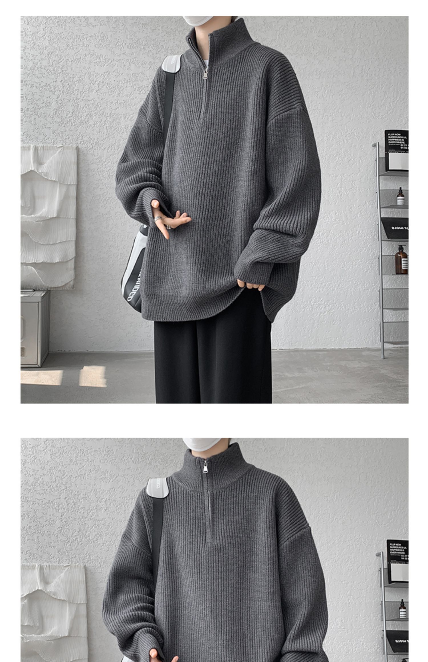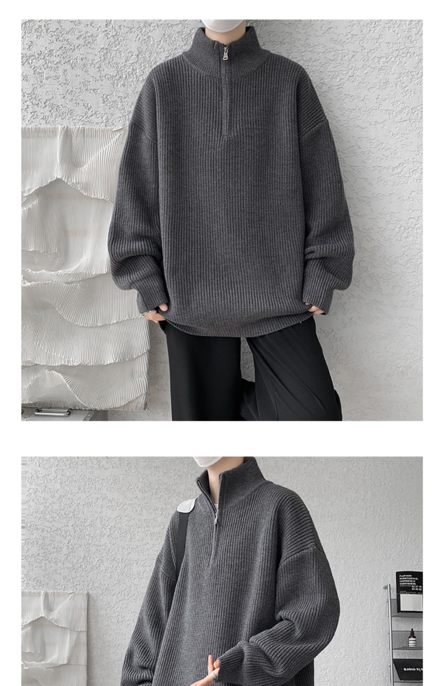 灰色半拉鍊毛衣男款冬季寬松慵懶痞帥半高立領內搭針織衫外套男厚