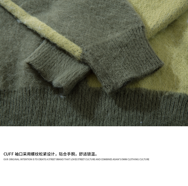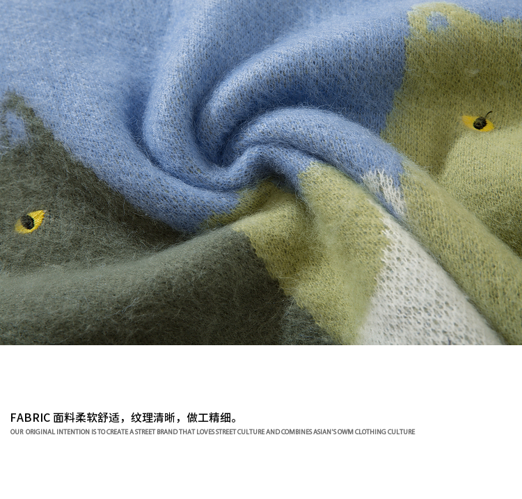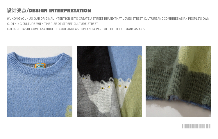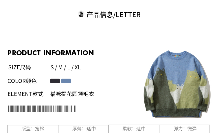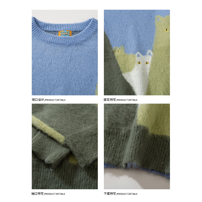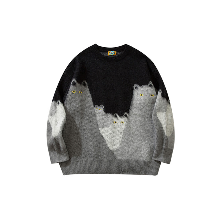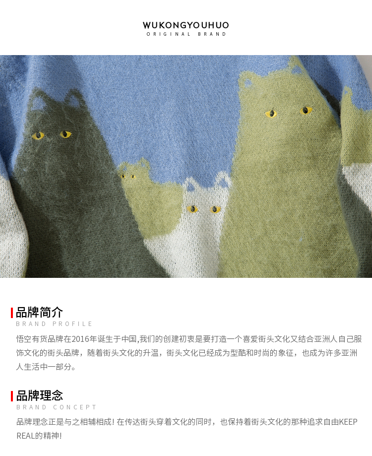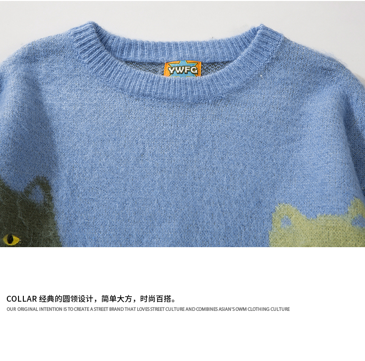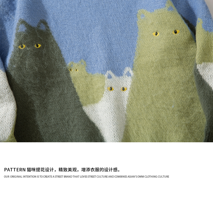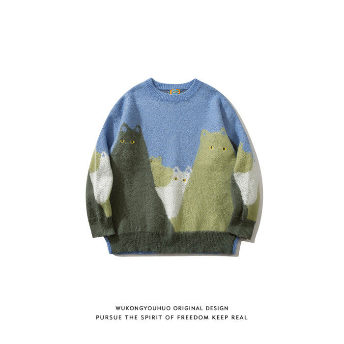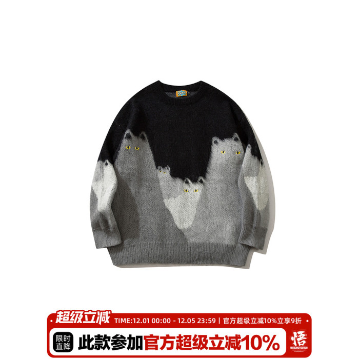 悟空有貨復古趣味可愛貓咪圓領毛衣男女潮牌寬松慵懶風百搭針織衫