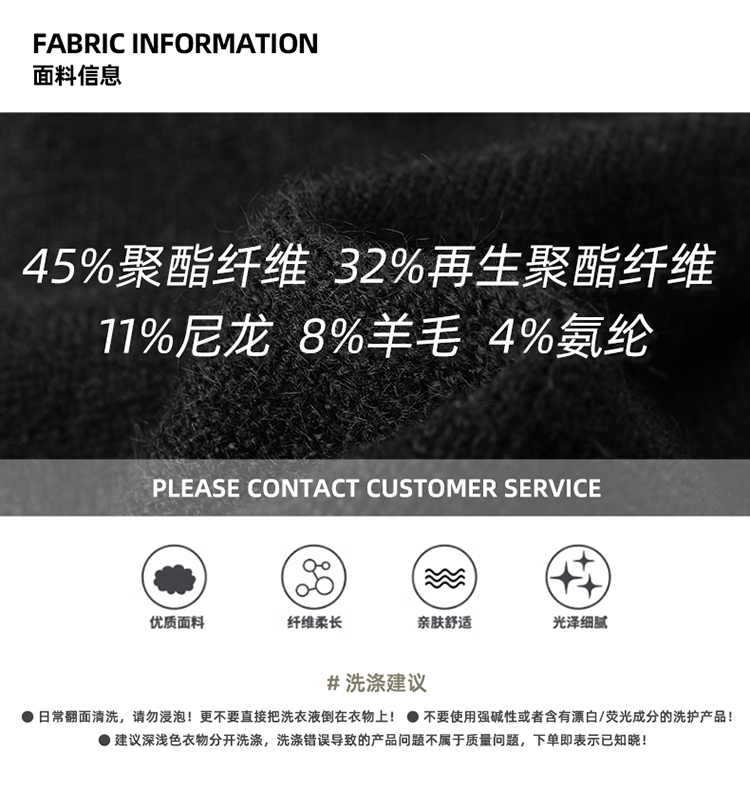 | 材質成分 | 聚酯纖維80.7% 聚醯胺纖維(錦綸)11.7% 綿羊毛5.9% 聚氨酯彈性纖維(氨綸)1.7% |