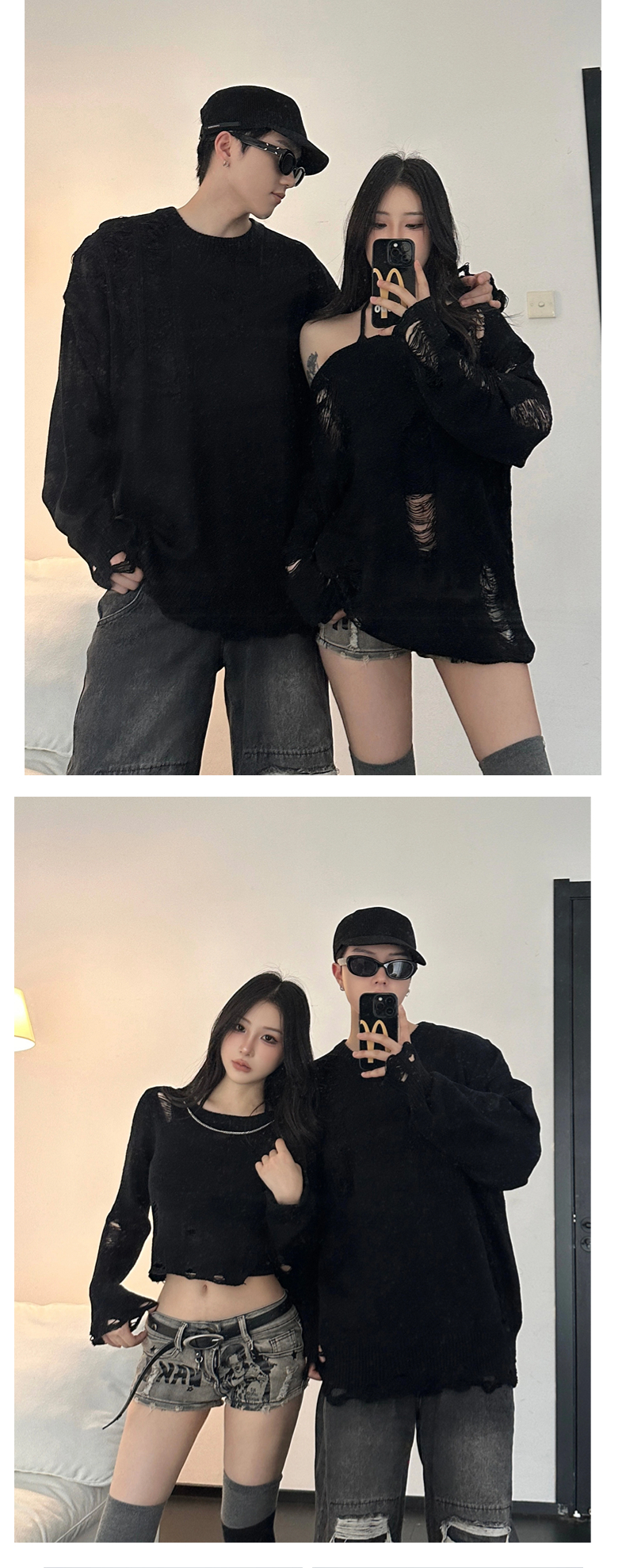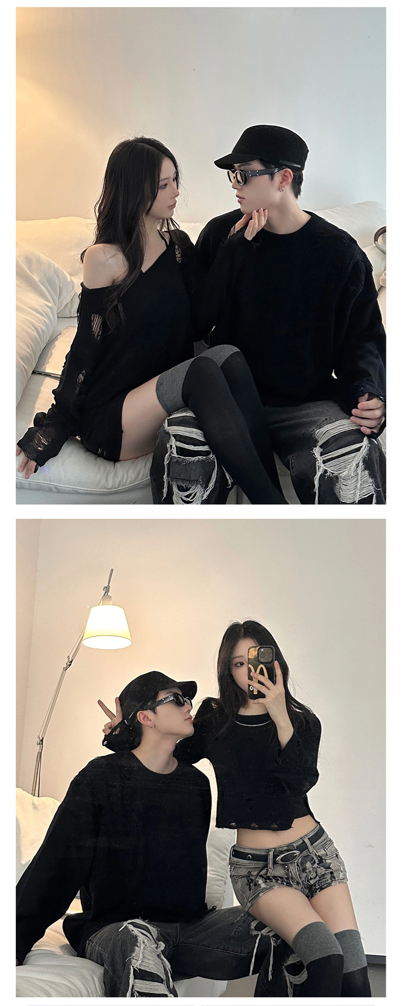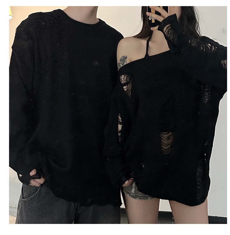 設計感一字肩破洞針織衫春秋季高級感美式辣妹寬松軟糯情侶裝毛衣