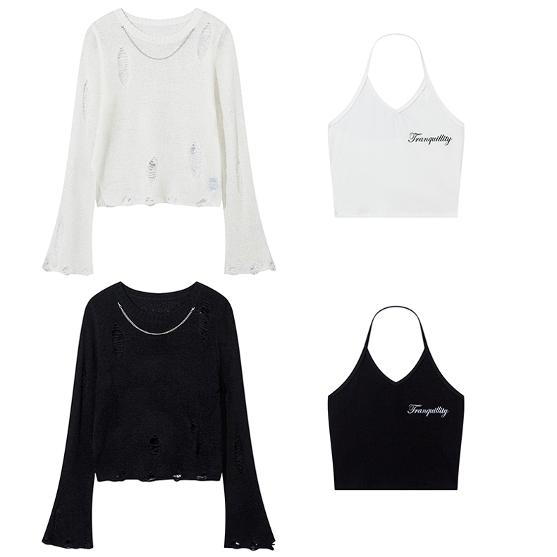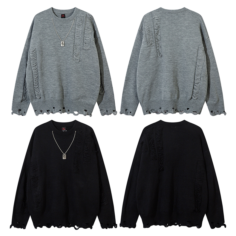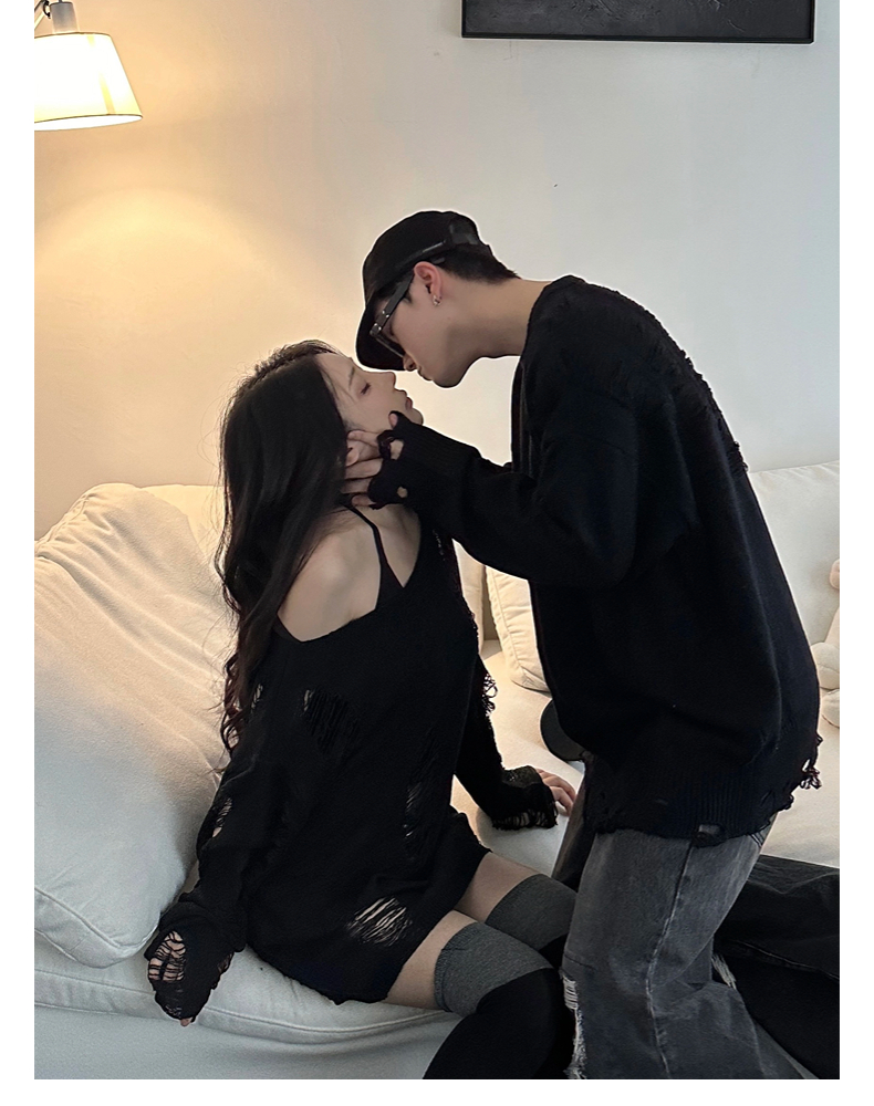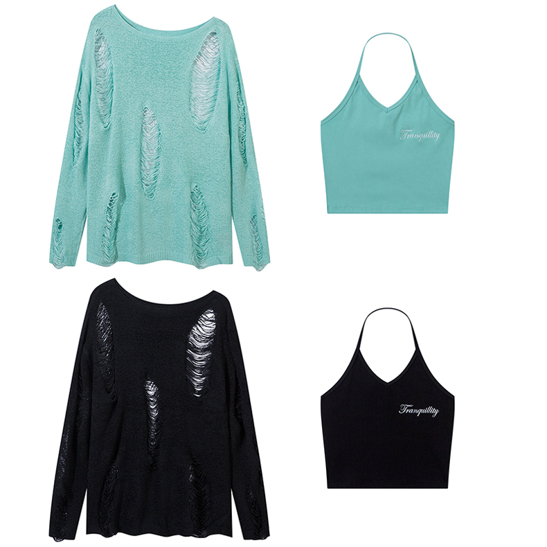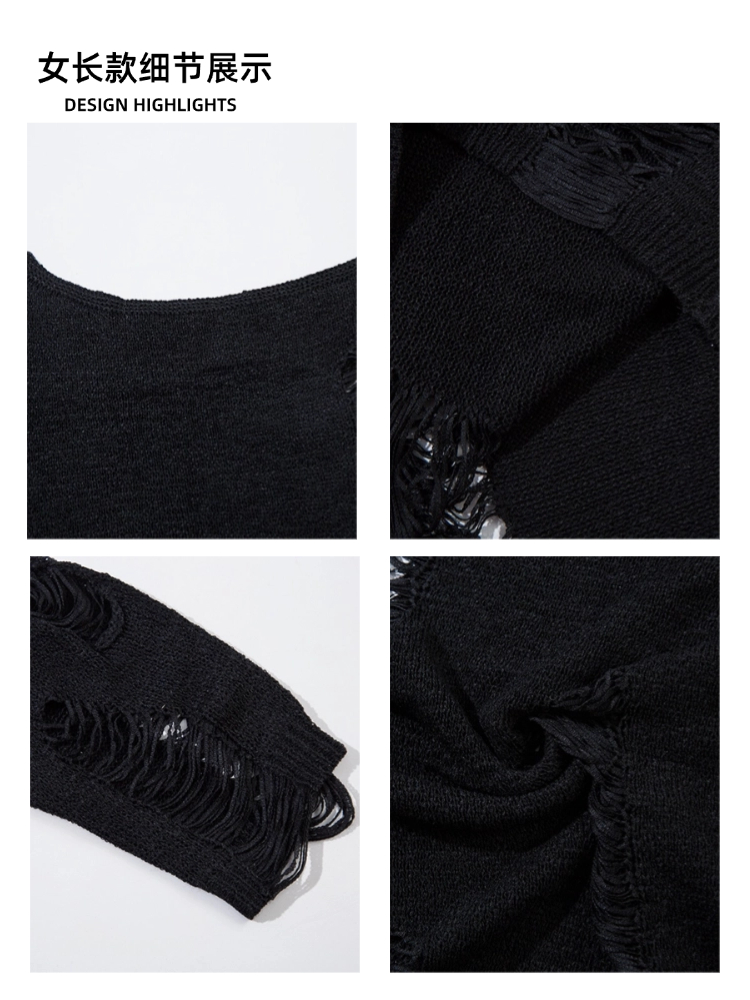 設計感一字肩破洞針織衫春秋季高級感美式辣妹寬松軟糯情侶裝毛衣