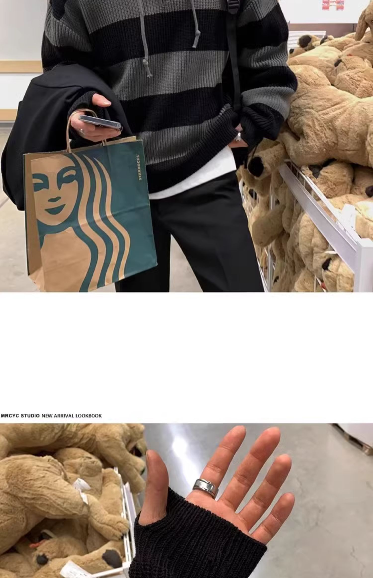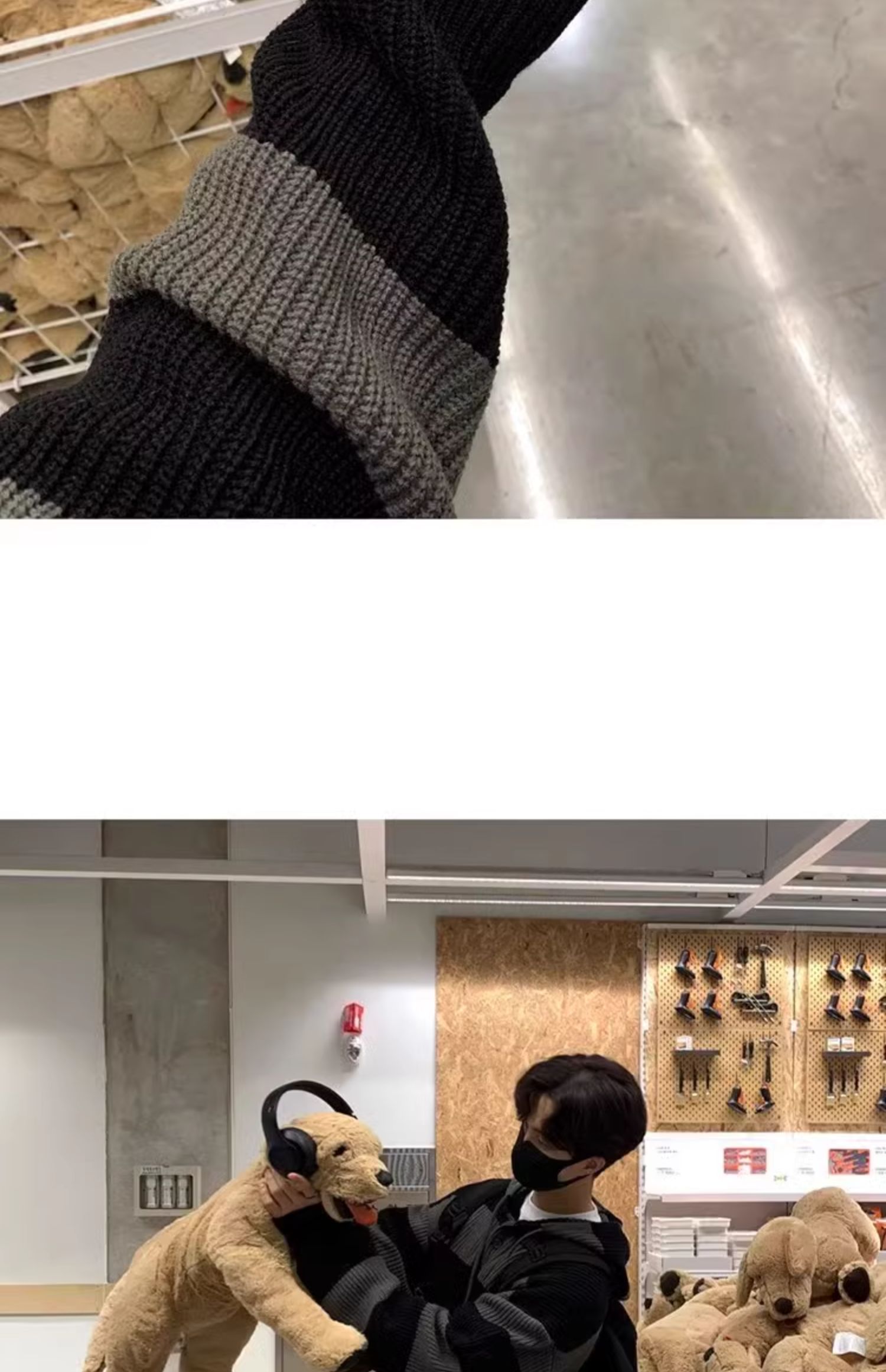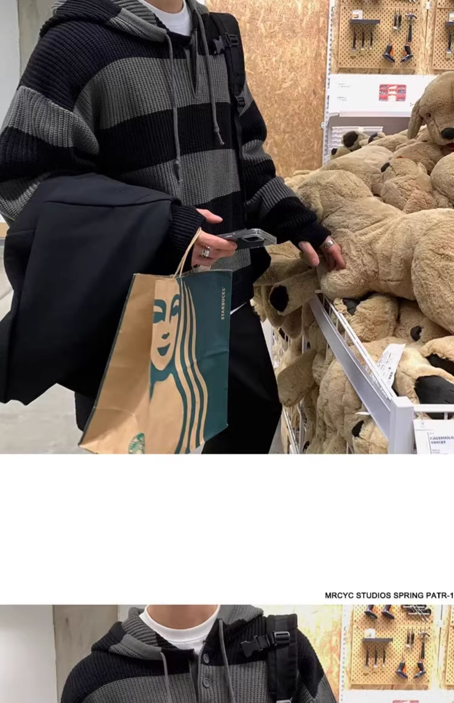 條紋毛衣男士秋冬新款美式復古潮牌針織衫寬松慵懶風連帽線衣外套