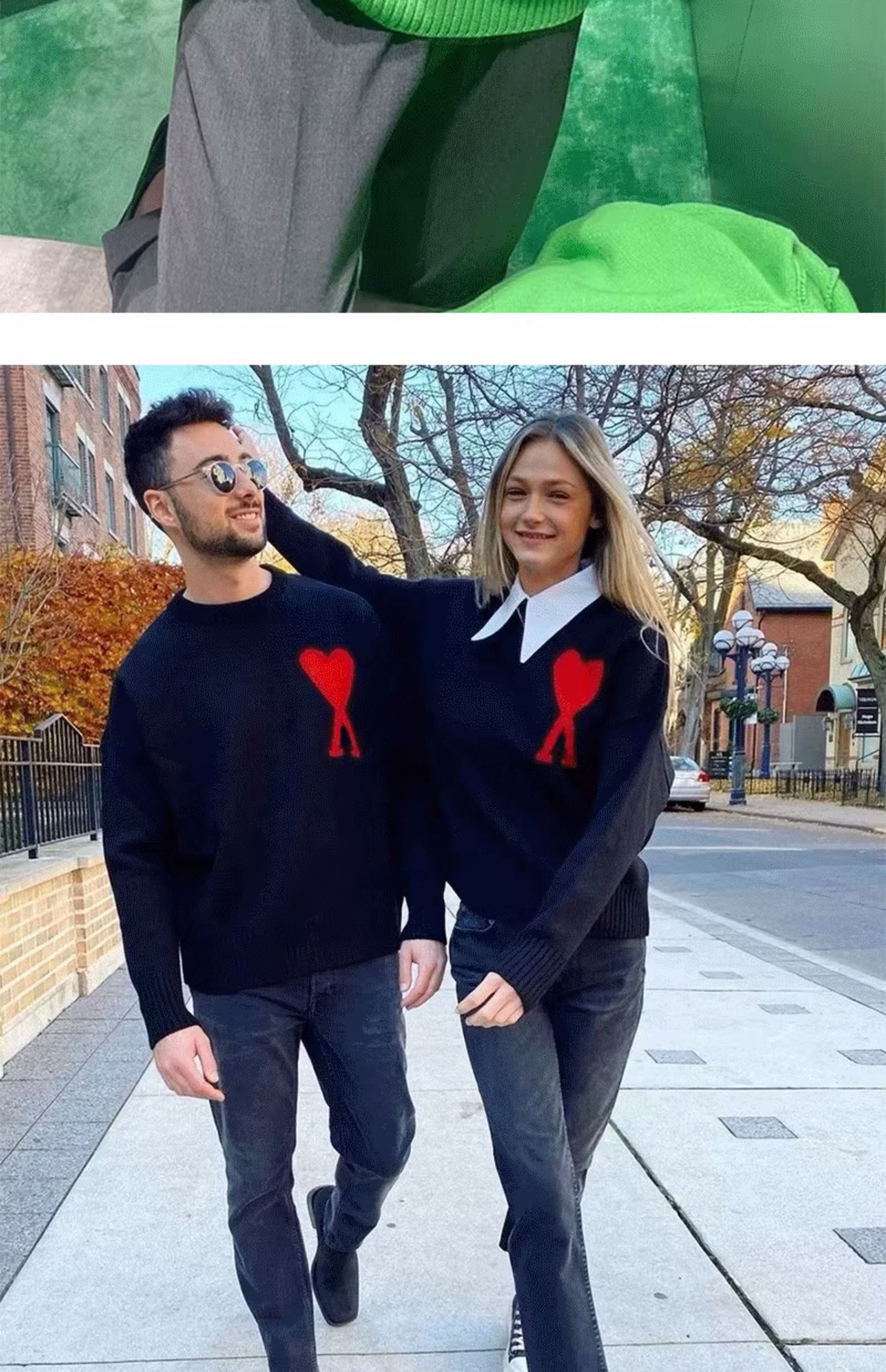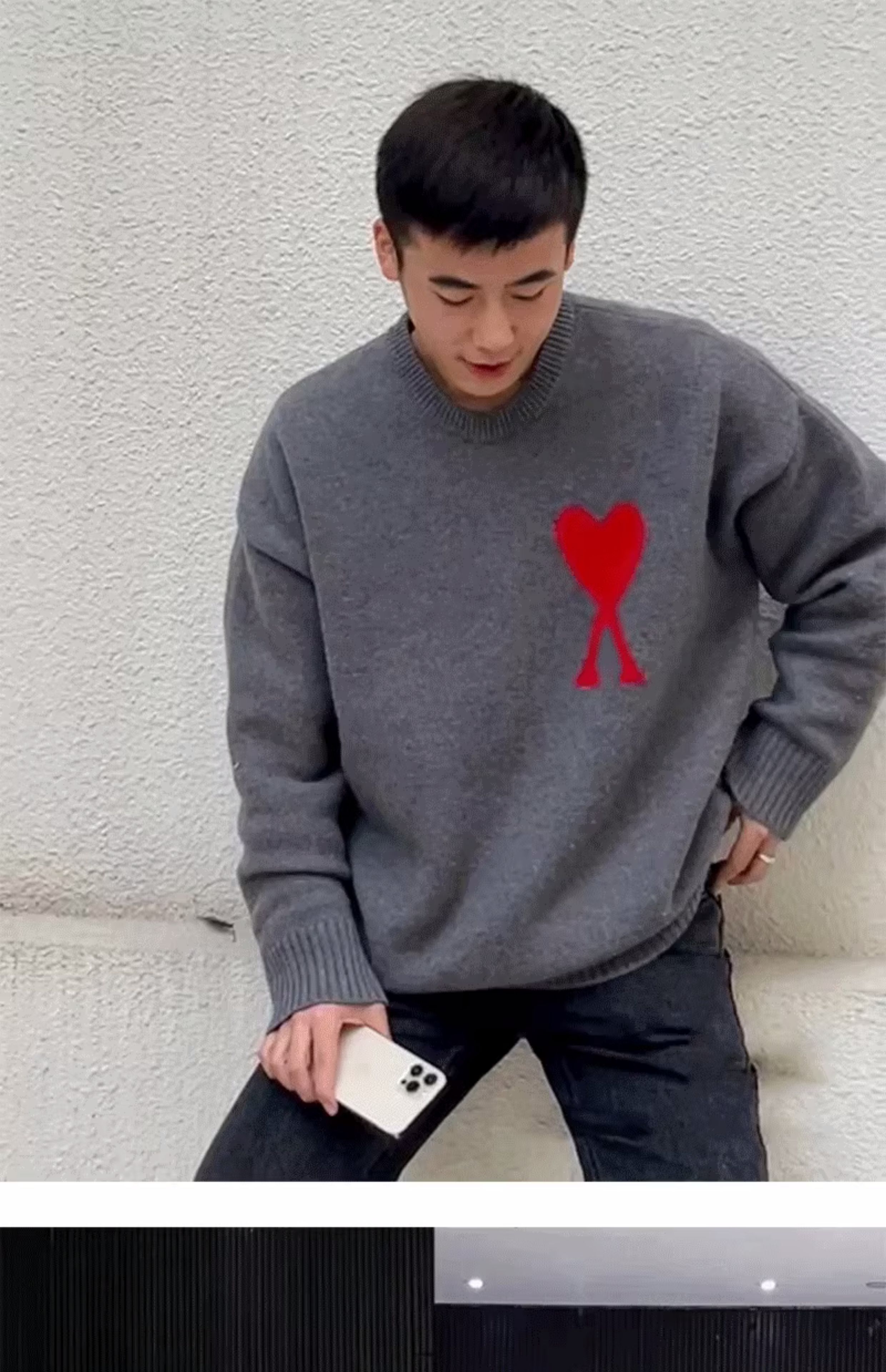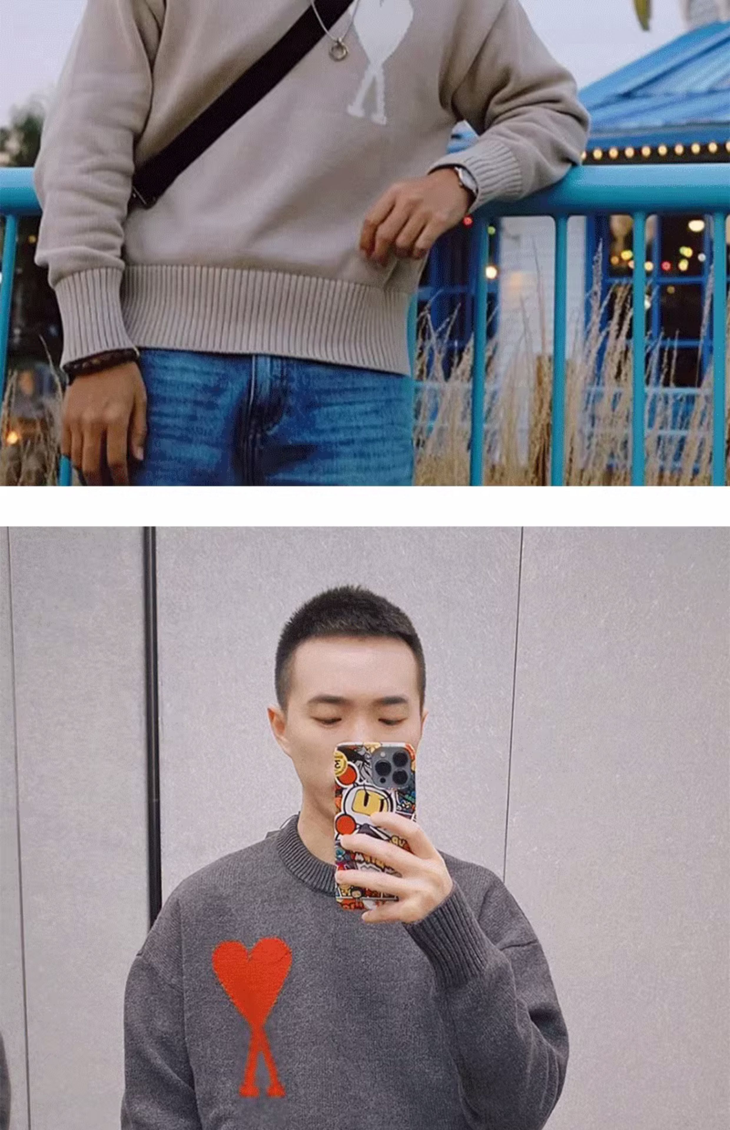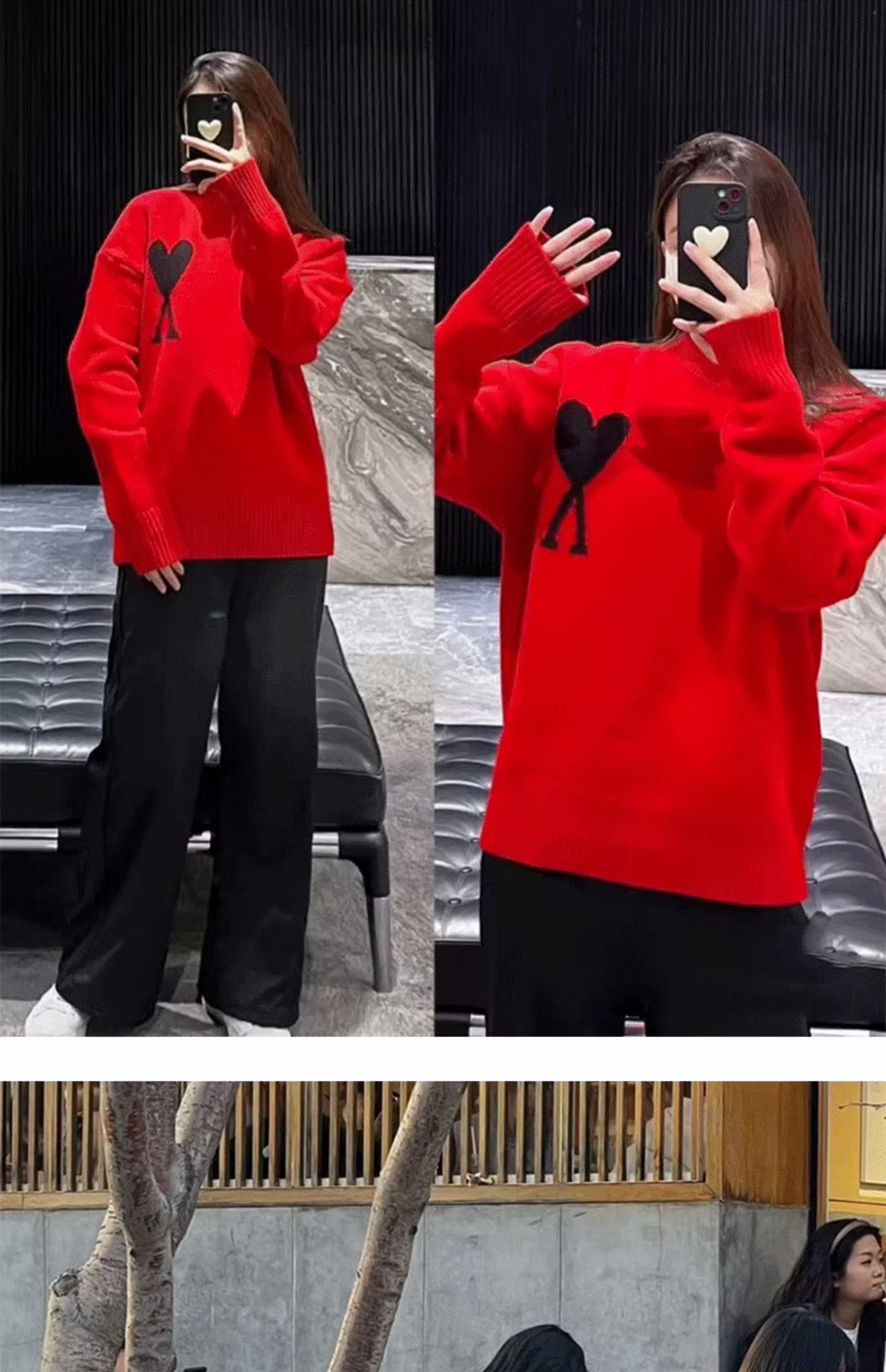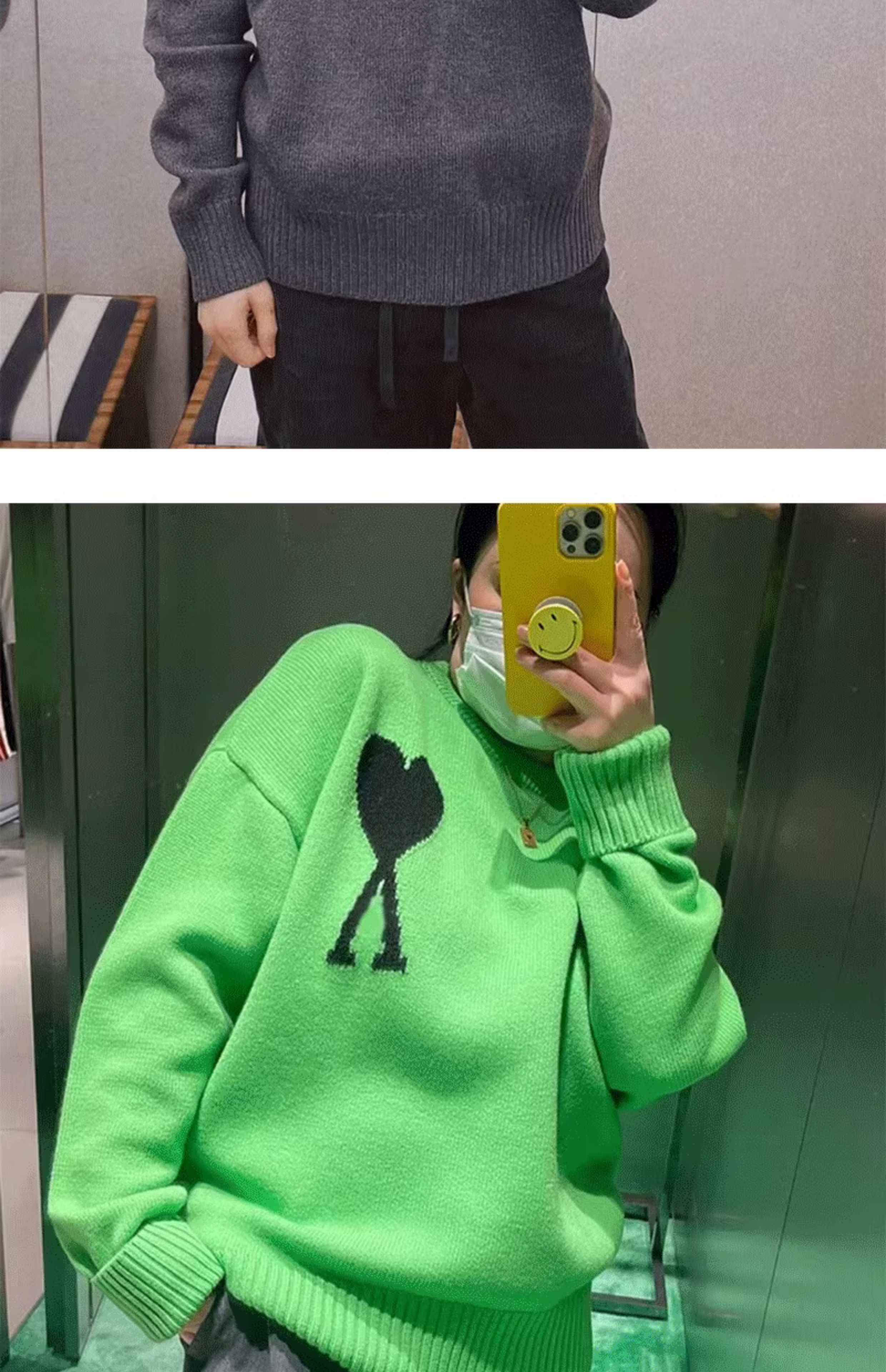 秋冬新款愛心刺綉圓領針織衫套頭男女寬松AMI CLAMS毛衣長袖上衣