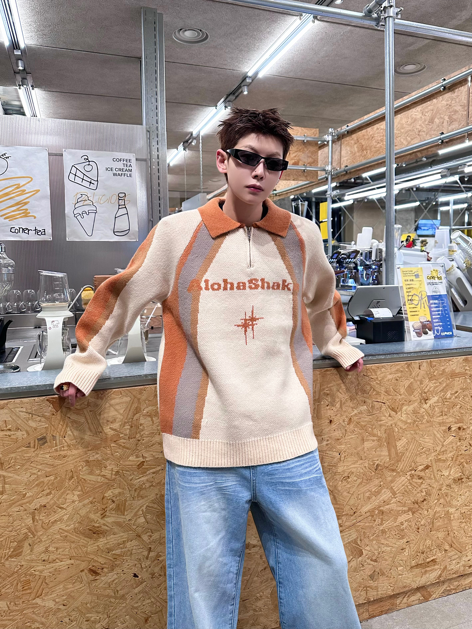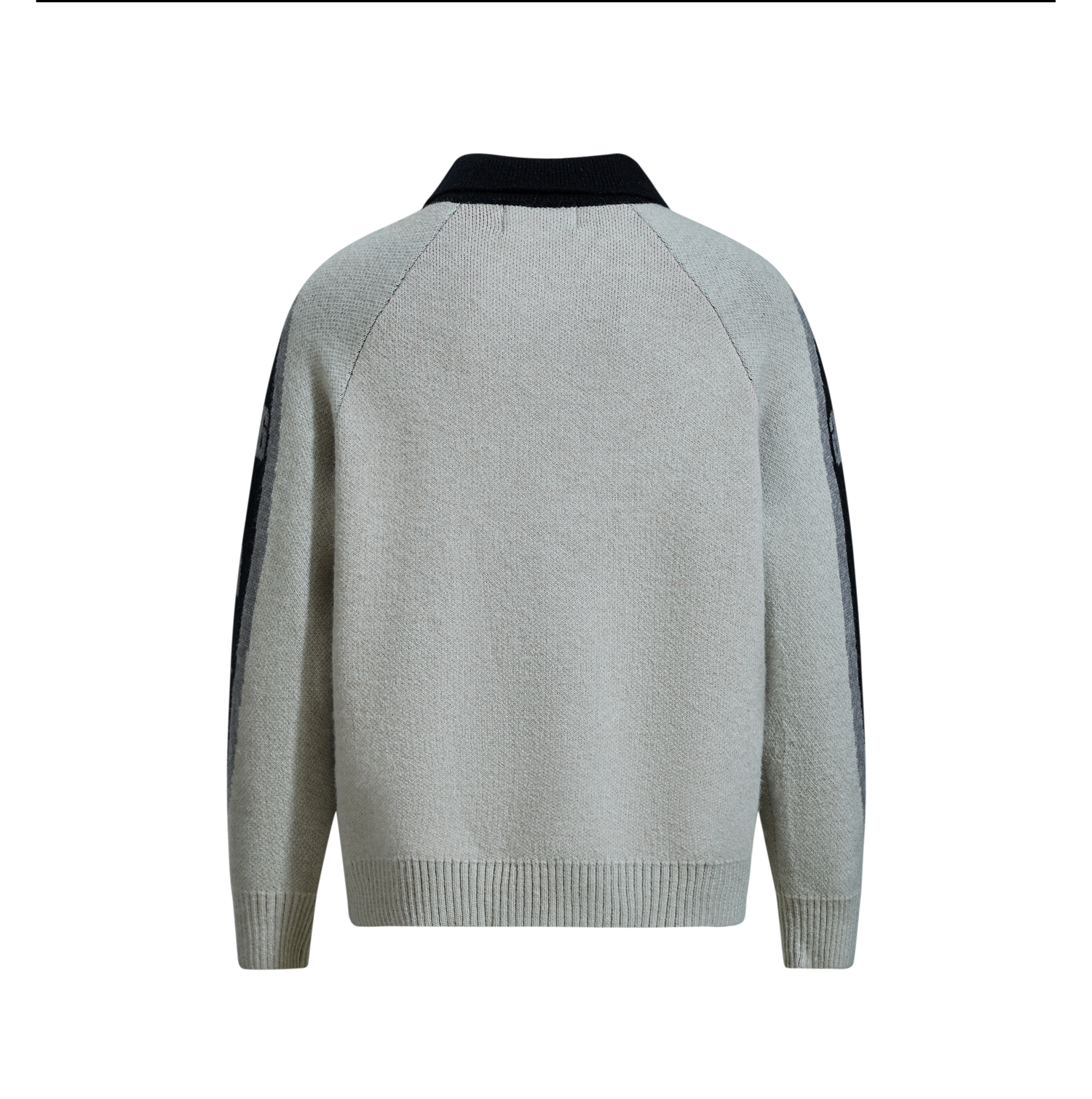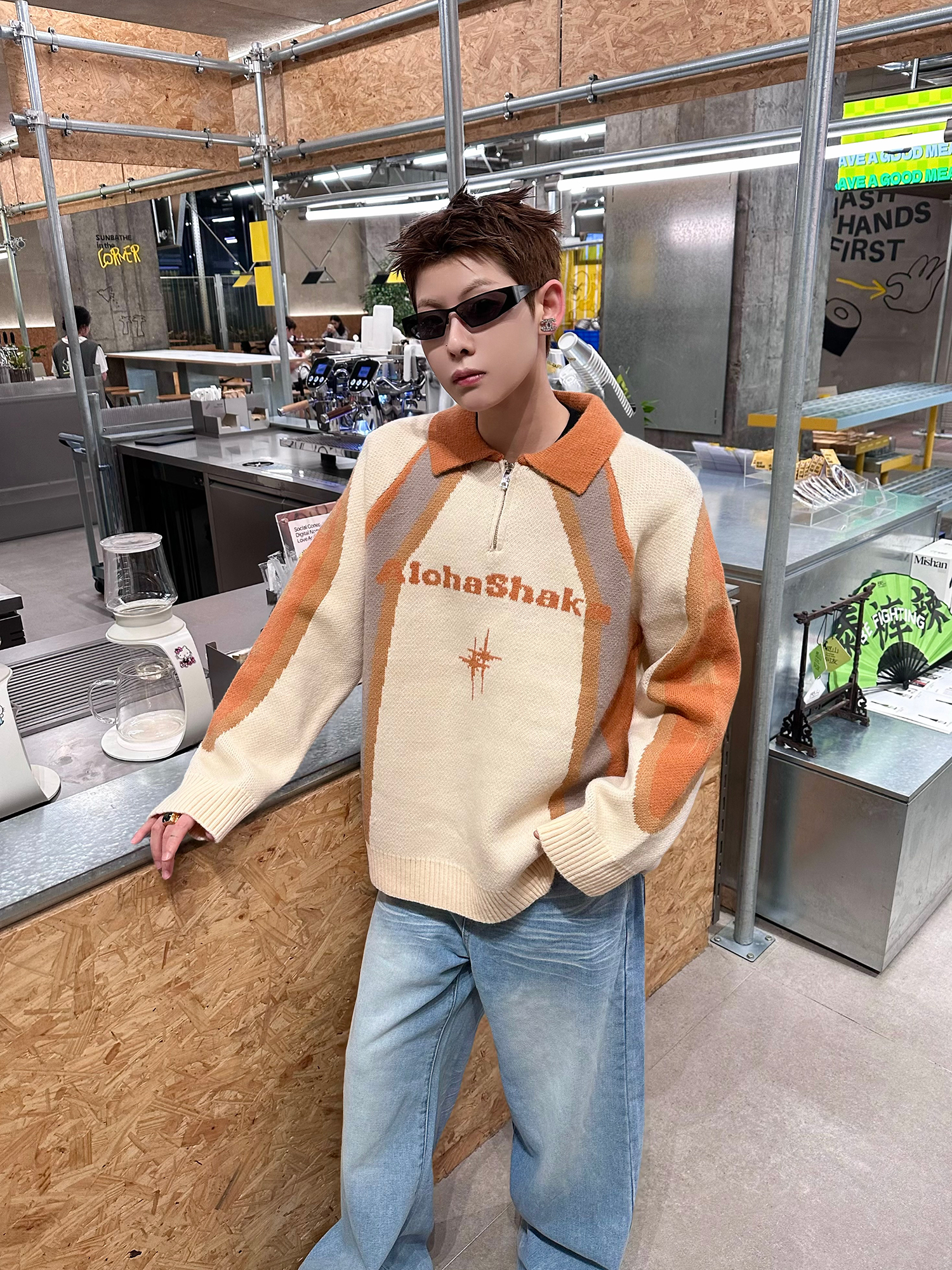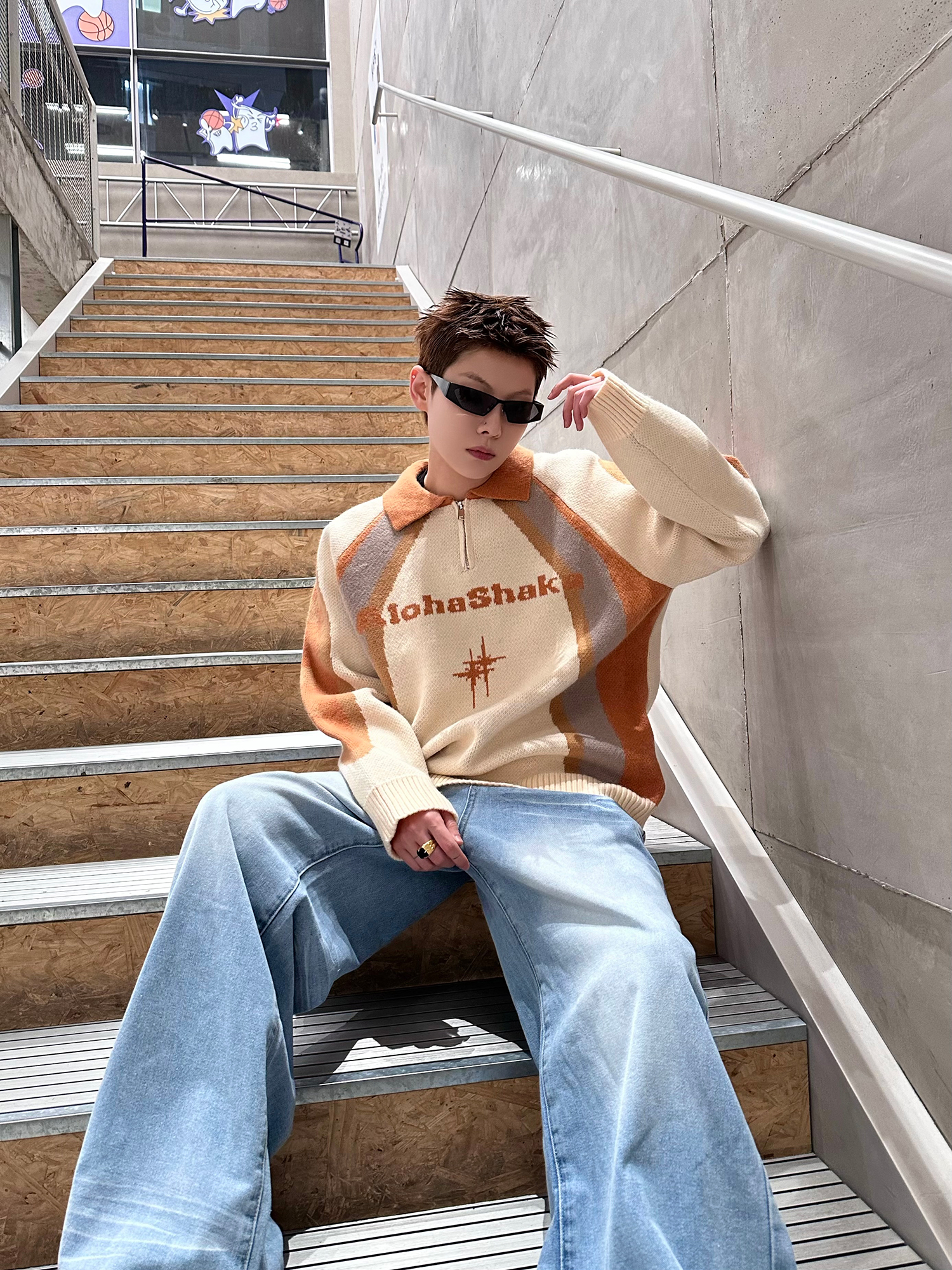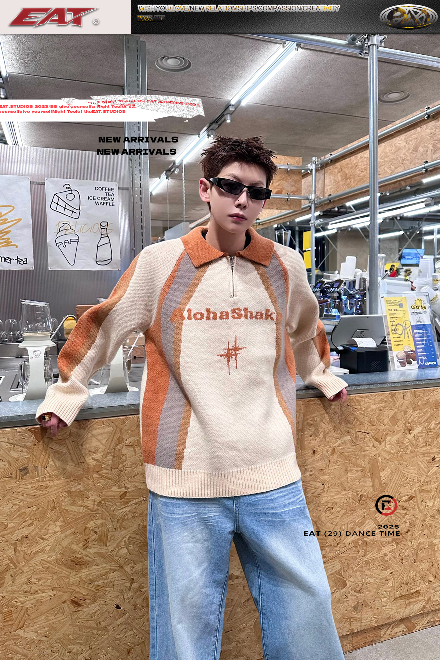 EAT 插肩撞色字母提花毛衣男美式復古半拉鍊翻領學院風慵懶針織衫