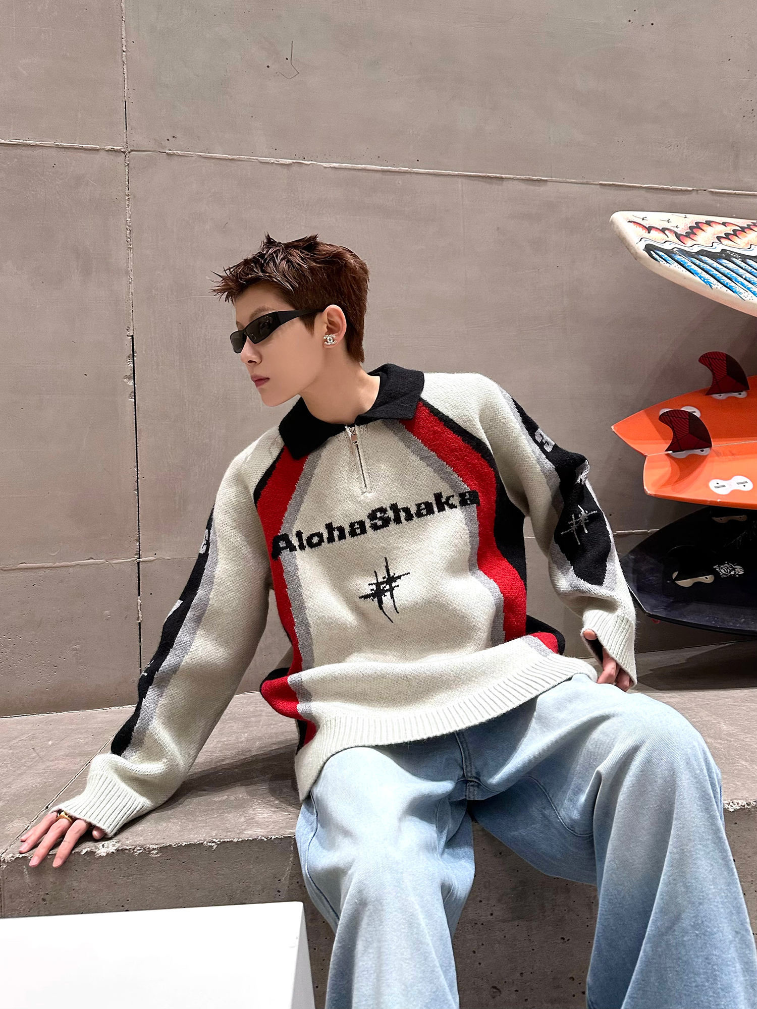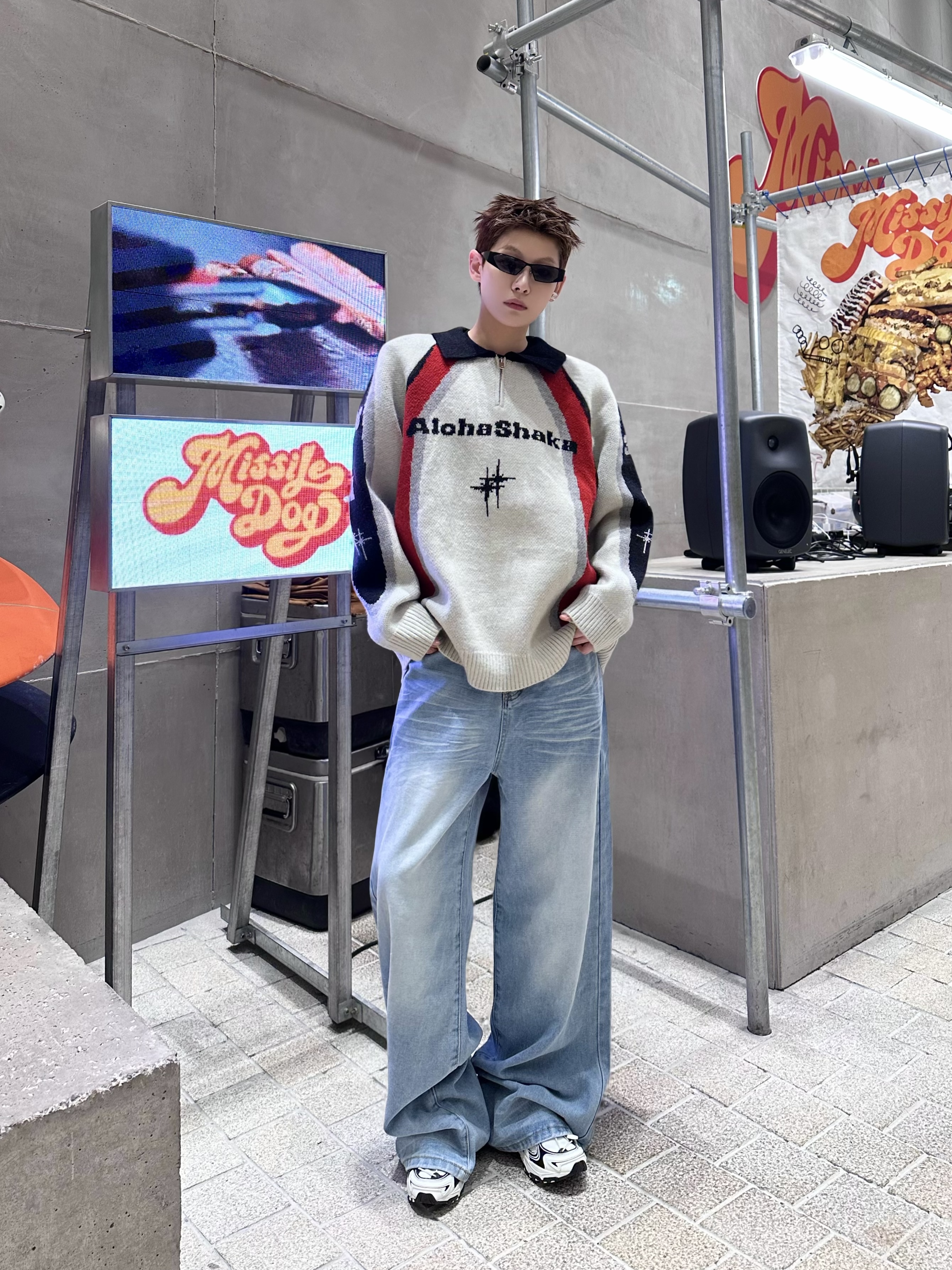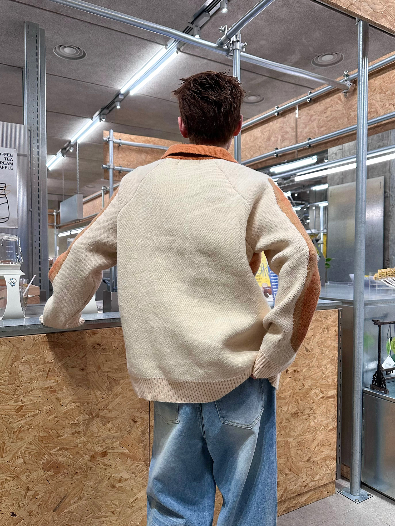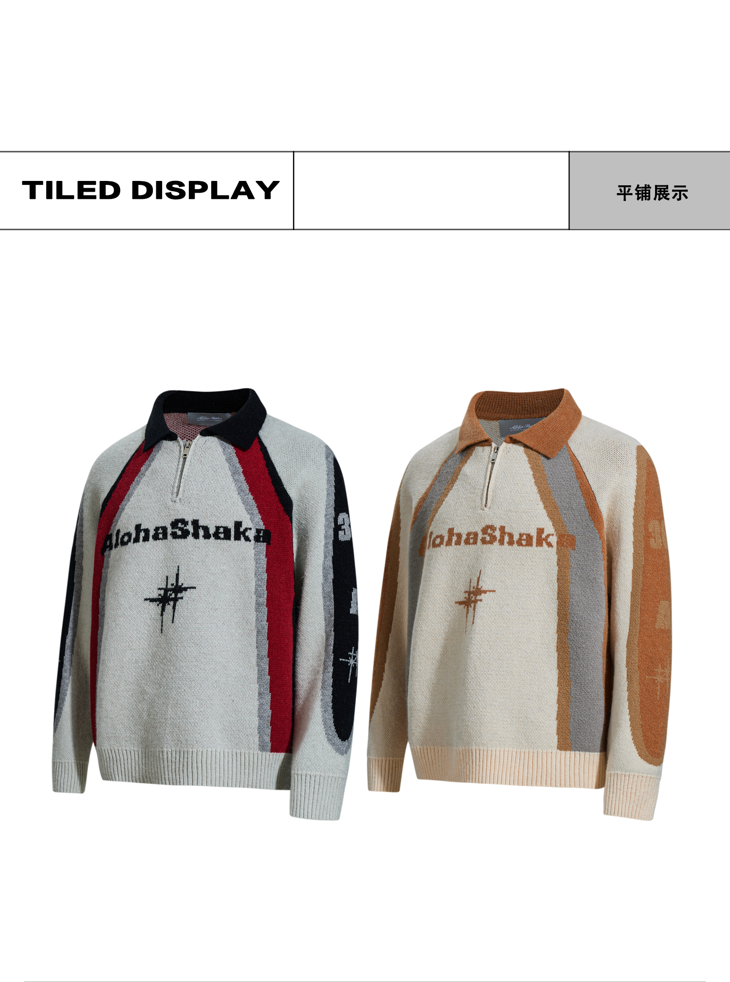 EAT 插肩撞色字母提花毛衣男美式復古半拉鍊翻領學院風慵懶針織衫