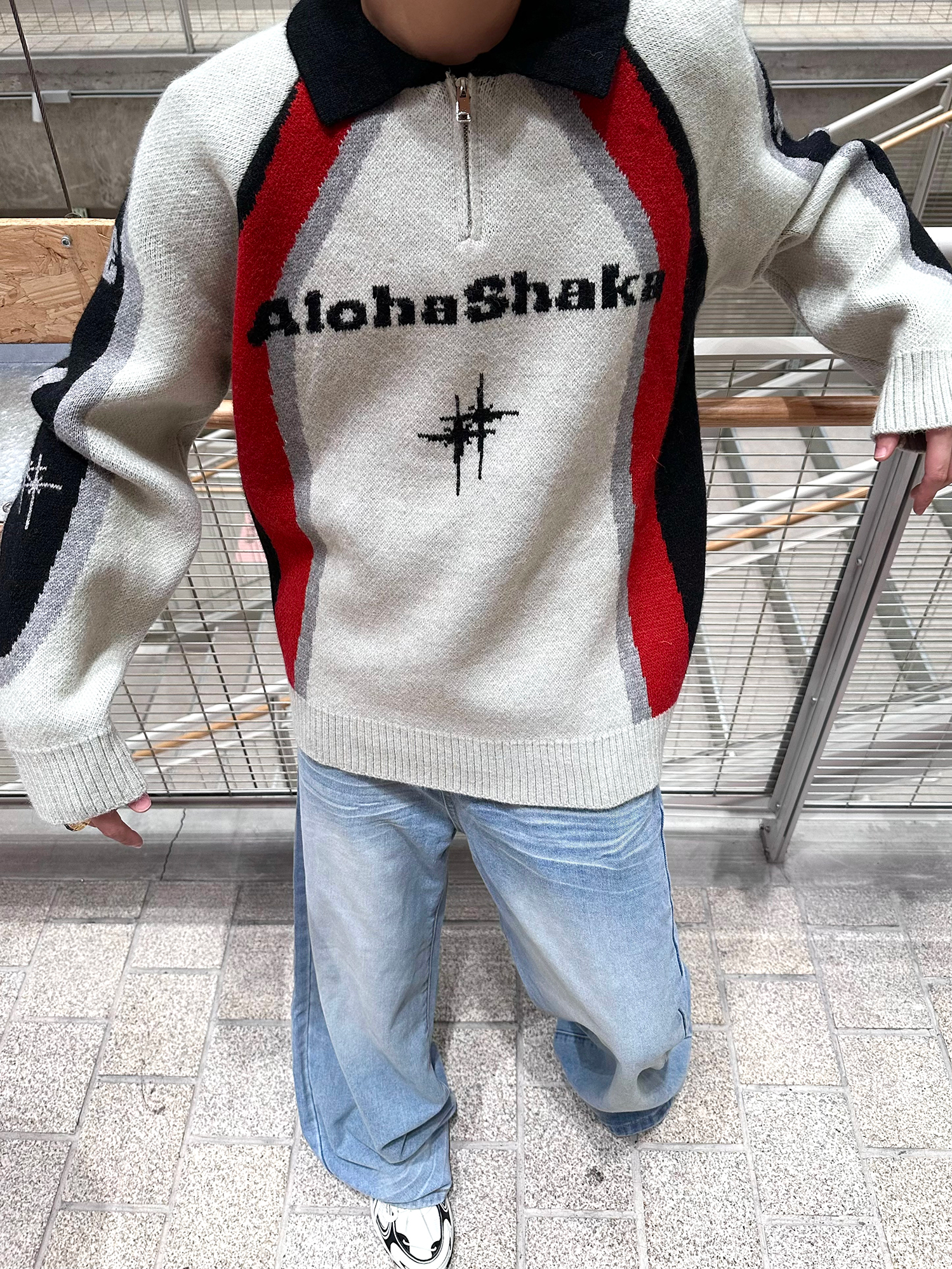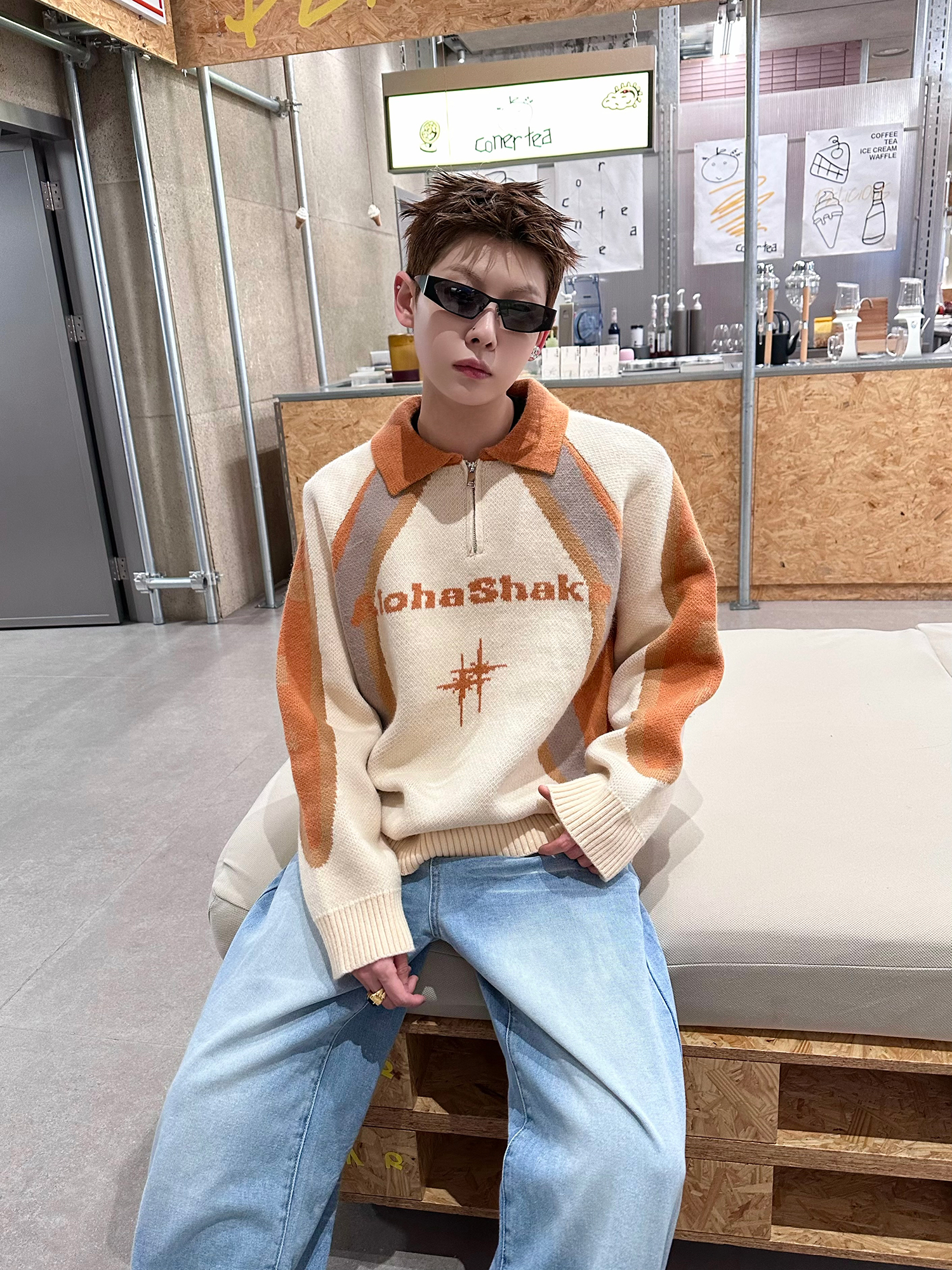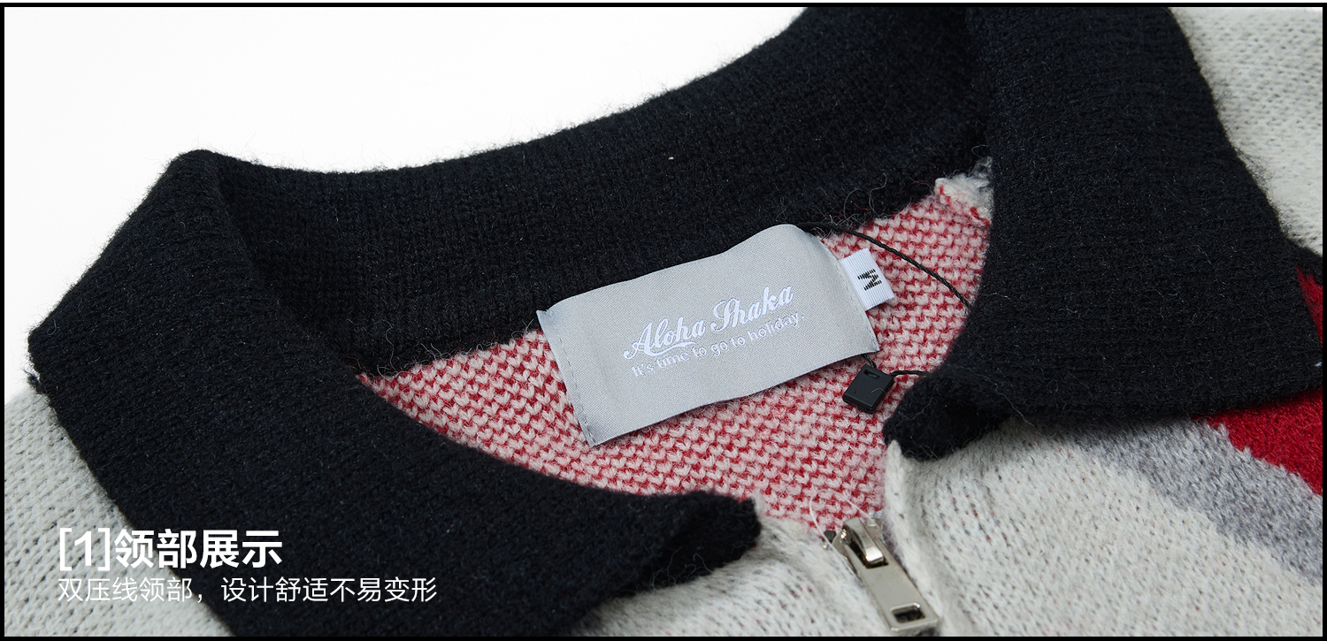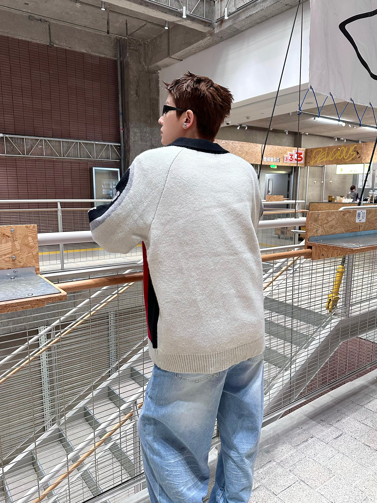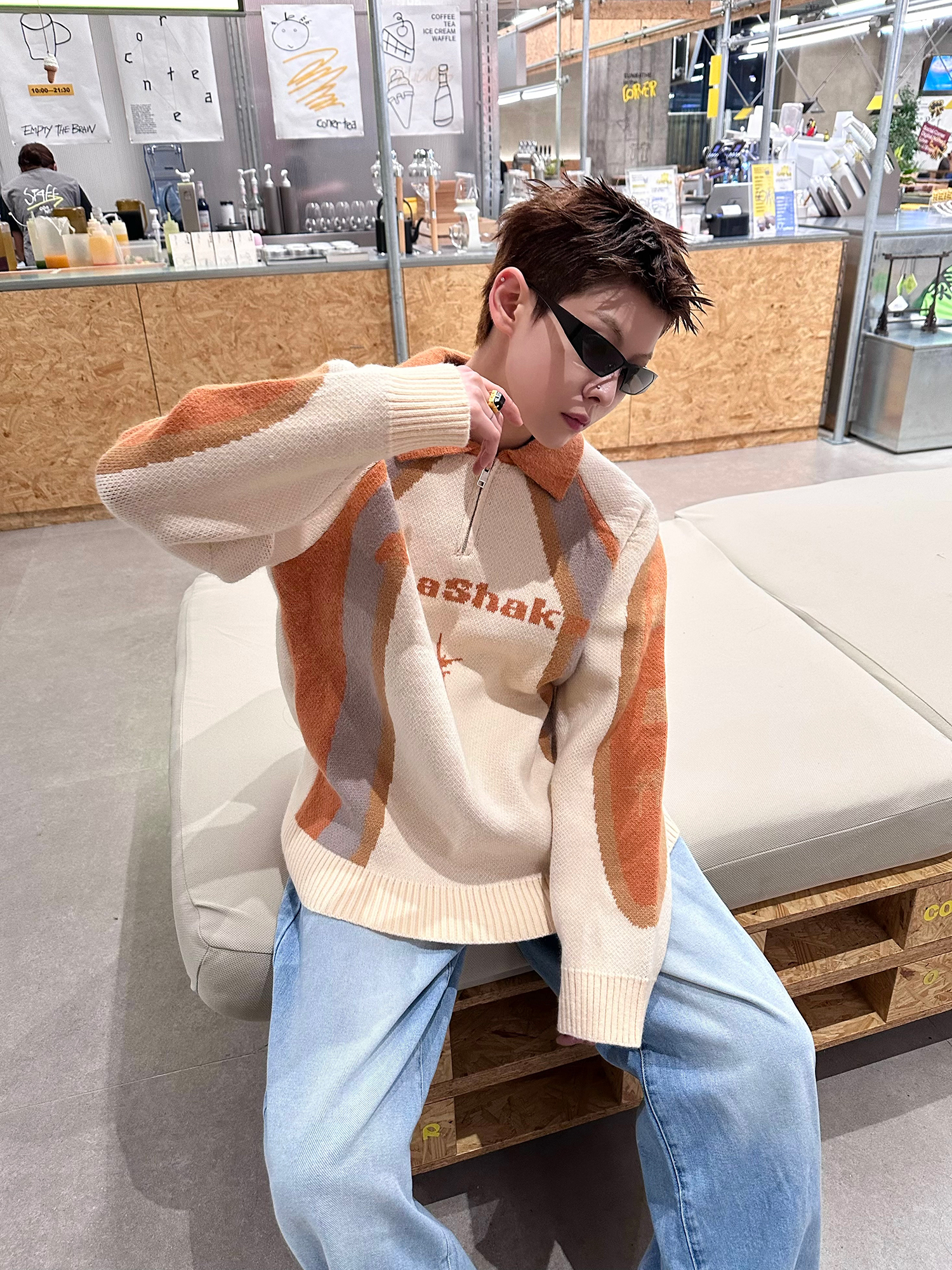 EAT 插肩撞色字母提花毛衣男美式復古半拉鍊翻領學院風慵懶針織衫
