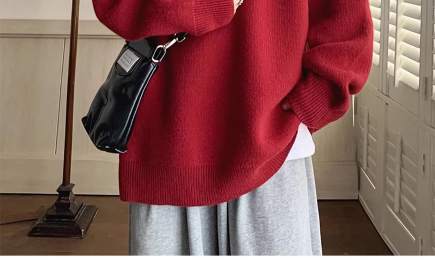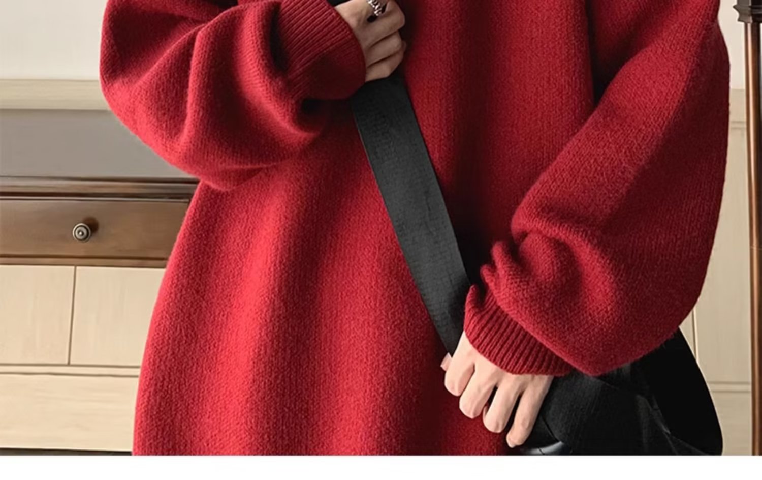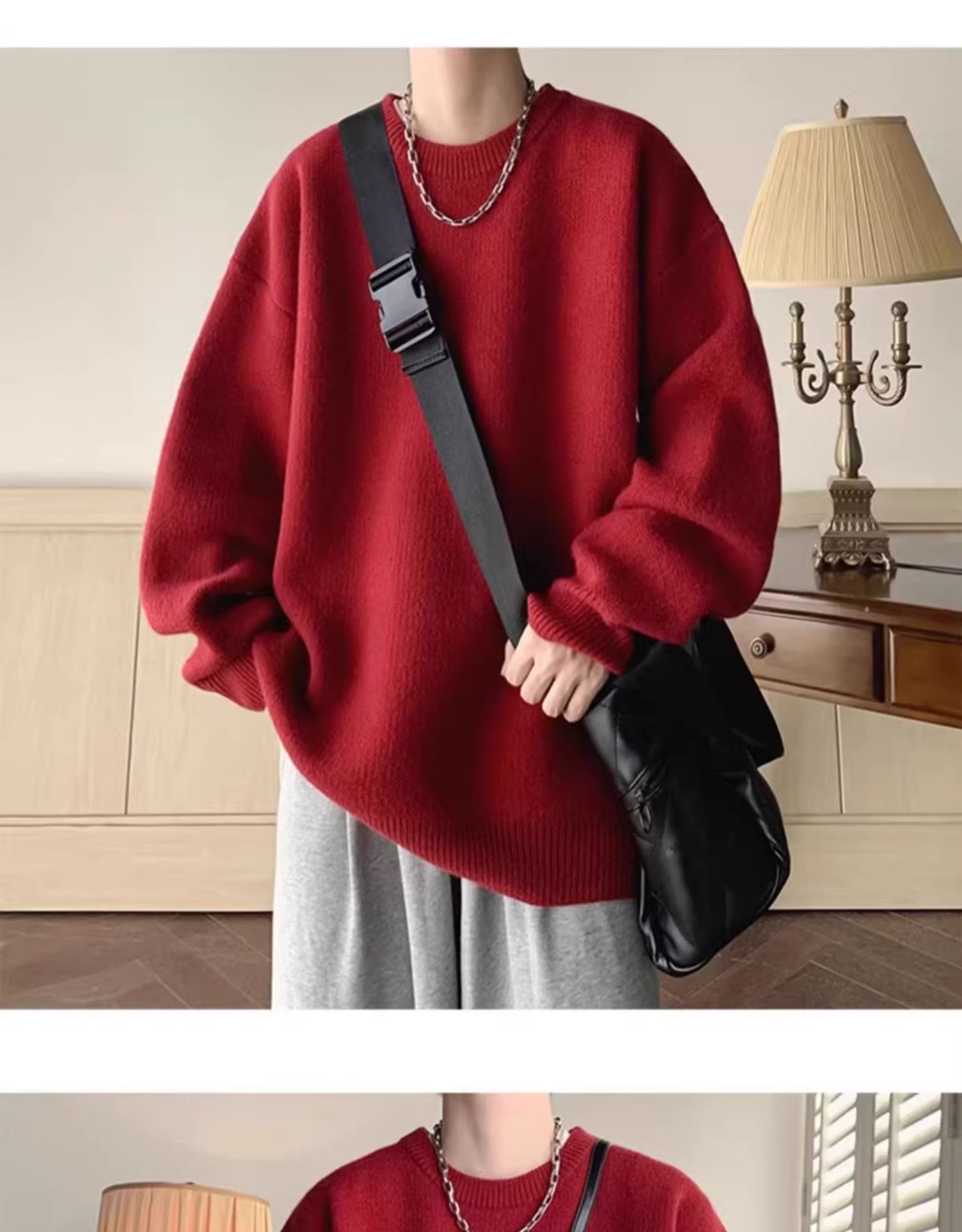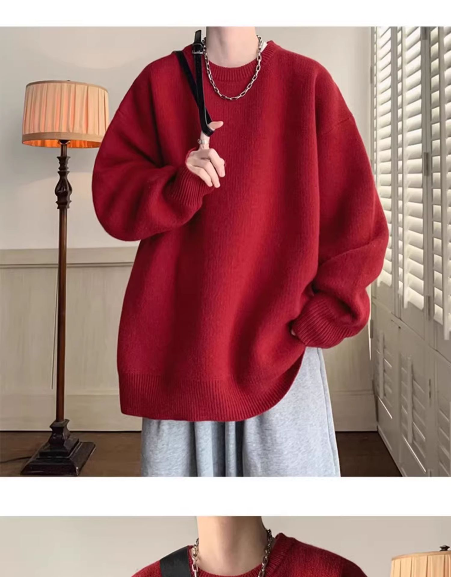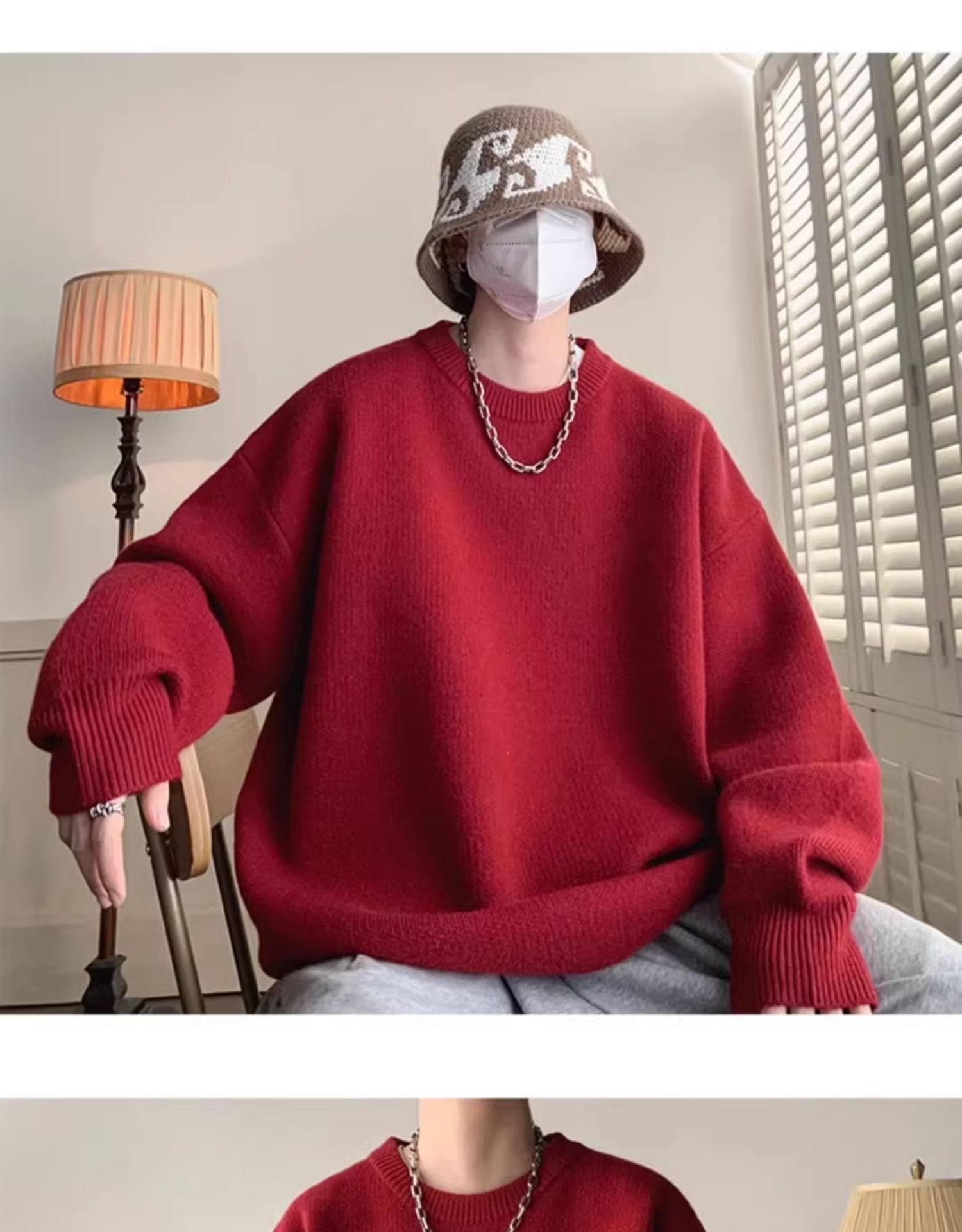 酒紅色潮牌毛衣男冬季慵懶風高級感純色內搭針織衫本命年新年衣服
