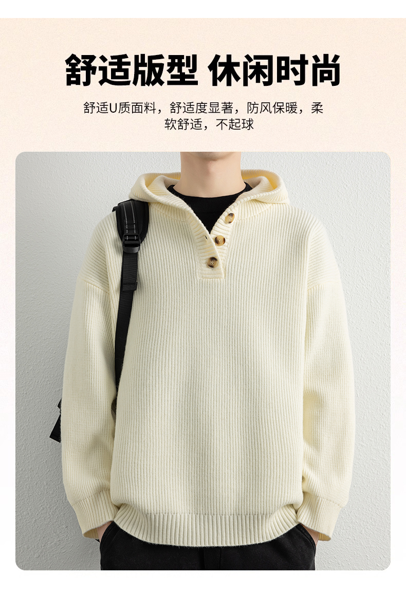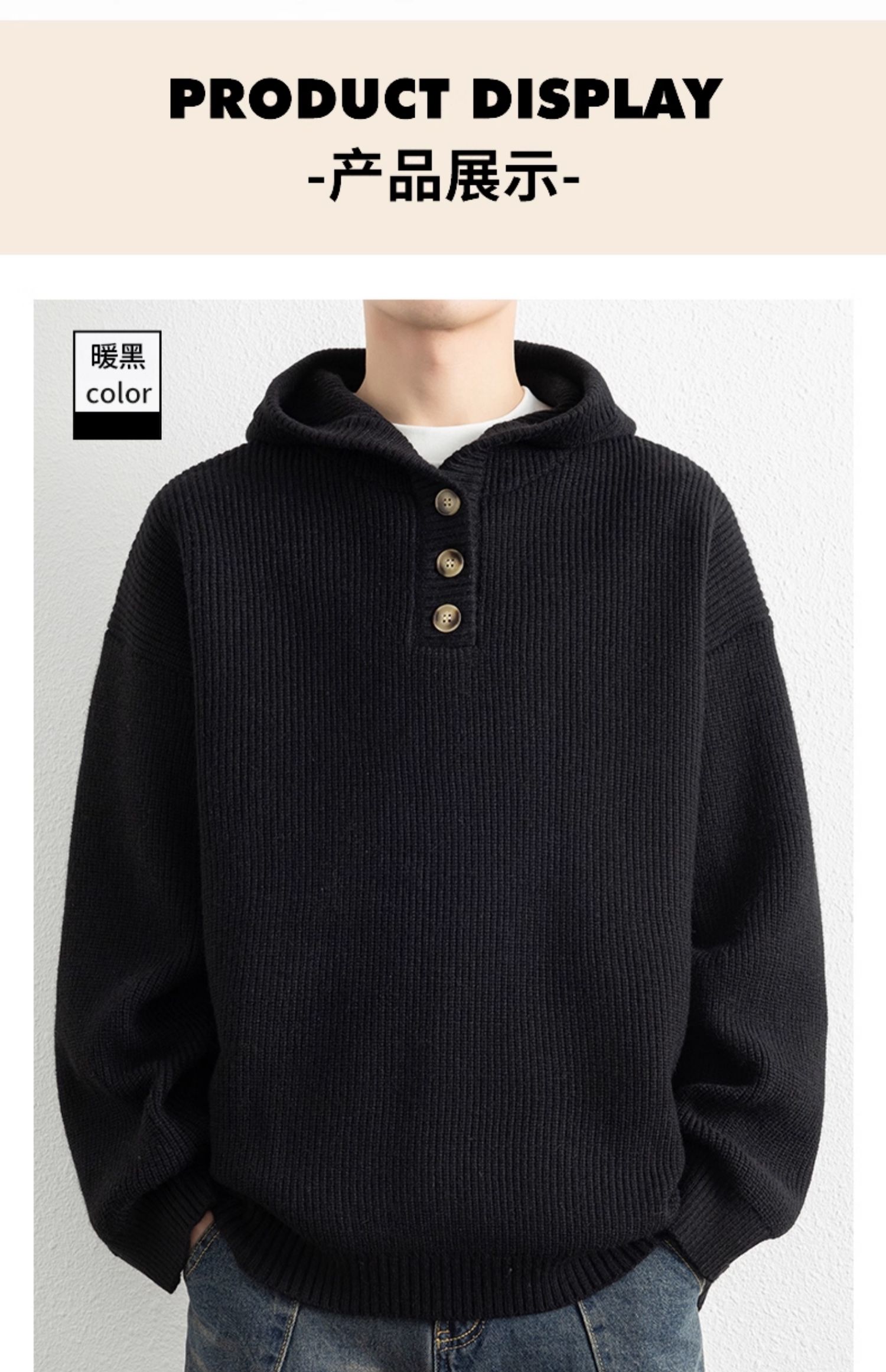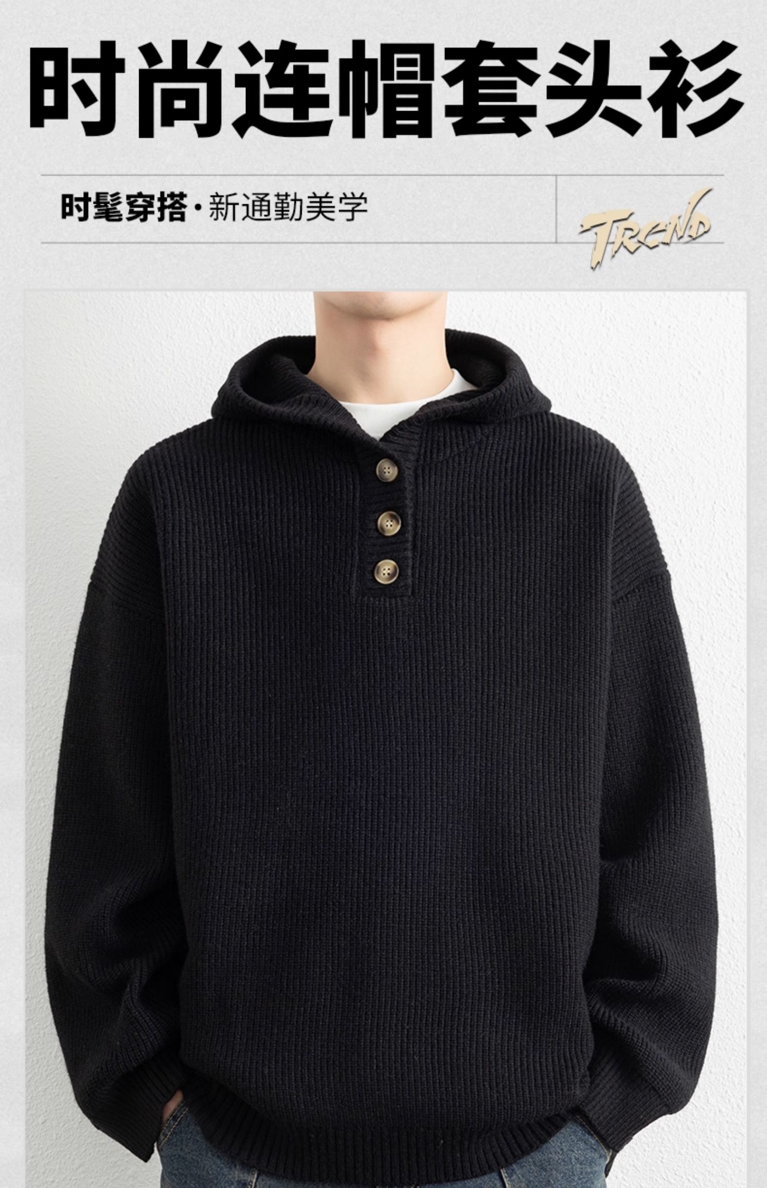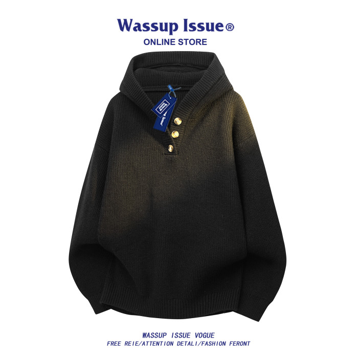 WASSUP ISSUE美式亨利領連帽毛衣男款春秋寬松高級感針織衫外套男