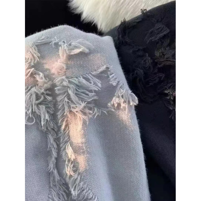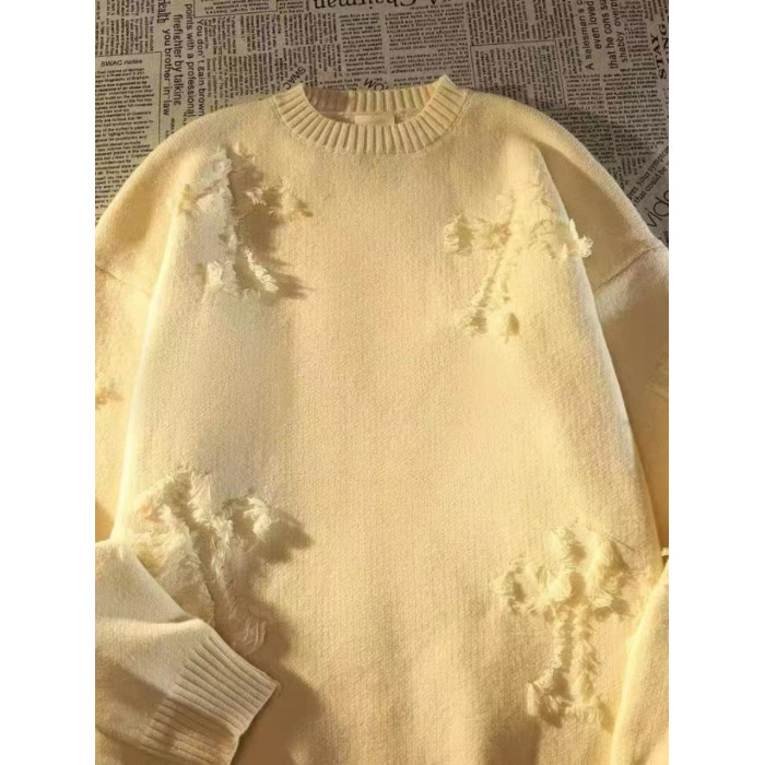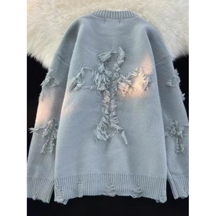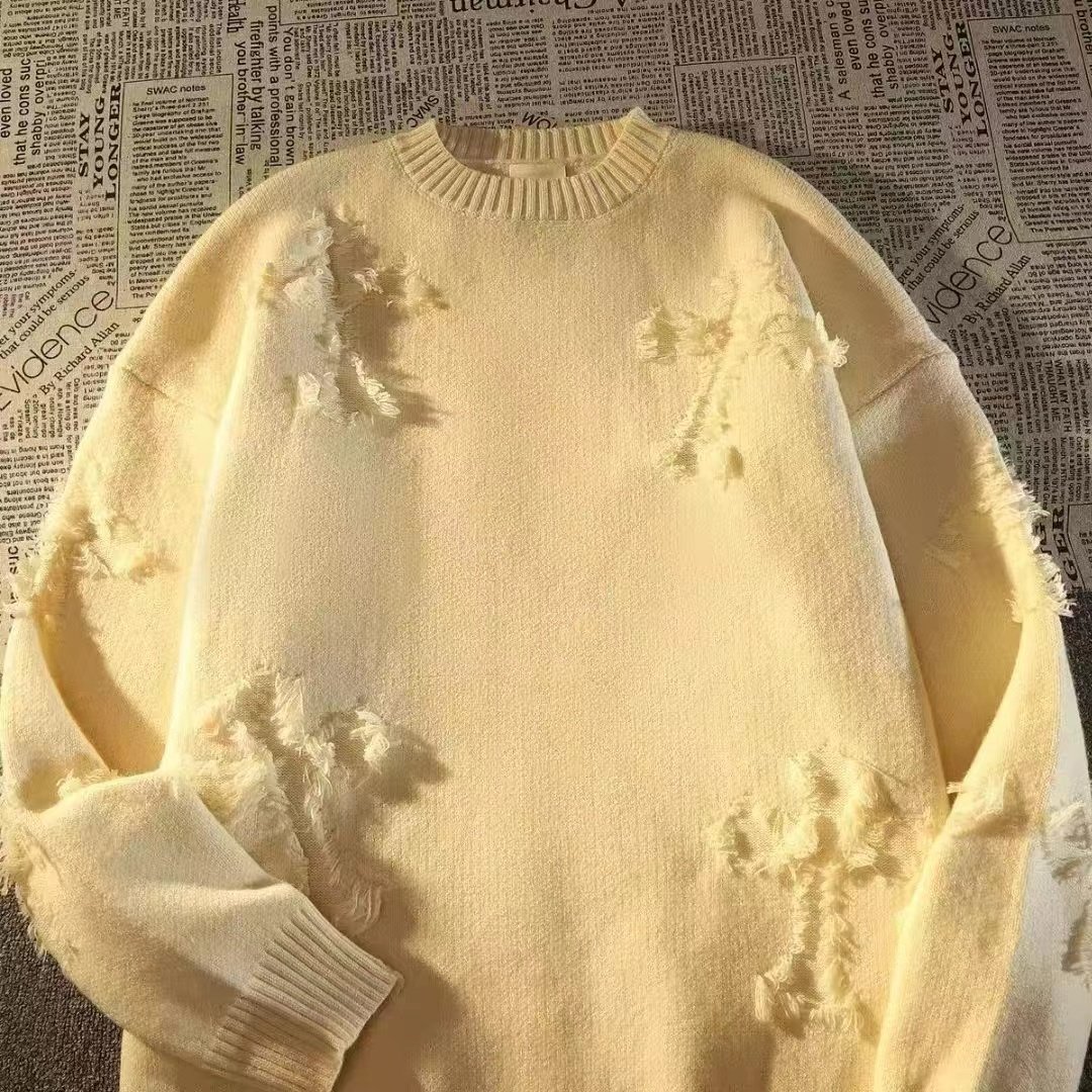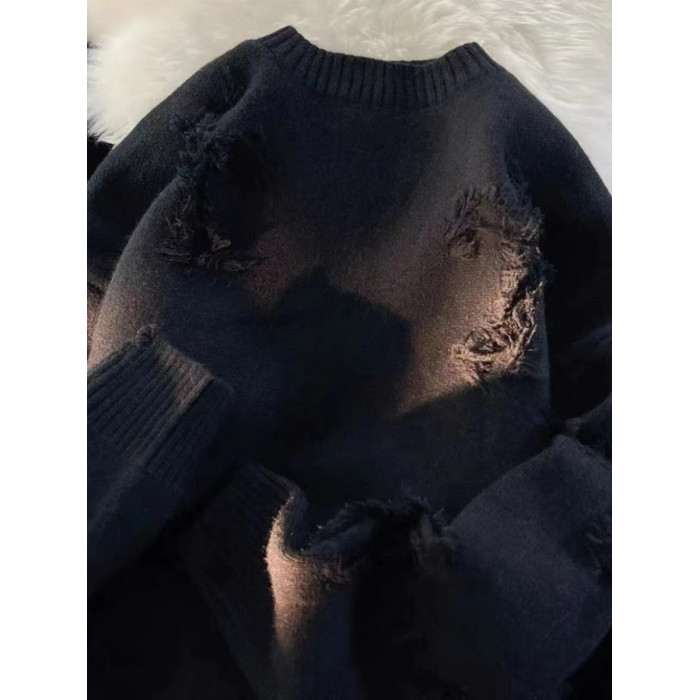 毛衣男秋冬圓領套頭大碼復古破洞流蘇毛衣男女春秋情侶長袖針織衫