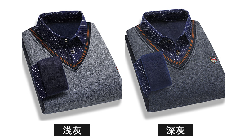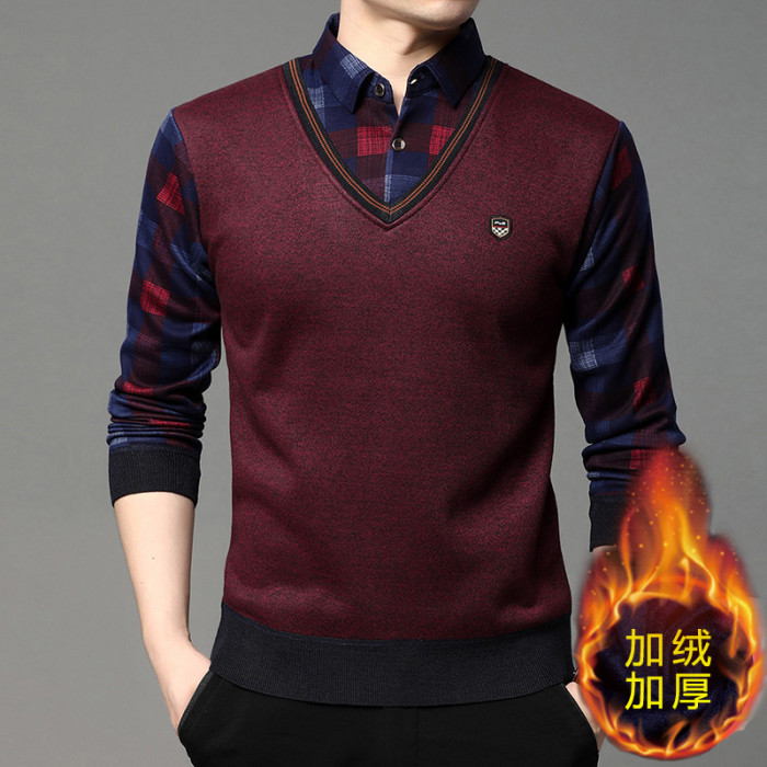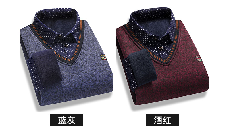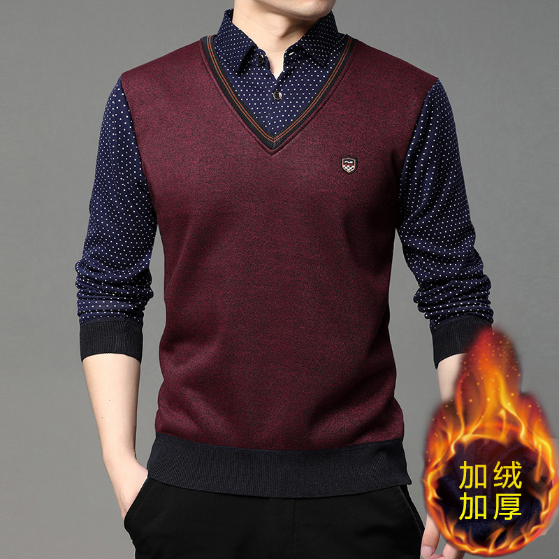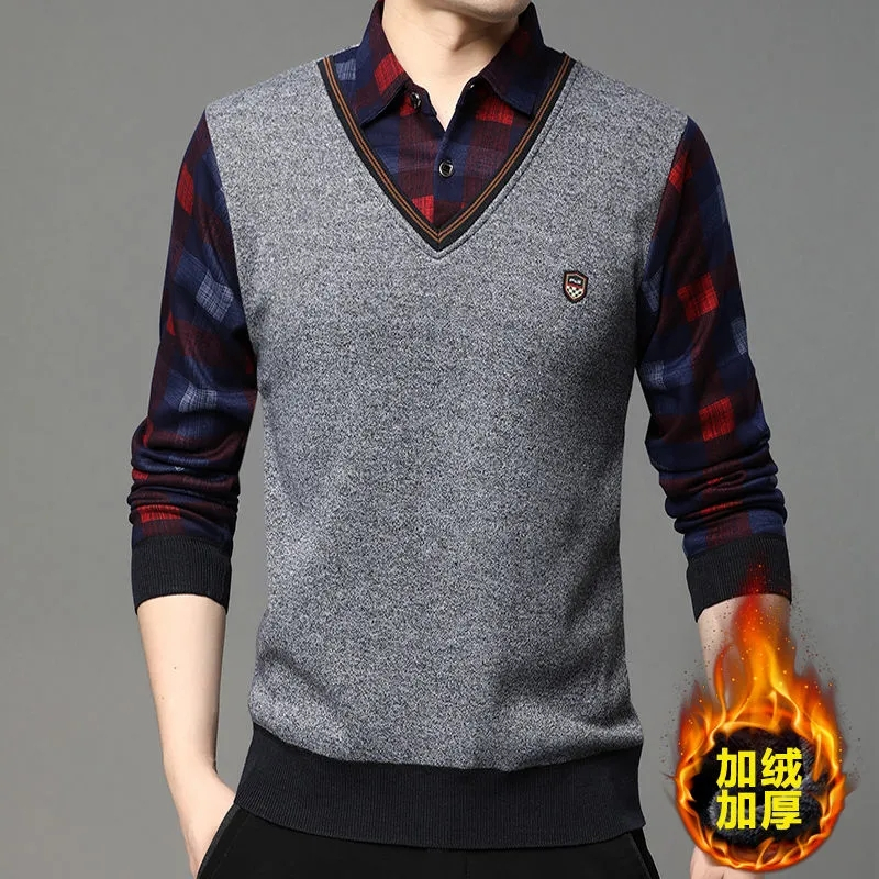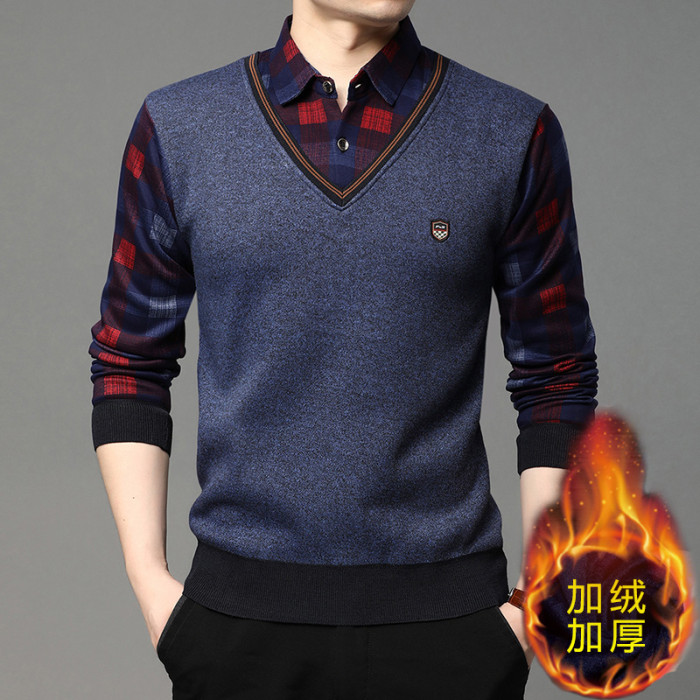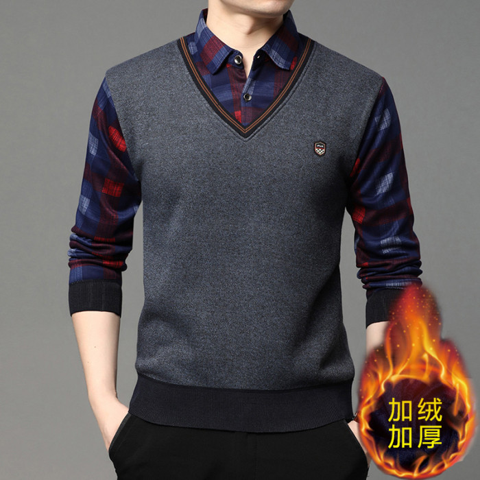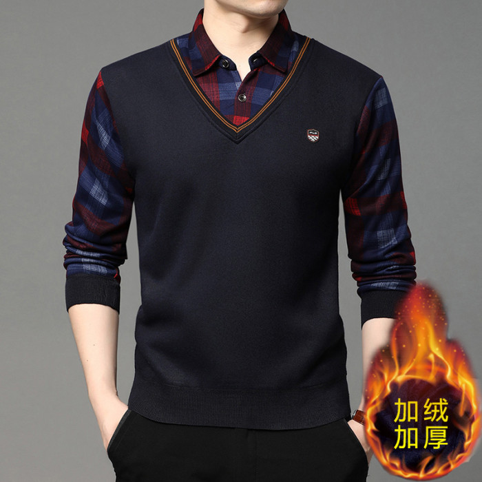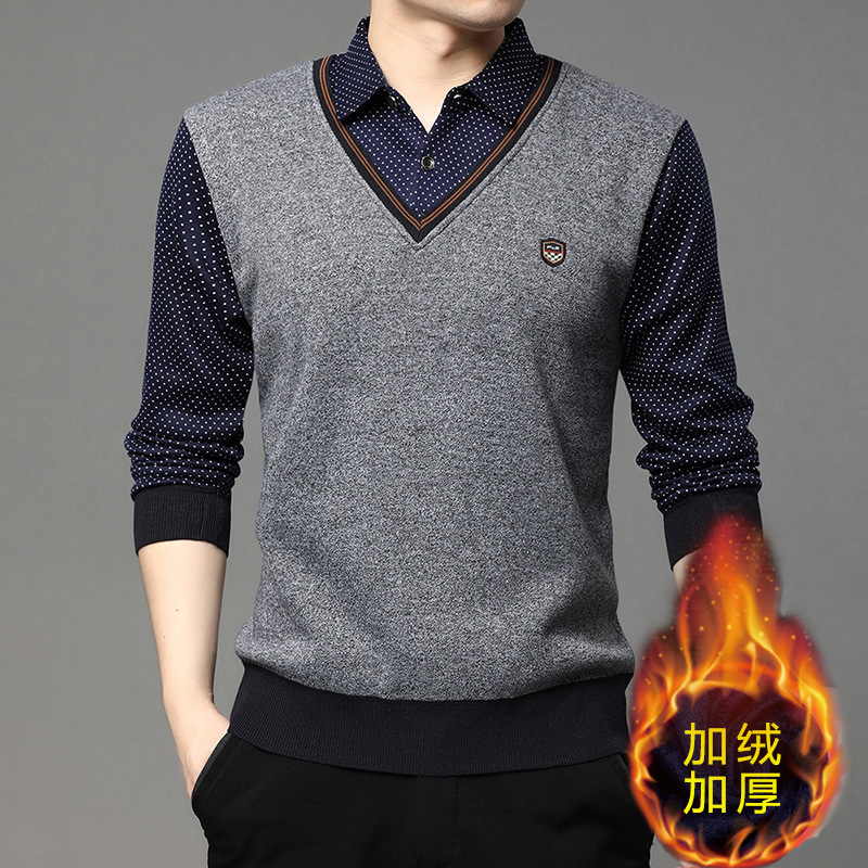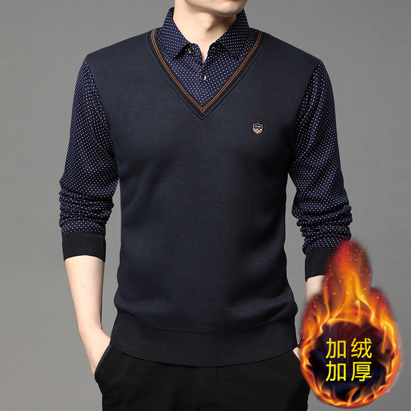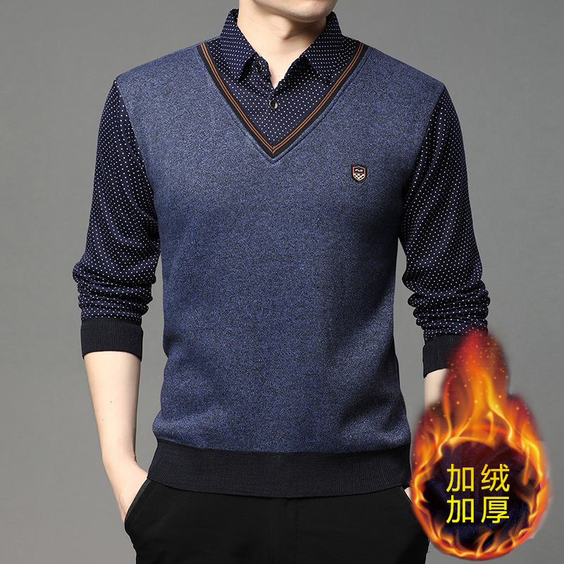 2025秋冬季新款翻領保暖假兩件男長袖上衣商務休閒加絨加厚毛衣男