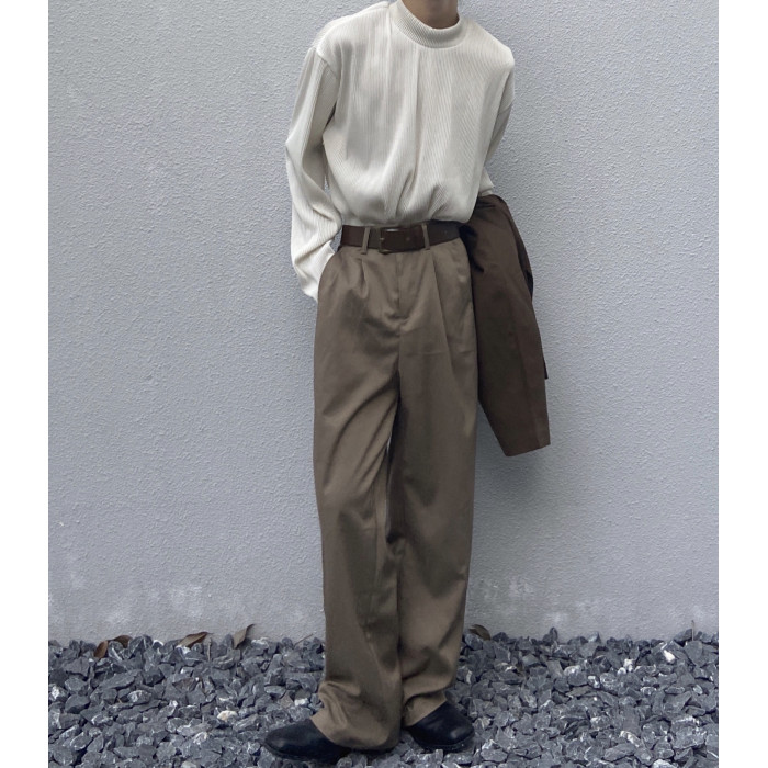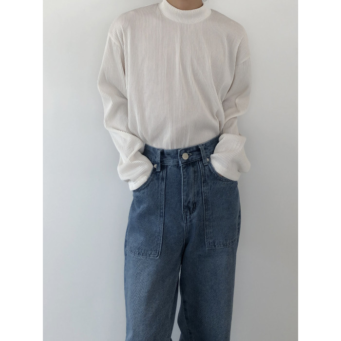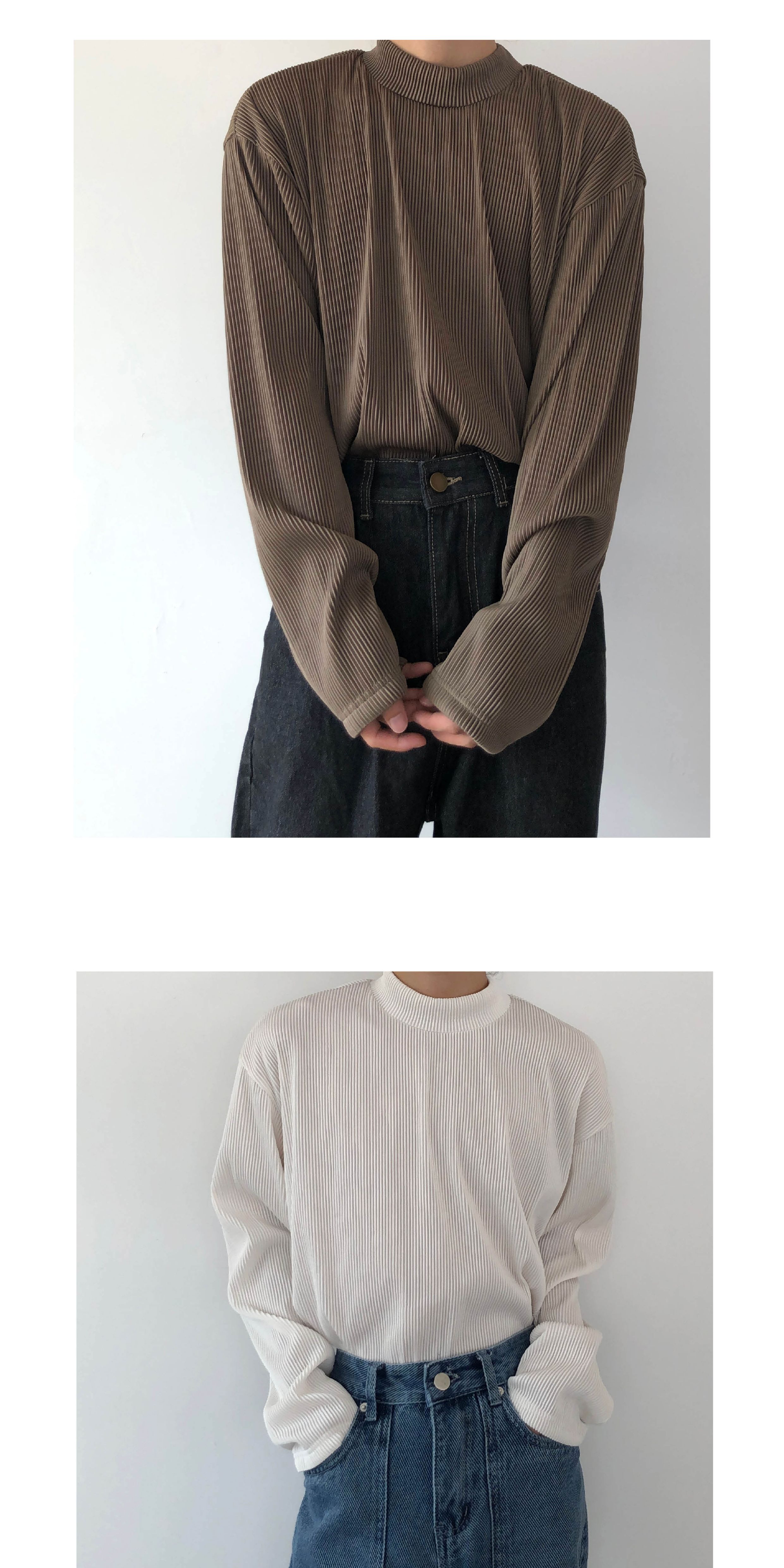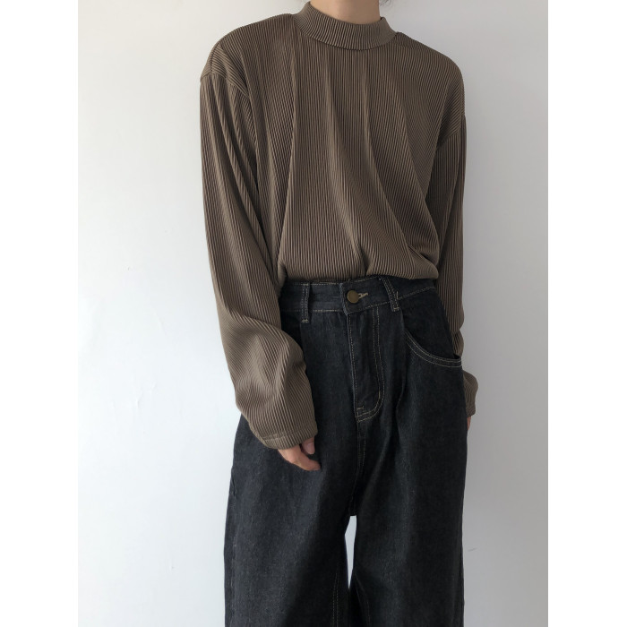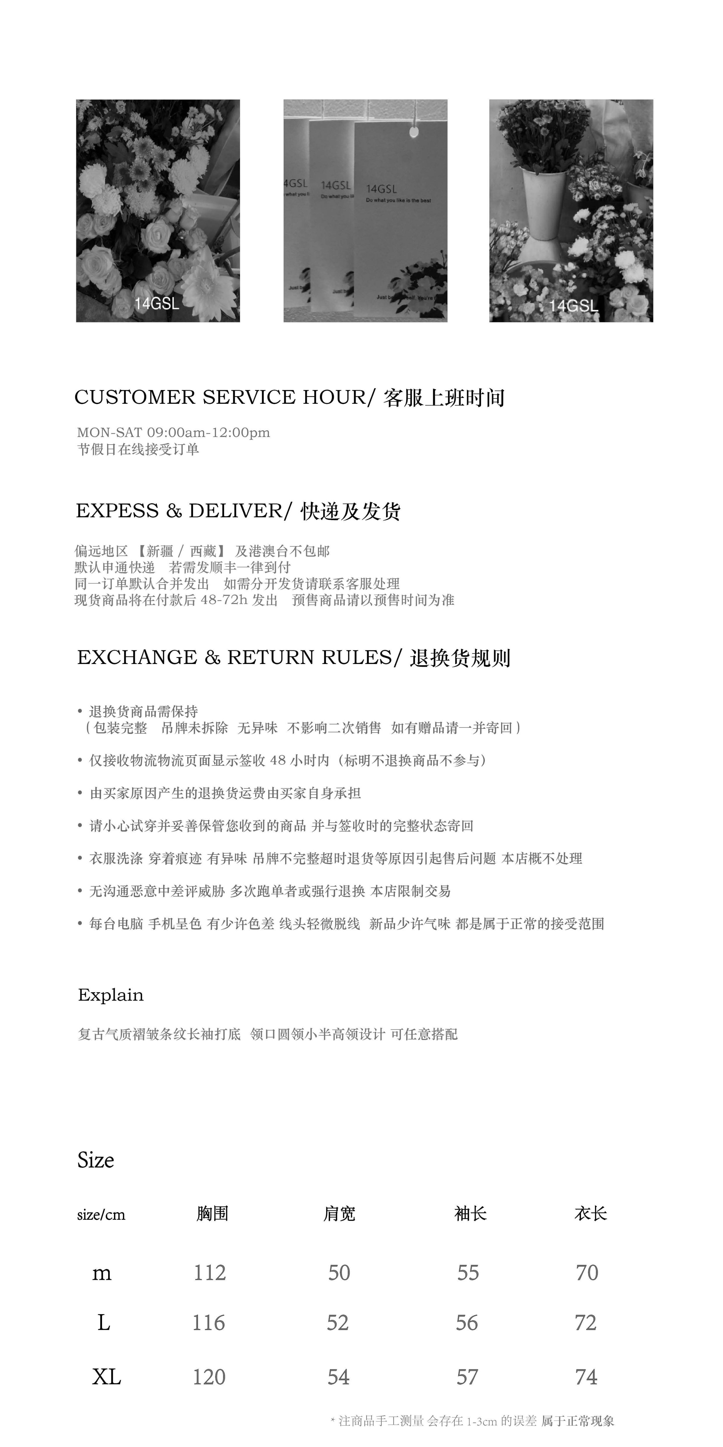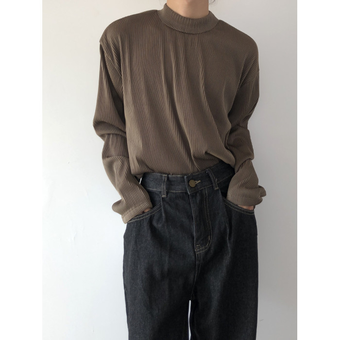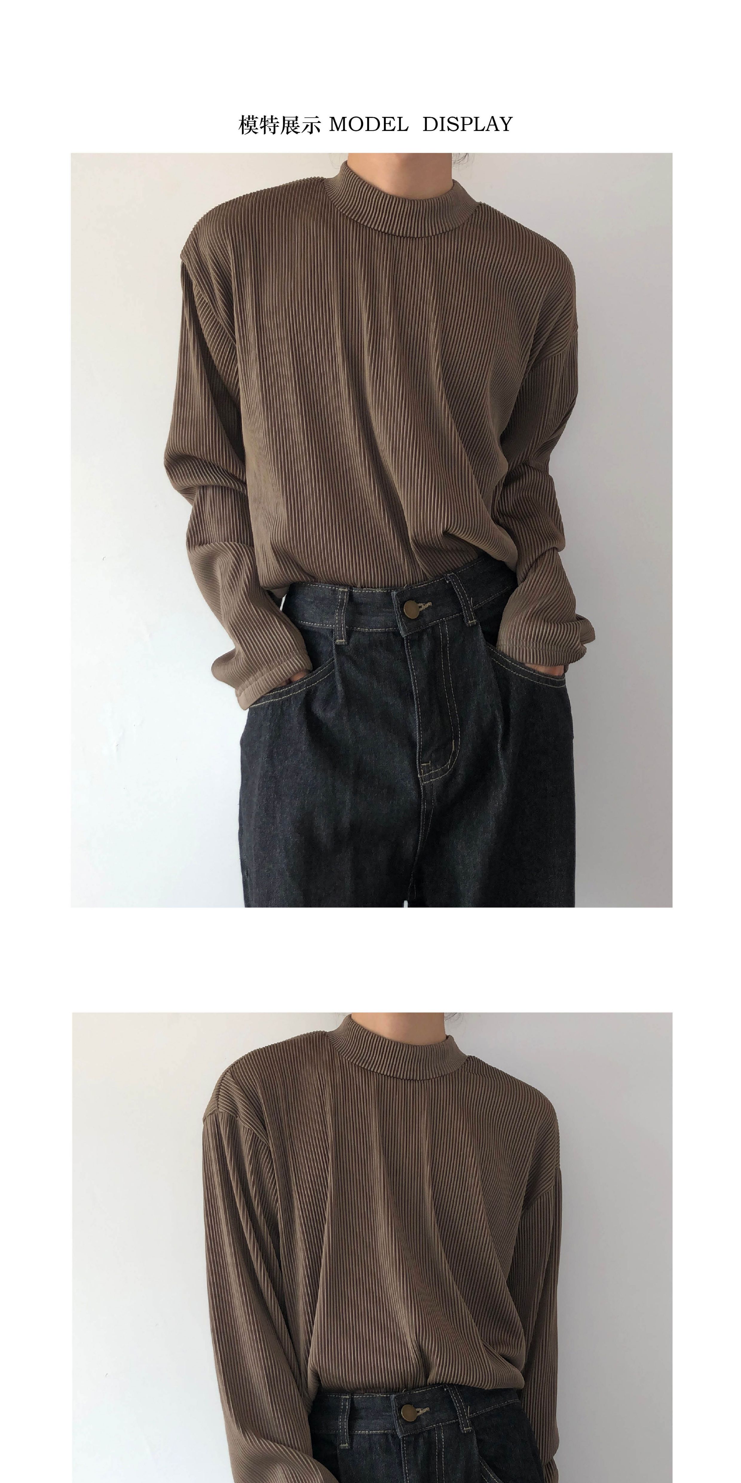 14GSL 氣質復古褶皺純色簡約禁欲條紋半高領長袖打底