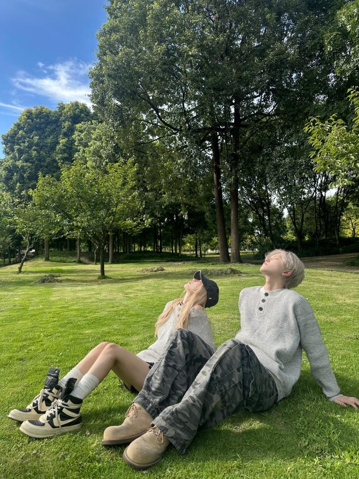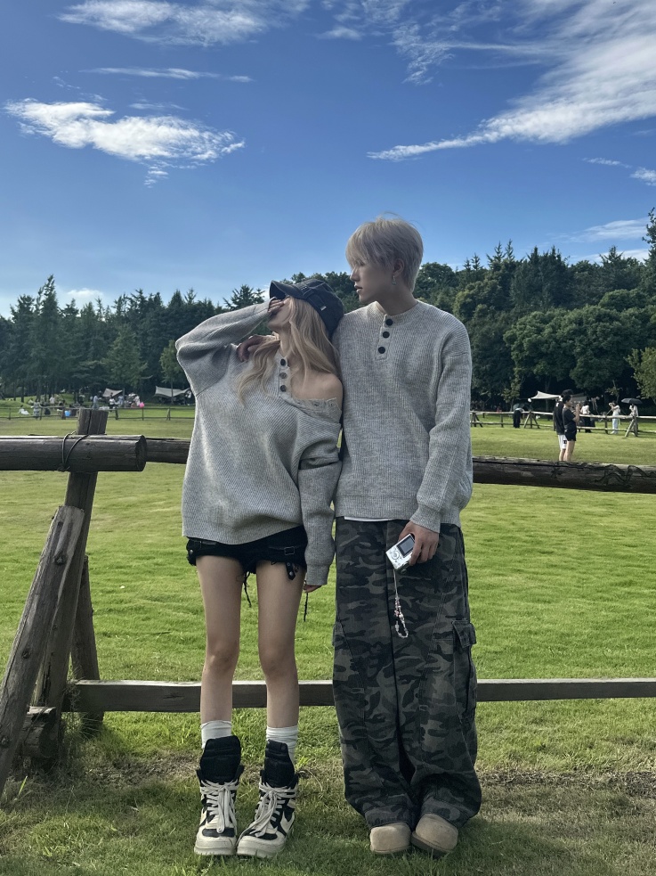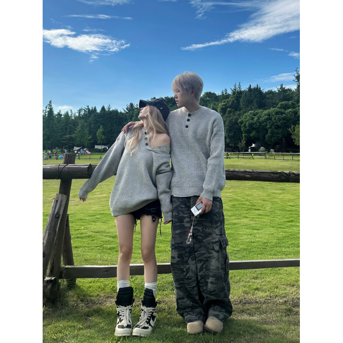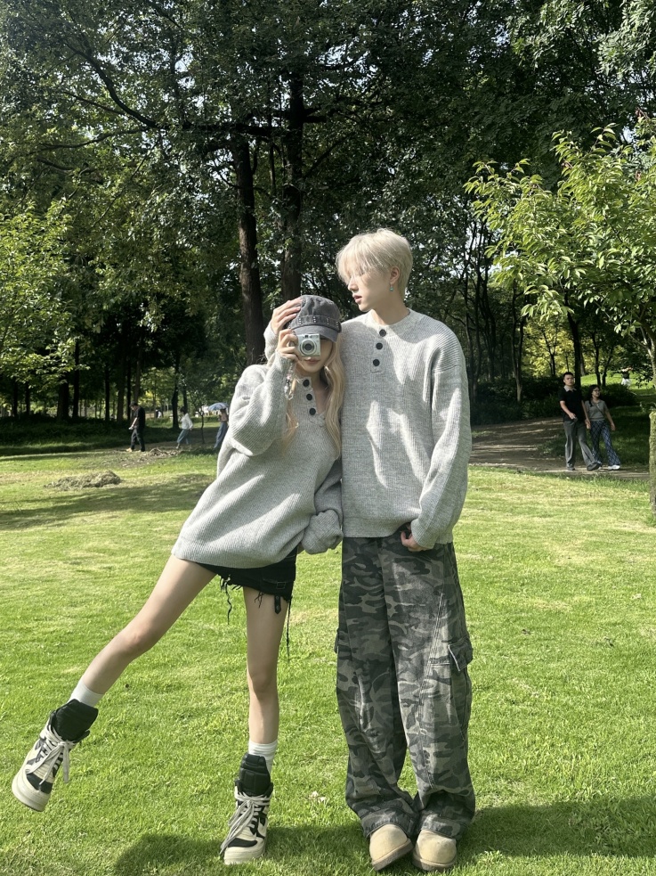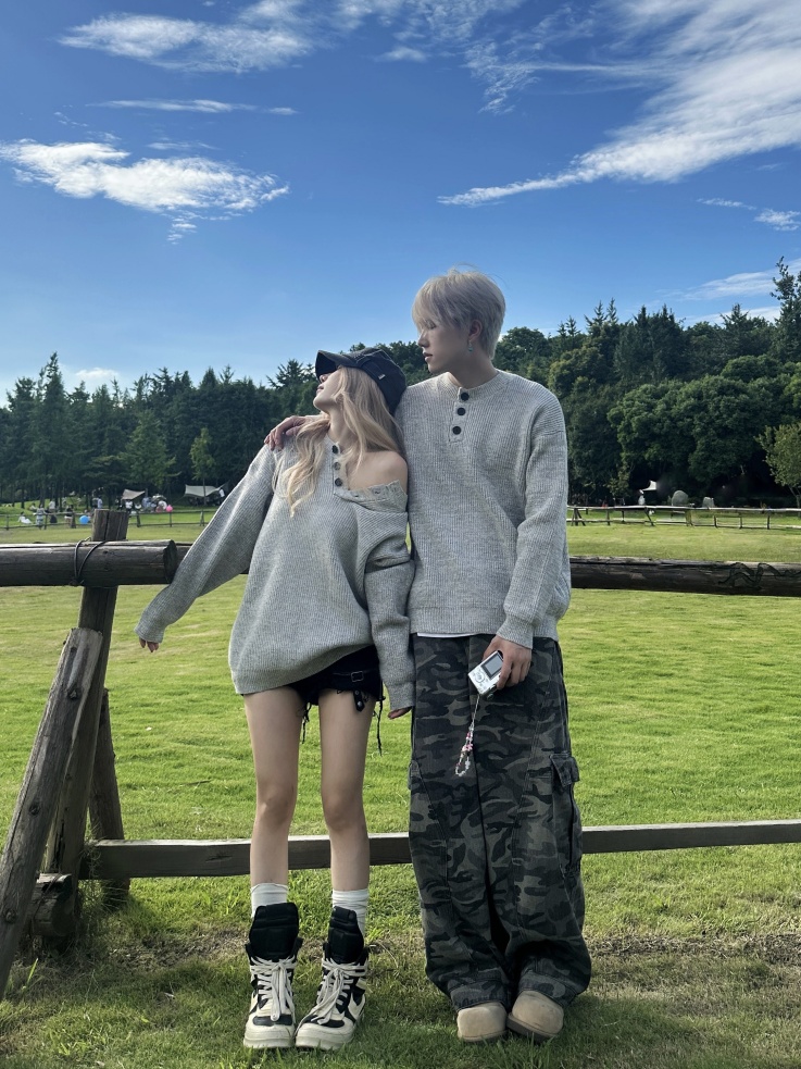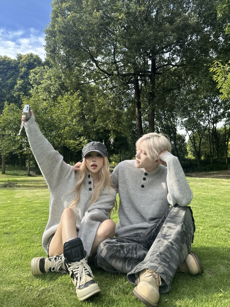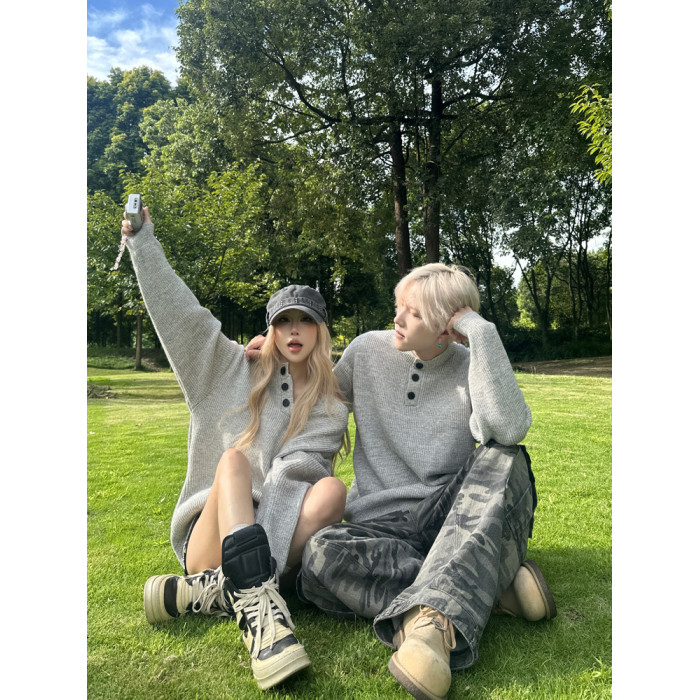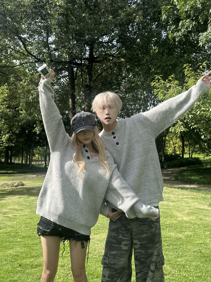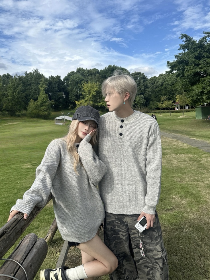 cleanfit情侶裝亨利領灰色毛衣男女秋冬慵懶風高級感外套針織衫潮