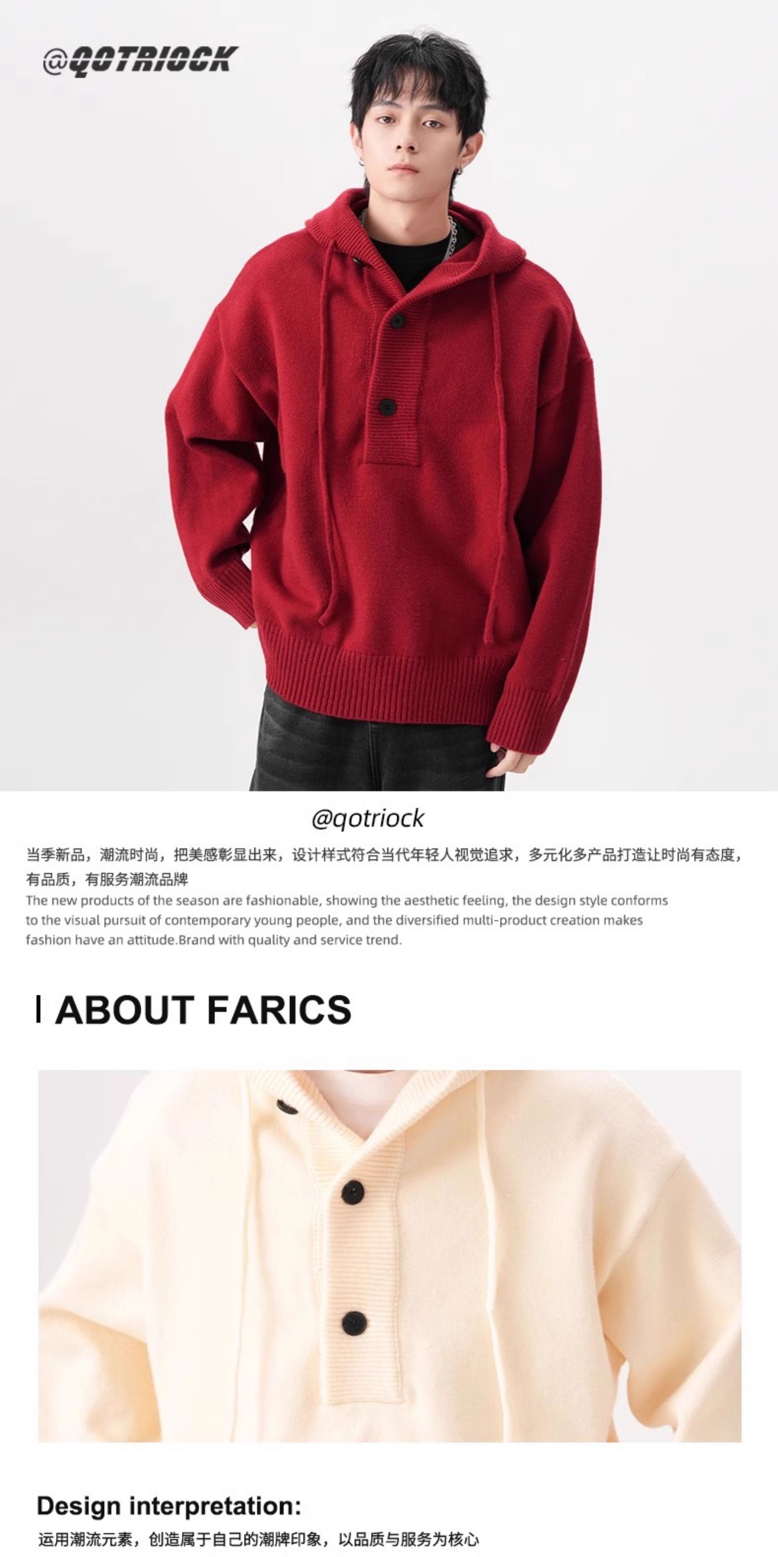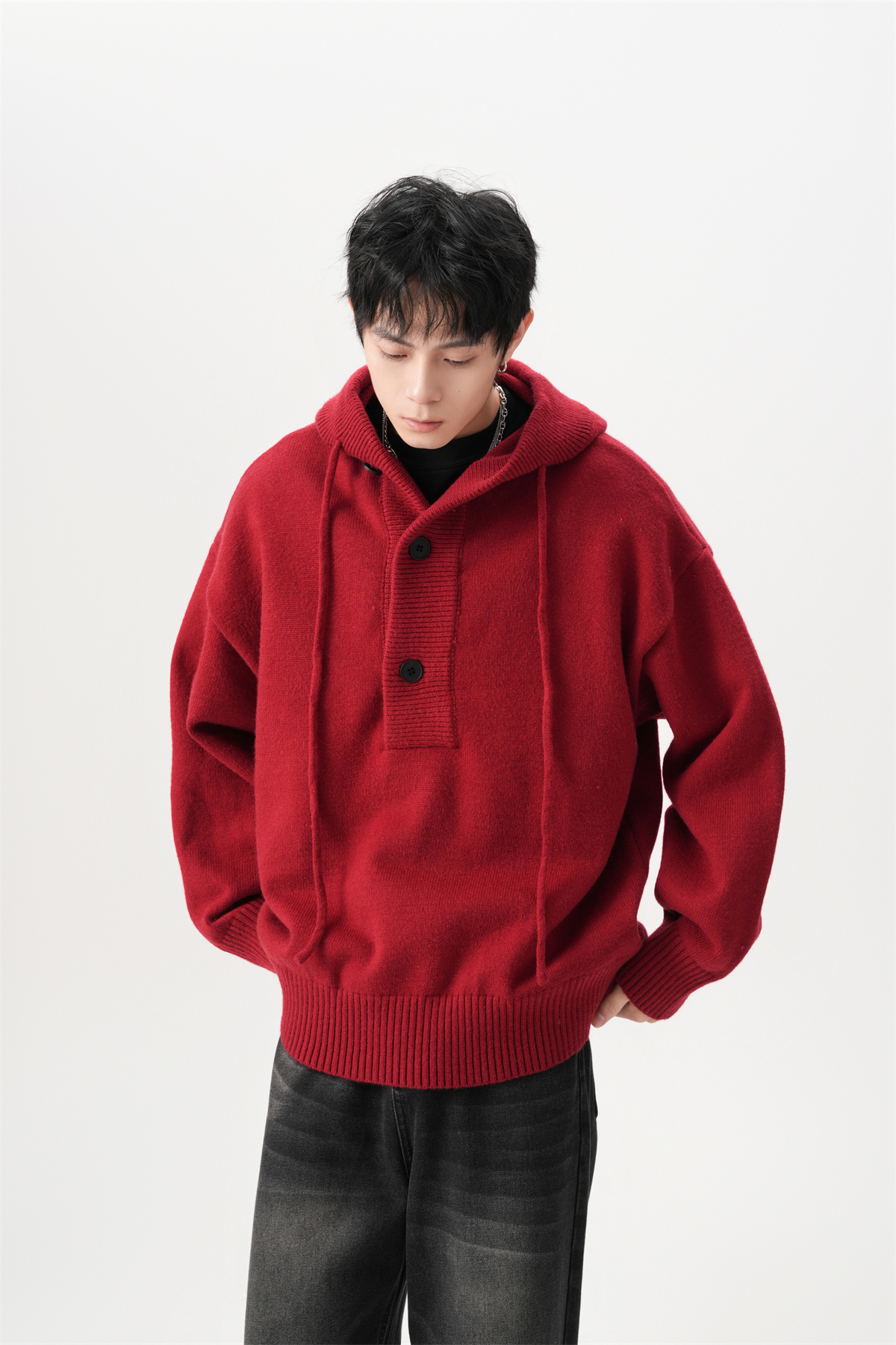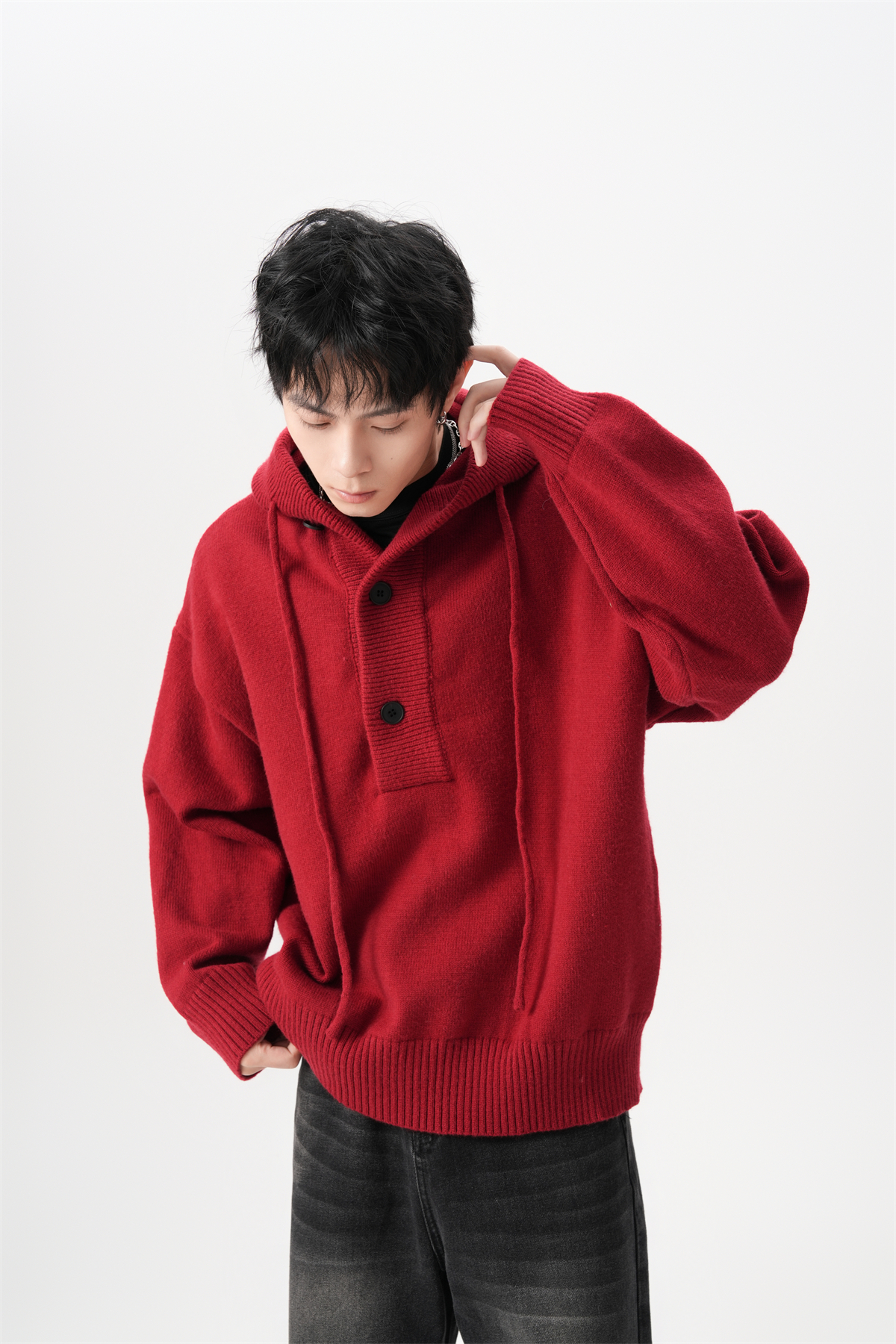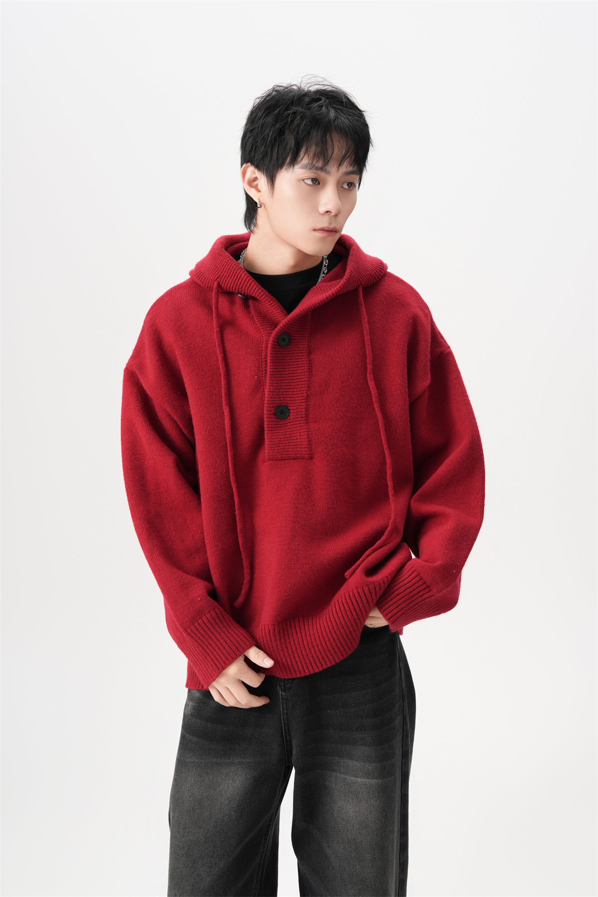 美式安可拉紅半開衫連帽毛衣男秋季潮牌慵懶風針織衫寬松情侶外套