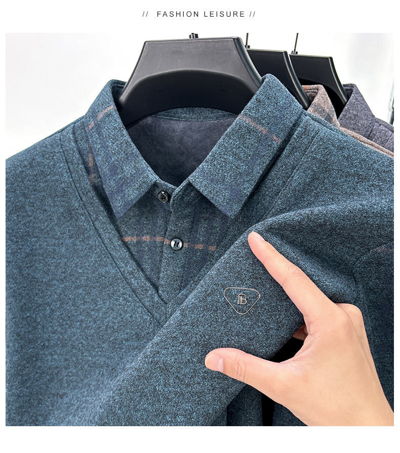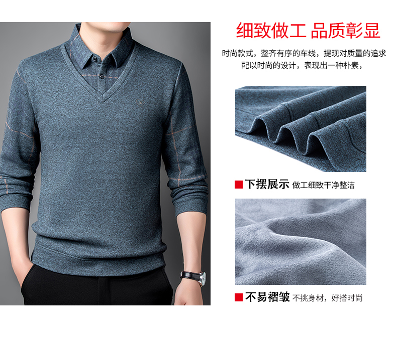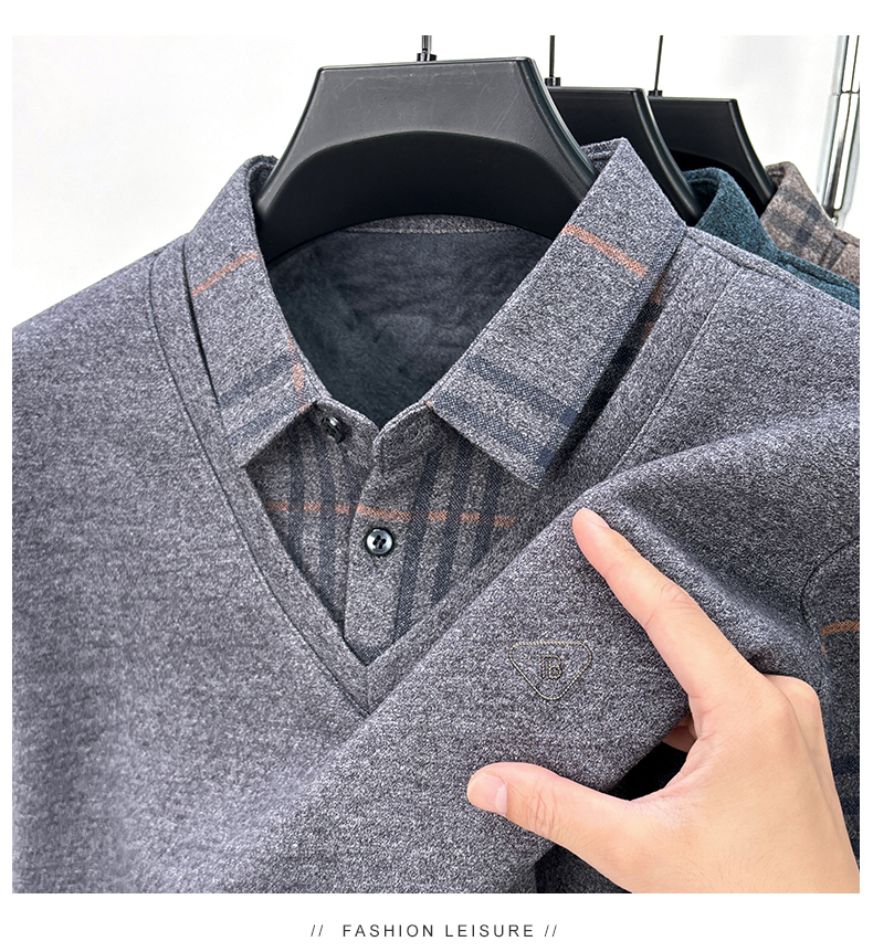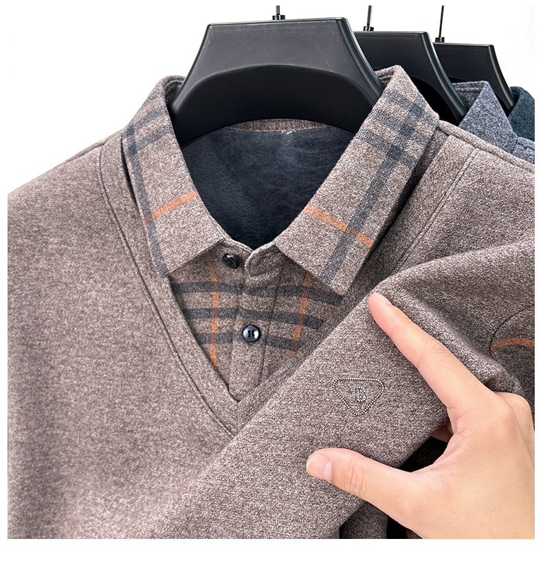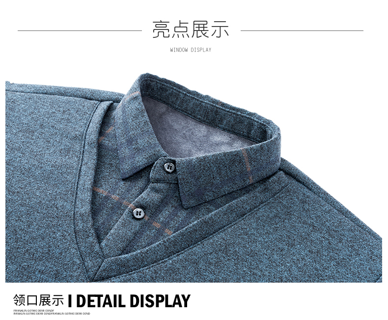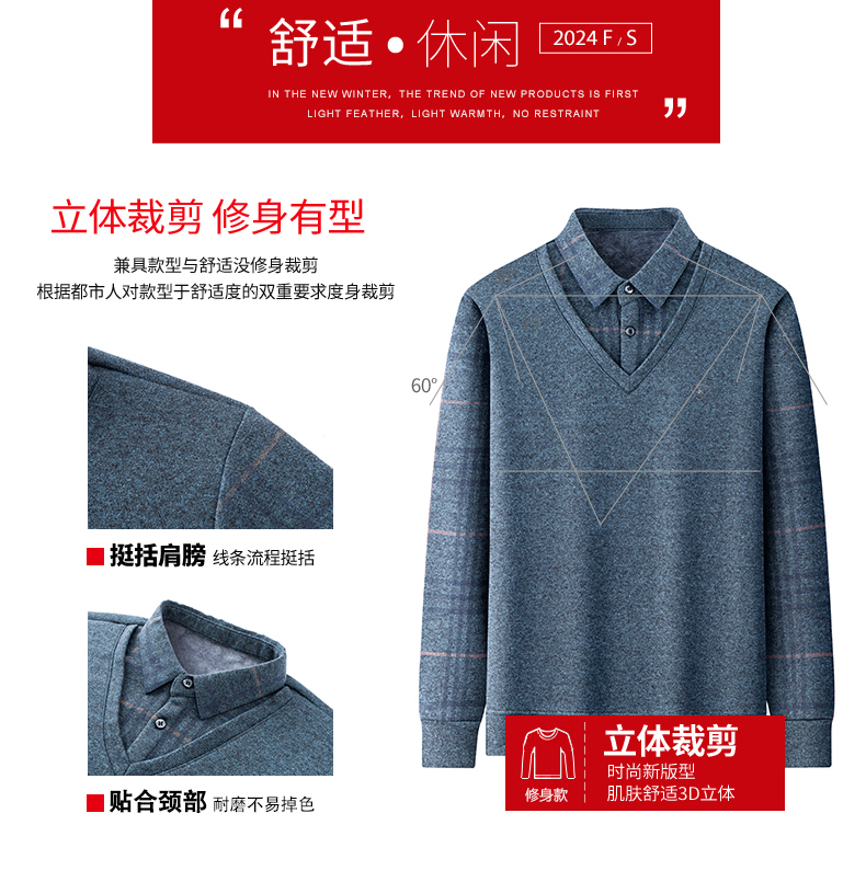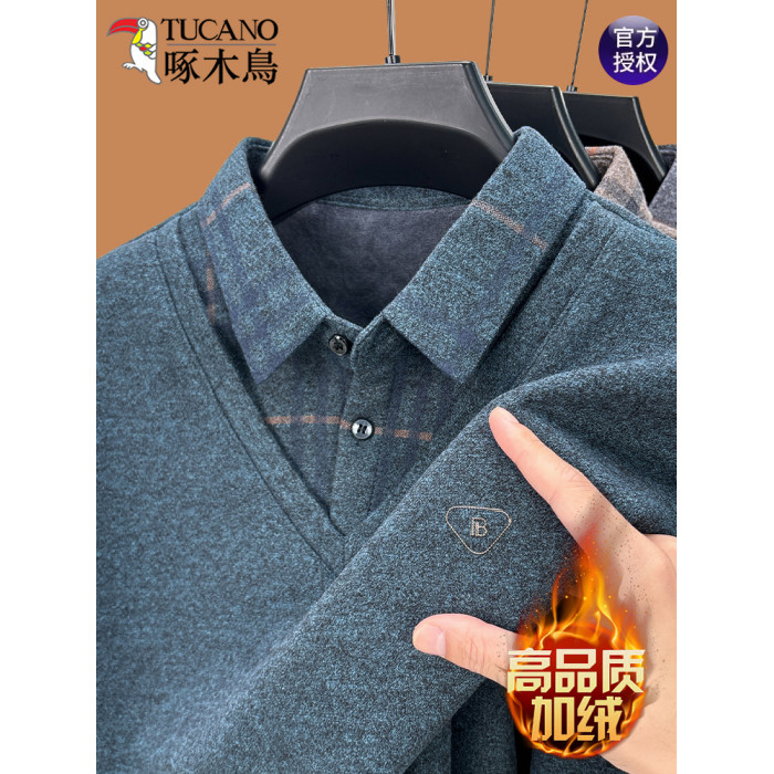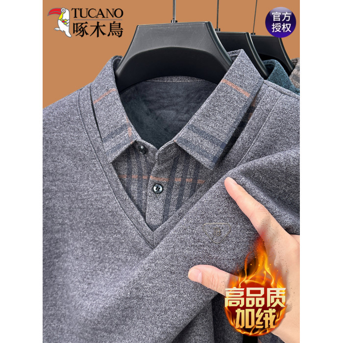 啄木鳥冬季假兩件加絨加厚毛衣男POLO衫t恤保暖打底中老年爸爸裝