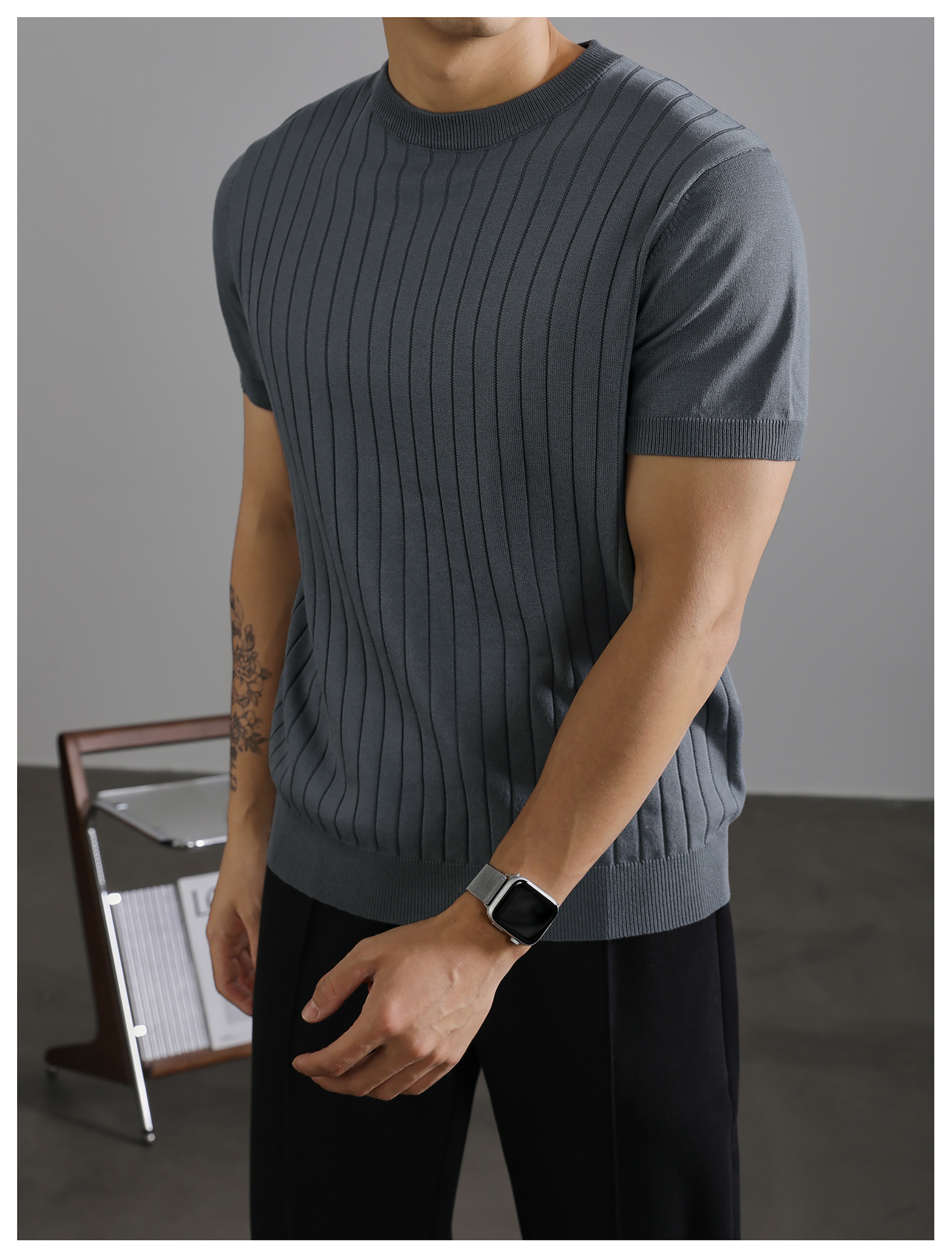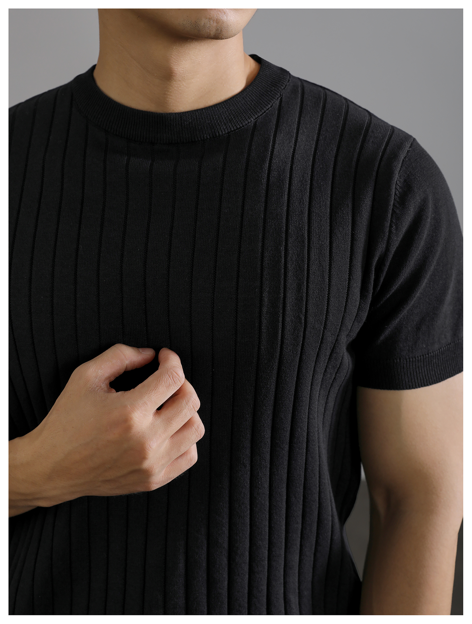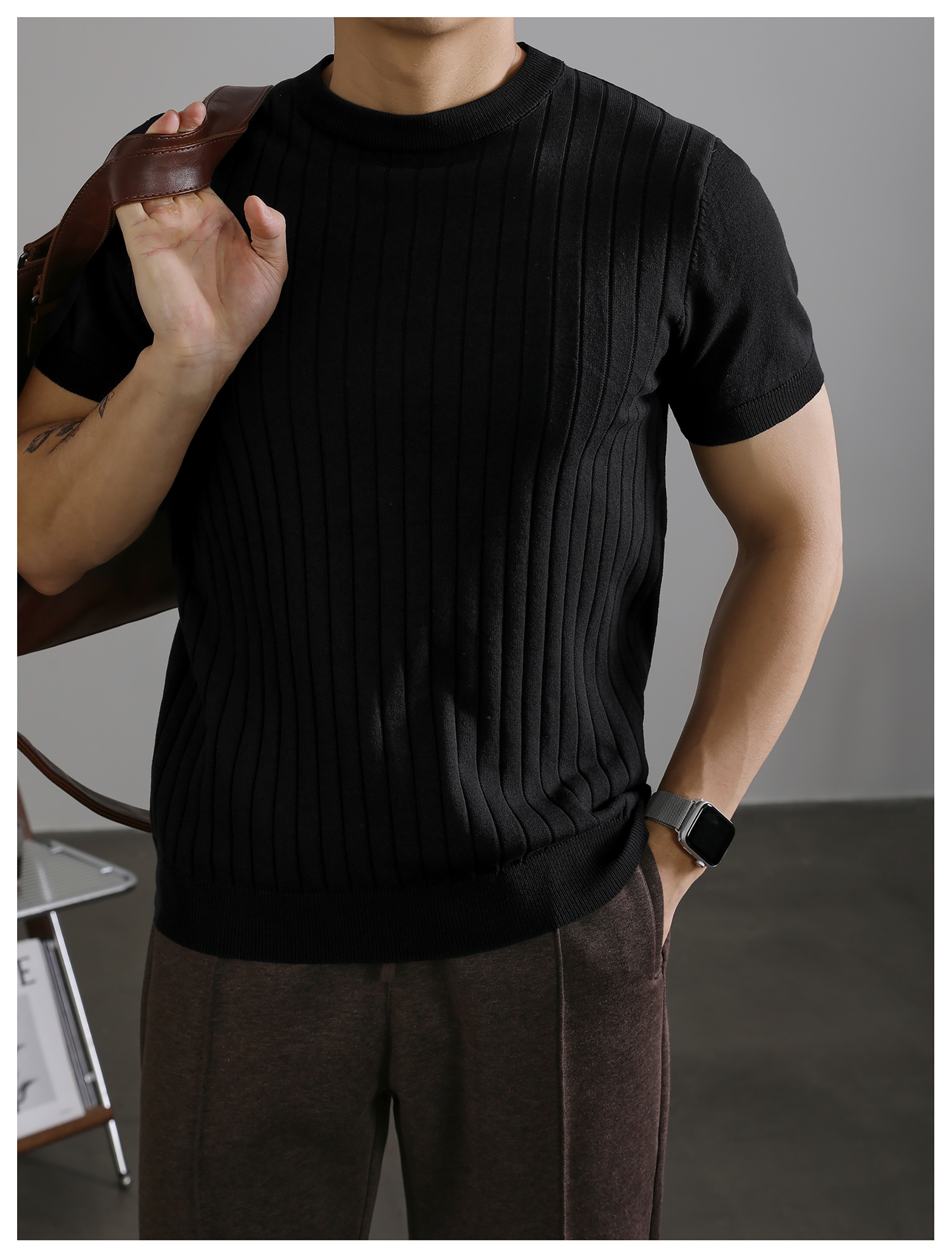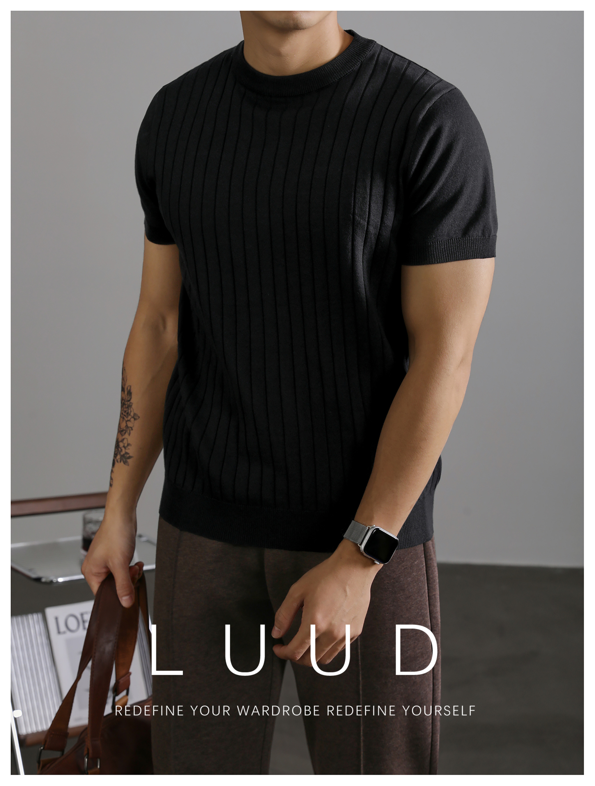 LUUD 黑色簡質圓領短袖上衣男夏季透氣針織款T恤衫大條紋薄款體恤