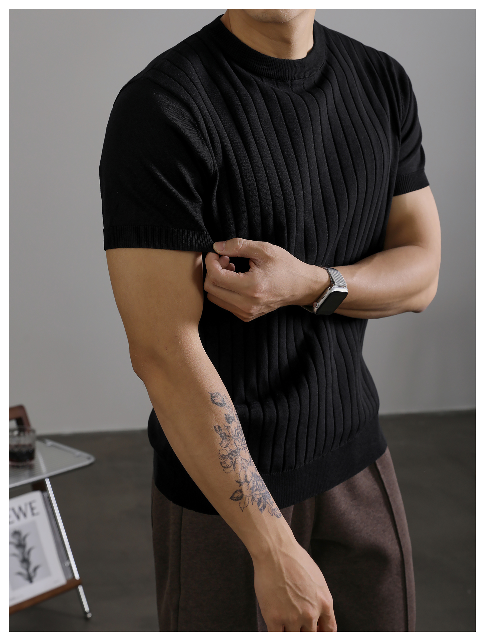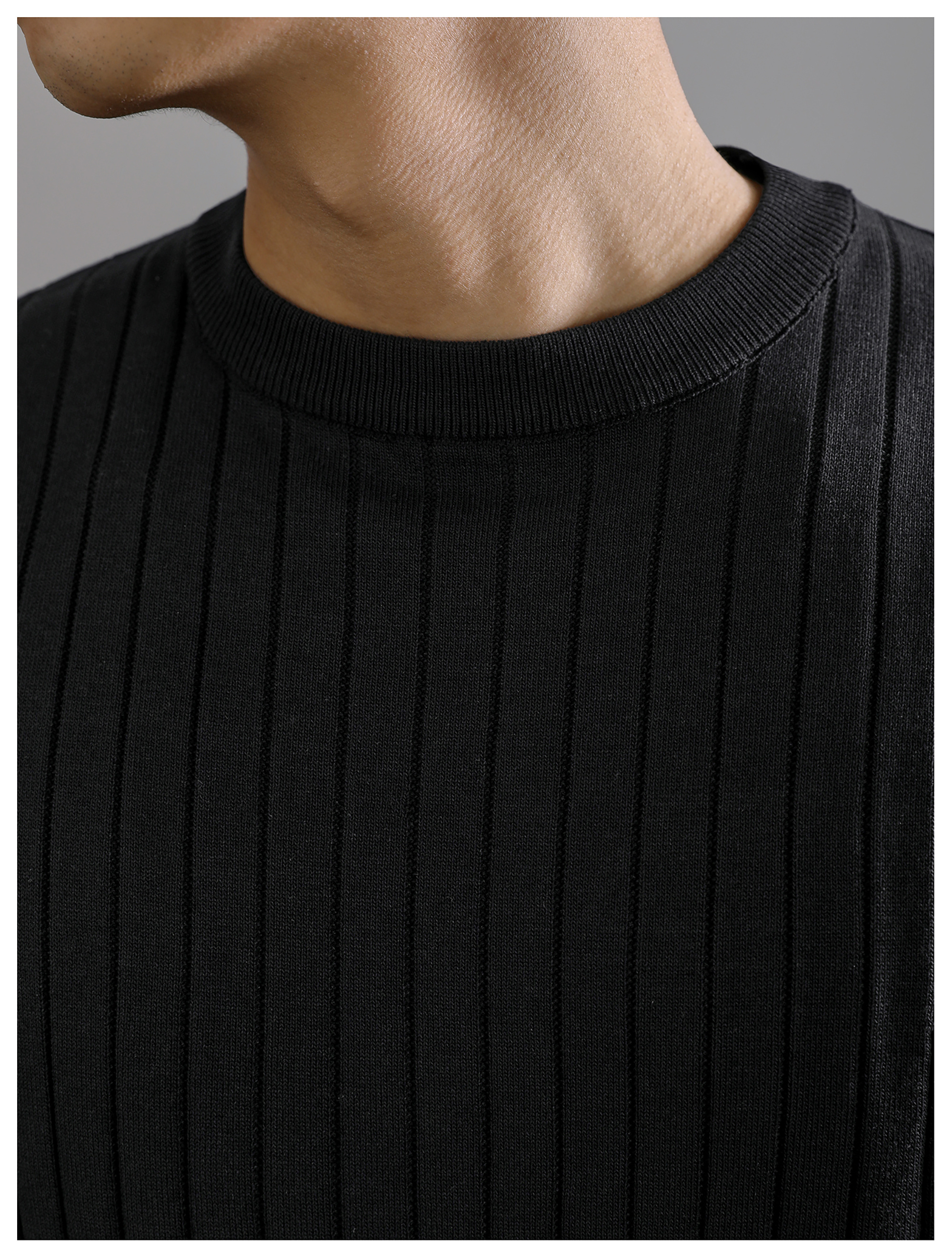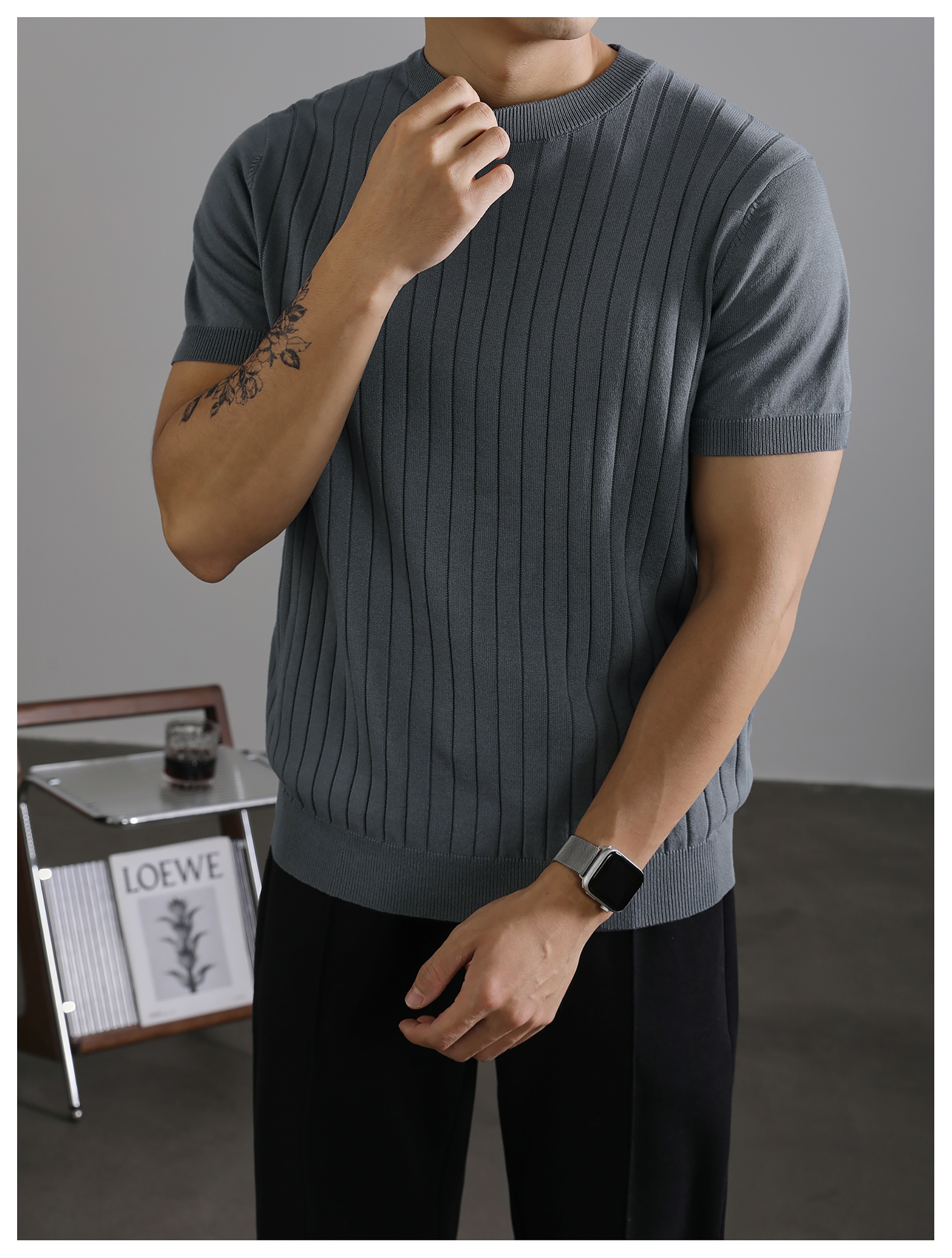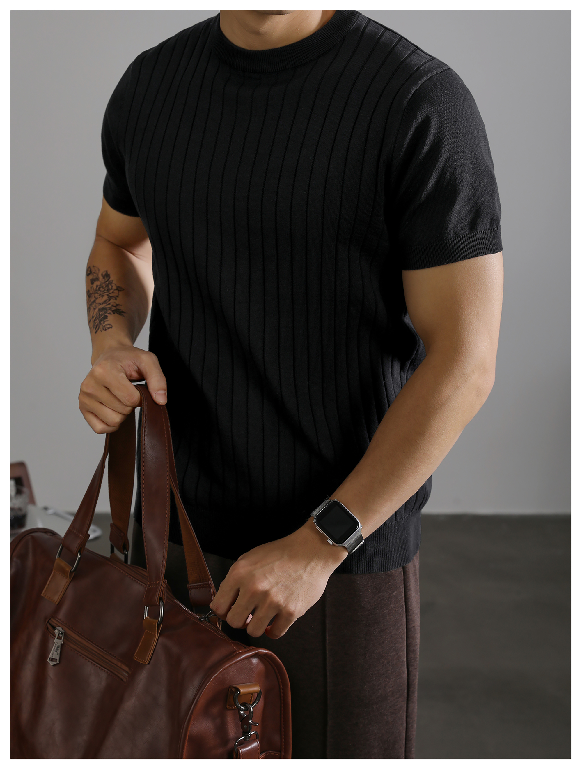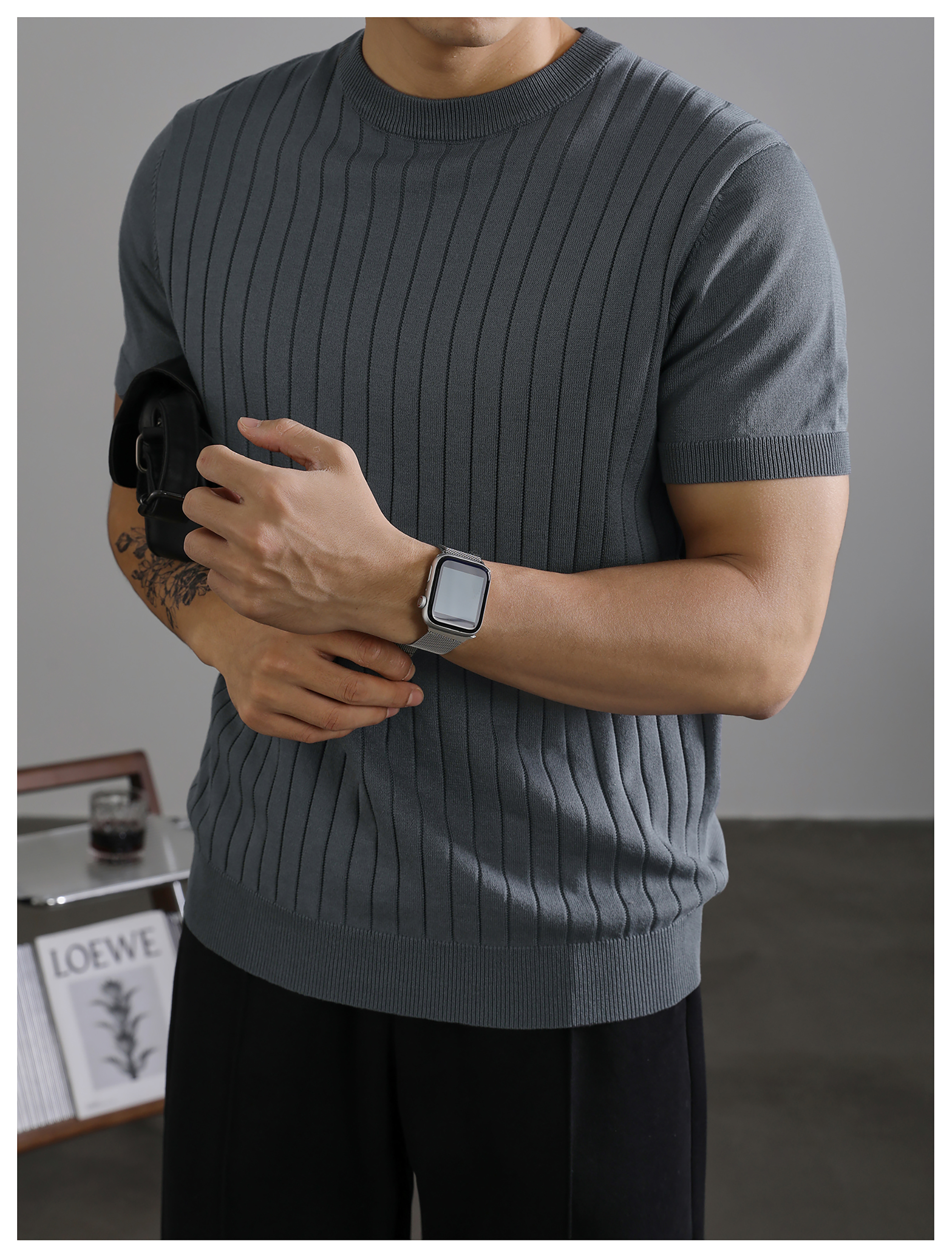 LUUD 黑色簡質圓領短袖上衣男夏季透氣針織款T恤衫大條紋薄款體恤