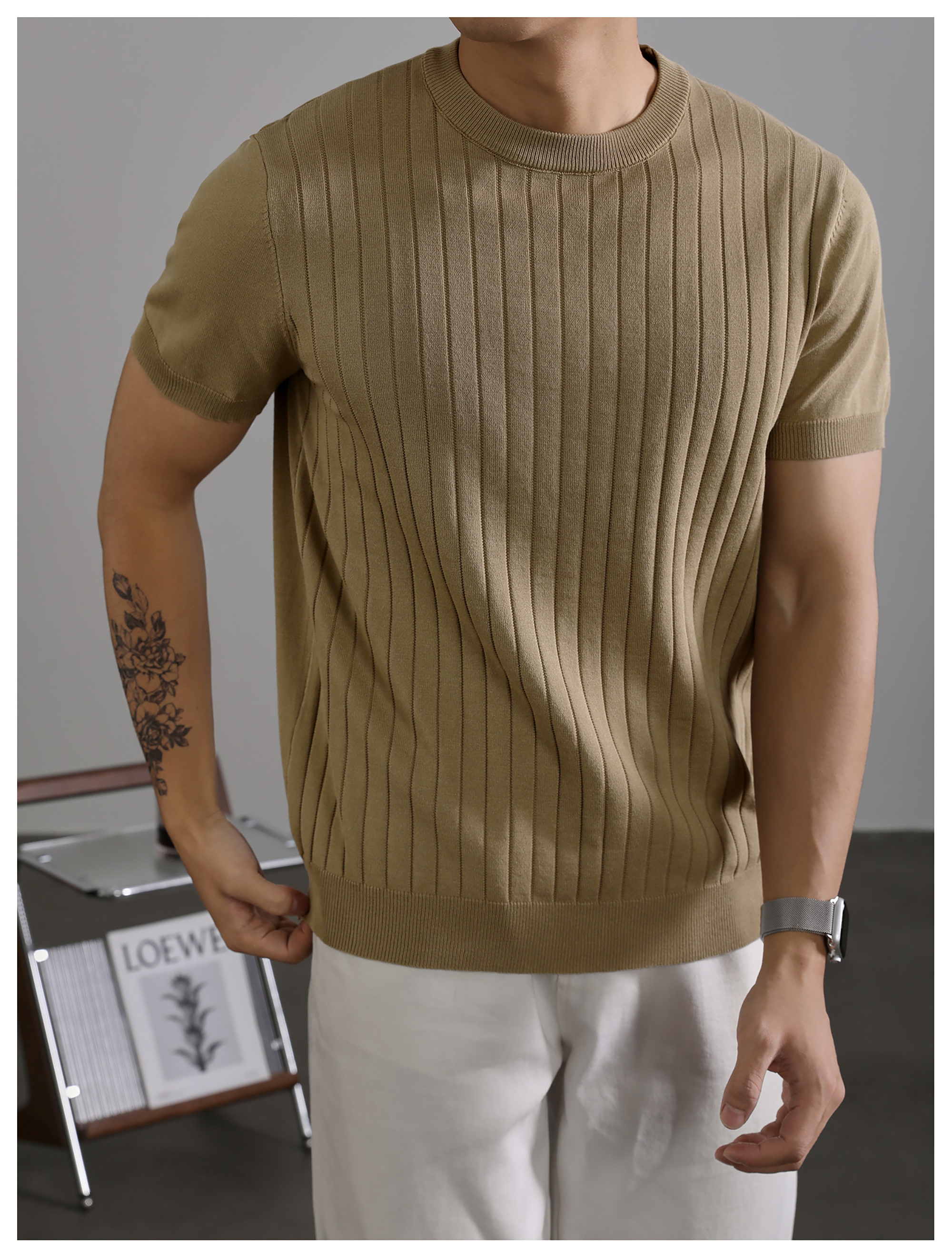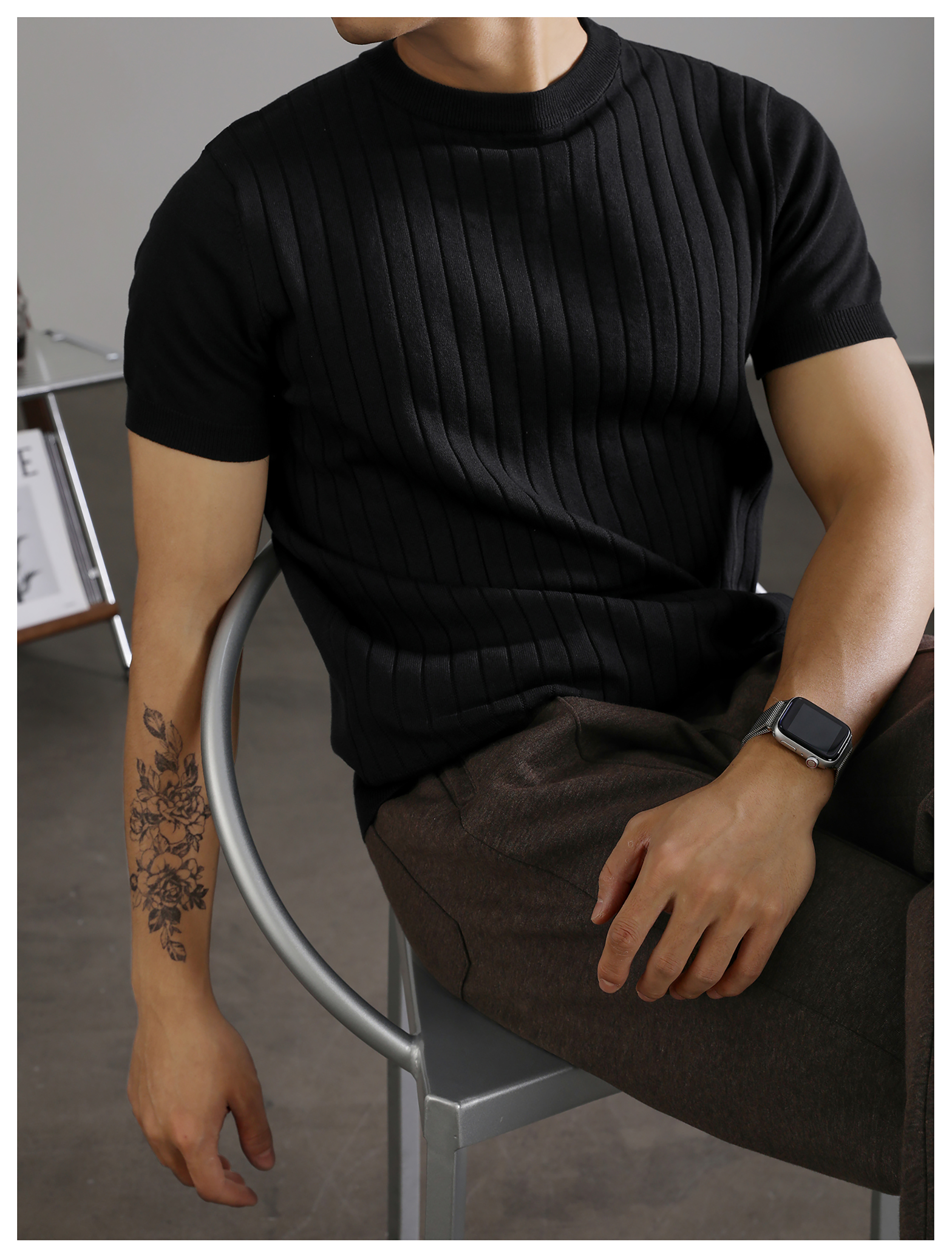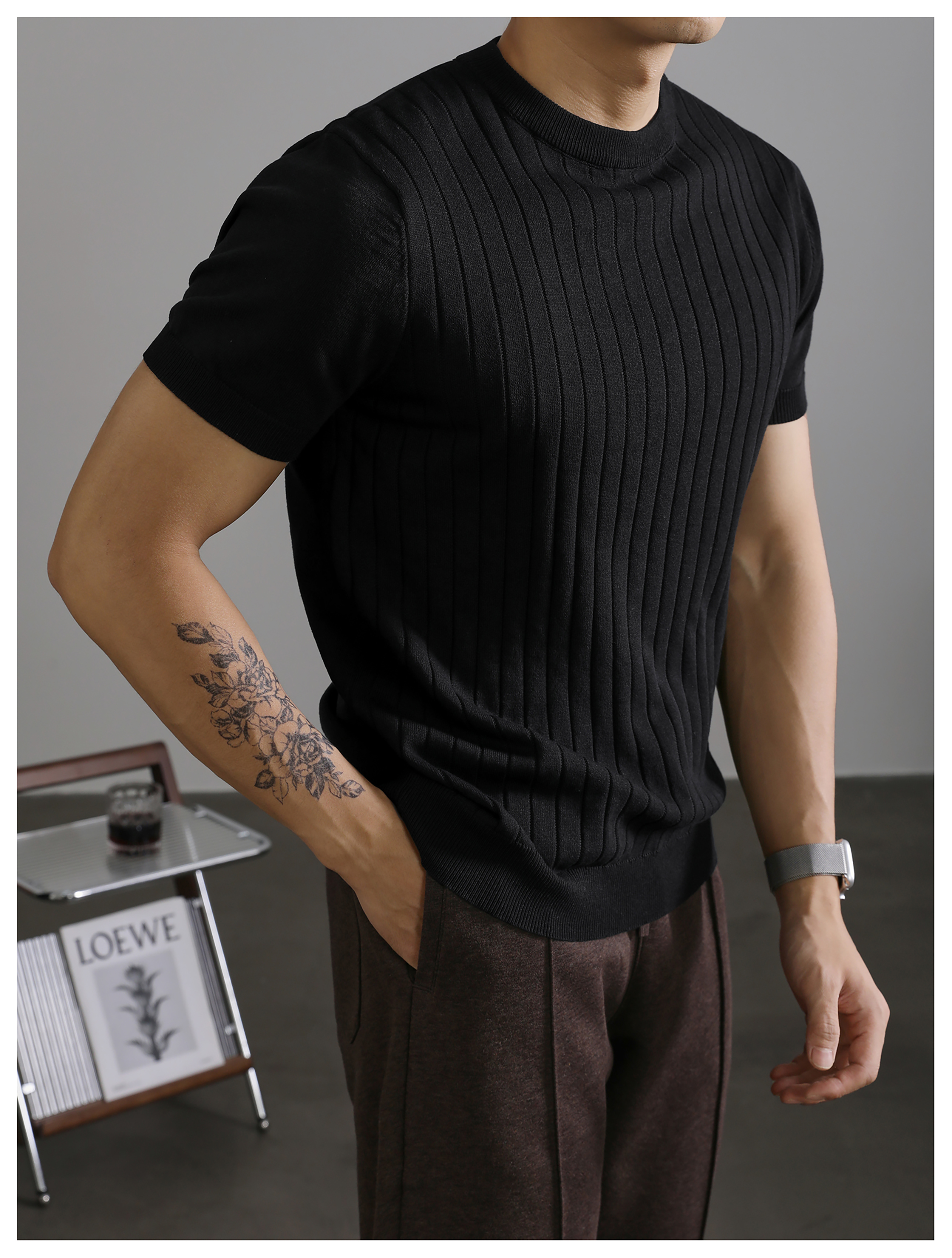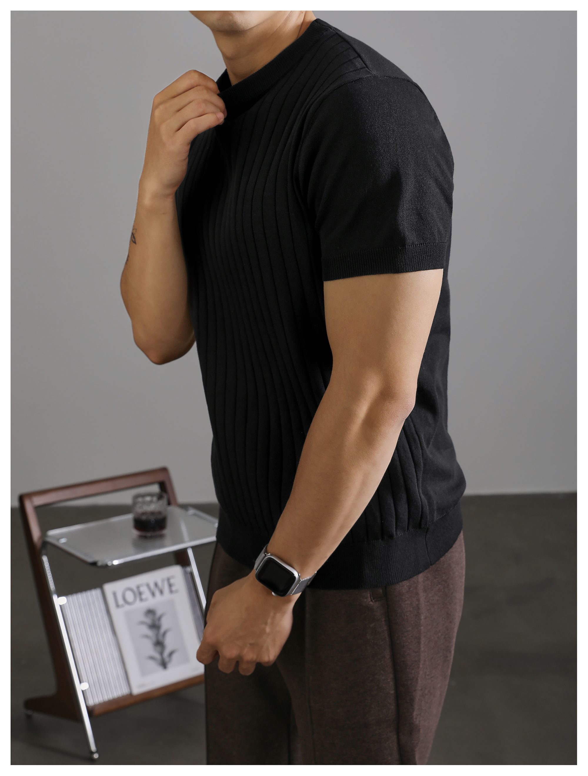 LUUD 黑色簡質圓領短袖上衣男夏季透氣針織款T恤衫大條紋薄款體恤