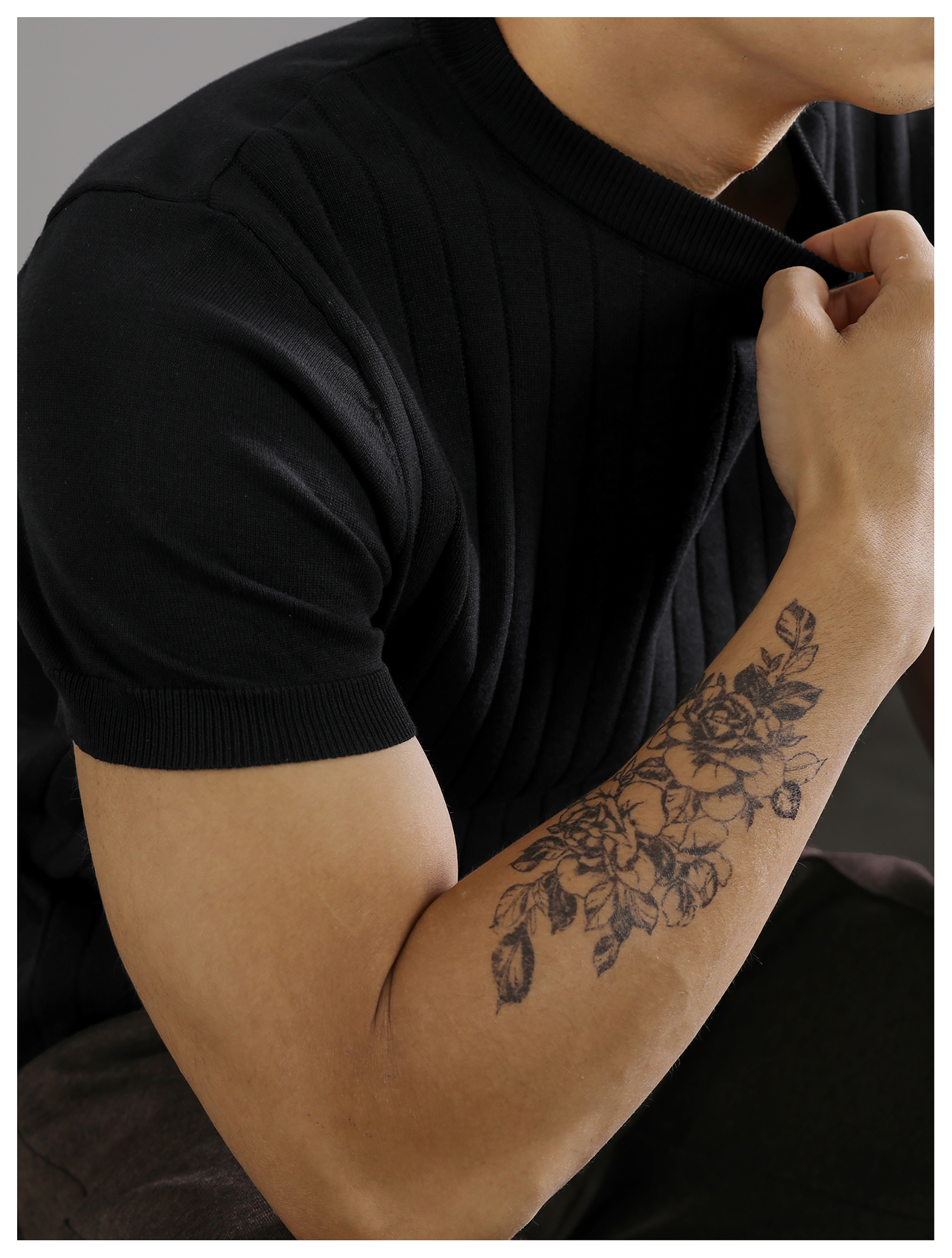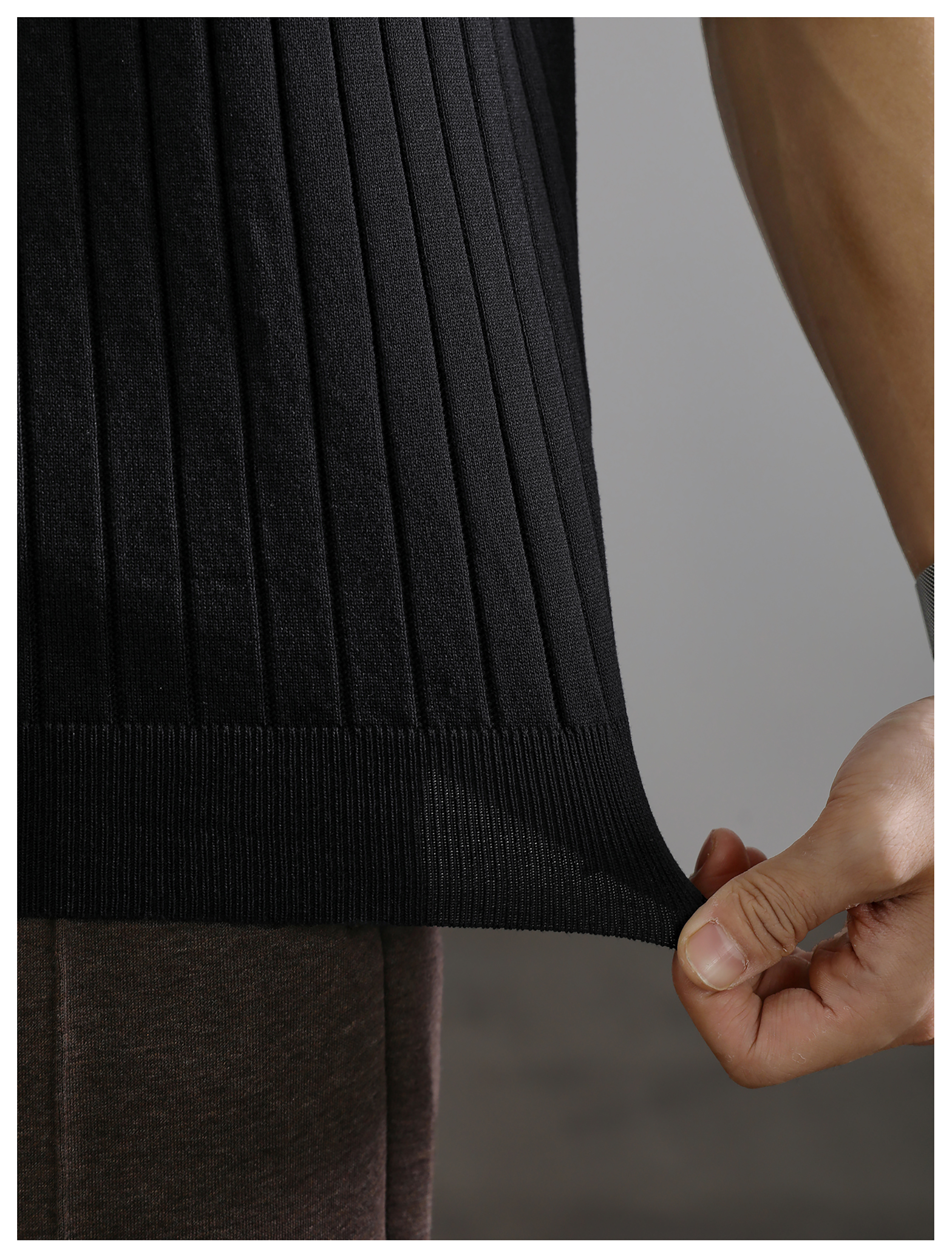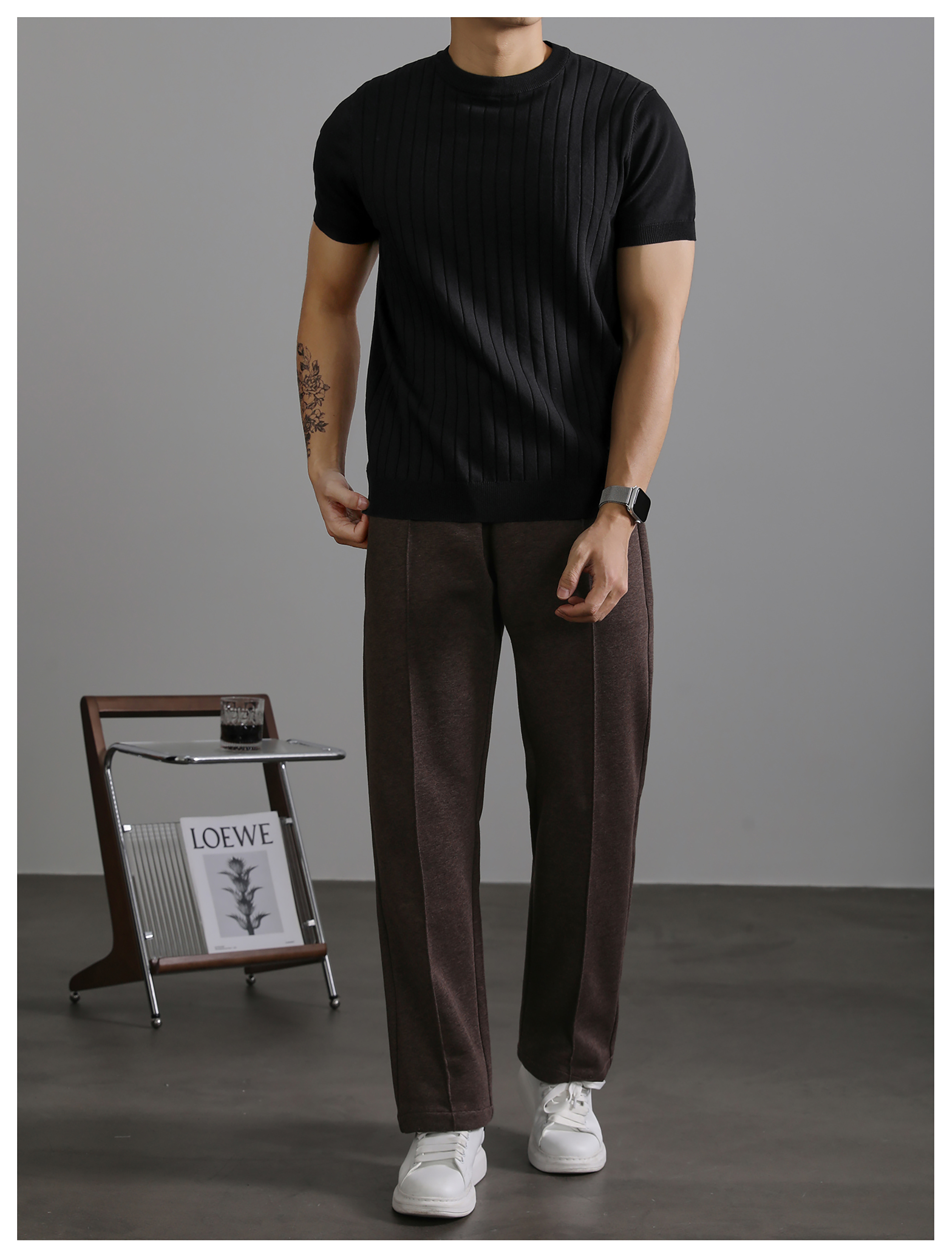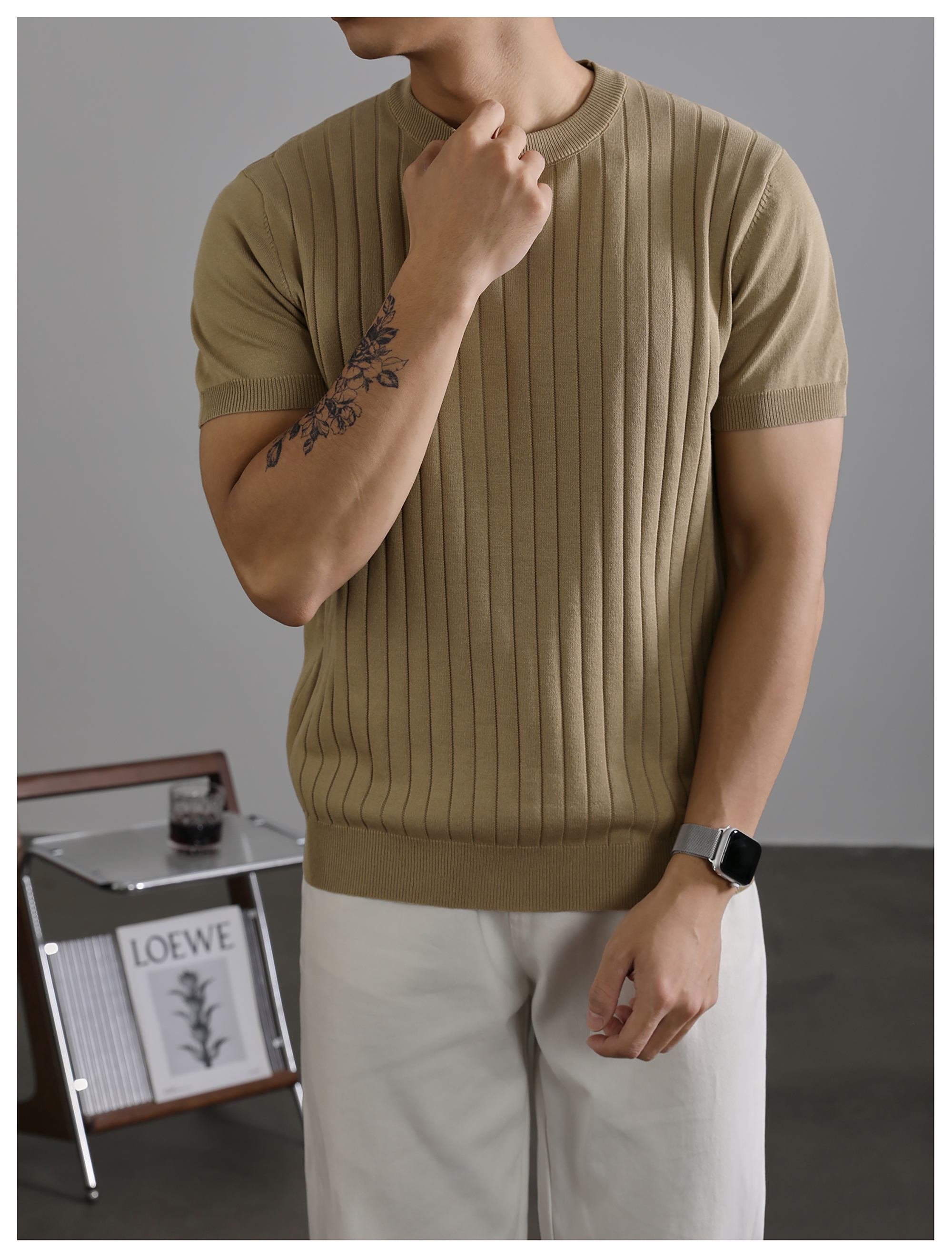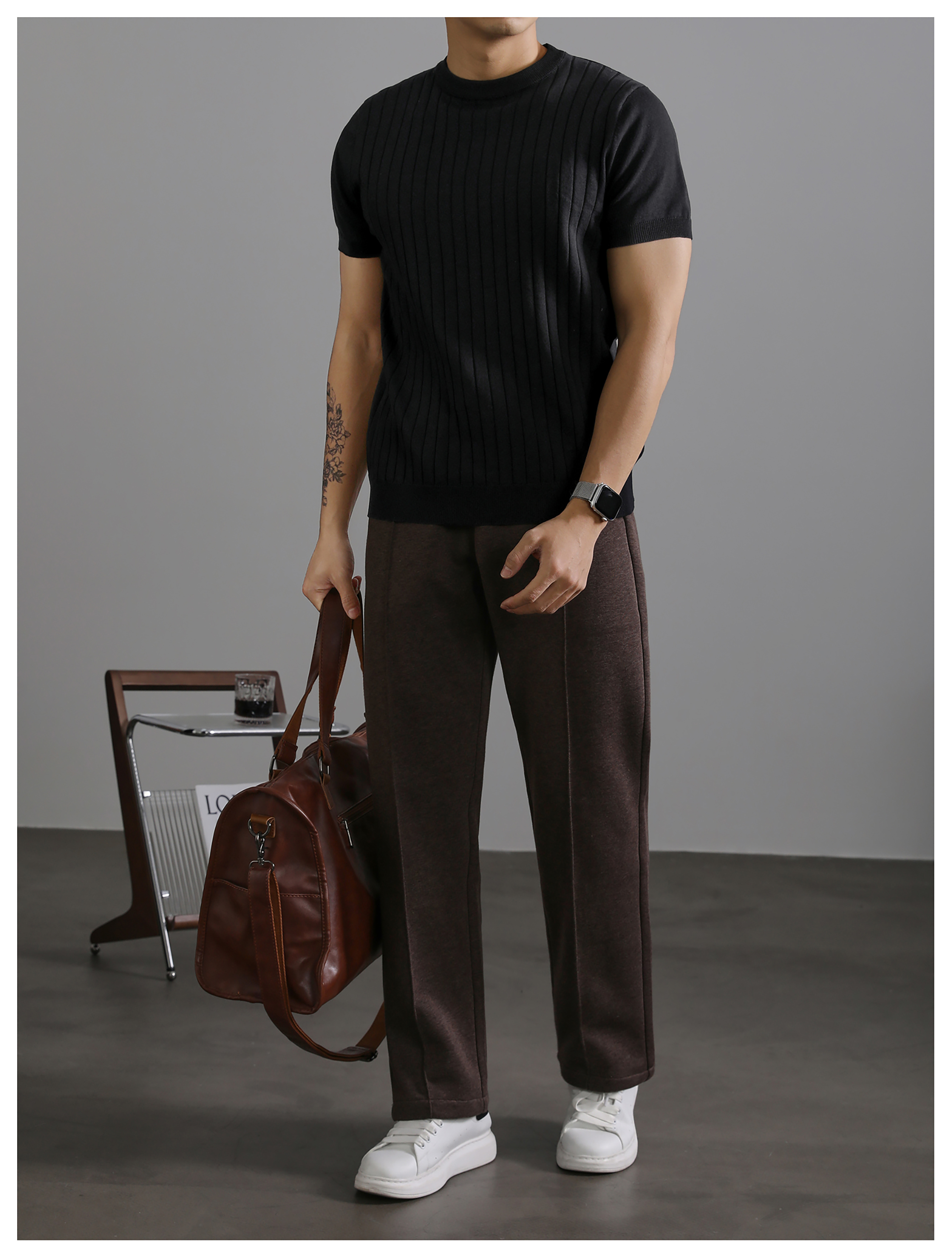 LUUD 黑色簡質圓領短袖上衣男夏季透氣針織款T恤衫大條紋薄款體恤