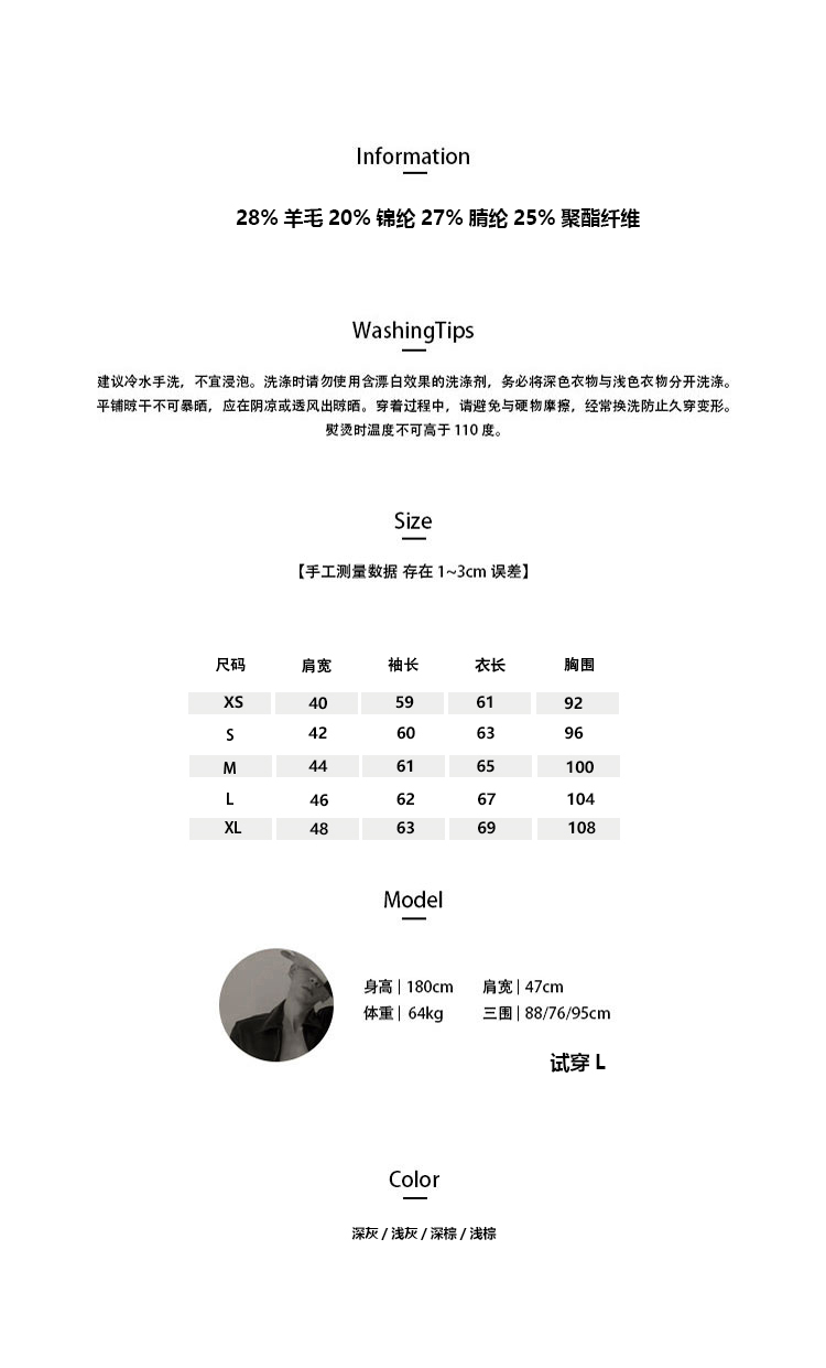 | 材質成分 | 羊毛28% 聚丙烯腈纖維(腈綸)27% 聚酯纖維25% 聚醯胺纖維(錦綸)20% |