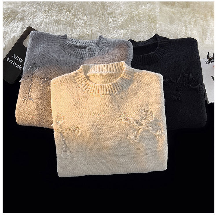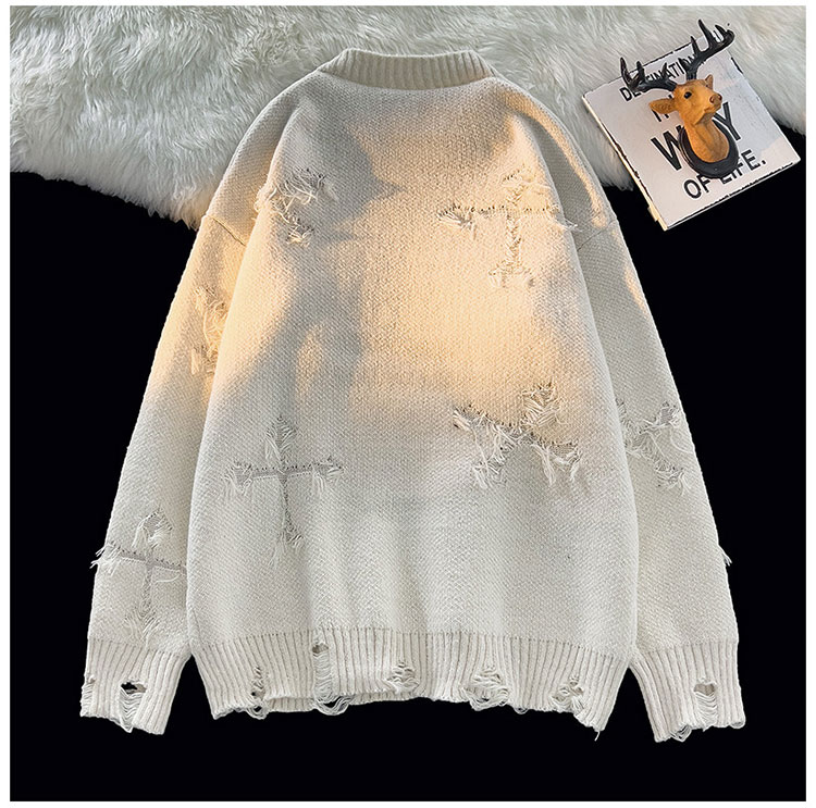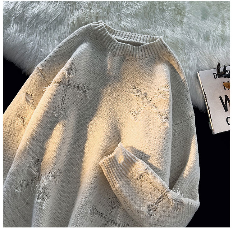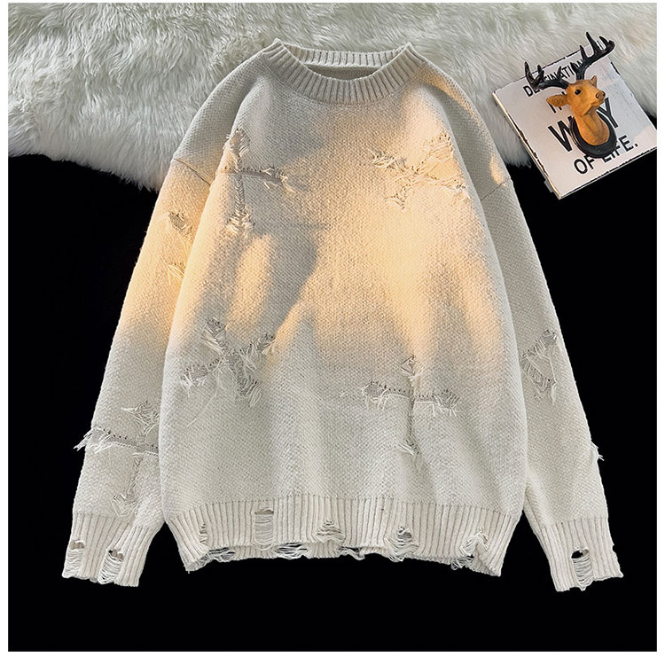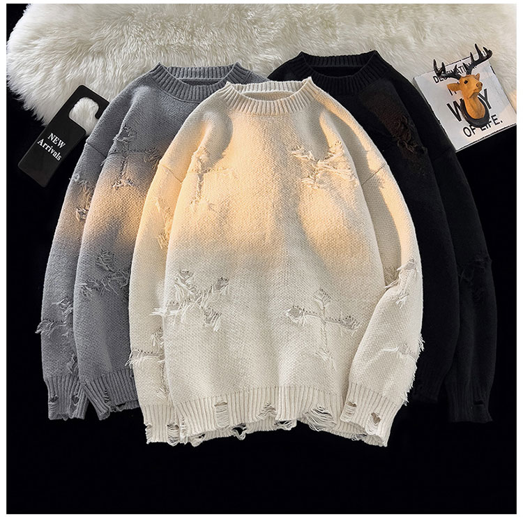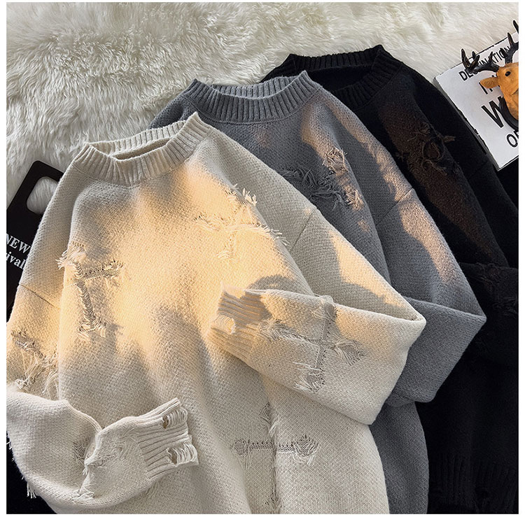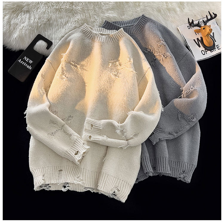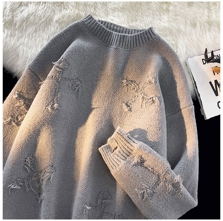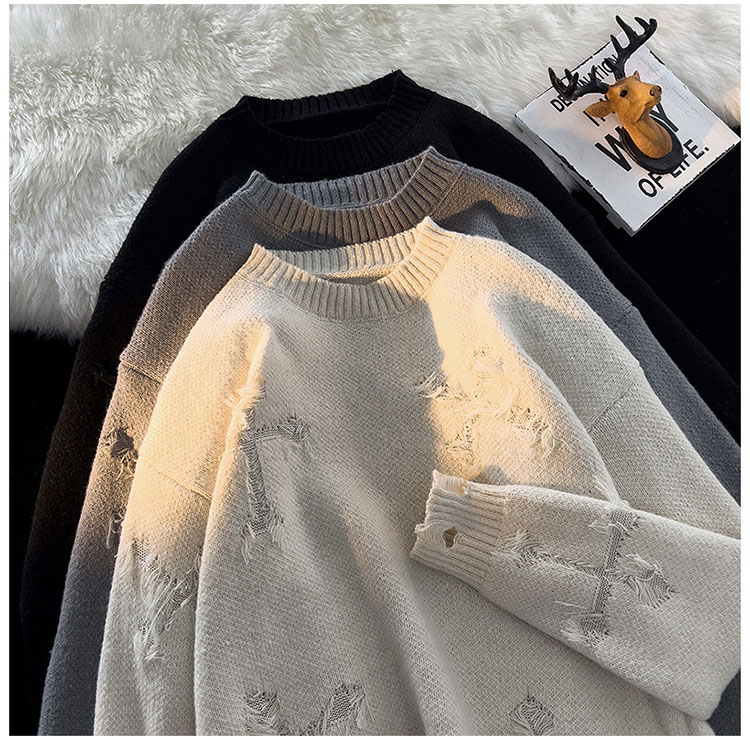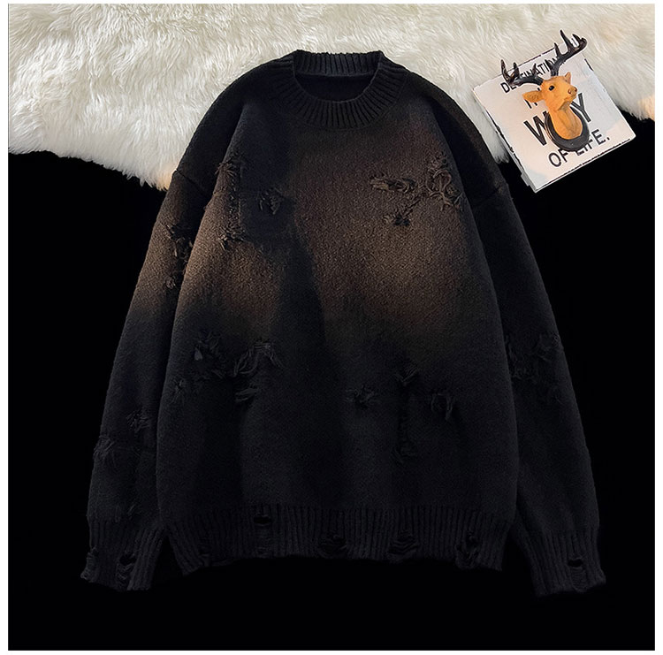 秋冬破洞毛衣男圓領套頭潮牌高街美式復古日系青少年bf加厚針織衫