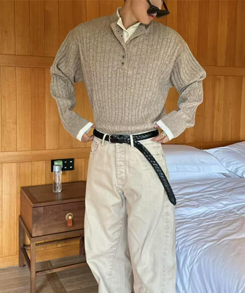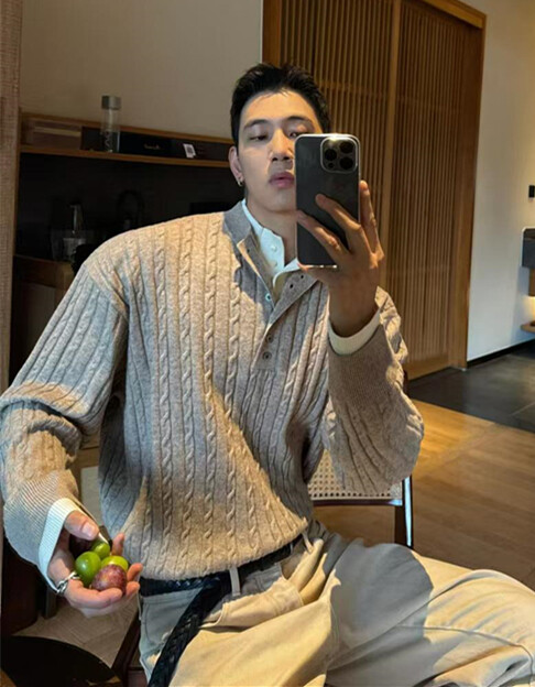 亨利領假兩件毛衣男款潮牌美式復古高級感針織衫POLO打底麻花線衣