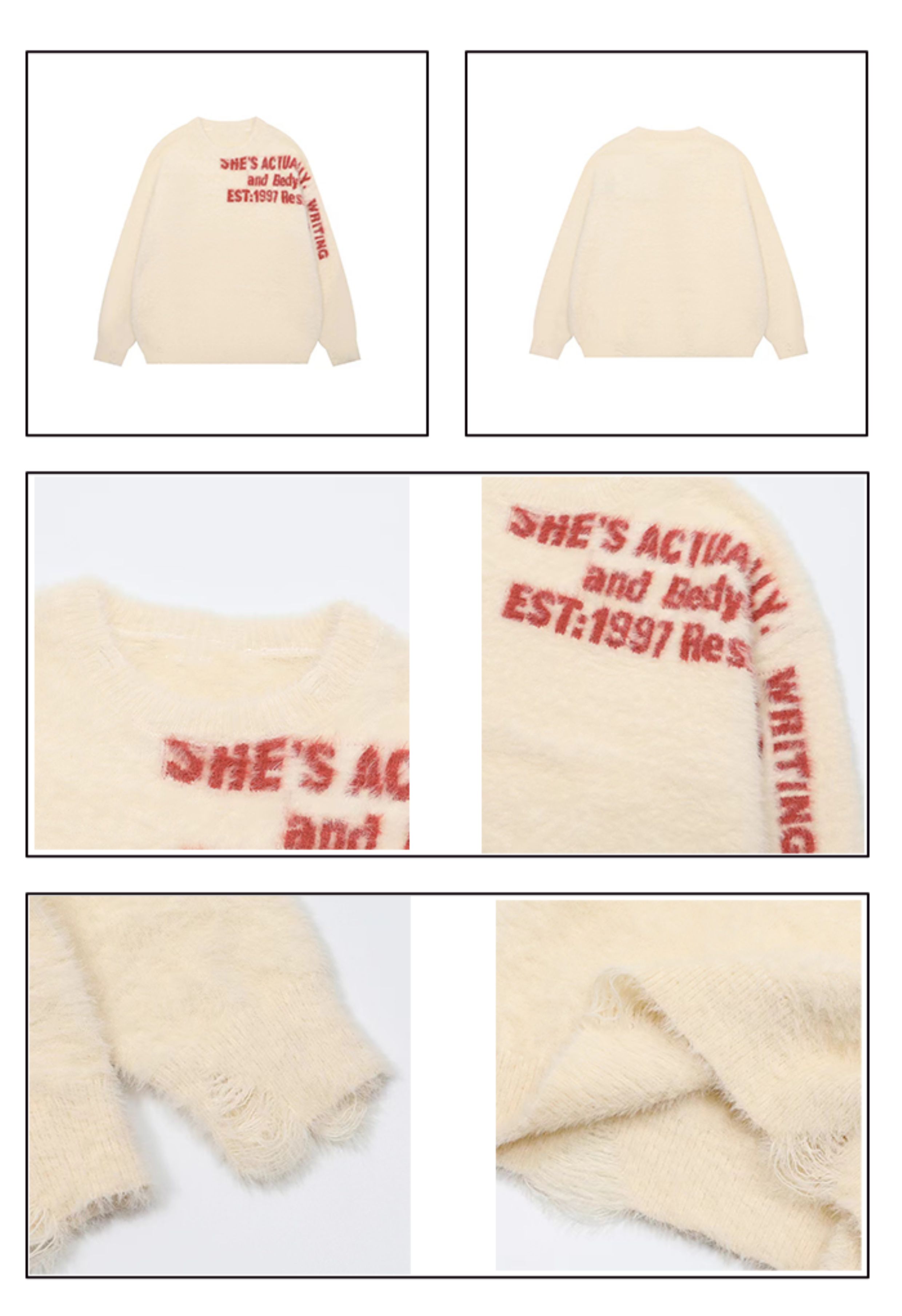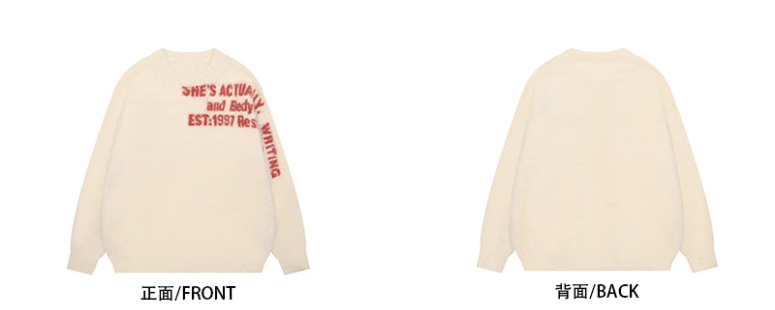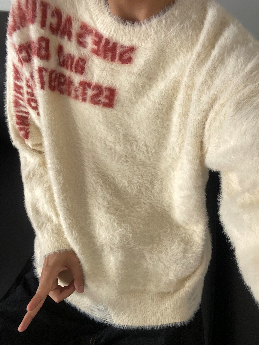美式潮牌仿貂刷毛軟糯秋冬毛衣男復古創意提花字母寬松情侶針織衫