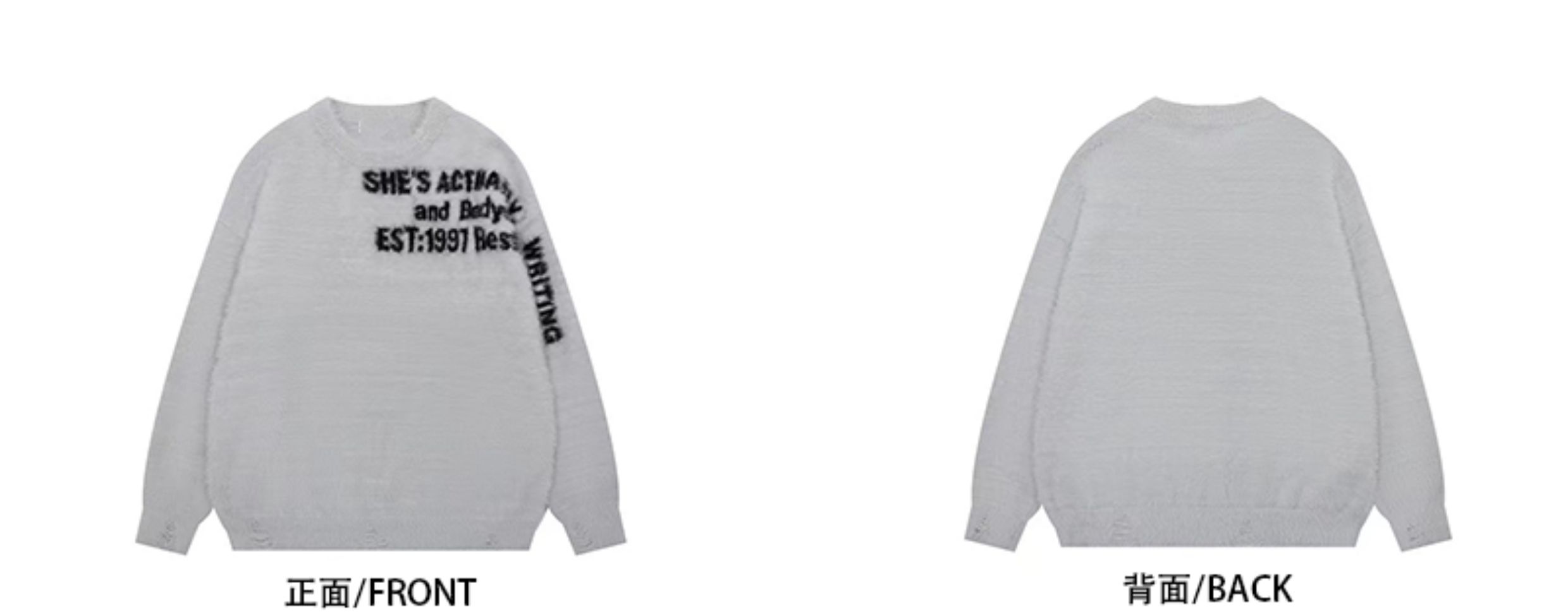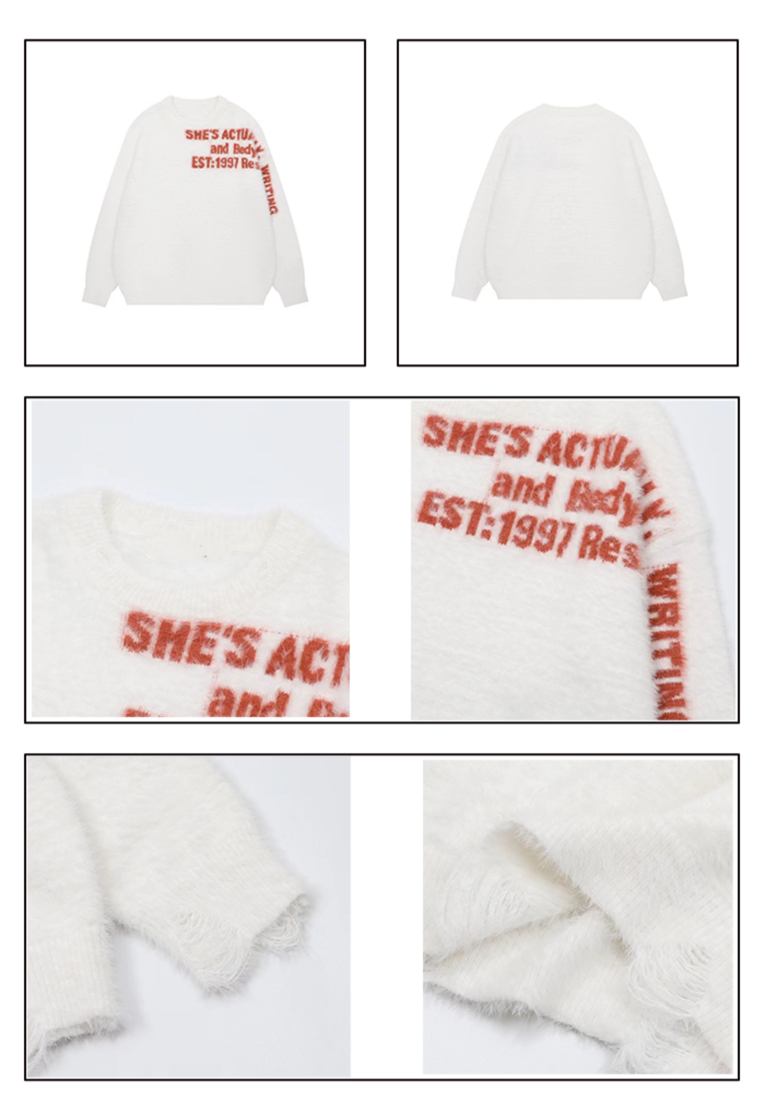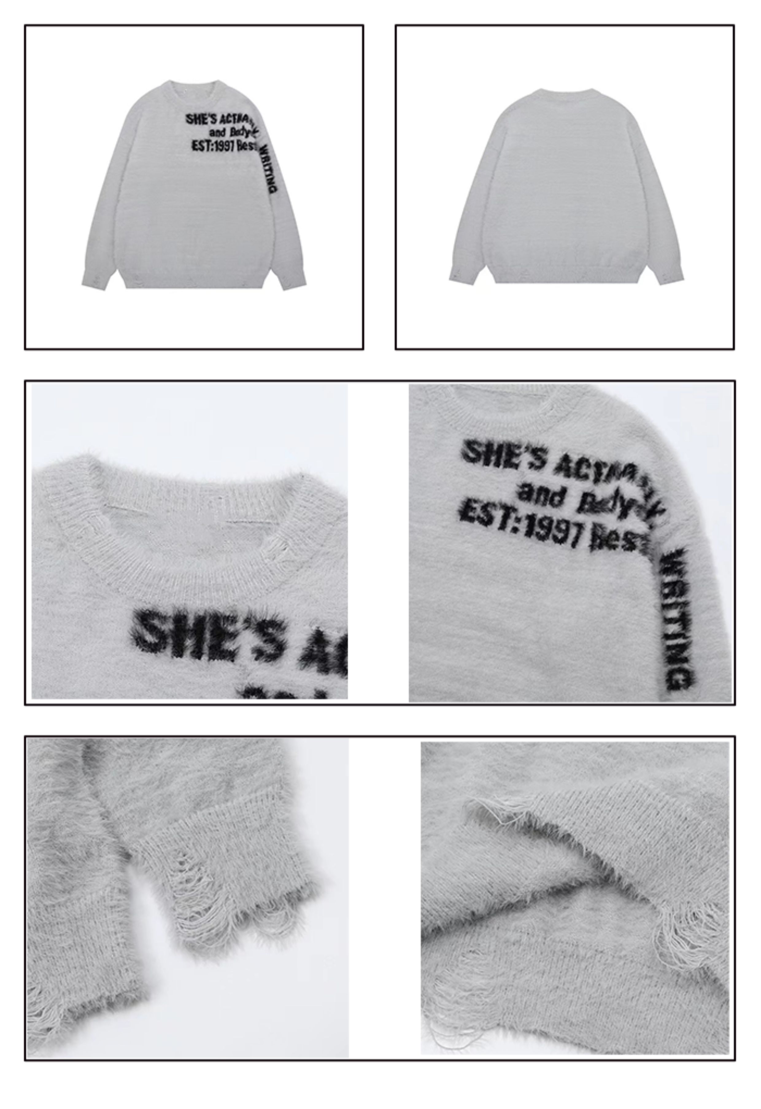美式潮牌仿貂刷毛軟糯秋冬毛衣男復古創意提花字母寬松情侶針織衫