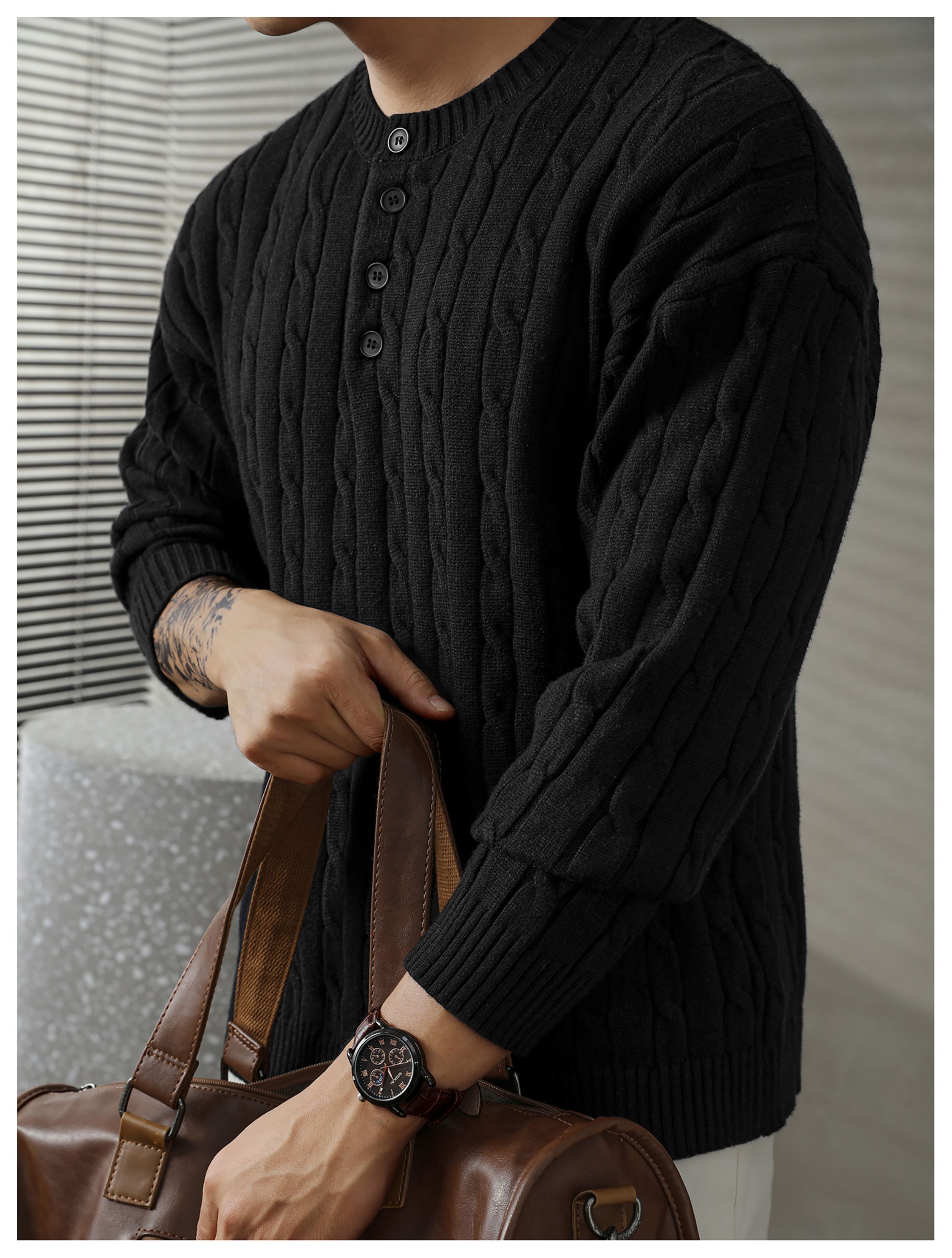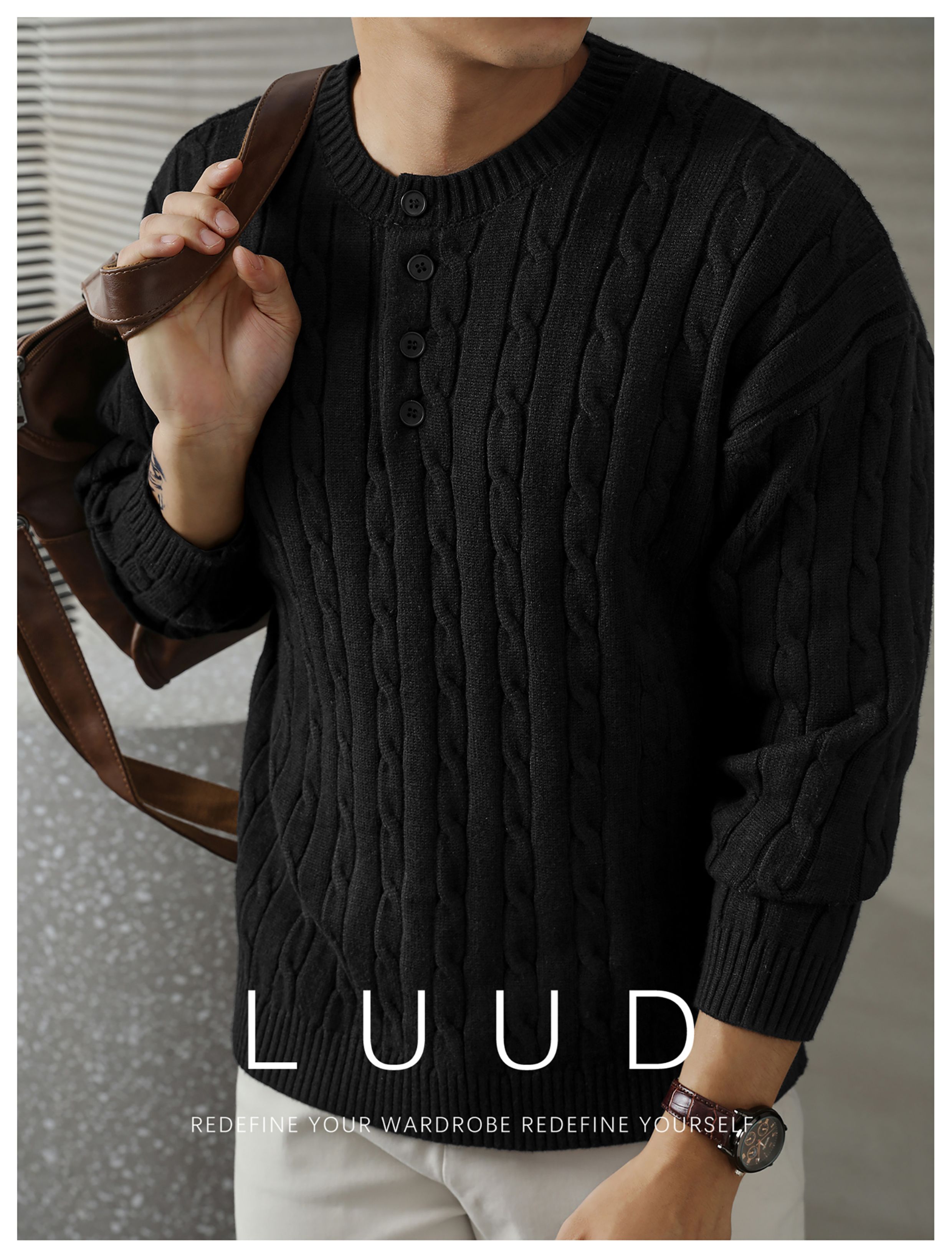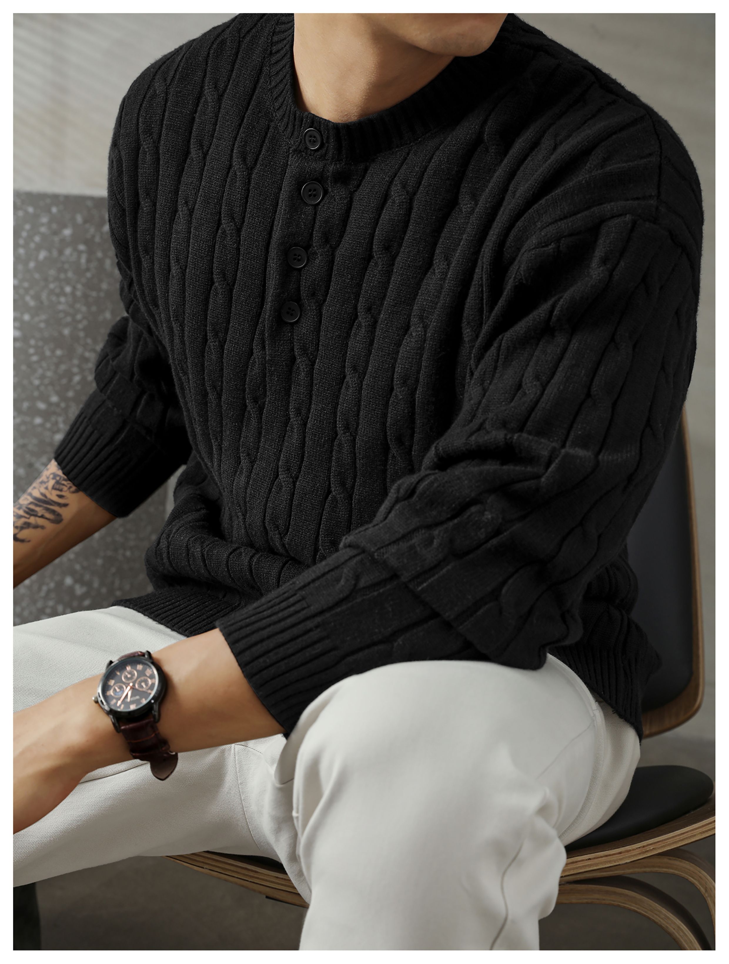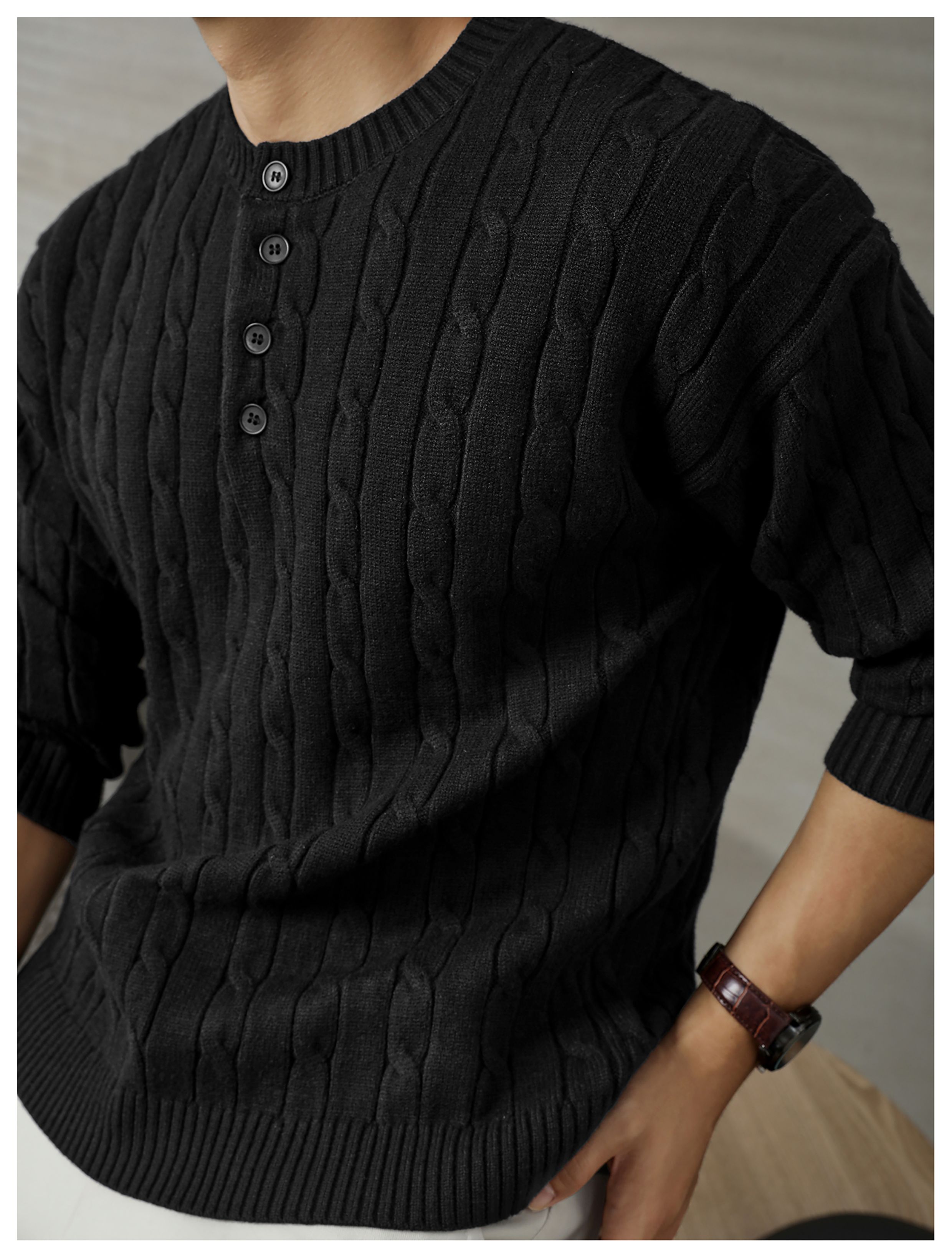 LUUD 輕奢氣質感亨利領黑色毛線衣男士麻花紋理高彈包芯紗針織衫
