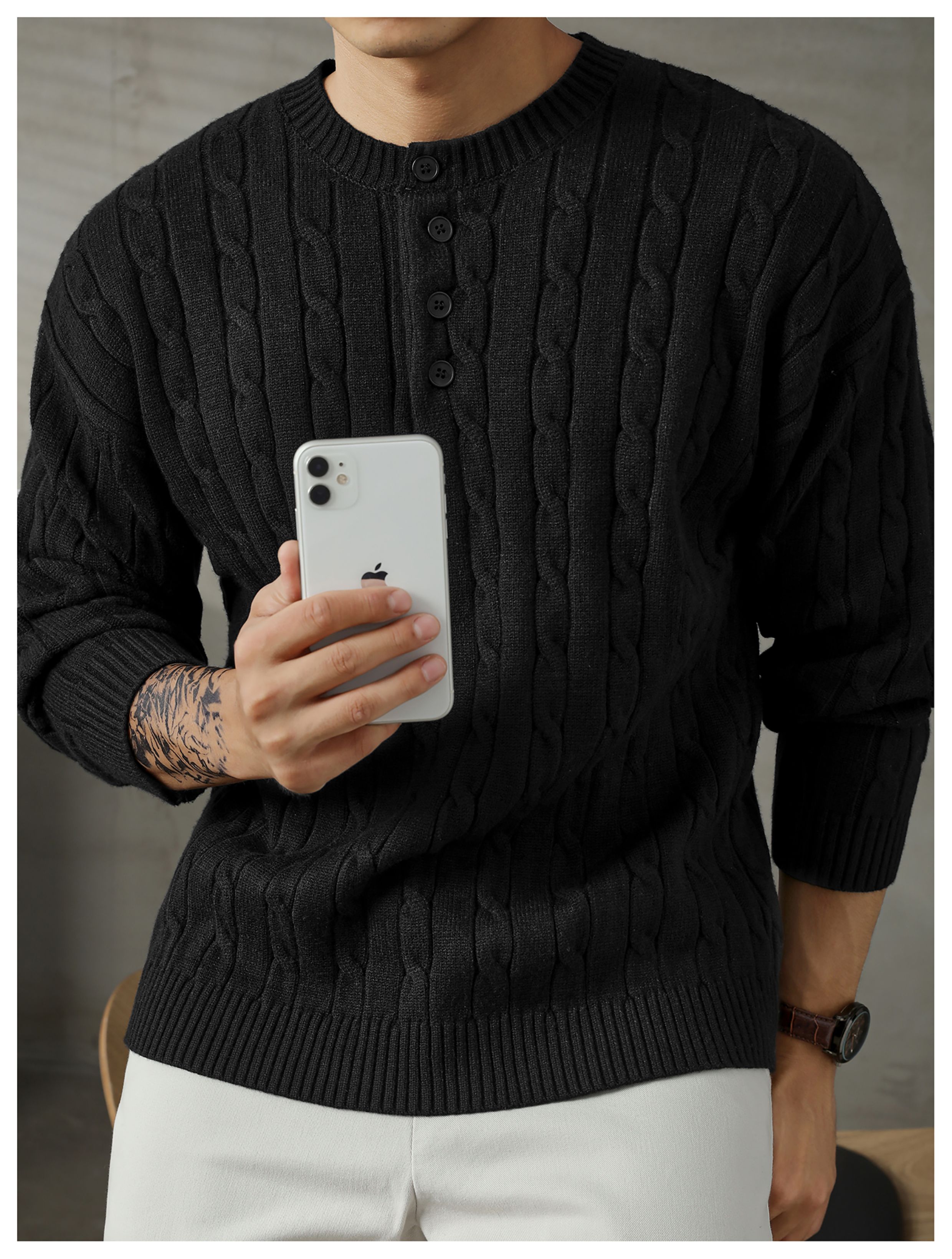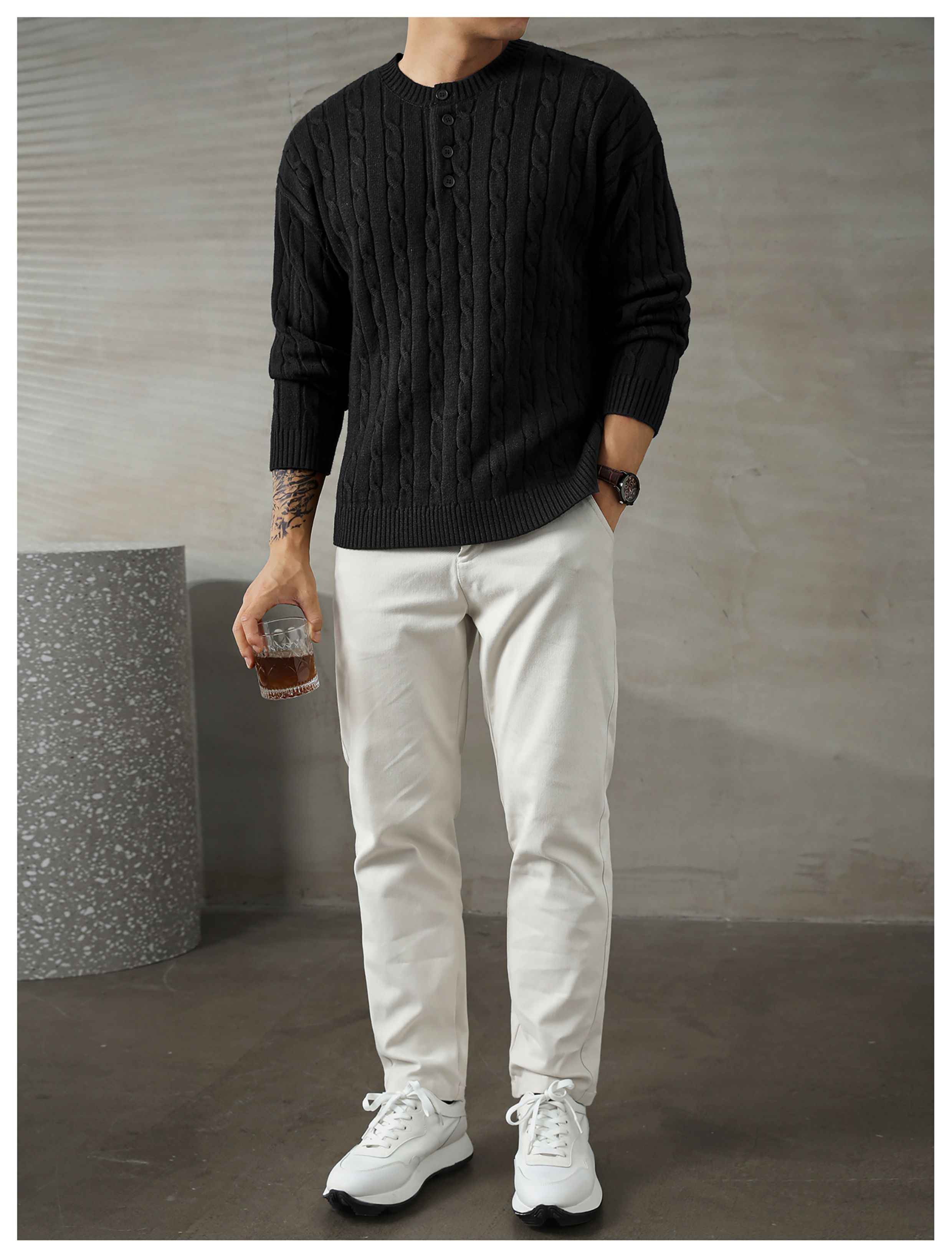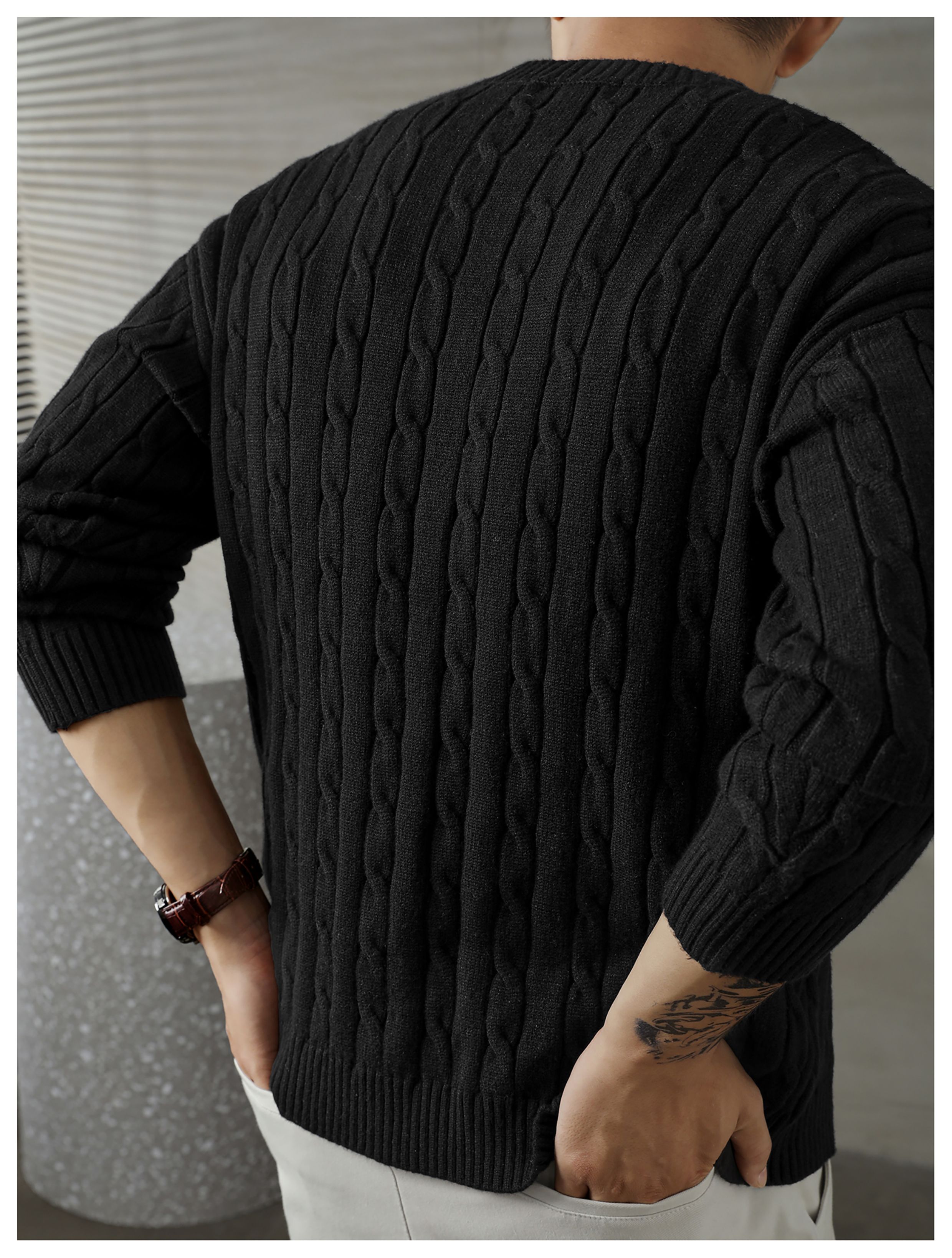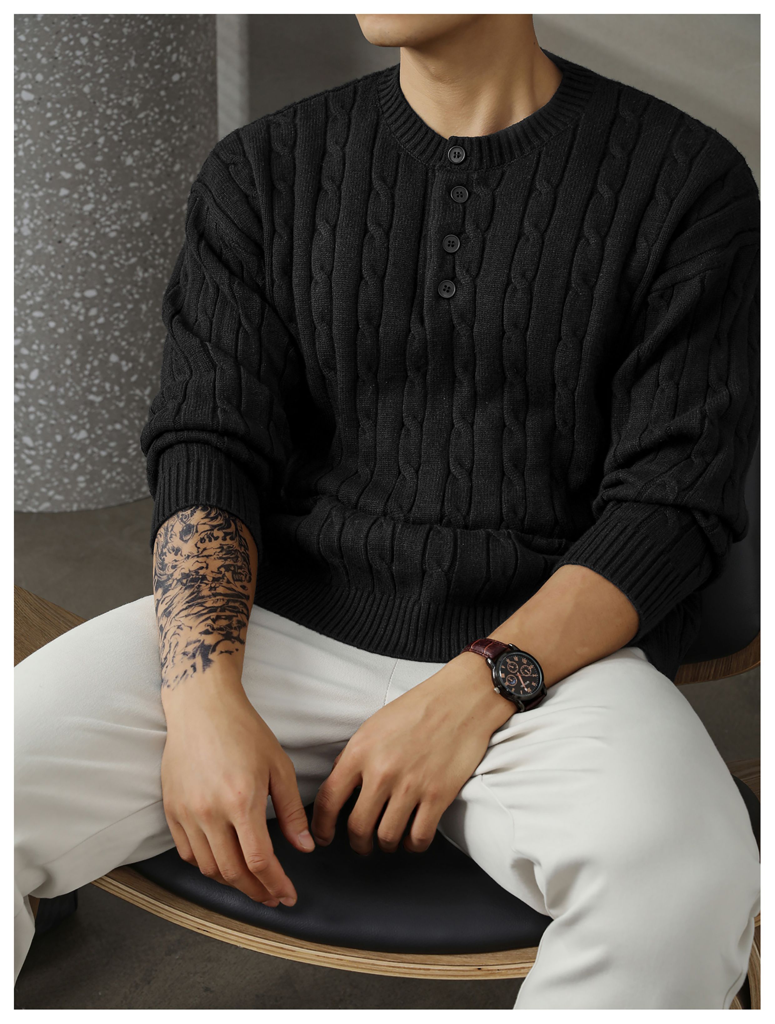 LUUD 輕奢氣質感亨利領黑色毛線衣男士麻花紋理高彈包芯紗針織衫