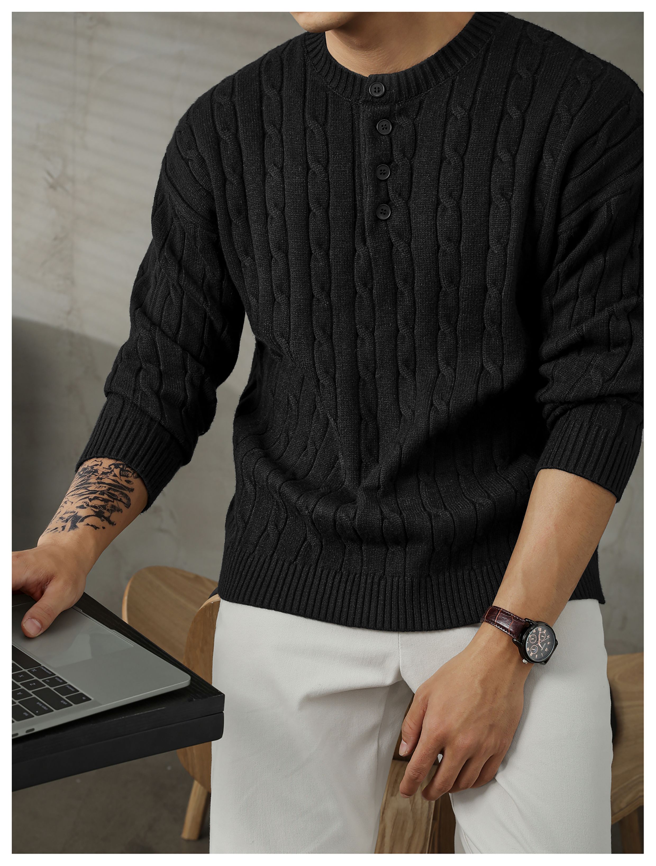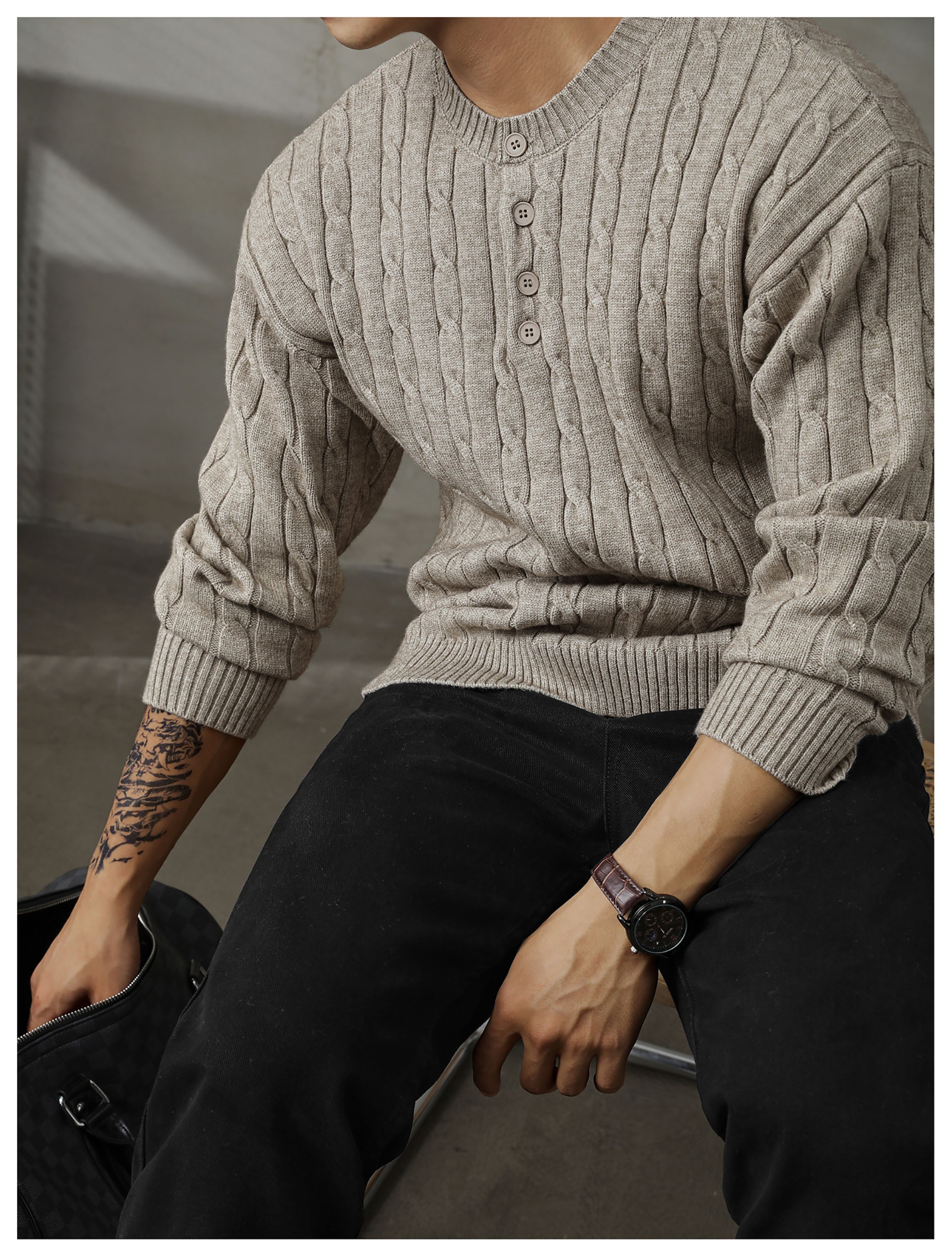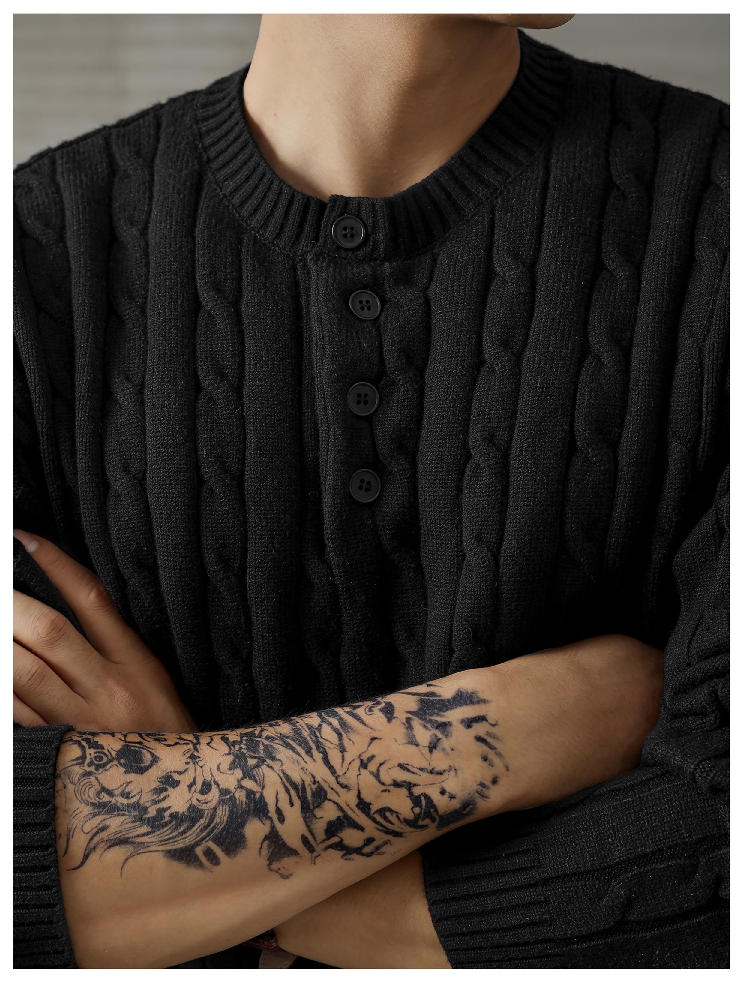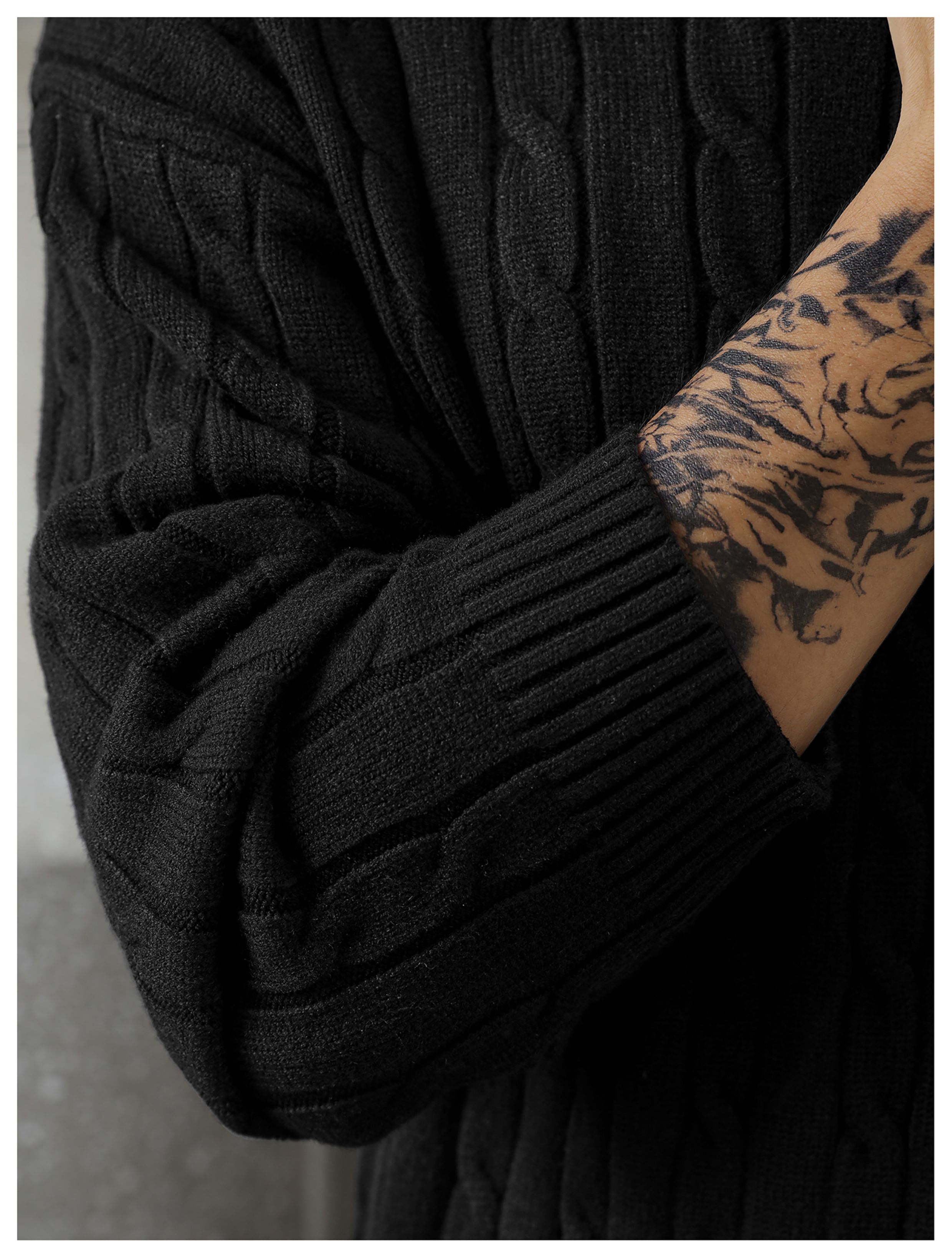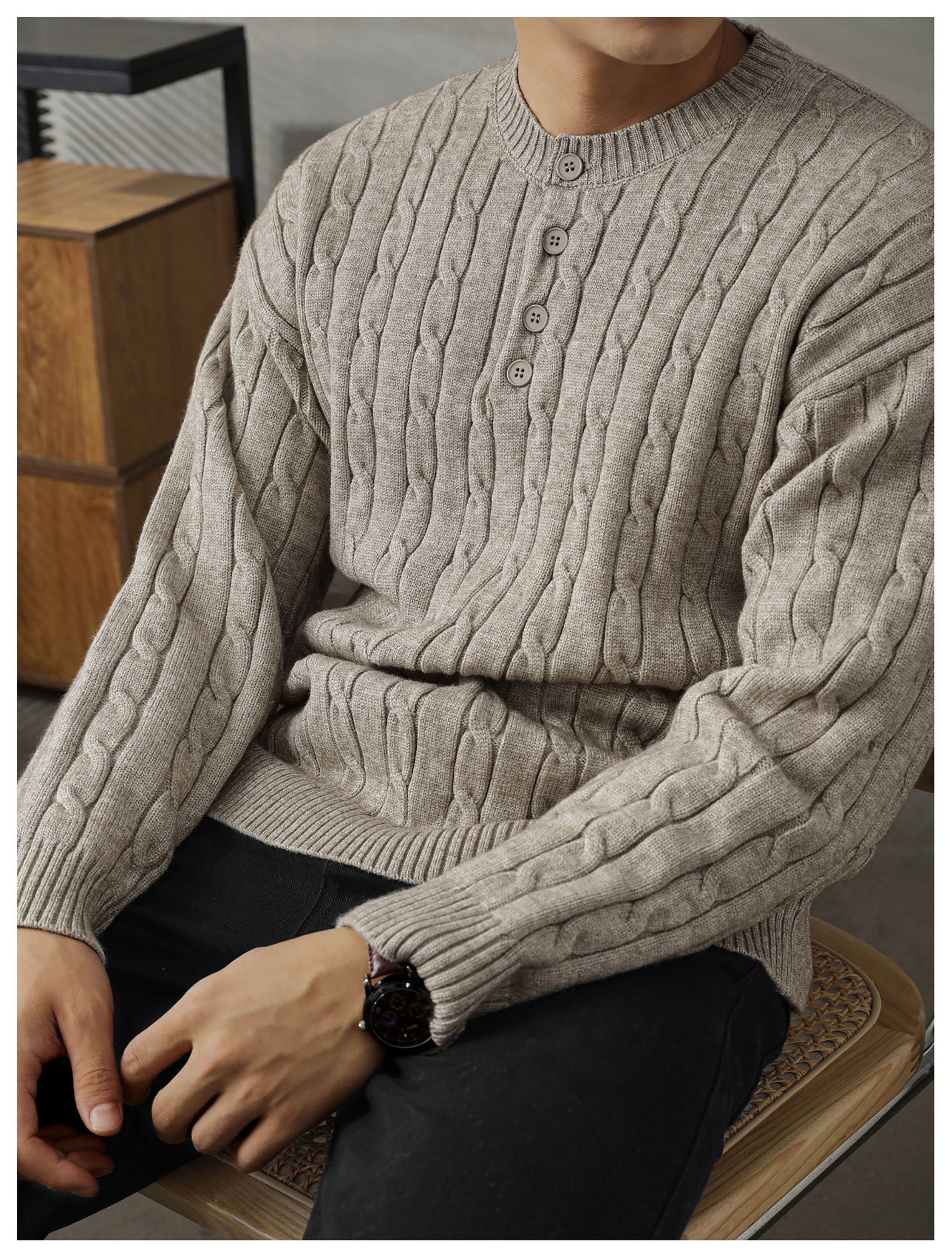 LUUD 輕奢氣質感亨利領黑色毛線衣男士麻花紋理高彈包芯紗針織衫