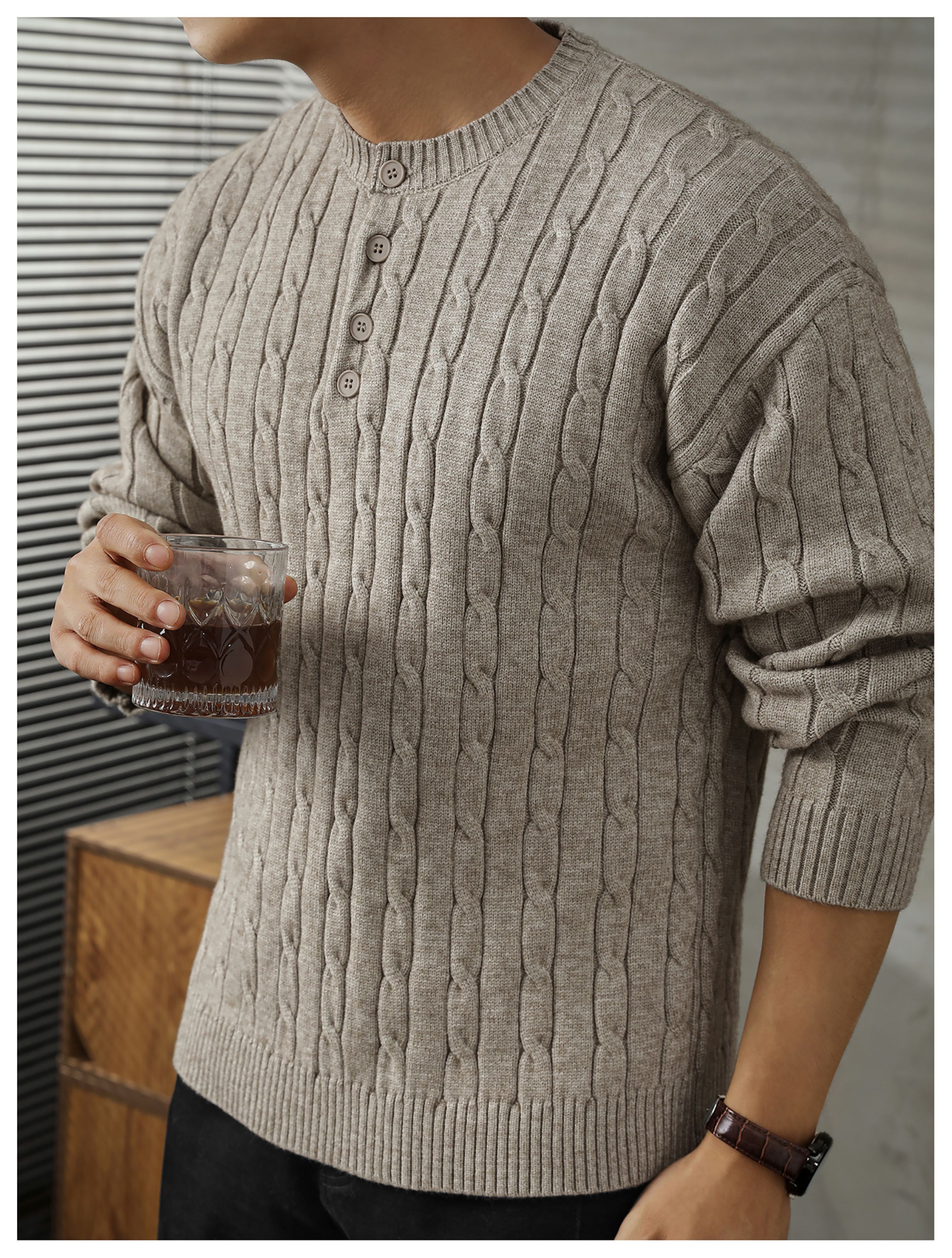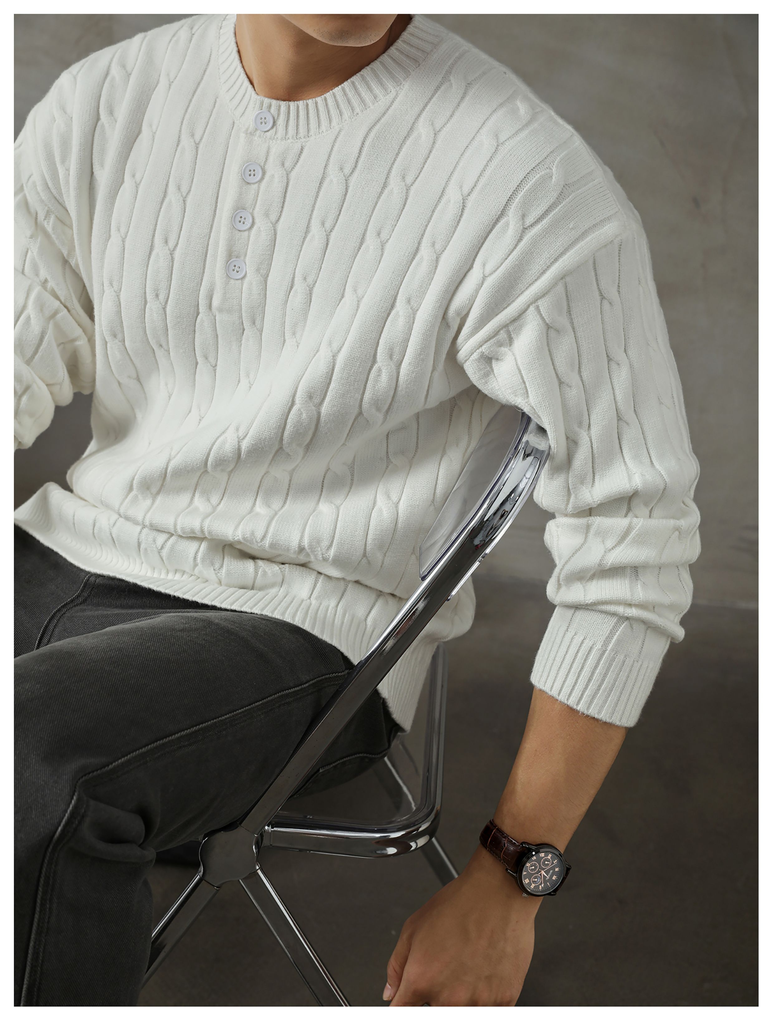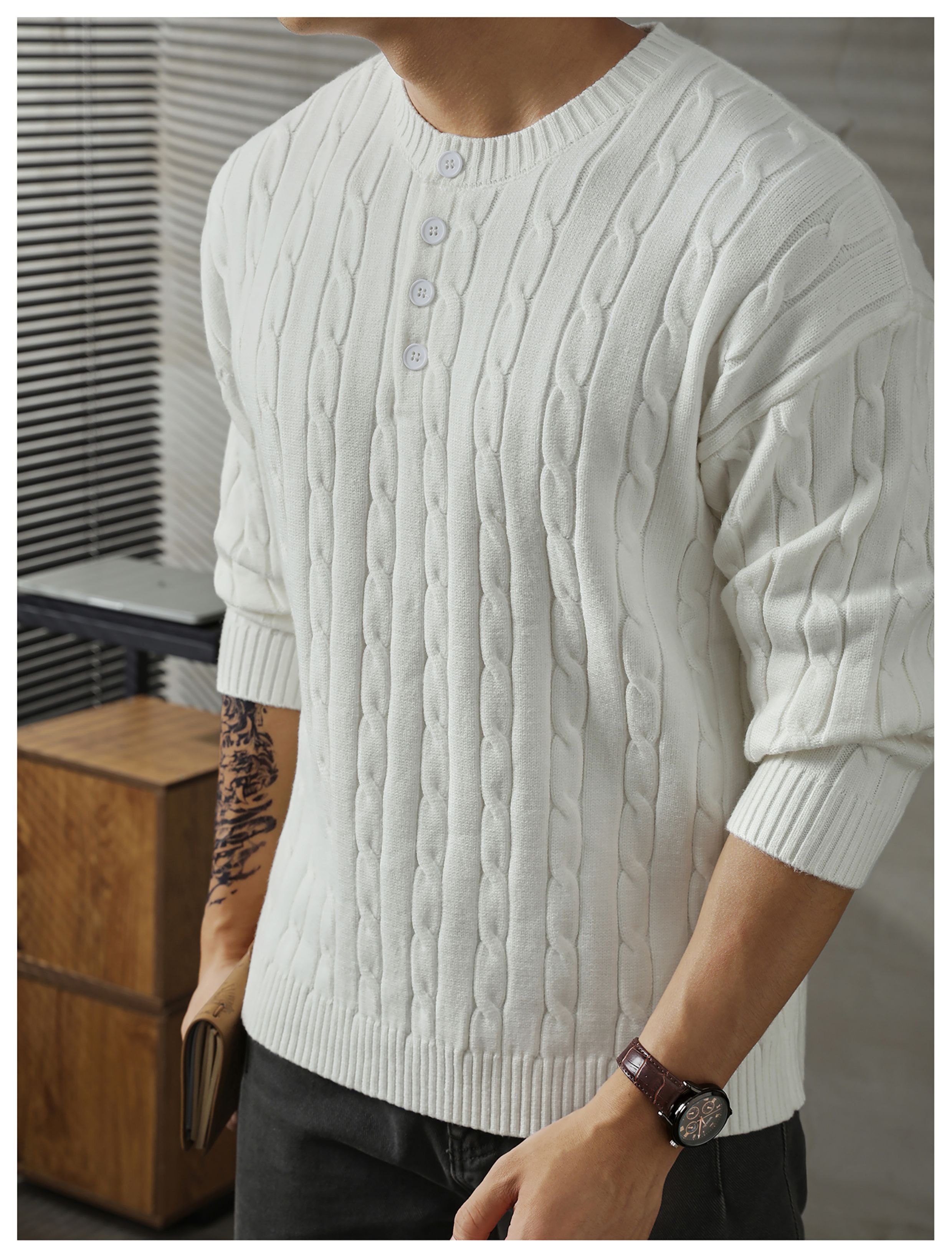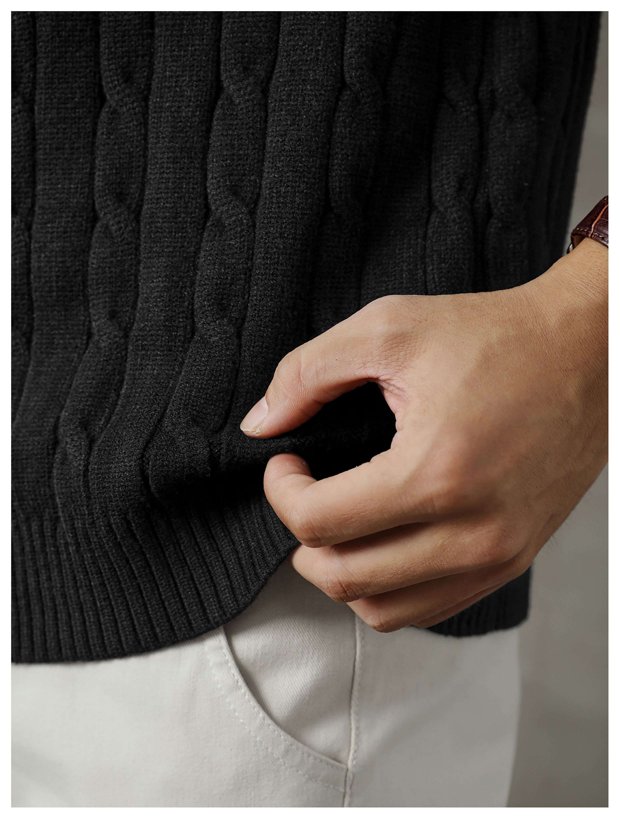 LUUD 輕奢氣質感亨利領黑色毛線衣男士麻花紋理高彈包芯紗針織衫