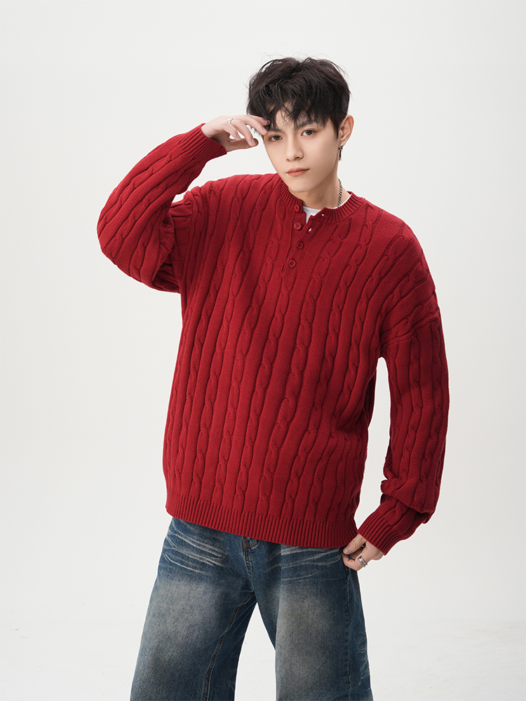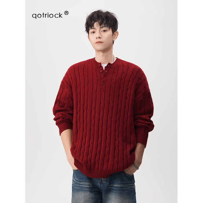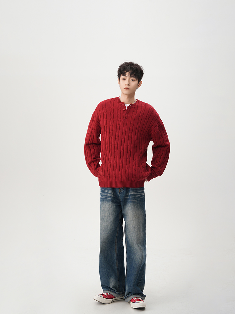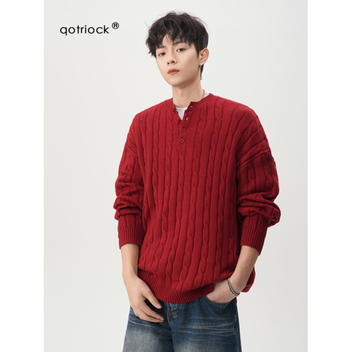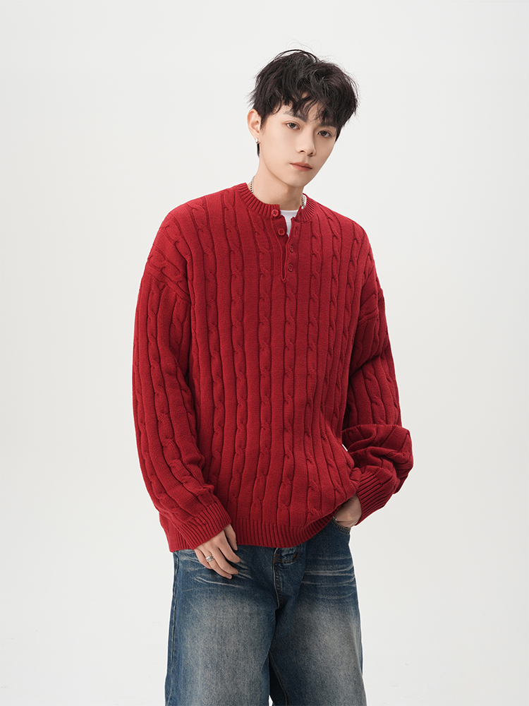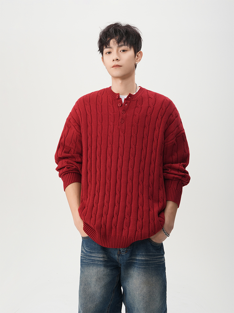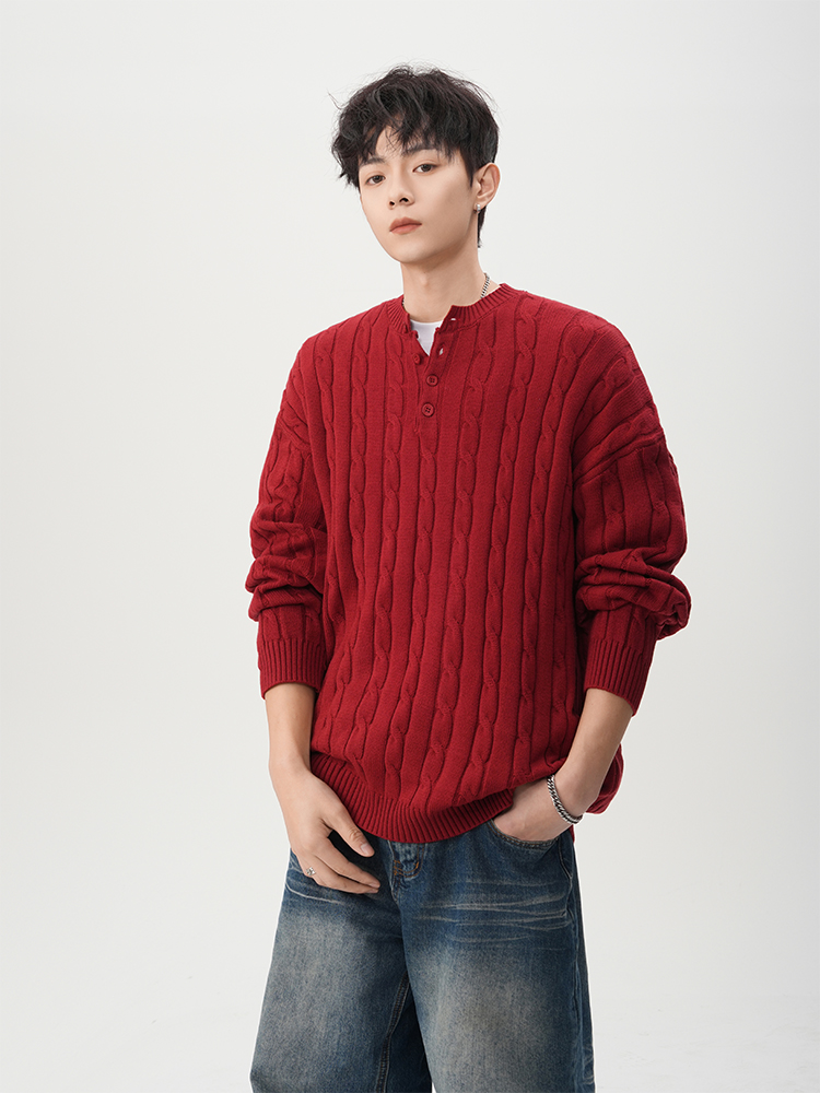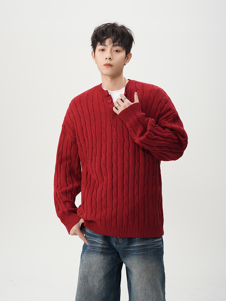 美式本命年紅色休閒毛衣男女冬季潮牌亨利領麻花針織衫慵懶風外套