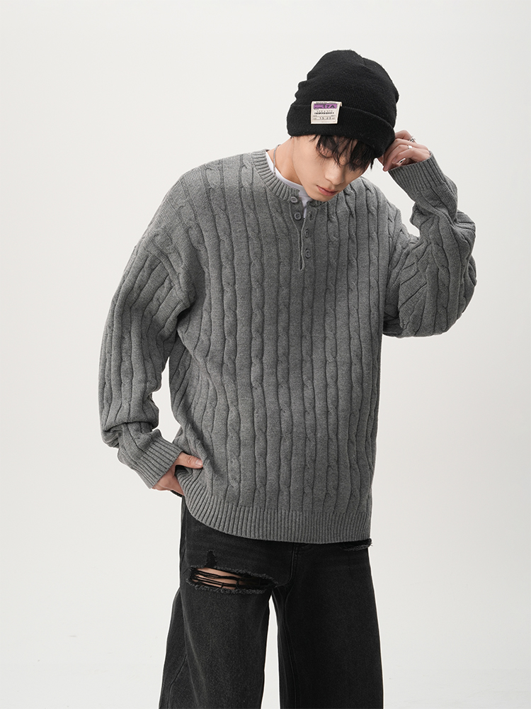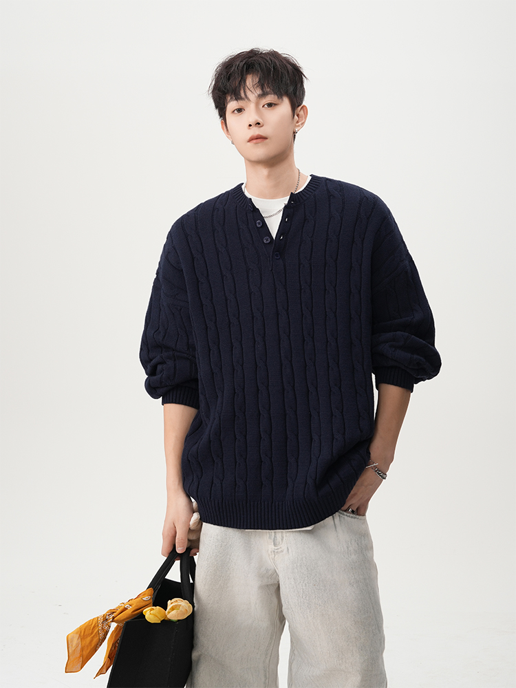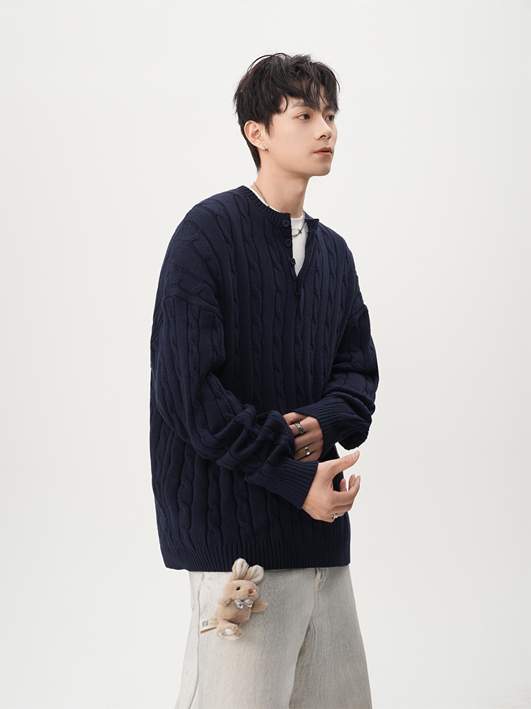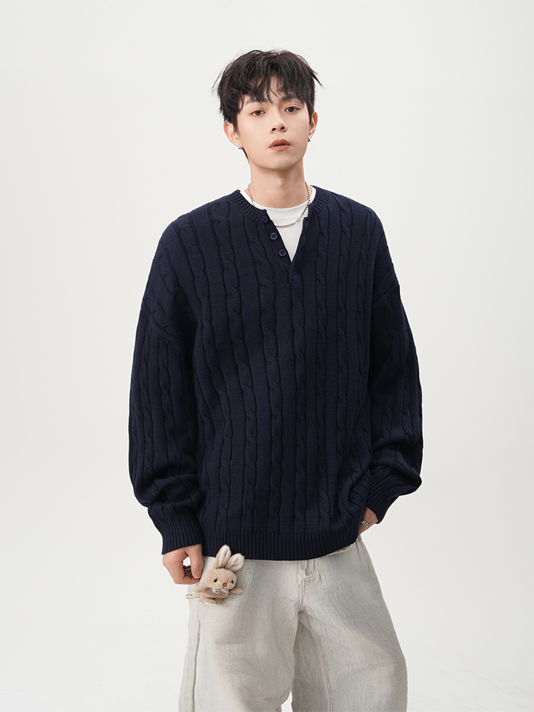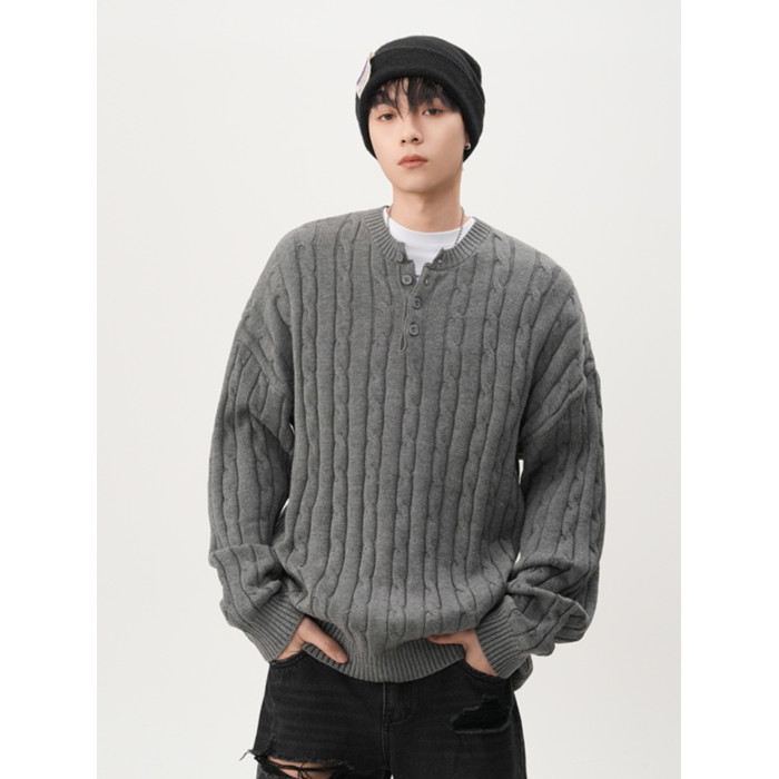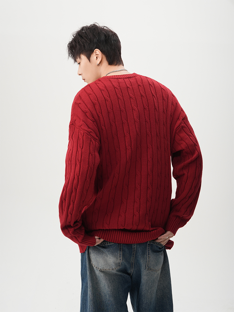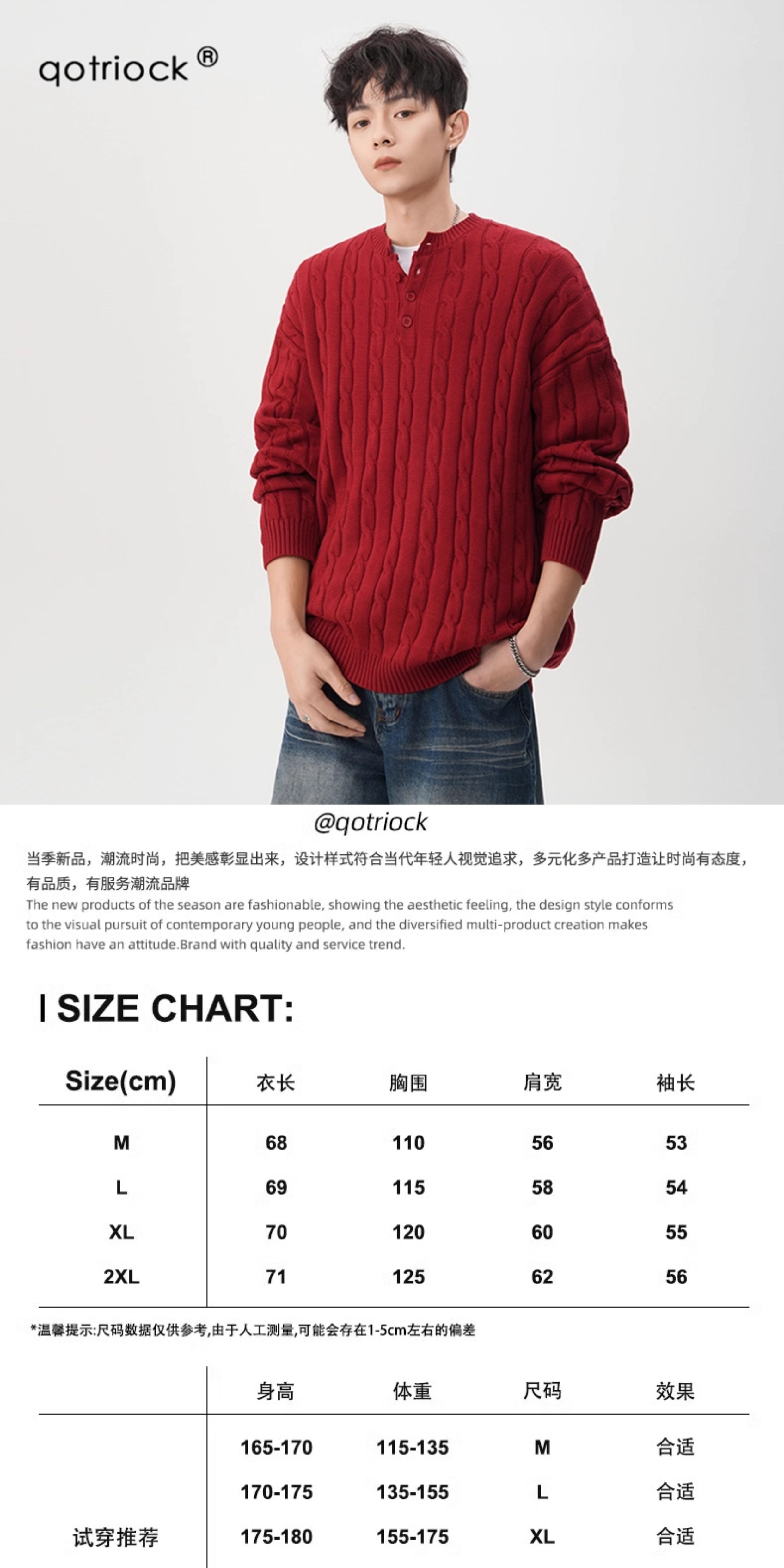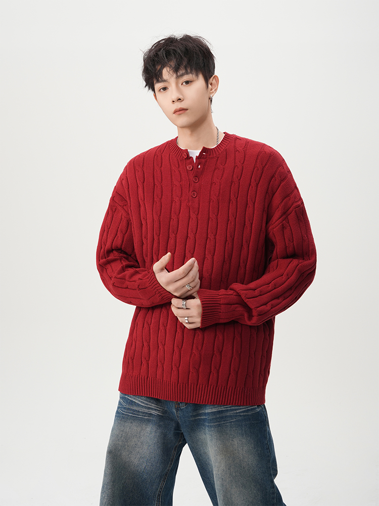 美式本命年紅色休閒毛衣男女冬季潮牌亨利領麻花針織衫慵懶風外套