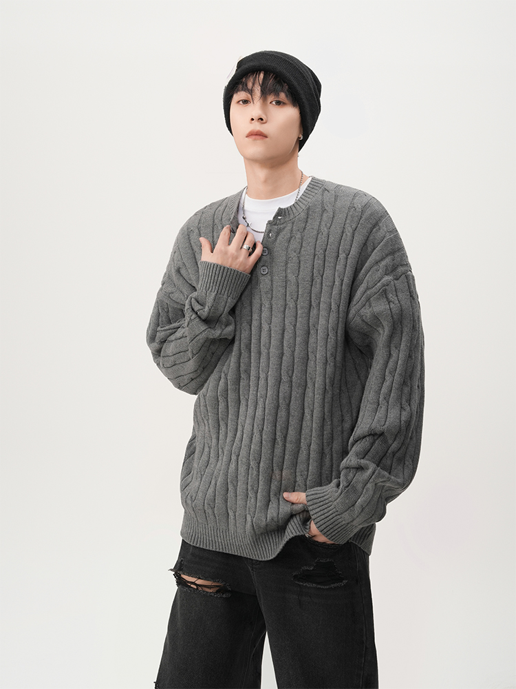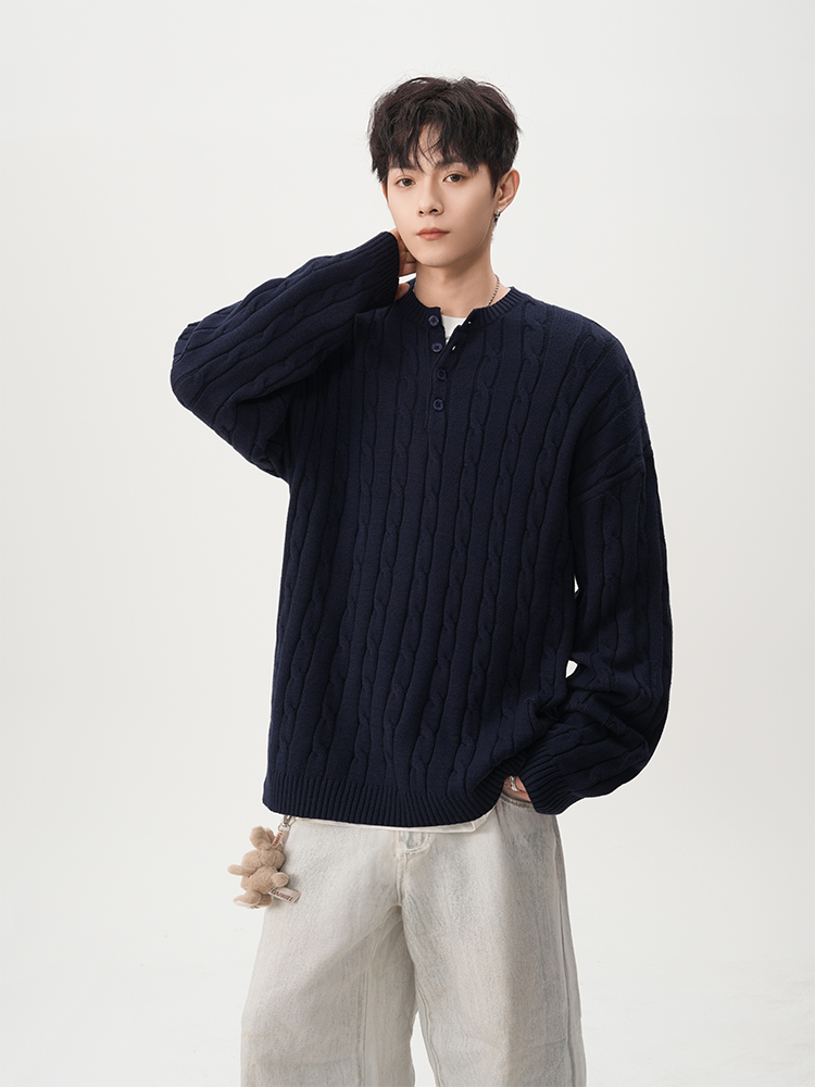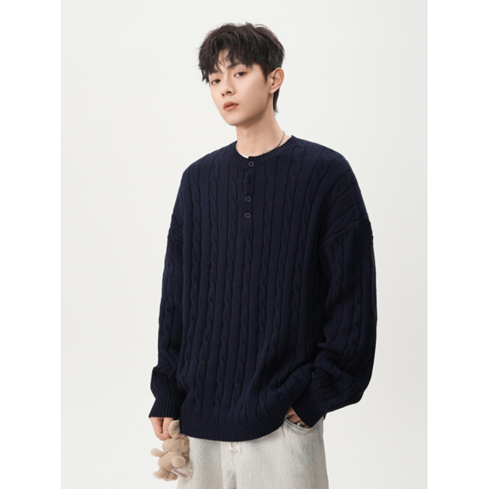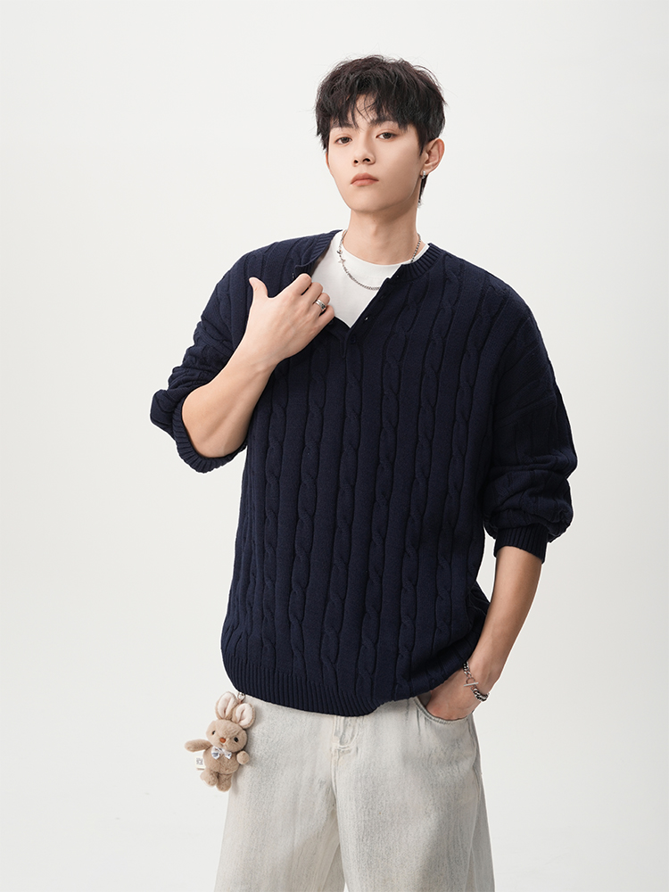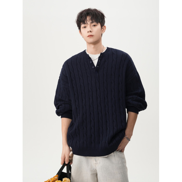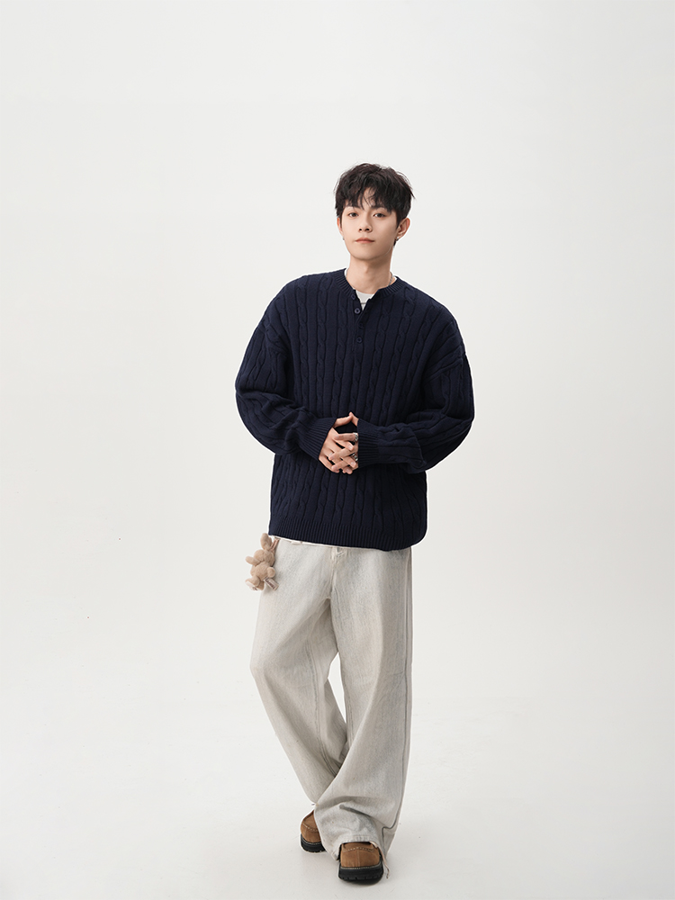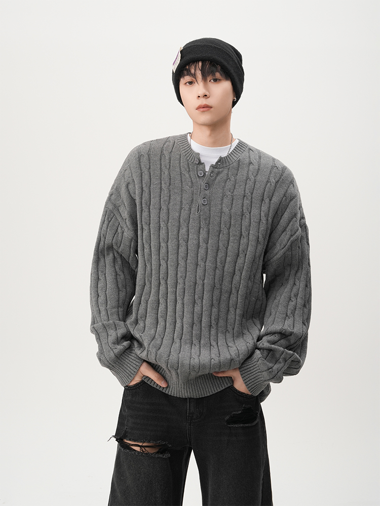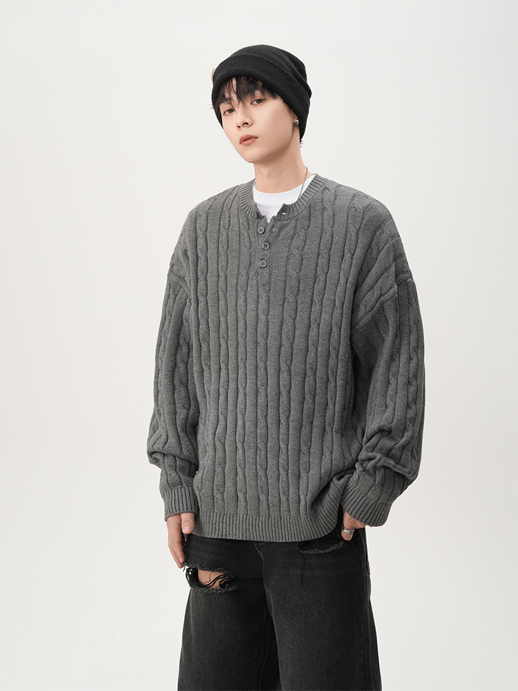 美式本命年紅色休閒毛衣男女冬季潮牌亨利領麻花針織衫慵懶風外套