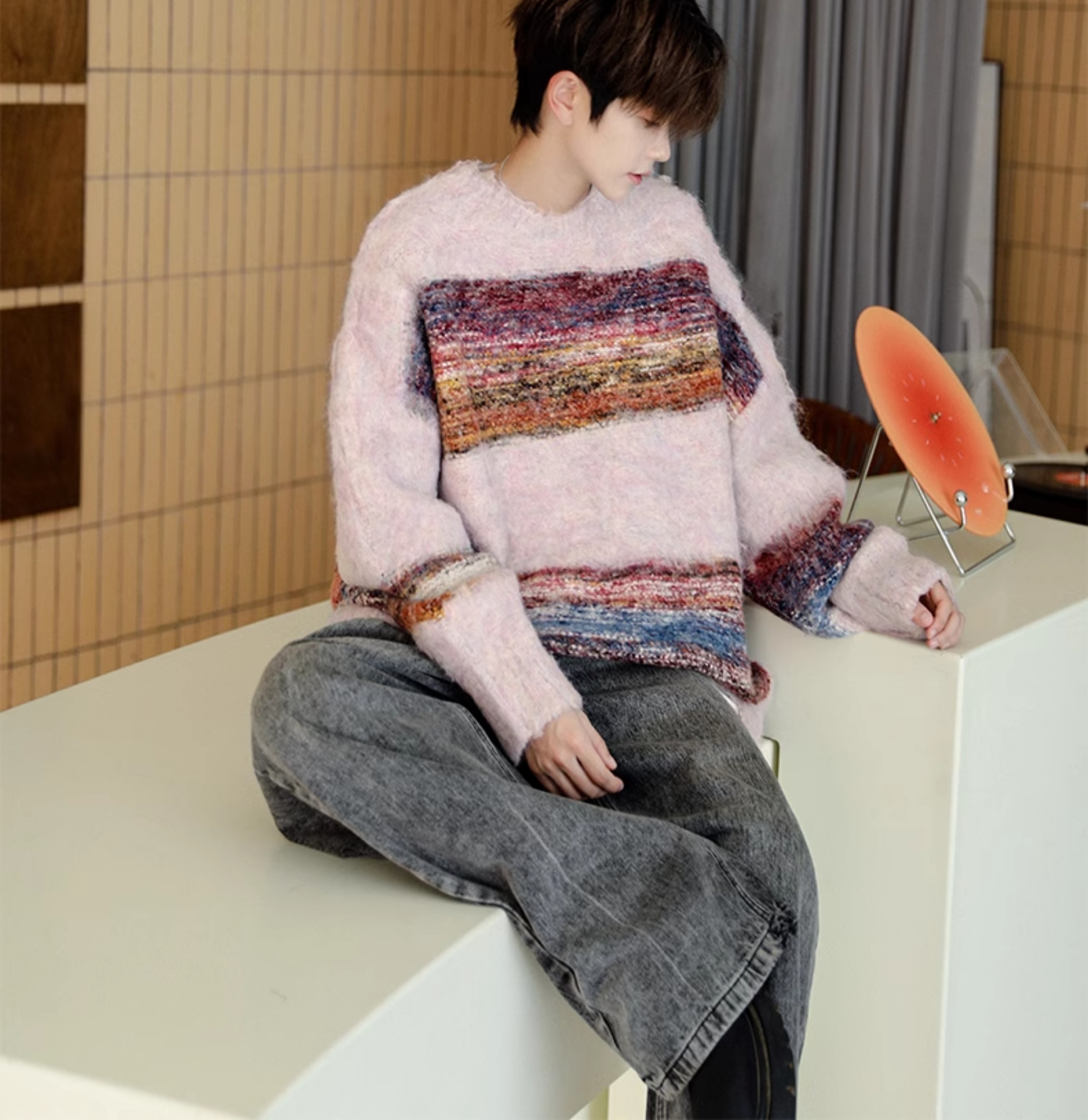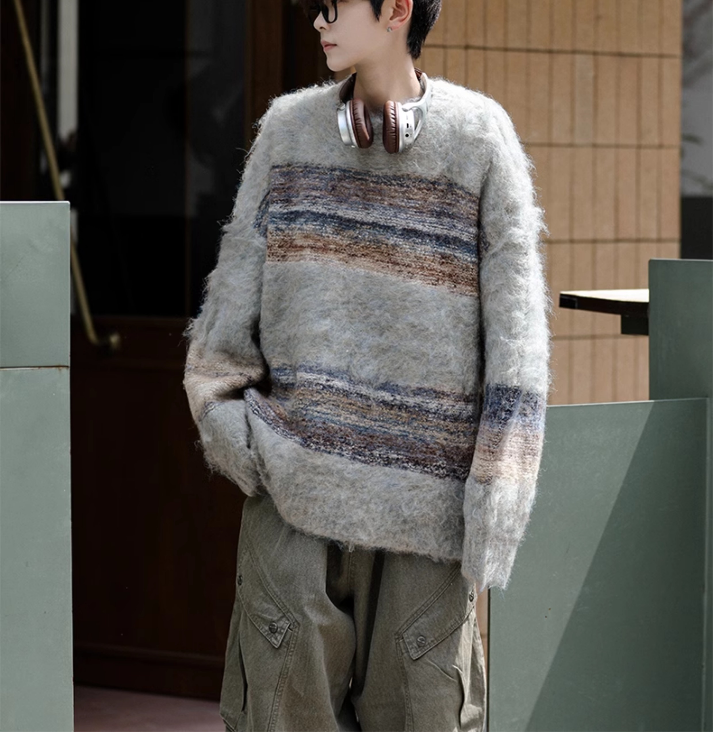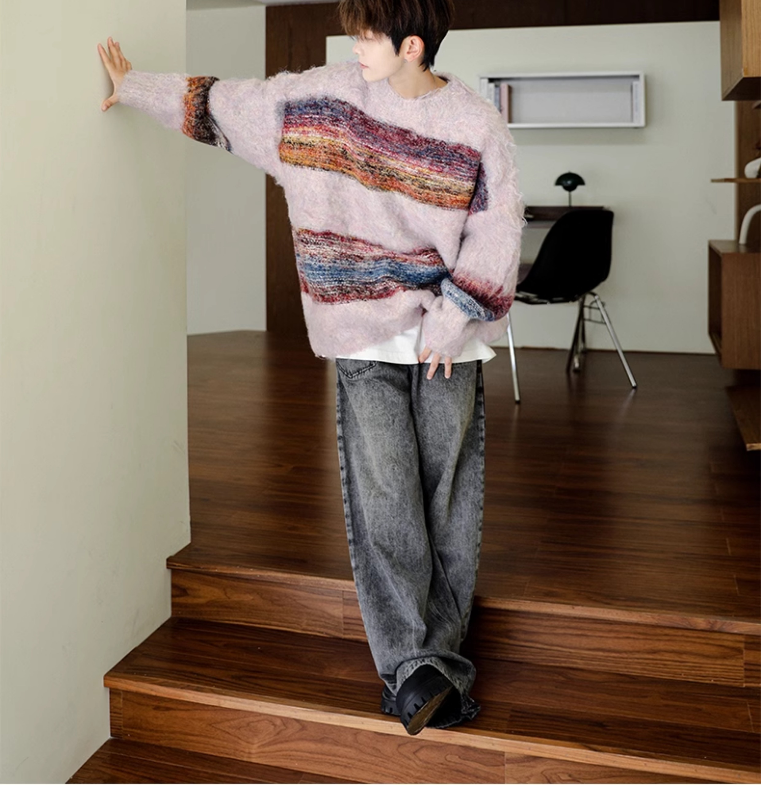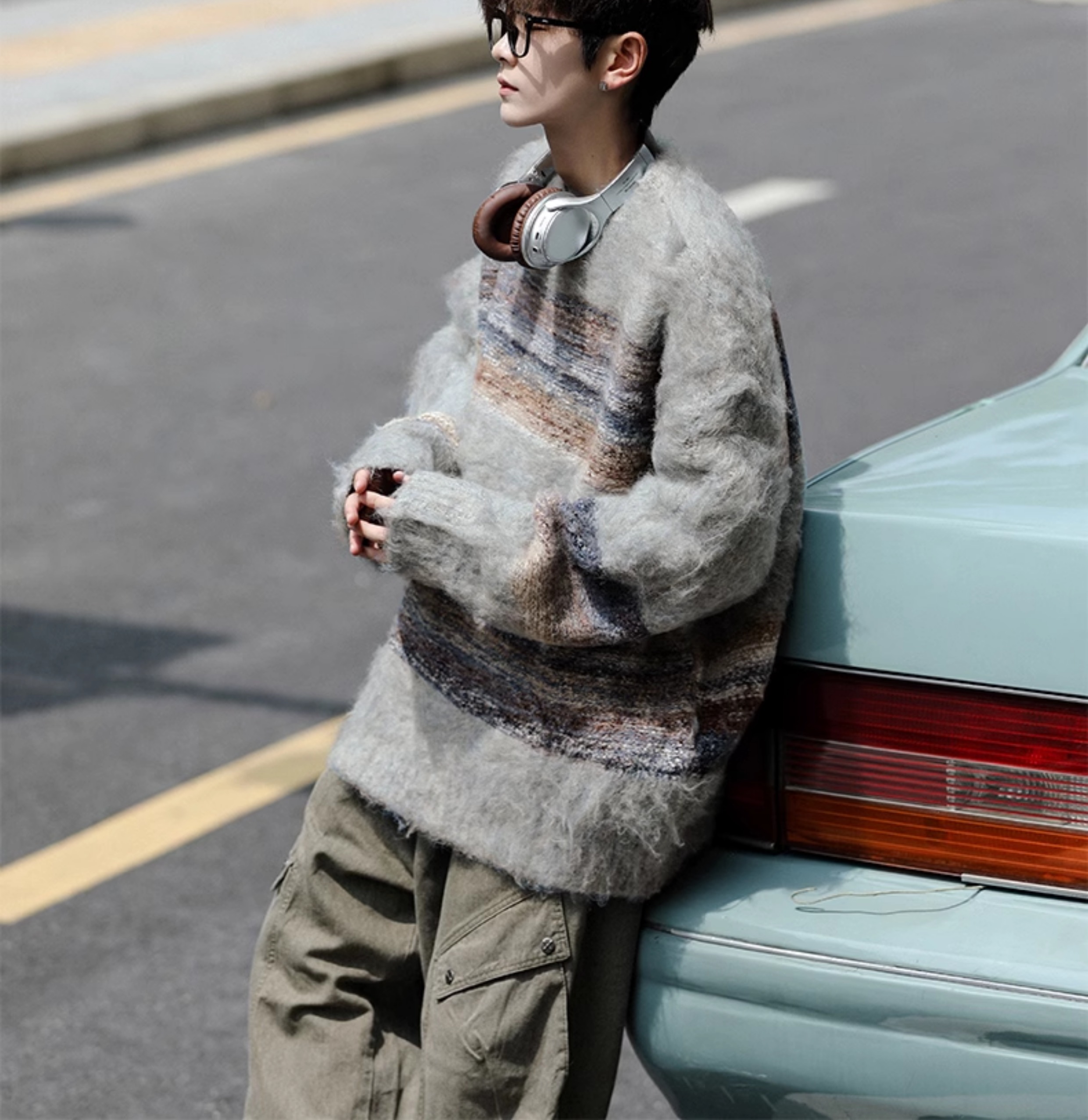 美式chic復古慵懶風漸變圓領毛衣男秋冬季潮牌情侶小衆寬松針織衫