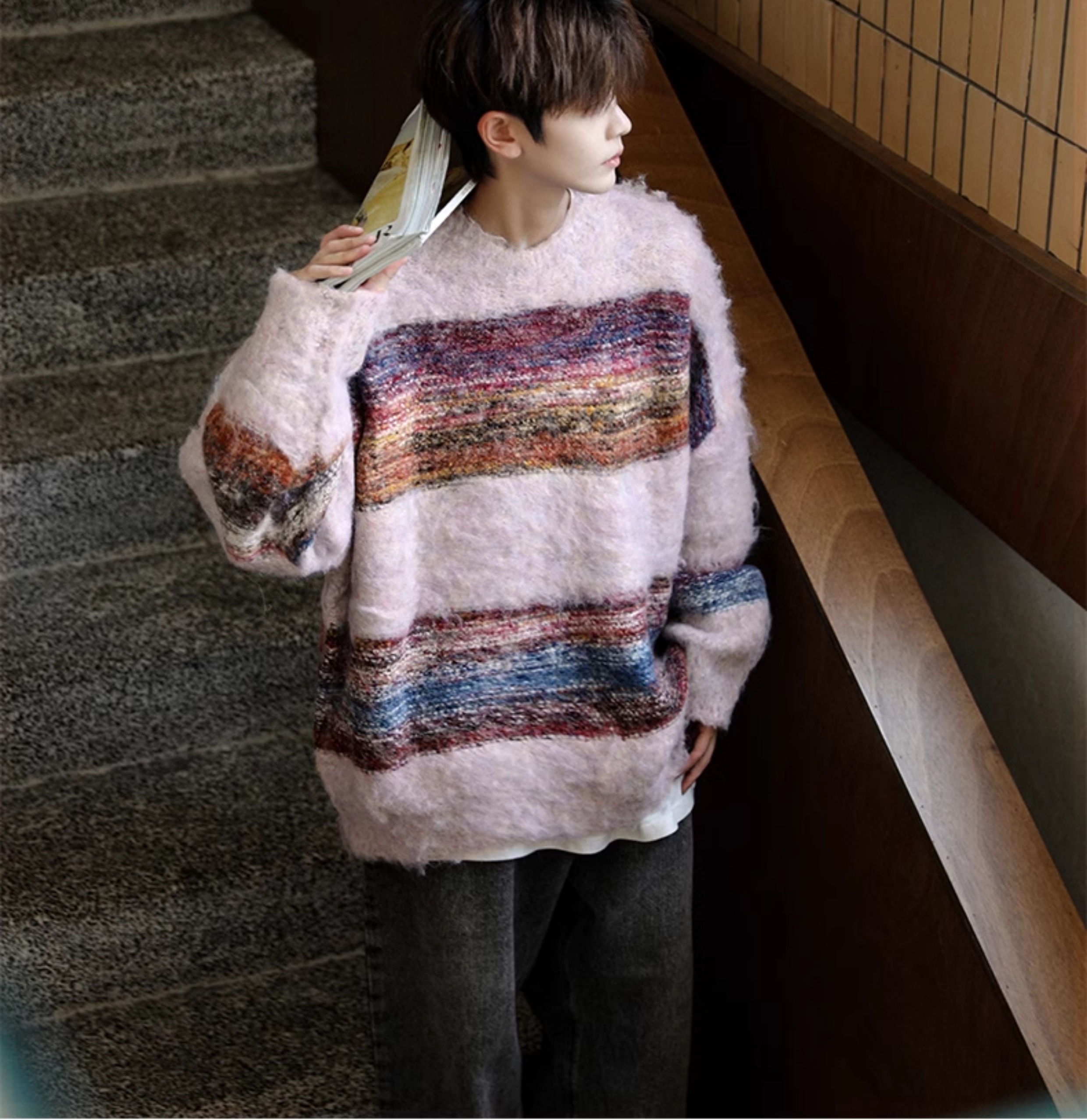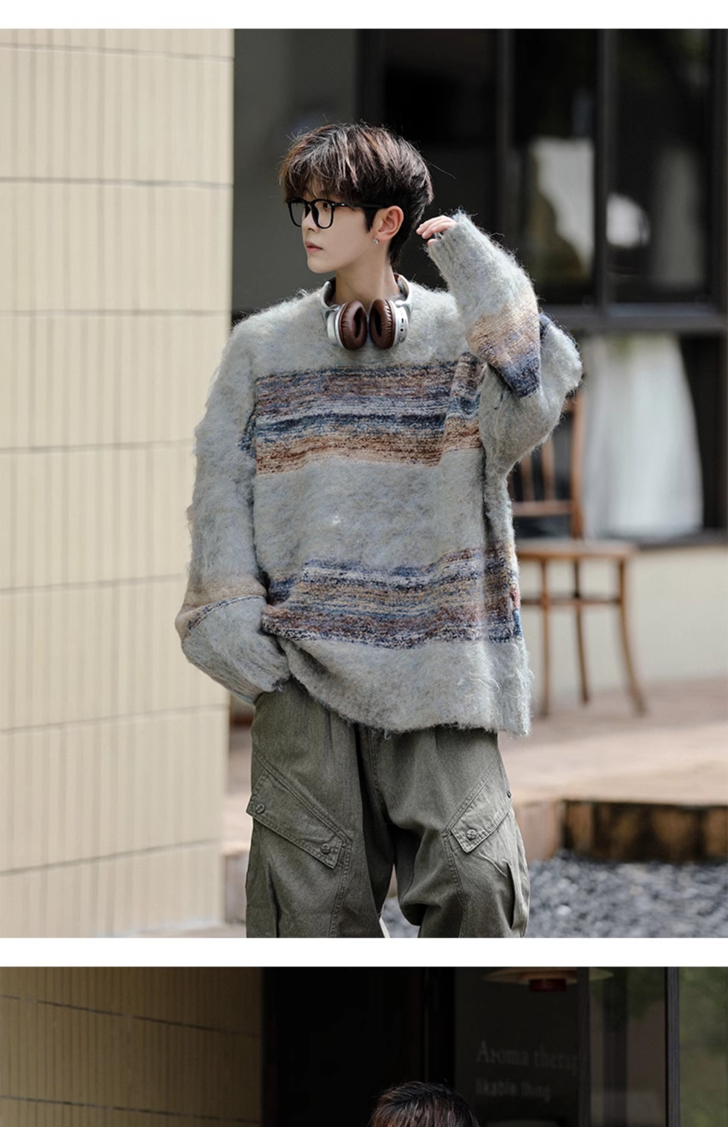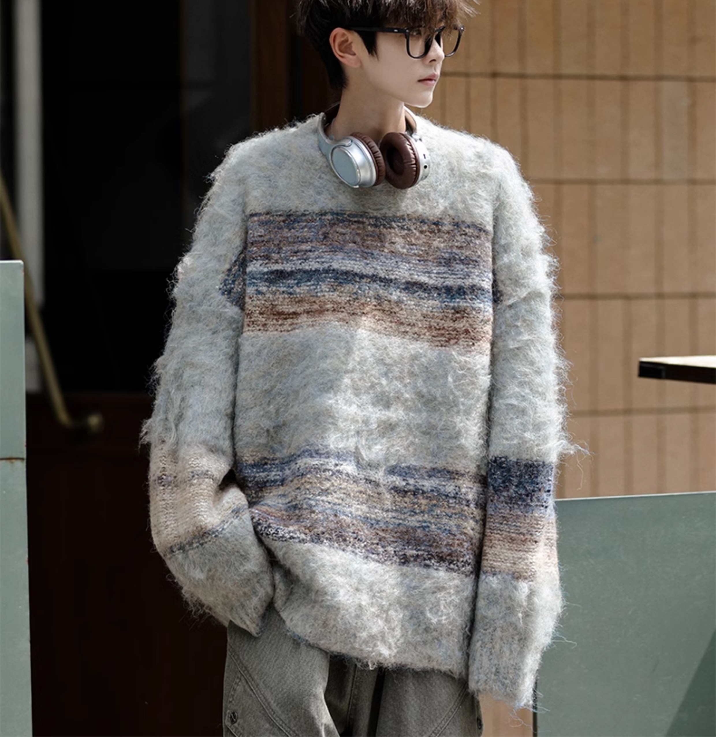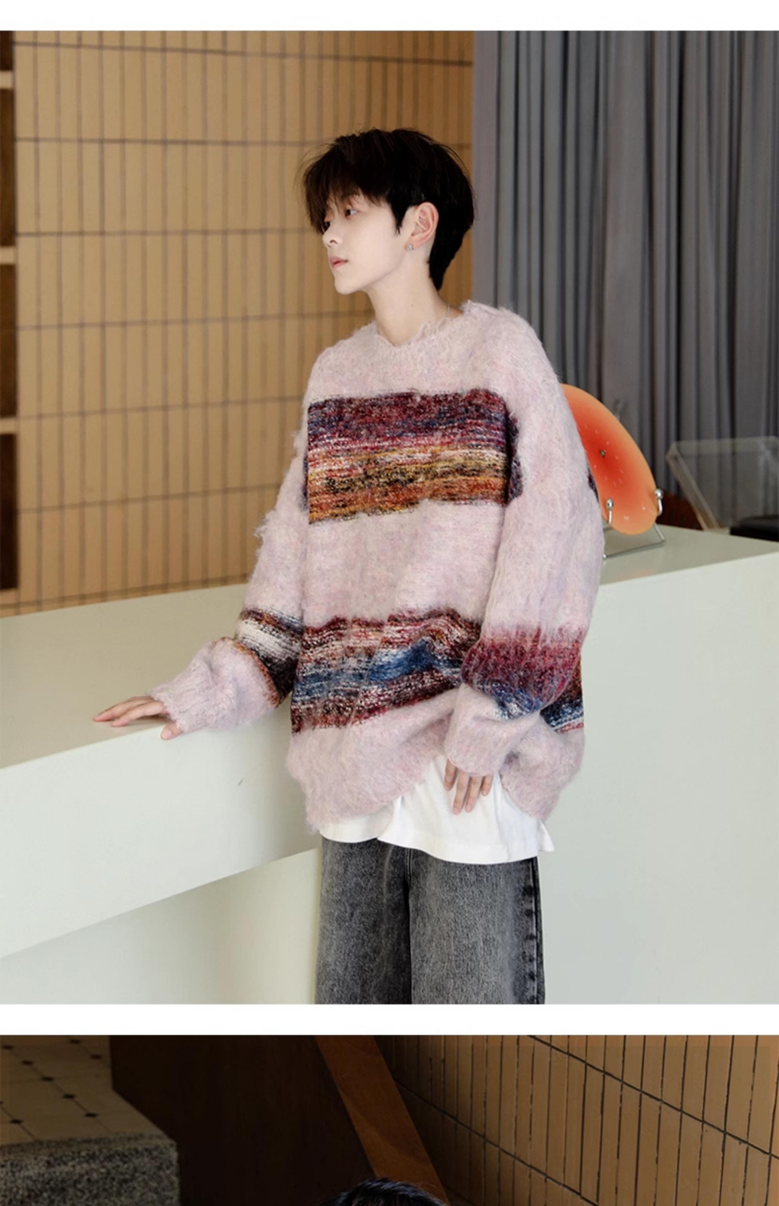 美式chic復古慵懶風漸變圓領毛衣男秋冬季潮牌情侶小衆寬松針織衫